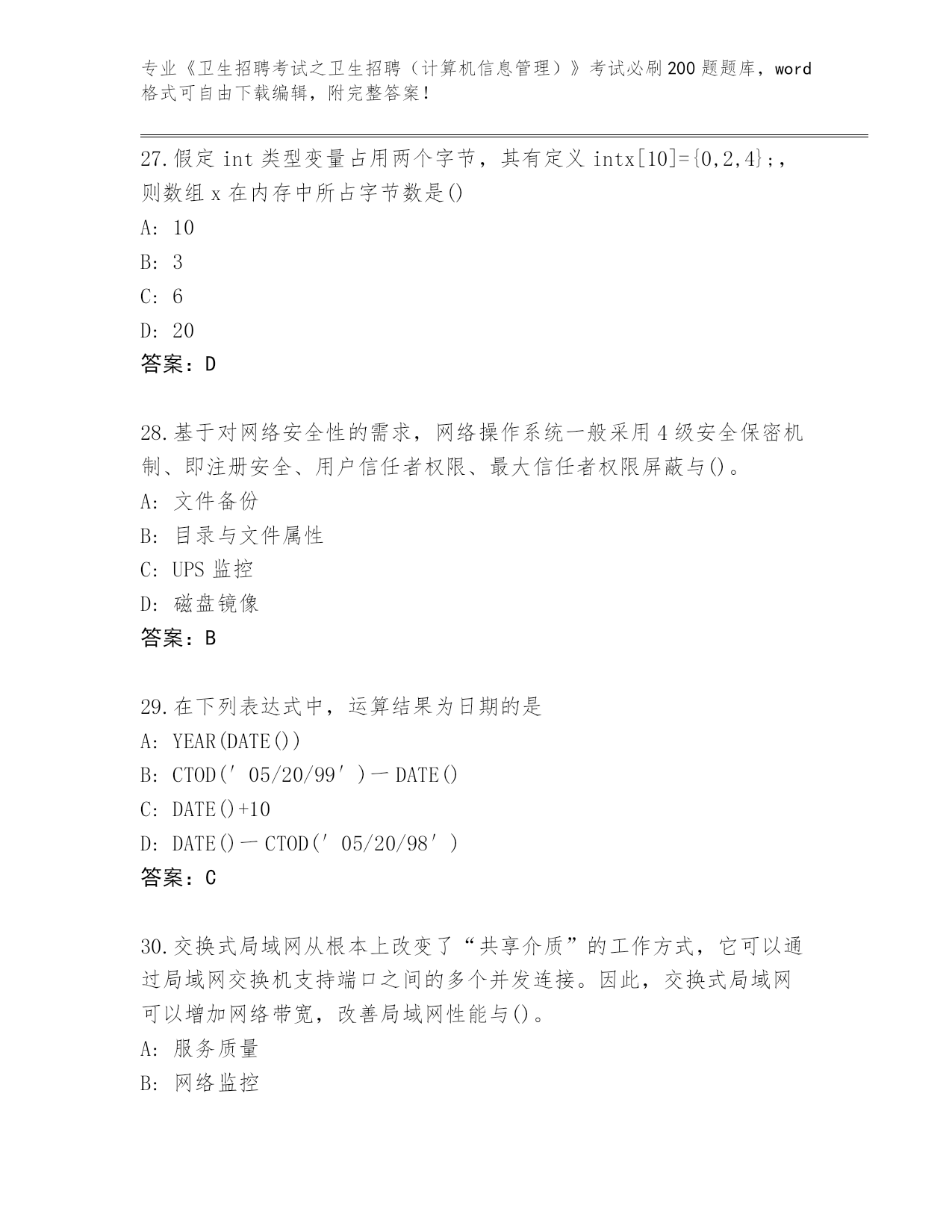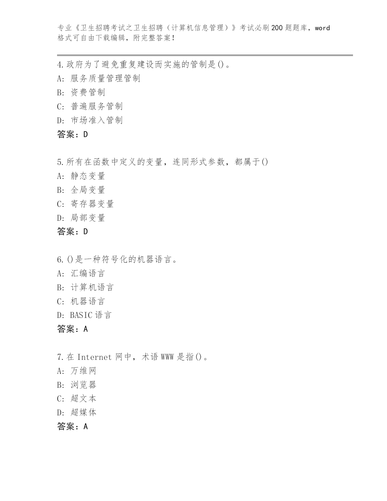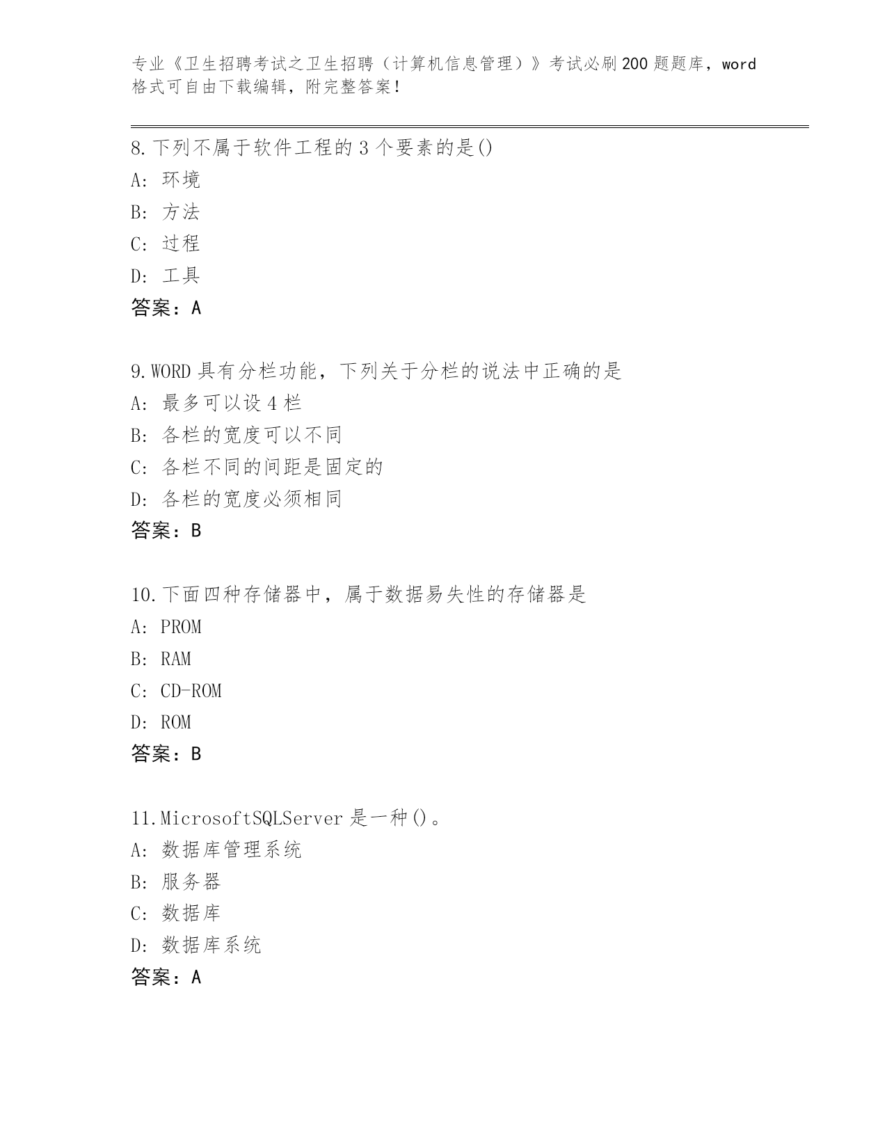 内部使用安徽省杜集区《卫生招聘考试之卫生招聘(计算机信息管理)》资格考试必刷200题内部题库含答案(能力提升)