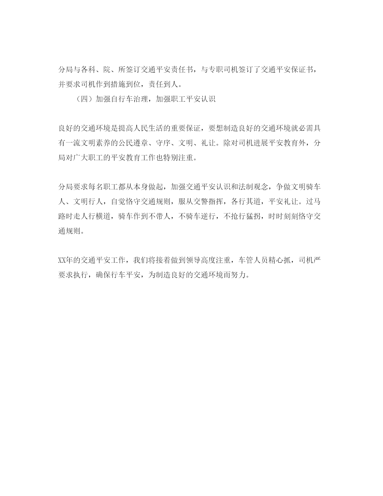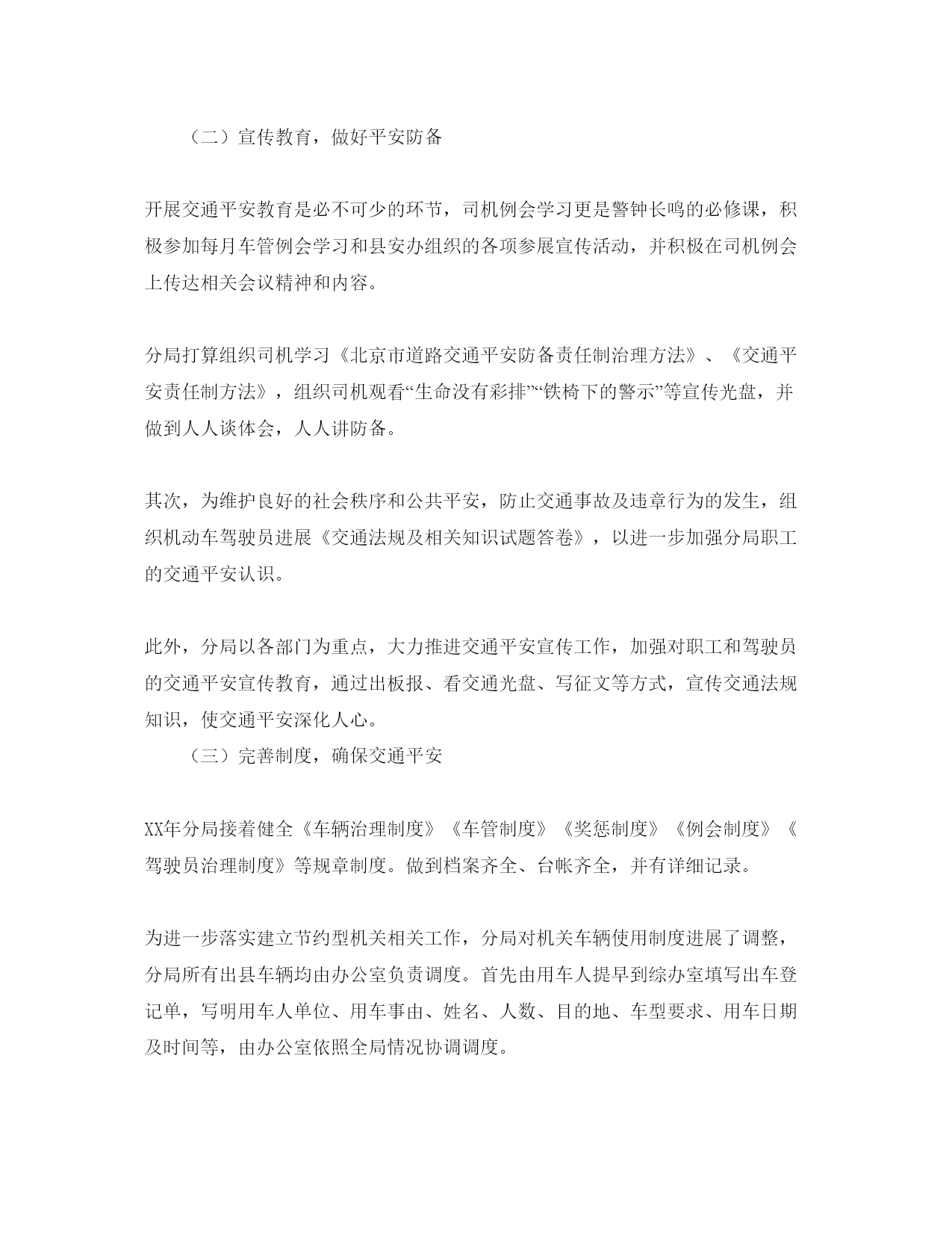 交通安全工作方案为保证XX年分局道路交通平安畅通,防止发生重、特大交通事故,特制定XX年交通平安工作方案一、组织领导加强领导,落实责任制成立XX年交通平安领导小组,由****任组长,*******副组长,分局各部门负责人为小组成员,明确工作标准、职责,狠抓落实。二、工作目的坚持“平安第一、预防为主”方针,全面落实交通平安防备责任制,坚决杜绝重特大交通事故;广泛开展交通平安宣传,营建良好言论气氛。三、工作措施(一)加强领导,落实责任制分局落实交通平安防备责任制,做好内部车辆的平安维护和检查,保证平安技术功能良好,对存在平安隐患的车辆禁止上路行驶。不管是局长办公会依然职工大会,要把交通平安教育工作列入重要日程,尤其对司机同志的平安教育工作做到常抓不懈。交通平安领导小组定时召开司机工作会议,强调平安驾驶咨询题,按照《中华人民共和国道路交通平安法》的有关规定,精心制定平安防备措施,并向司机提要求。一是首先保护车辆,对本人的车要自检自查,不开带病车;二是车绝对不能交给非司机开;三是出车前绝对不能喝酒,并和司机签订了责任书,实现了措施到位、责任到人。(二)宣传教育,做好平安防备开展交通平安教育是必不可少的环节,司机例会学习更是警钟长鸣的必修课,积极参加每月车管例会学习和县安办组织的各项参展宣传活动,并积极在司机例会上传达相关会议精神和内容。分局打算组织司机学习《北京市道路交通平安防备责任制治理方法》、《交通平安责任制方法》,组织司机观看“生命没有彩排”“铁椅下的警示”等宣传光盘,并做到人人谈体会,人人讲防备。其次,为维护良好的社会秩序和公共平安,防止交通事故及违章行为的发生,组织机动车驾驶员进展《交通法规及相关知识试题答卷》,以进一步加强分局职工的交通平安认识。此外,分局以各部门为重点,大力推进交通平安宣传工作,加强对职工和驾驶员的交通平安宣传教育,通过出板报、看交通光盘、写征文等方式,宣传交通法规知识,使交通平安深化人心。(三)完善制度,确保交通平安XX年分局接着健全《车辆治理制度》《车管制度》《奖惩制度》《例会制度》《驾驶员治理制度》等规章制度。做到档案齐全、台帐齐全,并有详细记录。为进一步落实建立节约型机关相关工作,分局对机关车辆使用制度进展了调整,分局所有出县车辆均由办公室负责调度。首先由用车人提早到综办室填写出车登记单,写明用车人单位、用车事由、姓名、人数、目的地、车型要求、用车日期及时间等,由办公室依照全局情况协调调度。分局与各科、院、所签订交通平安责任书,与专职司机签订了交通平安保证书,并要求司机作到措施到位,责任到人。(四)加强自行车治理,加强职工平安认识良好的交通环境是提高人民生活的重要保证,要想制造良好的交通环境就必需具有一流文明素养的公民遵章、守序、文明、礼让。除对司机进展平安教育外,分局对广大职工的平安教育工作也特别注重。分局要求每名职工都从本身做起,加强交通平安认识和法制观念,争做文明骑车人、文明行人,自觉恪守交通规则,服从交警指挥,各行其道,平安礼让。过马路时走人行横道,骑车作到不带人,不骑车逆行,不抢行猛拐,时时刻刻恪守交通规则。XX年的交通平安工作,我们将接着做到领导高度注重,车管人员精心抓,司机严要求执行,确保行车平安,为制造良好的交通环境而努力。