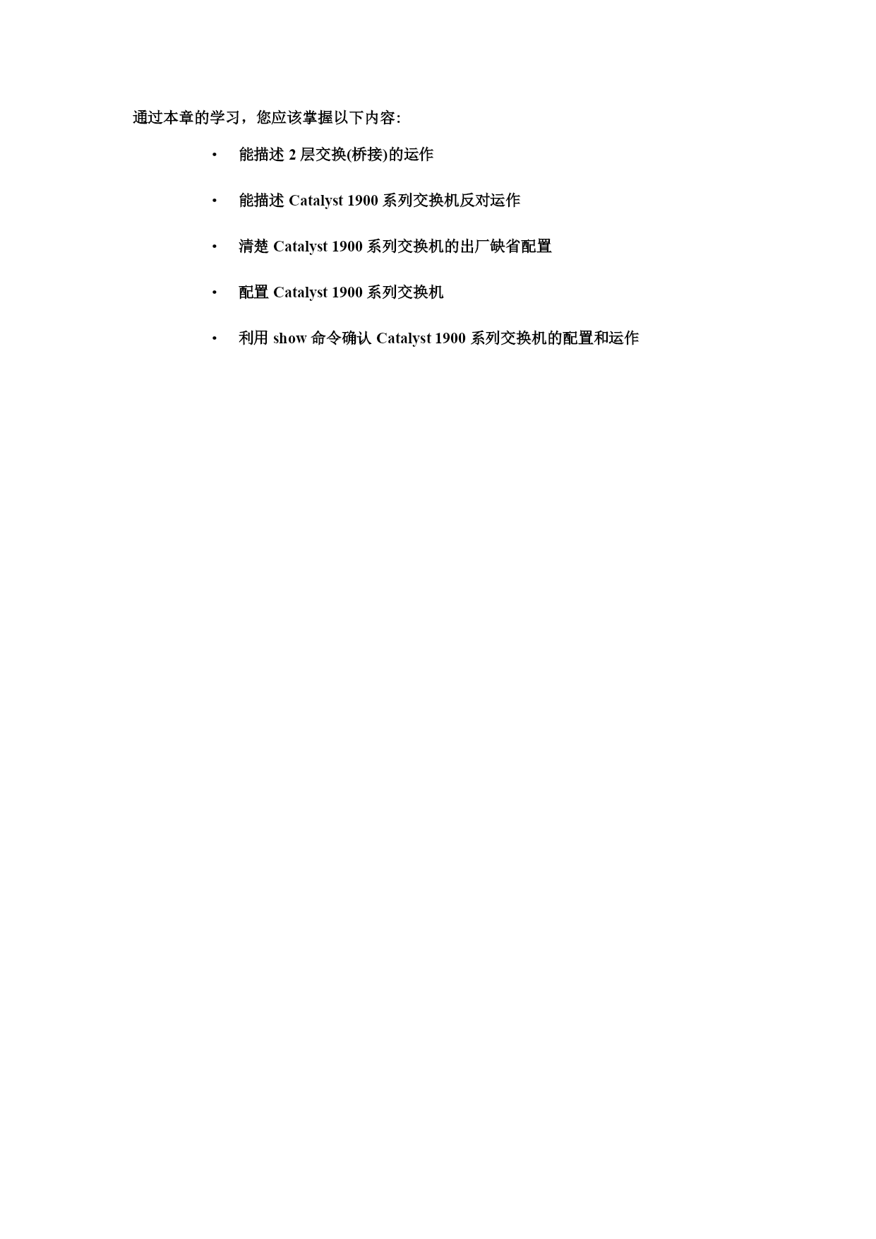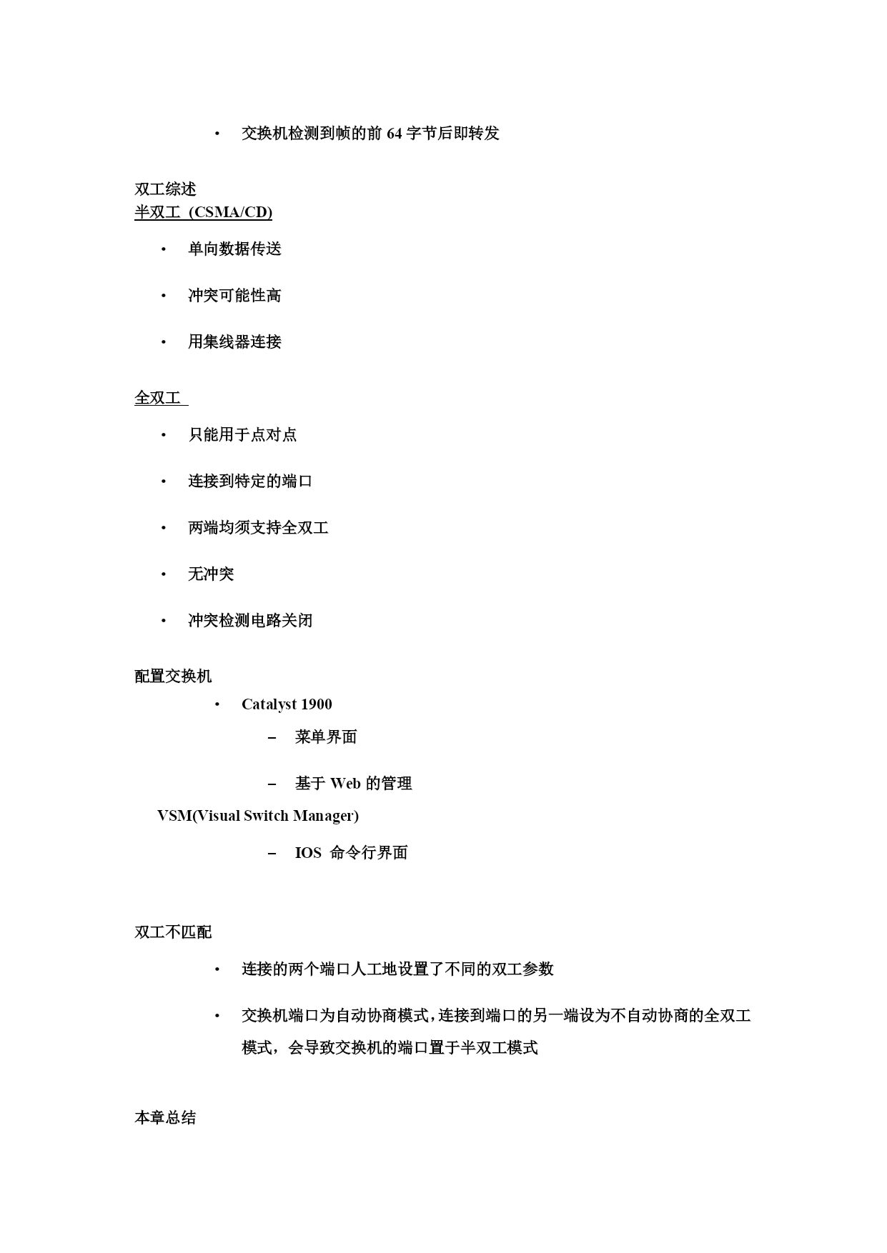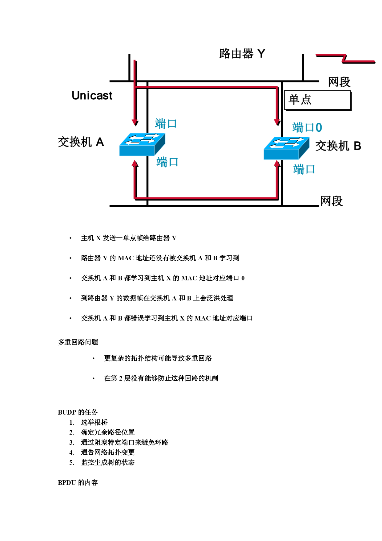实验八交换机的配置(理论部分)本章目标通过本章的学习,您应该掌握以下内容:能描述2层交换(桥接)的运作能描述Catalyst1900系列交换机运作清楚Catalyst1900系列交换机的出厂缺省配置配置Catalyst1900系列交换机利用show命令确认Catalyst1900系列交换机的配置和运作交换机的三个功能地址学习帧的转发/过滤回路防止交换机学习主机的位置的过程最初开机时MAC地址表是空的主机A发送数据帧给主机C交换机通过学习数据帧的源MAC地址,记录下主机A的MAC地址对应端口E0该数据帧转发到除端口E0以外的其它所有端口(不清楚目标主机的单点传送用泛洪方式)主机D发送数据帧给主机C交换机通过学习数据帧的源MAC地址,记录下主机D的MAC地址对应端口E03该数据帧转发到除端口E3以外的其它所有端口(不清楚目标主机的单点传送用泛洪方式)交换机A发送数据帧给主机C在地址表中有目标主机,数据帧不会泛洪而直接转发广播帧和多点传送帧主机D发送广播帧或多点帧广播帧或多点帧泛洪到除源端口外的所有端口冗余网络拓扑冗余拓扑消除了由于单点故障所引致的网络不通问题冗余拓扑却带来了广播风暴、重复帧和MAC地址表不稳定的问题广播风暴交换机不停地发出广播信息重复帧主机X发送一单点帧给路由器Y路由器Y的MAC地址还没有被交换机A和B学习到路由器Y会收到同一帧的两个拷贝MAC地址表不稳定主机X发送一单点帧给路由器Y路由器Y的MAC地址还没有被交换机A和B学习到交换机A和B都学习到主机X的MAC地址对应端口0到路由器Y的数据帧在交换机A和B上会泛洪处理交换机A和B都错误学习到主机X的MAC地址对应端口多重回路问题更复杂的拓扑结构可能导致多重回路在第2层没有能够防止这种回路的机制BUDP的任务选举根桥确定冗余路径位置通过阻塞特定端口来避免环路通告网络拓扑变更监控生成树的状态BPDU的内容协议ID,版本,消息类型,标志根ID路径开销BIDPortID消息寿命,最大寿命,hello时间,转发延迟回路的解决办法:生成树协议Spanning-TreeProtocol将某些端口置于阻塞状态就能防止冗余结构的网络拓扑中产生回路生成树运作每个网络只能有一个根桥每个非根桥只能有一个根端口每段只能有一个指派端口RootBridge的选择BPDU=Bridgeprotocoldataunit(缺省地每2秒发送BPDU数据)根桥=有最低桥识别码的桥桥识别码=桥优先级+桥MAC地址例中,哪个交换机的桥识别码最低?端口状态指派端口根端口非指派端口路径代价连接速率代价(修订的IEEE规范)代价(旧IEEE规范)----------------------------------------------------------------------------------------------------10Gbps211Gbps41100Mbps191010Mbps100100生成树根桥指派端口、非指派端口和根端口?各端口分别是转发还是阻塞状态?生成树端口状态生成树会将每个端口的状态作以下变换:阻塞侦听学习转发生成树重新生成关键:收敛时间当所有交换机和桥的端口都改变到要么是转发要么是阻塞状态是发生收敛当网络拓扑发生改变时,交换机和桥必须重新生成生成权,否则可能损及传送中的用户数据桥与交换机的比较桥基于软件实现每个桥只能有一个生成树每个桥通常最多到16个端口交换机基于硬件实现(ASIC)每个交换机可以有多个生成树有更多的端口帧交换直通转发交换机检测到目标地址后即转发帧存贮转发完整地收到帧并检查无错后才转发片断转发(直通转发的修订版)—Cat1900的缺省模式交换机检测到帧的前64字节后即转发双工综述半双工(CSMA/CD)单向数据传送冲突可能性高用集线器连接全双工只能用于点对点连接到特定的端口两端均须支持全双工无冲突冲突检测电路关闭配置交换机Catalyst1900菜单界面基于Web的管理VSM(VisualSwitchManager)IOS命令行界面双工不匹配连接的两个端口人工地设置了不同的双工参数交换机端口为自动协商模式,连接到端口的另一端设为不自动协商的全双工模式,会导致交换机的端口置于半双工模式本章总结通过本章的学习,您应该掌握以下内容:能描述2层交换(桥接)的运