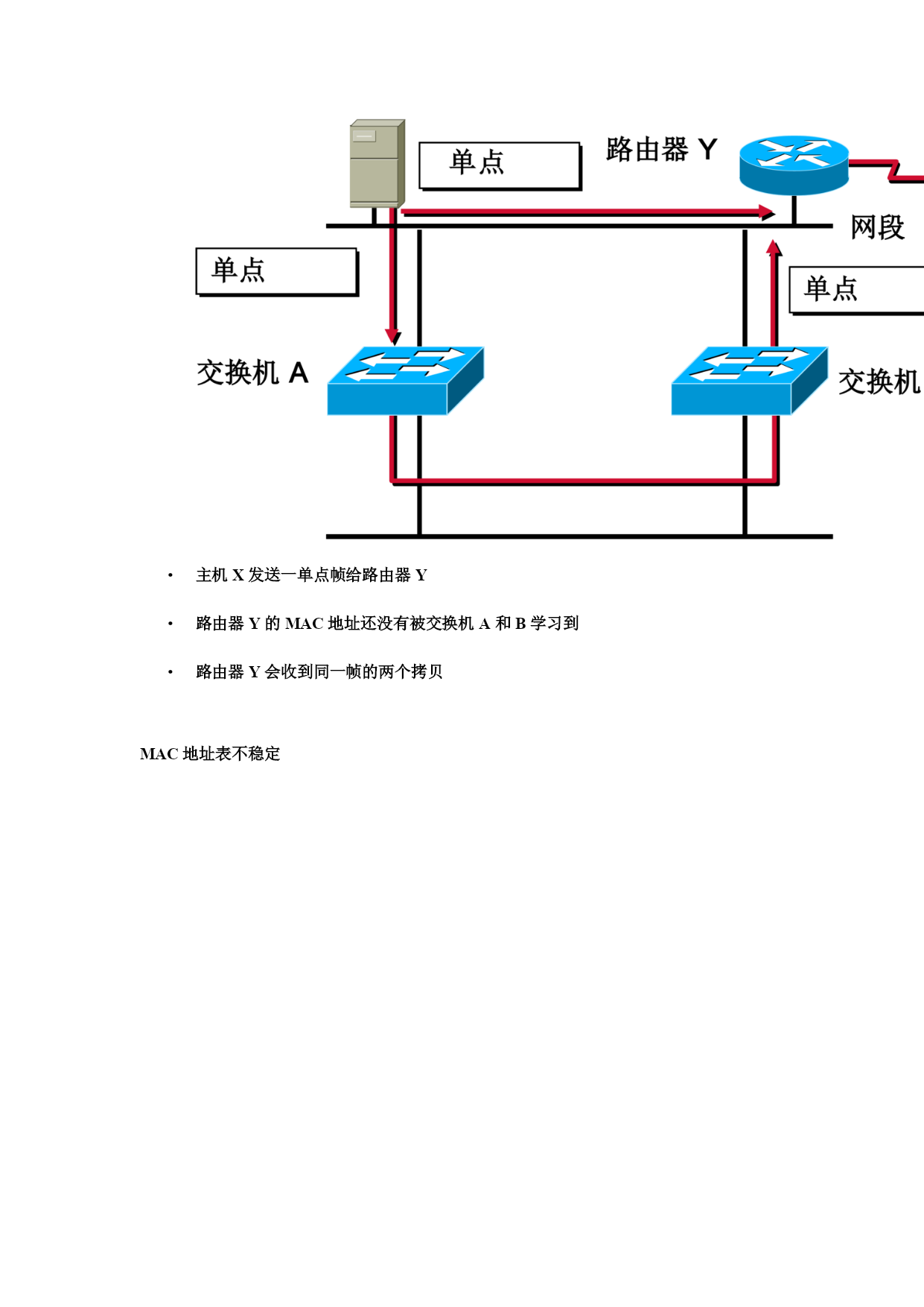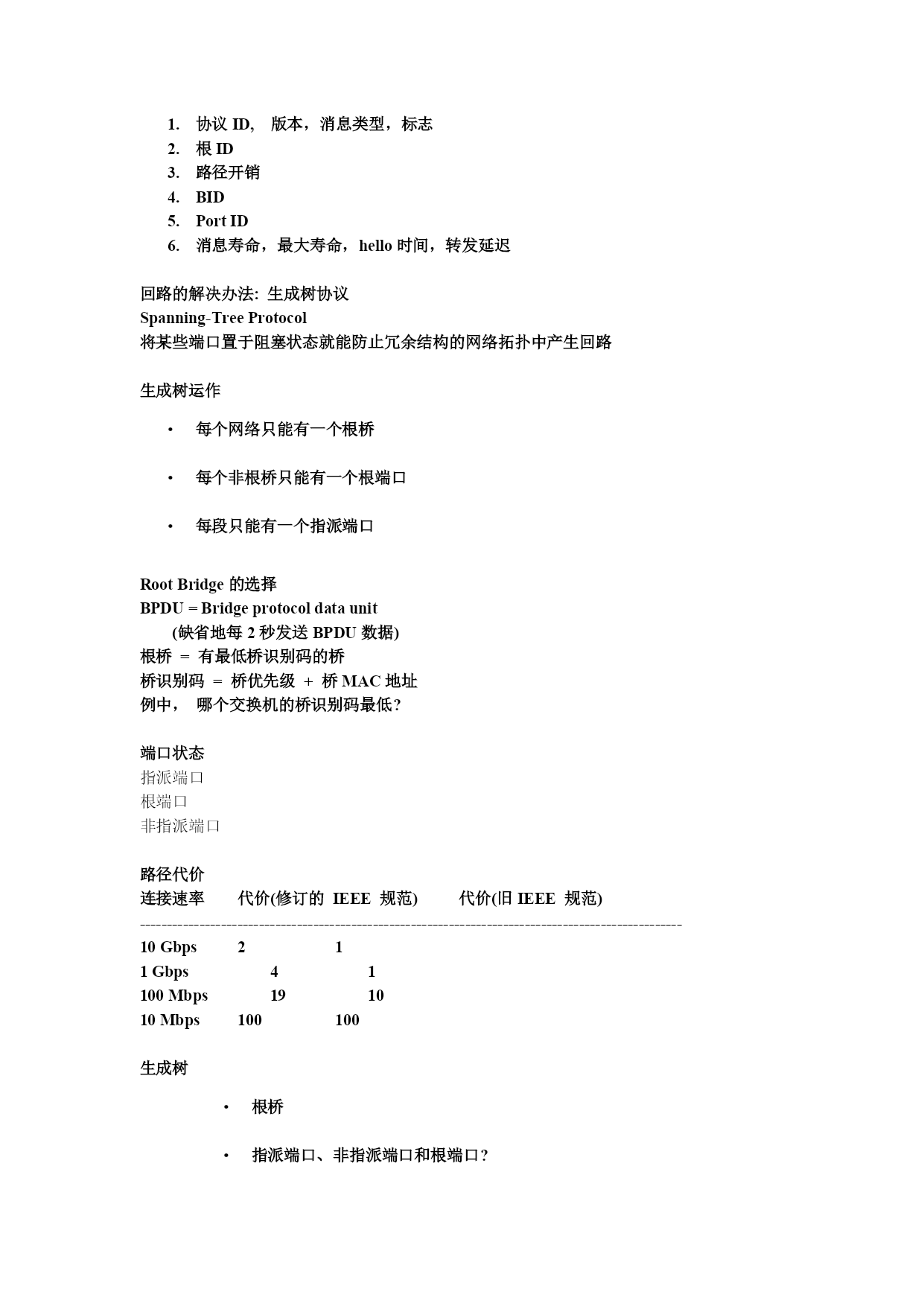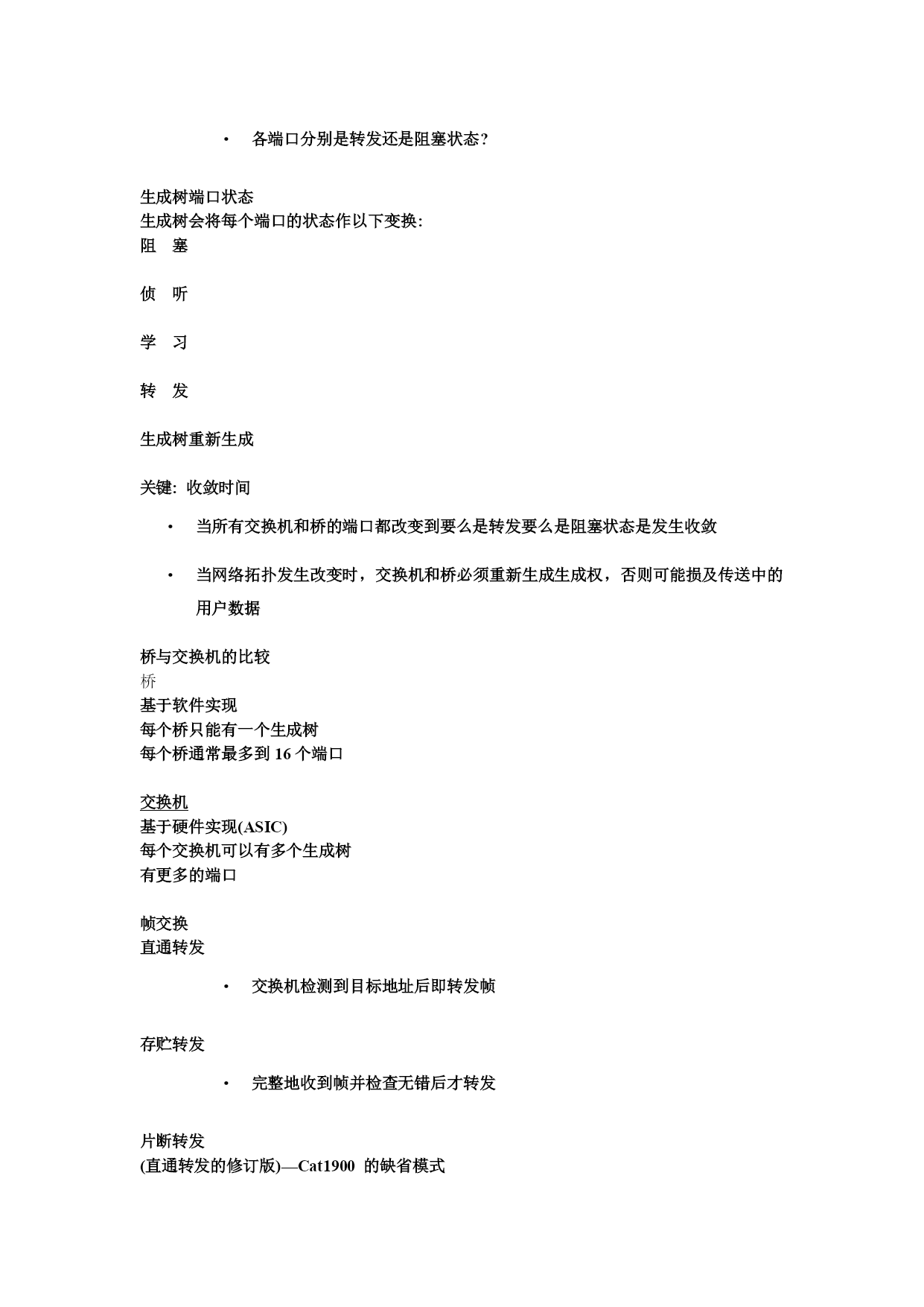 实验八交换机的配置(理论部分)本章目标通过本章的学习,您应该掌握以下内容:能描述2层交换(桥接)的运作能描述Catalyst1900系列交换机运作清楚Catalyst1900系列交换机的出厂缺省配置配置Catalyst1900系列交换机利用show命令确认Catalyst1900系列交换机的配置和运作交换机的三个功能地址学习帧的转发/过滤回路防止交换机学习主机的位置的过程最初开机时MAC地址表是空的主机A发送数据帧给主机C交换机通过学习数据帧的源MAC地址,记录下主机A的MAC地址对应端口E0该数据帧转发到除端口E0以外的其它所有端口(不清楚目标主机的单点传送用泛洪方式)主机D发送数据帧给主机C交换机通过学习数据帧的源MAC地址,记录下主机D的MAC地址对应端口E03该数据帧转发到除端口E3以外的其它所有端口(不清楚目标主机的单点传送用泛洪方式)交换机A发送数据帧给主机C在地址表中有目标主机,数据帧不会泛洪而直接转发广播帧和多点传送帧主机D发送广播帧或多点帧广播帧或多点帧泛洪到除源端口外的所有端口冗余网络拓扑冗余拓扑消除了由于单点故障所引致的网络不通问题冗余拓扑却带来了广播风暴、重复帧和MAC地址表不稳定的问题广播风暴交换机不停地发出广播信息重复帧主机X发送一单点帧给路由器Y路由器Y的MAC地址还没有被交换机A和B学习到路由器Y会收到同一帧的两个拷贝MAC地址表不稳定主机X发送一单点帧给路由器Y路由器Y的MAC地址还没有被交换机A和B学习到交换机A和B都学习到主机X的MAC地址对应端口0到路由器Y的数据帧在交换机A和B上会泛洪处理交换机A和B都错误学习到主机X的MAC地址对应端口多重回路问题更复杂的拓扑结构可能导致多重回路在第2层没有能够防止这种回路的机制BUDP的任务选举根桥确定冗余路径位置通过阻塞特定端口来避免环路通告网络拓扑变更监控生成树的状态BPDU的内容协议ID,版本,消息类型,标志根ID路径开销BIDPortID消息寿命,最大寿命,hello时间,转发延迟回路的解决办法:生成树协议Spanning-TreeProtocol将某些端口置于阻塞状态就能防止冗余结构的网络拓扑中产生回路生成树运作每个网络只能有一个根桥每个非根桥只能有一个根端口每段只能有一个指派端口RootBridge的选择BPDU=Bridgeprotocoldataunit(缺省地每2秒发送BPDU数据)根桥=有最低桥识别码的桥桥识别码=桥优先级+桥MAC地址例中,哪个交换机的桥识别码最低?端口状态指派端口根端口非指派端口路径代价连接速率代价(修订的IEEE规范)代价(旧IEEE规范)----------------------------------------------------------------------------------------------------10Gbps211Gbps41100Mbps191010Mbps100100生成树根桥指派端口、非指派端口和根端口?各端口分别是转发还是阻塞状态?生成树端口状态生成树会将每个端口的状态作以下变换:阻塞侦听学习转发生成树重新生成关键:收敛时间当所有交换机和桥的端口都改变到要么是转发要么是阻塞状态是发生收敛当网络拓扑发生改变时,交换机和桥必须重新生成生成权,否则可能损及传送中的用户数据桥与交换机的比较桥基于软件实现每个桥只能有一个生成树每个桥通常最多到16个端口交换机基于硬件实现(ASIC)每个交换机可以有多个生成树有更多的端口帧交换直通转发交换机检测到目标地址后即转发帧存贮转发完整地收到帧并检查无错后才转发片断转发(直通转发的修订版)—Cat1900的缺省模式交换机检测到帧的前64字节后即转发双工综述半双工(CSMA/CD)单向数据传送冲突可能性高用集线器连接全双工只能用于点对点连接到特定的端口两端均须支持全双工无冲突冲突检测电路关闭配置交换机Catalyst1900菜单界面基于Web的管理VSM(VisualSwitchManager)IOS命令行界面双工不匹配连接的两个端口人工地设置了不同的双工参数交换机端口为自动协商模式,连接到端口的另一端设为不自动协商的全双工模式,会导致交换机的端口置于半双工模式本章总结通过本章的学习,您应该掌握以下内容:能描述2层交换(桥接)的运