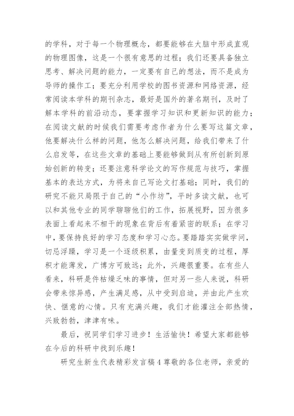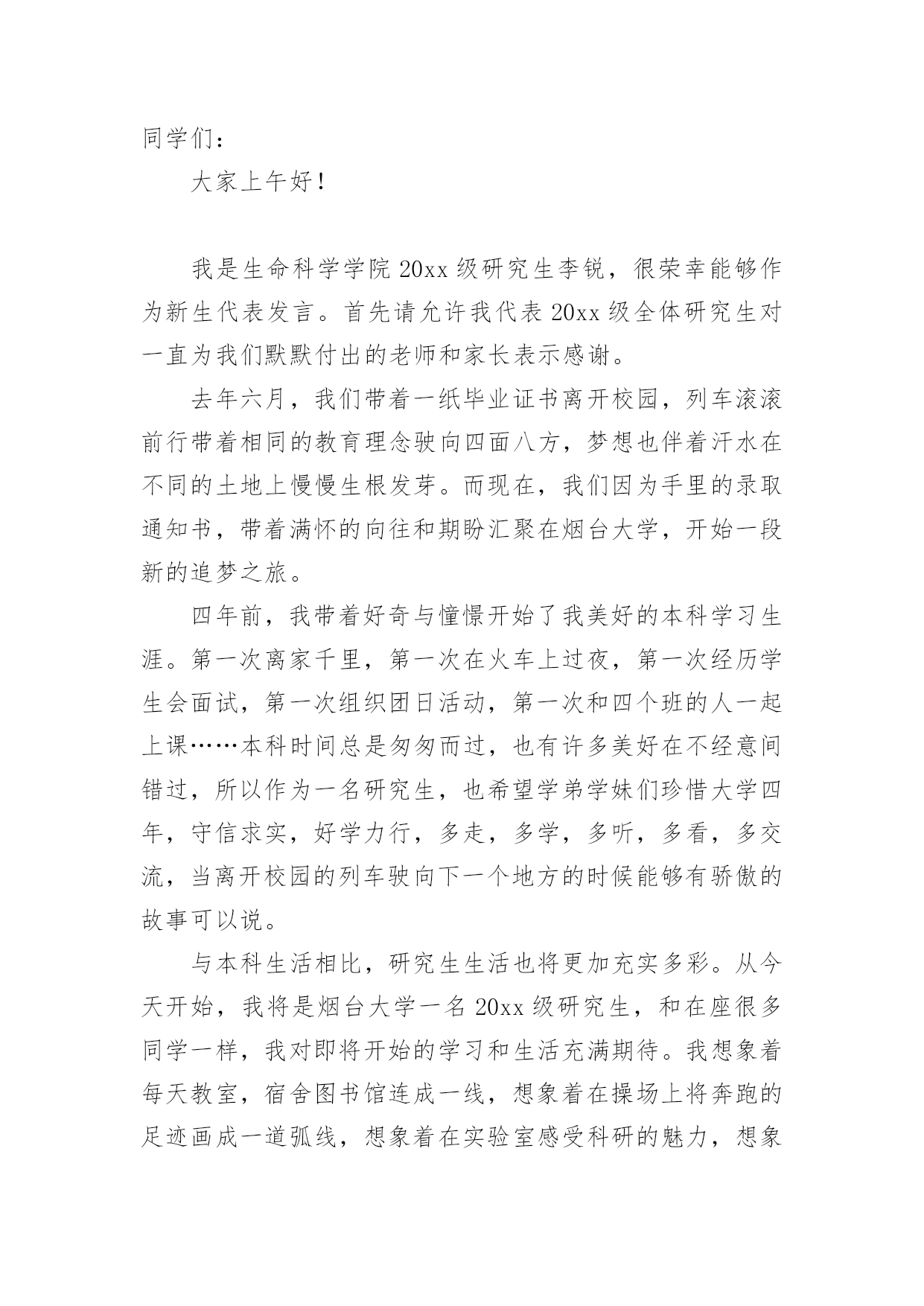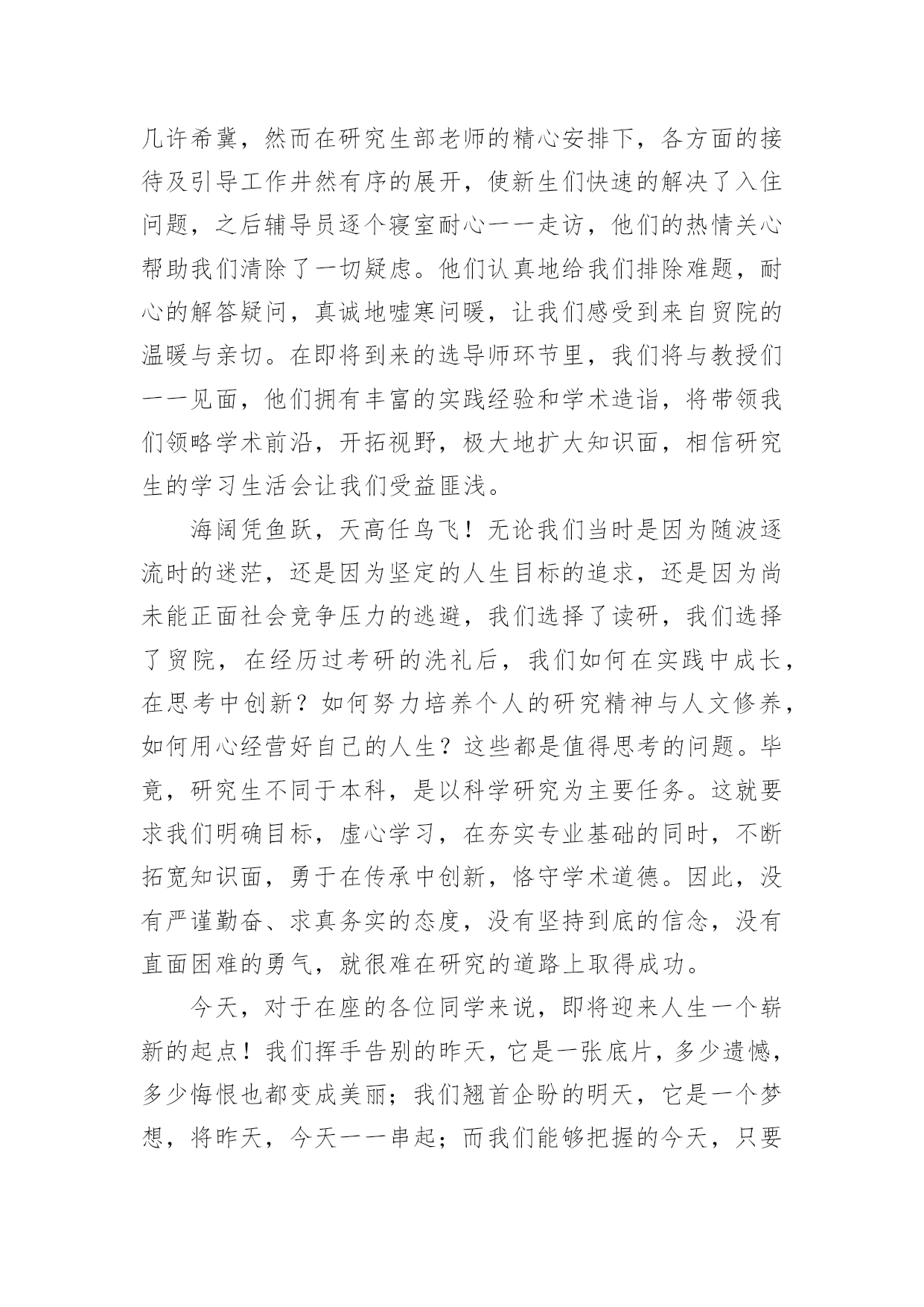 研究生新生代表精彩发言稿研究生新生代表精彩发言稿(通用6篇)在日常生活和工作中,我们总不得不需要用到发言稿,发言稿具有观点鲜明,内容具有鼓动性的特点。相信写发言稿是一个让许多人都头痛的问题,下面是小编为大家整理的研究生新生代表精彩发言稿(通用6篇),欢迎大家借鉴与参考,希望对大家有所帮助。研究生新生代表精彩发言稿1尊敬的各位老师,亲爱的同学们:大家上午好!我是国际法的xx,很荣幸今天在这里代表全体研究生新生发言,首先,欢迎在座各位来到贸院大家庭,你们的加入,将给贸院带来更加充沛的活力和激情。作为上海对外贸易学院的研究生新生,本科生老生,在贸院的四年,我有幸与母校一起成长,见证了学校办学新格局的开辟与发展;见证了学校在诸多大型比赛的道路上斩获一等奖乃至全球总冠军等等优异成绩;在春去秋来的四年里,我感受到贸院严谨的学术底蕴、优秀的师资队伍、完善的教学设施,不仅如此,贸院拥有的住宿和生活条件,为我们提供了良好的学习和生活环境;贸院优秀的研究生导师队伍,相信也将为在座的各位同学提供一个学习和展示自我的平台。对于刚刚步入贸院的各位来说,也许会带有几许疑惑和几许希冀,然而在研究生部老师的精心安排下,各方面的接待及引导工作井然有序的展开,使新生们快速的解决了入住问题,之后辅导员逐个寝室耐心一一走访,他们的热情关心帮助我们清除了一切疑虑。他们认真地给我们排除难题,耐心的解答疑问,真诚地嘘寒问暖,让我们感受到来自贸院的温暖与亲切。在即将到来的选导师环节里,我们将与教授们一一见面,他们拥有丰富的实践经验和学术造诣,将带领我们领略学术前沿,开拓视野,极大地扩大知识面,相信研究生的学习生活会让我们受益匪浅。海阔凭鱼跃,天高任鸟飞!无论我们当时是因为随波逐流时的迷茫,还是因为坚定的人生目标的追求,还是因为尚未能正面社会竞争压力的逃避,我们选择了读研,我们选择了贸院,在经历过考研的洗礼后,我们如何在实践中成长,在思考中创新?如何努力培养个人的研究精神与人文修养,如何用心经营好自己的人生?这些都是值得思考的问题。毕竟,研究生不同于本科,是以科学研究为主要任务。这就要求我们明确目标,虚心学习,在夯实专业基础的同时,不断拓宽知识面,勇于在传承中创新,恪守学术道德。因此,没有严谨勤奋、求真务实的态度,没有坚持到底的信念,没有直面困难的勇气,就很难在研究的道路上取得成功。今天,对于在座的各位同学来说,即将迎来人生一个崭新的起点!我们挥手告别的昨天,它是一张底片,多少遗憾,多少悔恨也都变成美丽;我们翘首企盼的明天,它是一个梦想,将昨天,今天一一串起;而我们能够把握的今天,只要我们有接近梦想的巨大勇气和努力,再大的梦想都能够被我们牢牢抓在手里,摊开手心,它是一道掌线,它已经属于我们,它就是我们的未来。谢谢!研究生新生代表精彩发言稿2尊敬的各位老师,亲爱的同学们:大家好!我是xx专业20xx级新生xxx,非常荣幸能够代表研一新生发言。首先请允许我代表14级新生向为我们入学提供热情服务的老师和师兄师姐们表示衷心的感谢!我们怀着同一个求学的理想,从祖国各地汇聚在这里。回首我们曾经历过的无数挑灯夜战,奋力备考的日子,今天的开学典礼别有一番滋味在心头。那一个个求学路上的悲喜瞬间见证了我们履行誓言、坚守信念、执着梦想的青春岁月。曾经挥汗如雨的付出已变为今天踌躇满志的希望。我们这些曾经的胜利者就要踏上新的征途。在这本该属于收获的季节里,我们要把一颗颗梦想和希望的种子深埋在兰大这块科研的沃土之中。我们坚信,三年之后,我们今天的希望与梦想将在充满生机与活力的资环放飞,扬帆远航。作为一名兰大人,我深感自豪!“大学之大,在于精神之立”,大学的精神是一所大学的灵魂所在。兰州大学,这座孤独舞动了百年的高等学府,即将将她最宝贵的精神财富给予我们,这份日益稀少的朴实无华和美好憧憬,这种甘于寂寞、乐于奉献的胡杨精神将时刻砥砺我心。我们是新一代的兰大人,兰大“勤奋、求实、进取”的学风需要我们去弘扬,兰大“自强不息、独树一帜”的精神需要我们去光大。作为一名资环人,我倍加骄傲!我们要牢记李先生的“读万卷书穷途万里;行万里路明德亲民”的嘱托,诚实守信,脚踏实地,争做“真人”,学做“君子”;我们要将资环人勇闯三极的精神作为激励我们不断前进的动力,勇于创新,敢于质疑,不断提高自身综合素质,做一名合格的社会主义建设者和接班人;我们要时刻谨记资环人“自强不息、勇闯高峰”的精神,体会到“海纳百川,独树一帜”的独有风姿。最后,衷心地祝愿大家,在兰大这片因我们而美丽的土地上,收获真知与人生的意义,从这个值得纪念的日子起,书写我们人生路上一幕崭新的华丽篇章!谢谢大家!研究生新生代表精彩发言稿3尊敬的各位老师,亲爱的同学们:大家好!今天很高兴能够有机会参加你们的开学典礼。大家能够坐在这里,相信你们在本科阶段都是比较优秀的