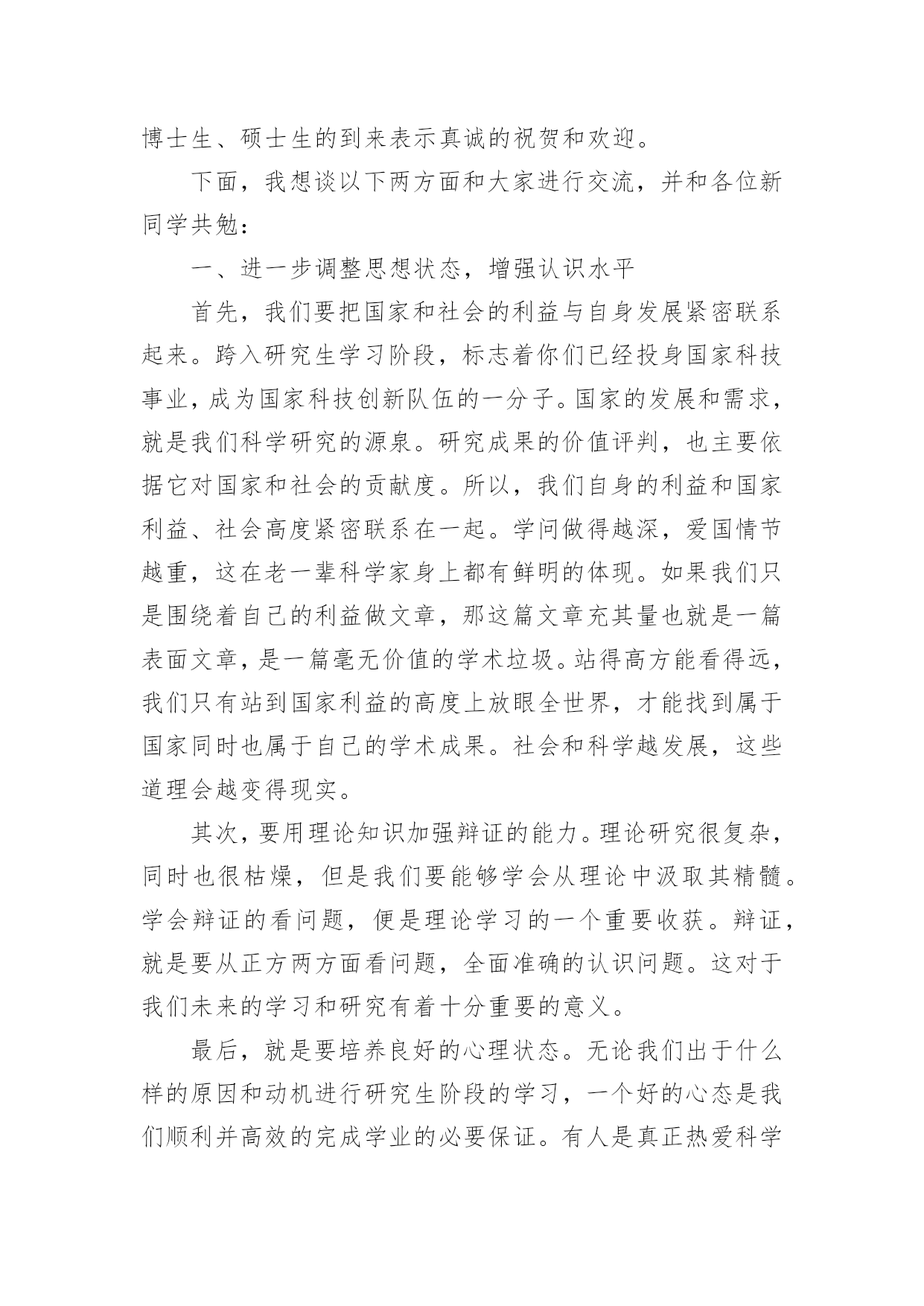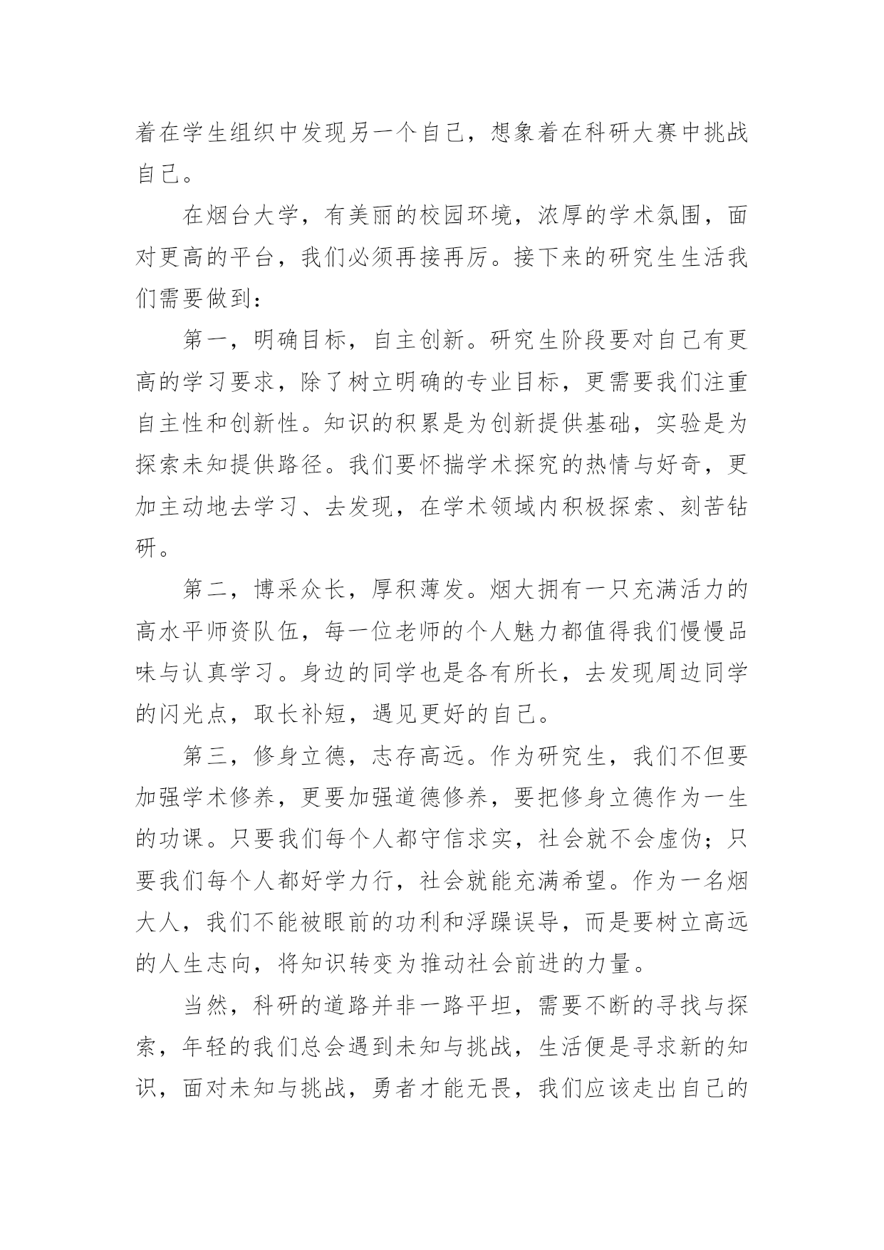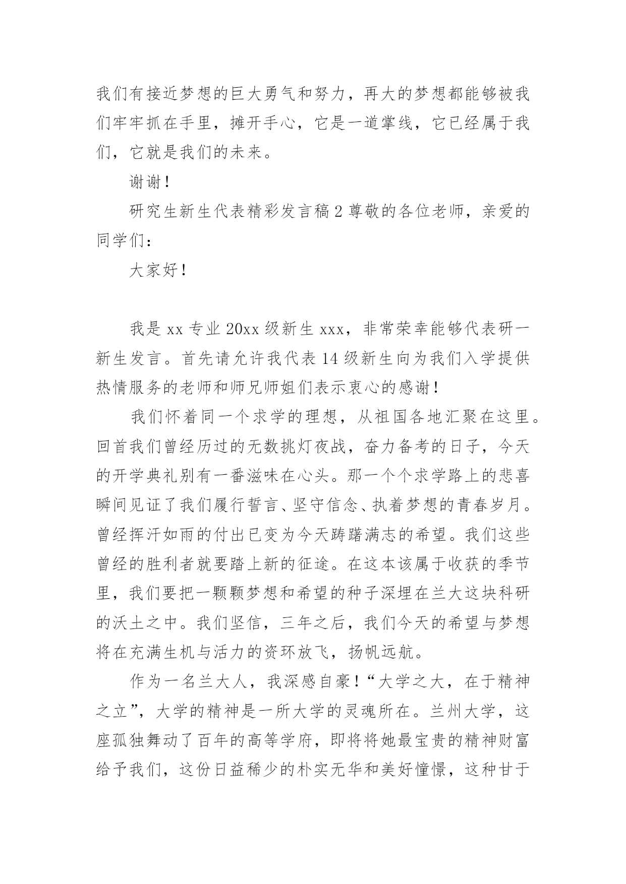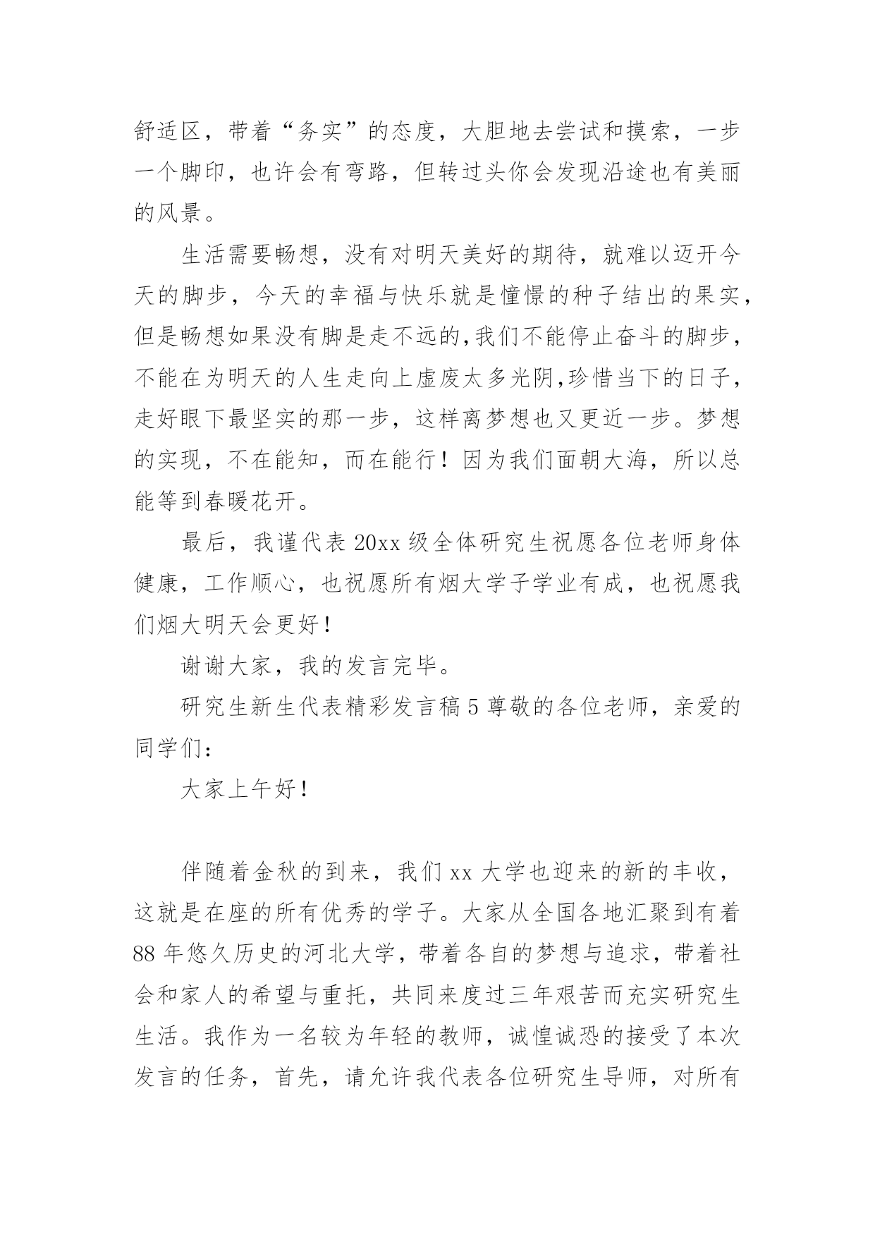 研究生新生代表精彩发言稿研究生新生代表精彩发言稿(通用6篇)在日常生活和工作中,我们总不得不需要用到发言稿,发言稿具有观点鲜明,内容具有鼓动性的特点。相信写发言稿是一个让许多人都头痛的问题,下面是小编为大家整理的研究生新生代表精彩发言稿(通用6篇),欢迎大家借鉴与参考,希望对大家有所帮助。研究生新生代表精彩发言稿1尊敬的各位老师,亲爱的同学们:大家上午好!我是国际法的xx,很荣幸今天在这里代表全体研究生新生发言,首先,欢迎在座各位来到贸院大家庭,你们的加入,将给贸院带来更加充沛的活力和激情。作为上海对外贸易学院的研究生新生,本科生老生,在贸院的四年,我有幸与母校一起成长,见证了学校办学新格局的开辟与发展;见证了学校在诸多大型比赛的道路上斩获一等奖乃至全球总冠军等等优异成绩;在春去秋来的四年里,我感受到贸院严谨的学术底蕴、优秀的师资队伍、完善的教学设施,不仅如此,贸院拥有的住宿和生活条件,为我们提供了良好的学习和生活环境;贸院优秀的研究生导师队伍,相信也将为在座的各位同学提供一个学习和展示自我的平台。对于刚刚步入贸院的各位来说,也许会带有几许疑惑和几许希冀,然而在研究生部老师的精心安排下,各方面的接待及引导工作井然有序的展开,使新生们快速的解决了入住问题,之后辅导员逐个寝室耐心一一走访,他们的热情关心帮助我们清除了一切疑虑。他们认真地给我们排除难题,耐心的解答疑问,真诚地嘘寒问暖,让我们感受到来自贸院的温暖与亲切。在即将到来的选导师环节里,我们将与教授们一一见面,他们拥有丰富的实践经验和学术造诣,将带领我们领略学术前沿,开拓视野,极大地扩大知识面,相信研究生的学习生活会让我们受益匪浅。海阔凭鱼跃,天高任鸟飞!无论我们当时是因为随波逐流时的迷茫,还是因为坚定的人生目标的追求,还是因为尚未能正面社会竞争压力的逃避,我们选择了读研,我们选择了贸院,在经历过考研的洗礼后,我们如何在实践中成长,在思考中创新?如何努力培养个人的研究精神与人文修养,如何用心经营好自己的人生?这些都是值得思考的问题。毕竟,研究生不同于本科,是以科学研究为主要任务。这就要求我们明确目标,虚心学习,在夯实专业基础的同时,不断拓宽知识面,勇于在传承中创新,恪守学术道德。因此,没有严谨勤奋、求真务实的态度,没有坚持到底的信念,没有直面困难的勇气,就很难在研究的道路上取得成功。今天,对于在座的各位同学来说,即将迎来人生一个崭新的起点!我们挥手告别的昨天,它是一张底片,多少遗憾,多少悔恨也都变成美丽;我们翘首企盼的明天,它是一个梦想,将昨天,今天一一串起;而我们能够把握的今天,只要我们有接近梦想的巨大勇气和努力,再大的梦想都能够被我们牢牢抓在手里,摊开手心,它是一道掌线,它已经属于我们,它就是我们的未来。谢谢!研究生新生代表精彩发言稿2尊敬的各位老师,亲爱的同学们:大家好!我是xx专业20xx级新生xxx,非常荣幸能够代表研一新生发言。首先请允许我代表14级新生向为我们入学提供热情服务的老师和师兄师姐们表示衷心的感谢!我们怀着同一个求学的理想,从祖国各地汇聚在这里。回首我们曾经历过的无数挑灯夜战,奋力备考的日子,今天的开学典礼别有一番滋味在心头。那一个个求学路上的悲喜瞬间见证了我们履行誓言、坚守信念、执着梦想的青春岁月。曾经挥汗如雨的付出已变为今天踌躇满志的希望。我们这些曾经的胜利者就要踏上新的征途。在这本该属于收获的季节里,我们要把一颗颗梦想和希望的种子深埋在兰大这块科研的沃土之中。我们坚信,三年之后,我们今天的希望与梦想将在充满生机与活力的资环放飞,扬帆远航。作为一名兰大人,我深感自豪!“大学之大,在于精神之立”,大学的精神是一所大学的灵魂所在。兰州大学,这座孤独舞动了百年的高等学府,即将将她最宝贵的精神财富给予我们,这份日益稀少的朴实无华和美好憧憬,这种甘于寂寞、乐于奉献的胡杨精神将时刻砥砺我心。我们是新一代的兰大人,兰大“勤奋、求实、进取”的学风需要我们去弘扬,兰大“自强不息、独树一帜”的精神需要我们去光大。作为一名资环人,我倍加骄傲!我们要牢记李先生的“读万卷书穷途万里;行万里路明德亲民”的嘱托,诚实守信,脚踏实地,争做“真人”,学做“君子”;我们要将资环人勇闯三极的精神作为激励我们不断前进的动力,勇于创新,敢于质疑,不断提高自身综合素质,做一名合格的社会主义建设者和接班人;我们要时刻谨记资环人“自强不息、勇闯高峰”的精神,体会到“海纳百川,独树一帜”的独有风姿。最后,衷心地祝愿大家,在兰大这片因我们而美丽的土地上,收获真知与人生的意义,从这个值得纪念的日子起,书写我们人生路上一幕崭新的华丽篇章!谢谢大家!研究生新生代表精彩发言稿3尊敬的各位老师,亲爱的同学们:大家好!今天很高兴能够有机会参加你们的开学典礼。大家能够坐在这里,相信你们在本科阶段都是比较优秀的