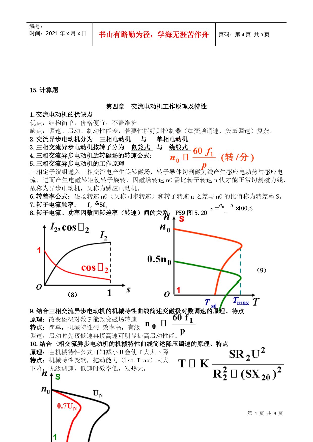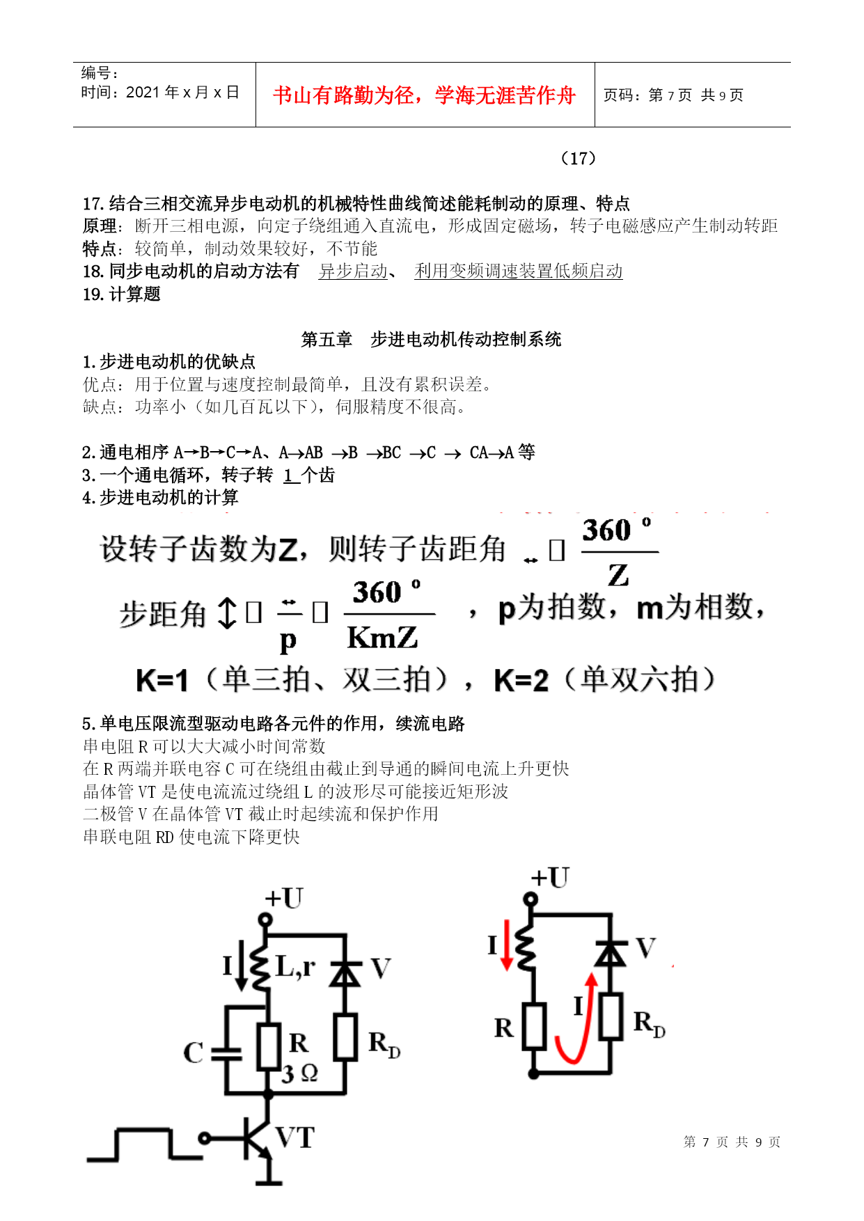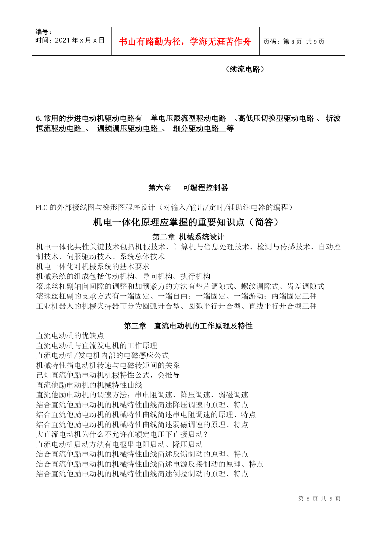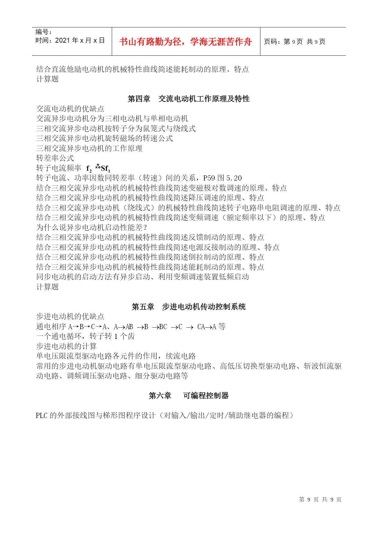 编号:时间:2021年x月x日书山有路勤为径,学海无涯苦作舟页码:第PAGE9页共NUMPAGES9页第PAGE\*MERGEFORMAT9页共NUMPAGES\*MERGEFORMAT9页机电一体化原理应掌握的重要知识点(简答)第二章机械系统设计1.机电一体化共性关键技术包括机械技术、计算机与信息处理技术、检测与传感技术、自动控制技术、伺服驱动技术、系统总体技术2.机电一体化对机械系统的基本要求:(1).精度高、刚度高、无间隙(尽可能小)(2).响应快、摩擦小、惯量小、谐振频率高(高接触刚度,可避免共振)(3).稳定性好、可靠性高、阻尼合适、体积小、重量轻、寿命长等3.机械系统的组成包括传动机构、导向机构(起导向与支承作用)、执行机构4.滚珠丝杠副轴向间隙的调整和加预紧力的方法有垫片调隙式、螺纹调隙式、齿差调隙式5.滚珠丝杠副的支承方式有一端固定、一端自由;一端固定、一端游动;两端固定三种6.工业机器人的机械夹持器可分为圆弧开合型、圆弧平行开合型、直线平行开合型三种第三章直流电动机的工作原理及特性1.直流电动机的优缺点:优点:调速、启动、制动性能好,控制器简单,短时过载能力强。缺点:结构较复杂,价格较高,换向器与电刷处有火花放电腐蚀,需定期维护。2.直流电动机与直流发电机的工作原理直流电动机:电动机定子提供磁场,直流电源向转子的绕组提供电流,换向器使转子电流与磁场产生的转矩保持方向不变。直流发电机:直流发电机的工作原理就是把电枢线圈中感应产生的交变电动势,靠换向器配合电刷的换向作用,使之从电刷端引出时变为直流电动势的原理。3.直流电动机/发电机内部的电磁感应公式,机械特性指电动机转速与电磁转矩间的关系,已知直流他励电动机机械特性公式,会推导4.直流他励电动机的机械特性曲线:5.直流他励电动机的调速方法:串电阻调速、降压调速、弱磁调速6.结合直流他励电动机的机械特性曲线简述降压调速的原理、特点:原理:降压使n0下降,而Δn及斜率不变,向下平移特点:机械特性硬,效率高,无级调速,适合准确自动控速,可用于电机启动。(4)7.结合直流他励电动机的机械特性曲线简述串电阻调速的原理、特点:原理:电枢总电阻为Ra+R,使Δn增大特点:简单,机械特性变软,不节能,有级调速。(6)8.结合直流他励电动机的机械特性曲线简述弱磁调速的原理、特点原理:减小F使n0增大,而Δn增大剧烈得多磁场减弱,IN不变,电机输出转矩下降(7)特点:机械特性软,拖动能力下降,无级调速,用于轻载时高速(>nN)运行,如机床刀架快进。(8)(9)9.结合直流他励电动机的机械特性曲线简述反馈制动的原理、特点原理:当电机n>n0时,因电枢电流方向改变,电磁转矩方向也改变,成为制动转矩。特点:制动转矩大,速度稳定性好,效率高,节能。10.直流电动机启动方法有电枢串电阻启动、降压启动11.大直流电动机为什么不允许在额定电压下直接启动?(1)、启动电流Ist太大会使换向器产生严重的火花,烧坏换向器;破坏电网工作。(2)、启动转矩太大,机械冲击太大,使传动机构损坏。12.结合直流他励电动机的机械特性曲线简述电源反接制动的原理、特点原理:因为电枢电流方向改变,所以电磁转矩方向也改变,为制动转矩,为避免电枢电流过大,需串足够大电阻。特点:1)设备较简单,制动转矩大,常用于快速停车和快速反向运行。(2)能量损耗大。13.结合直流他励电动机的机械特性曲线简述倒拉制动的原理、特点原理:在电枢串入较大的电阻,使(n=0时的电磁转矩T)小于负载转矩TL,这样在位能负载转矩TL的作用下,电动机反转(n为负,下放重物),一直到D点稳定运行特点:串入不同的电阻可灵活调整反转速度,能量损耗较大,速度稳定性较差。14.结合直流他励电动机的机械特性曲线简述能耗制动的原理、特点原理:停止对电枢供电,给电枢串电阻特点:1)设备简单,运行可靠。2)减速较快,速度稳定性比倒拉制动好3)低速时制动效果较差15.计算题第四章交流电动机工作原理及特性1.交流电动机的优缺点优点:结构简单,价格便宜,不需维护。缺点:调速、启动、制动性能差,若要性能好则控制器(如变频调速、矢量调速)复杂。2.交流异步电动机分为三相电动机与单相电动机3.三相交流异步电动机按转子分为鼠笼式与绕线式4.三相交流异步电动机旋转磁场的转速公式:5.三相交流异步电动机的工作原理三相定子绕组通入三相交流电产生旋转磁场,转子导体切割磁力线产生感应电动势与感应电流,进而产生电磁转矩使转子旋转,因磁