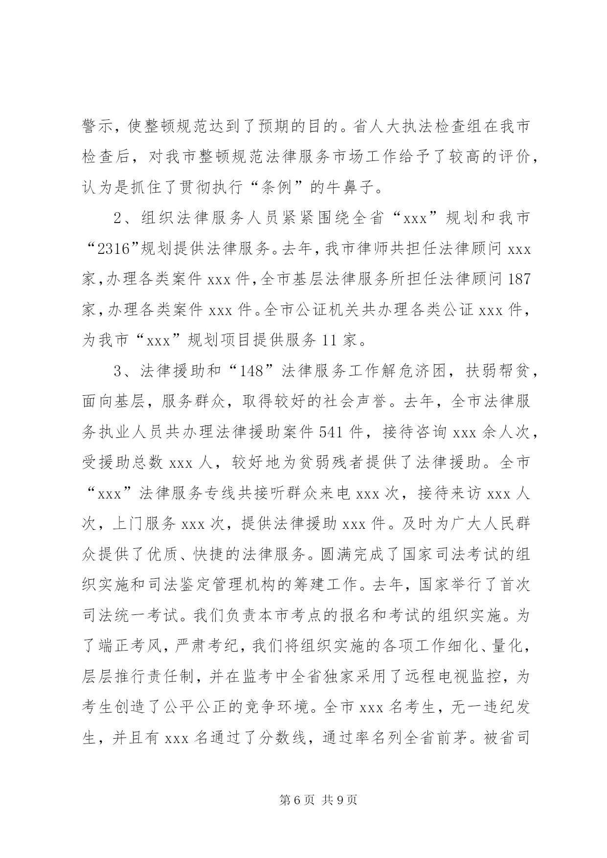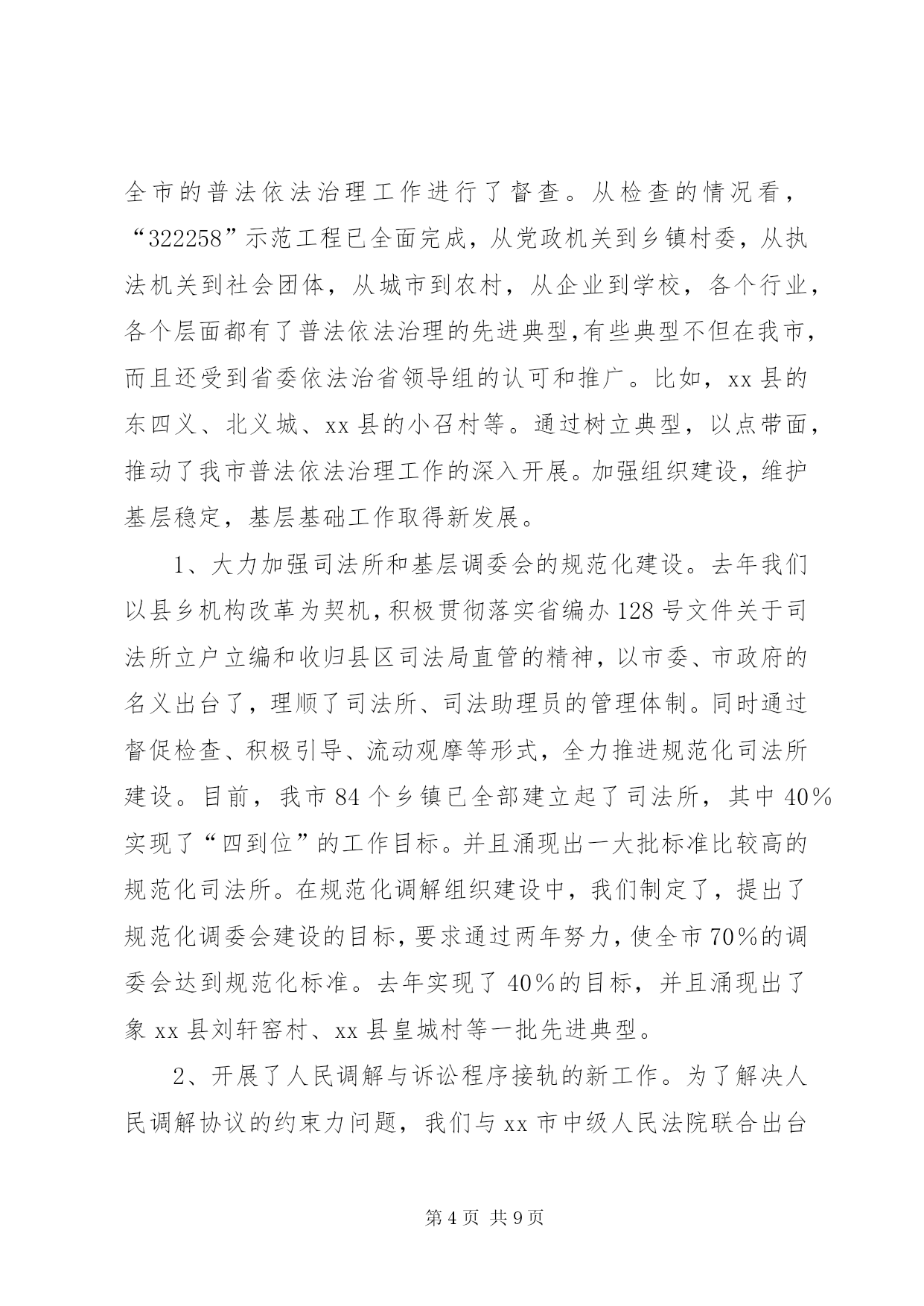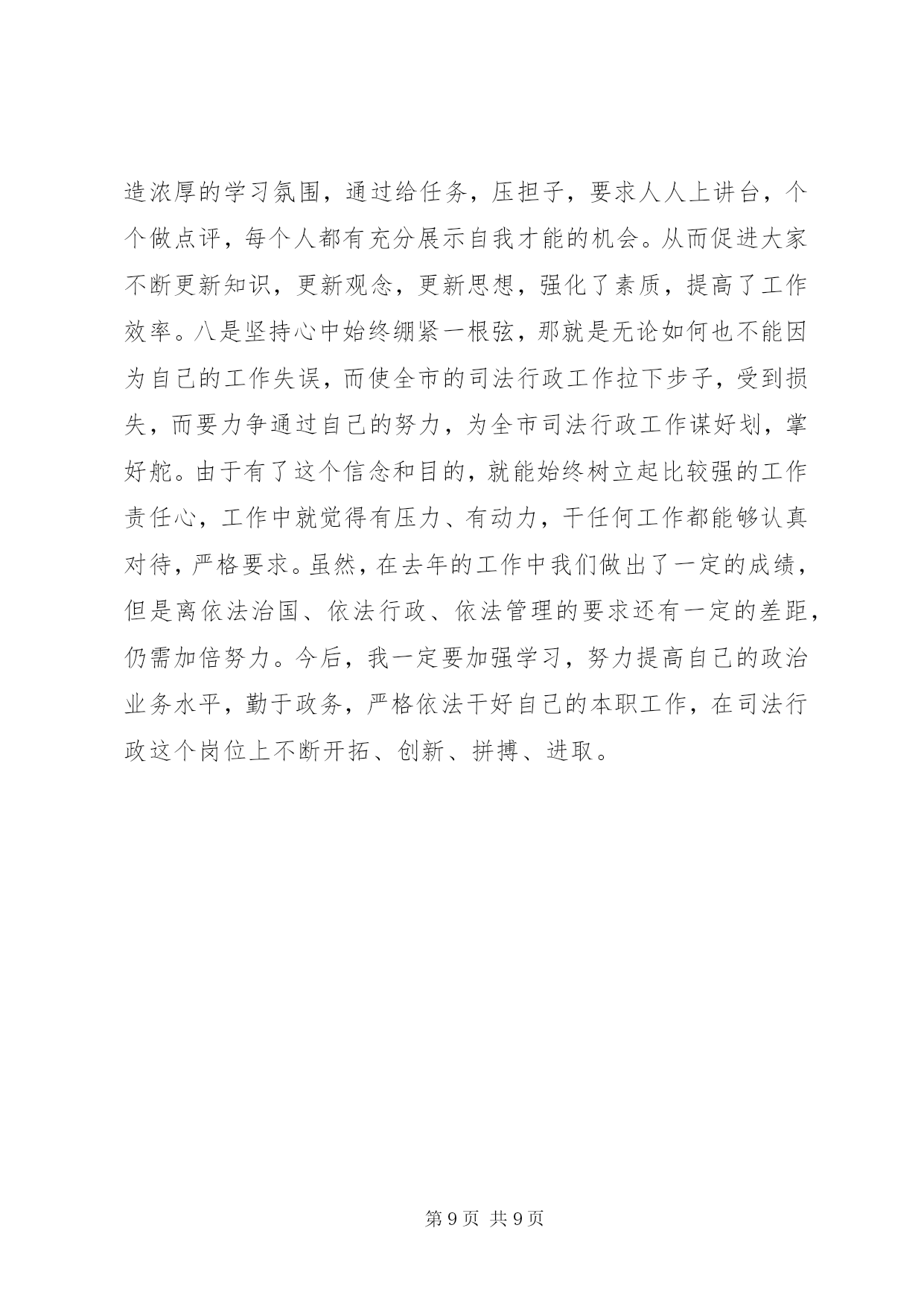 第PAGE\*Arabic\*MERGEFORMAT9页共NUMPAGES\*MERGEFORMAT9页年度述职报告(司法系统)尊敬的主任、副主任、秘书长、各位委员:我是****年11月在市四届人大常委会三次会议上被任命为市司法局局长的,到任一年多来,我以邓小平理论为指导,积极实践“三个代表”重要思想,在市委、市政府的领导下,在市人大的监督下,严格依法办事,积极努力开拓,圆满地完成了各项司法行政工作。下面将我一年来的工作述职如下:一、落实市人大及其常委会的决议、决定及办理人大代表建议、意见情况人民代表大会制度是我国的根本政治制度,维护人大权力机关的地位,认真贯彻落实人大权力机关的决议、决定是每一名领导干部的应尽义务。全年工作中,我们坚持自觉把整个司法行政机关的工作置于市人大及其常委会的监督之下,认真落实市人大及其常委会的决议、决定,主动向人大汇报工作,虚心接受人大代表的意见和建议,认真办理人大代表的提案。去年人大代表“关于建立xx市企业及个人信用惩戒制度的议案”涉及到我们的法律服务行业。虽然,诚实守信是我们开展的整顿规范法律服务市场的主要内容,已进行了安排部署,但我们还是即刻就此问题进行研究,责成专人就我们计划采取的强化措施,向提案人进行反馈,提案人对我们采取的措施表示满意。二、完成年度工作目标和兑现承诺公示情况以普法重点对象培训工作为核心,大力实施依法治理三大工程,普法依法治理工作全面推进。1、抓培训,法制宣传教育工作更加扎实有效。去年的法制宣传教育我们重点抓了普法重点对象的培训。20**年7月,组织了建市以来规模最大的一次国家公务员依法行政及wto知识培训,用一个月时间对市直及各县5000余名科级以下公务员分期分批进行了培训。8月中旬,依据我局年初制定的,又对全市的农村“三职”干部及调委主任进行了培训、考试。与市经贸委对全市企业经营管理人员的普法培训进行了安排。12月,又分别对全市地厅级和处级领导干部进行了法律知识考试。在青少年的培训上,我们落实了中小学生法律教材进课堂,开展了“普法进校”活动,定期到学校开展法制讲座、上法制课。通过培训,使不同层次、不同行业、不同类型的普法对象定期接受了法律教育,法律素质得到了明显提高。去年在我省举办的“大运杯”xx省领导干部法律知识竞赛活动中,我市代表队获得了第四名的好成绩。2、抓创新,普法宣传更加新颖、活泼。为了使普法宣传能够更加贴近生活、贴近群众,更加通俗易懂,我们积极创新普法形式,将法律知识由干巴巴的法律条文,转化为生动的法治实践,收到良好成效。一是收集整理了近年来发生在我市的几十个典型案例,通过以案说法,讲身边事,说身边人,用活生生的案例启发教育人;二是充分发挥文艺宣传的作用,将相关法律编成脍炙人口的文艺节目,深受百姓的欢迎;三是充分利用农村庙会、集市等有利时机开展了“公检法司赶庙会”和“三下乡”活动,将法律知识送到了农民群众的手里;四是与市电台联合推出了专栏,每周指定一名律师到电台回答听众的咨询;五是举办了多种形式的法律知识竞赛。如我市今年举办的村官法律道德知识竞赛开了全省的先河,收到了很好的效果。我市举办的领导干部宪法及相关法律知识竞赛,有力地促进了领导干部的学法工作。六是通过开展优秀法制宣传作品“金剑奖”评选活动,提高了新闻媒体报道普法依法治理工作和宣传法律知识的热情,涌现出了一批好的法制宣传作品。特别是围绕“12.4”全国法制宣传日,我局与市人大、市委组织部、市委宣传部、市文化局、晋城电视台等单位合作,推出了“12.4”全国法制宣传日十项系列活动。在举办了宪法知识百题竞赛;在、晋城电视台、晋城人民广播电台开辟了全国法制宣传日专栏;举办了知识专场报告会和法制宣传文艺晚会;举办了法制宣传日街头咨询等活动。通过系列活动,在我市又一次掀起了学习宪法和法律的热潮。3、抓典型,依法治理示范工程全面实施。20**年,我们在全市实施了普法依法治理“322258”示范工程,、200个村委、200所中小学、50个示范行政机关和80个示范企业。为了确保这项工作能够落到实处,我们制定了详细的考核督查方案,由市委、市政府发文,组织已退下来的处级领导分别担任检查组组长,对全市的普法依法治理工作进行了督查。从检查的情况看,“322258”示范工程已全面完成,从党政机关到乡镇村委,从执法机关到社会团体,从城市到农村,从企业到学校,各个行业,各个层面都有了普法依法治理的先进典型,有些典型不但在我市,而且还受到省委依法治省领导组的认可和推广。比如,xx县的东四义、北义城、xx县的小召村等。通过树立典型,以点带面,推动了我市普法依法治理工作的深入开展。加强组织建设,维护基层稳定,基层基础工作取得新发展。1、大力加强司法所和基层调委会的规范化建设。去年我们以县乡机构改革为契机,积极贯彻