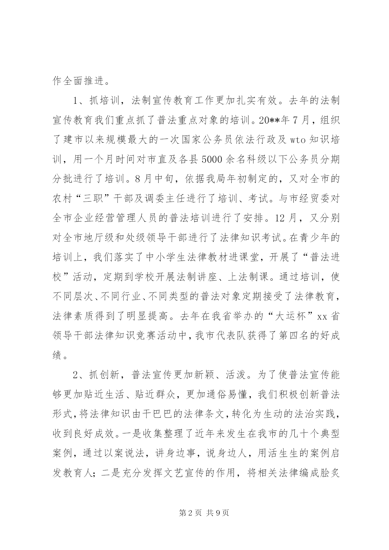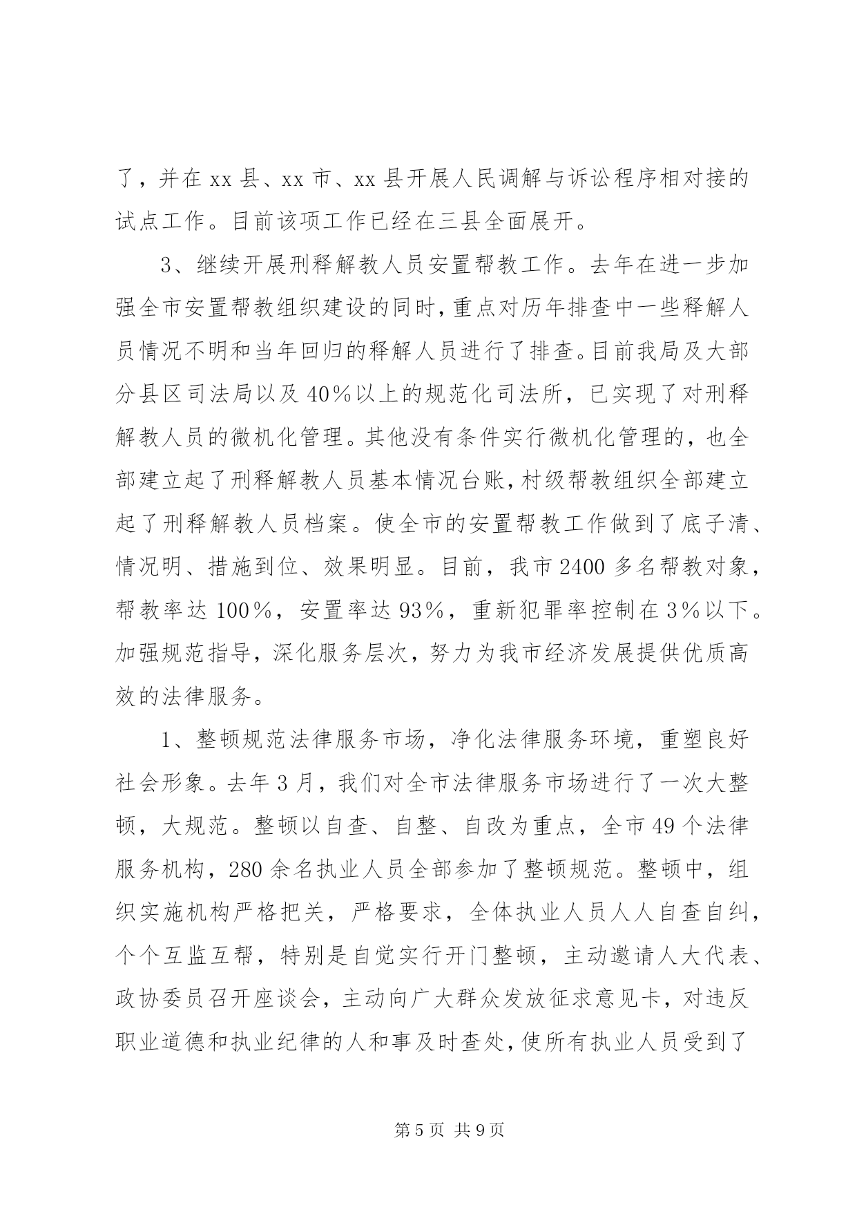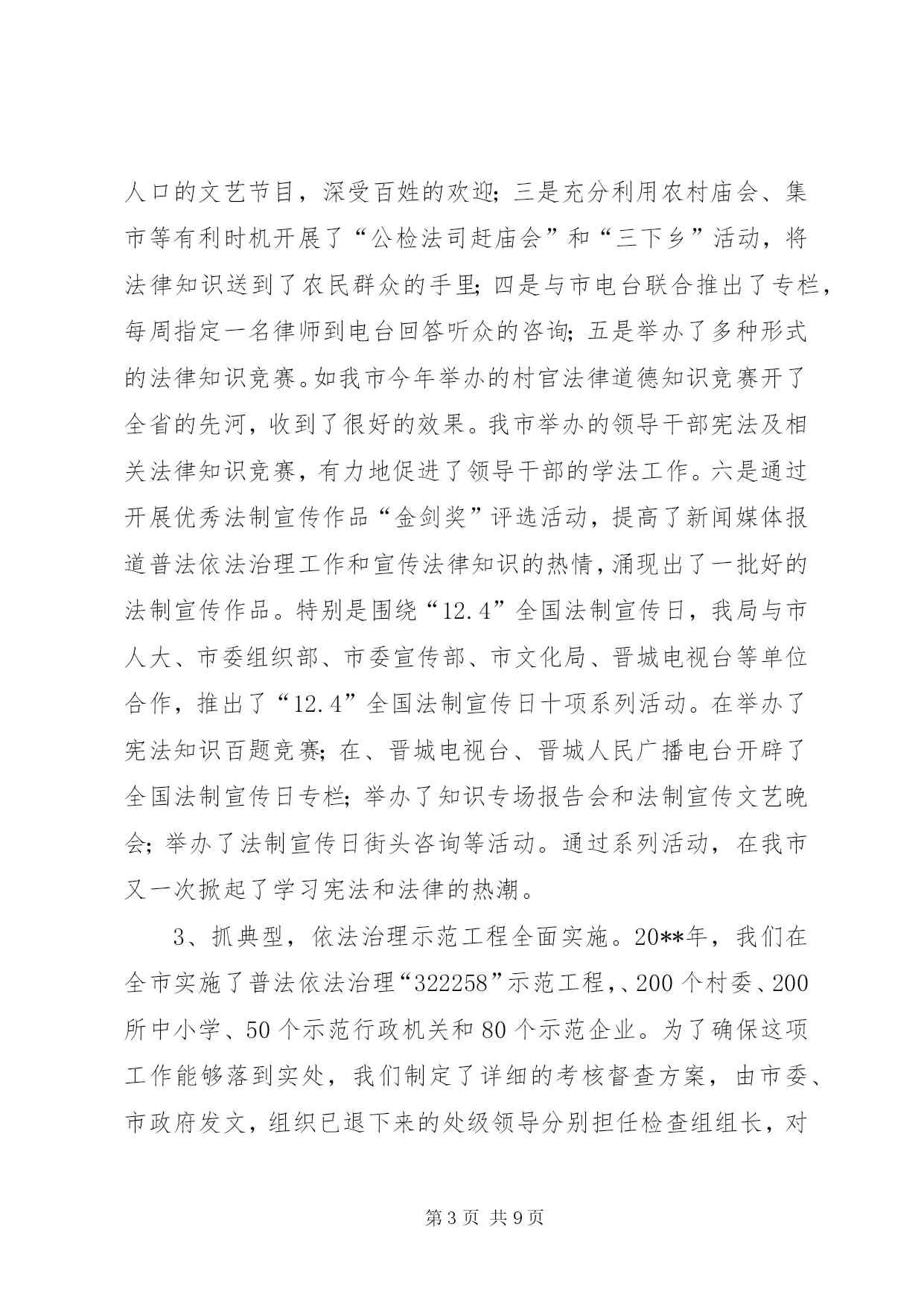 第PAGE\*Arabic\*MERGEFORMAT9页共NUMPAGES\*MERGEFORMAT9页年度述职报告(司法系统)尊敬的主任、副主任、秘书长、各位委员:我是****年11月在市四届人大常委会三次会议上被任命为市司法局局长的,到任一年多来,我以邓小平理论为指导,积极实践“三个代表”重要思想,在市委、市政府的领导下,在市人大的监督下,严格依法办事,积极努力开拓,圆满地完成了各项司法行政工作。下面将我一年来的工作述职如下:一、落实市人大及其常委会的决议、决定及办理人大代表建议、意见情况人民代表大会制度是我国的根本政治制度,维护人大权力机关的地位,认真贯彻落实人大权力机关的决议、决定是每一名领导干部的应尽义务。全年工作中,我们坚持自觉把整个司法行政机关的工作置于市人大及其常委会的监督之下,认真落实市人大及其常委会的决议、决定,主动向人大汇报工作,虚心接受人大代表的意见和建议,认真办理人大代表的提案。去年人大代表“关于建立xx市企业及个人信用惩戒制度的议案”涉及到我们的法律服务行业。虽然,诚实守信是我们开展的整顿规范法律服务市场的主要内容,已进行了安排部署,但我们还是即刻就此问题进行研究,责成专人就我们计划采取的强化措施,向提案人进行反馈,提案人对我们采取的措施表示满意。二、完成年度工作目标和兑现承诺公示情况以普法重点对象培训工作为核心,大力实施依法治理三大工程,普法依法治理工作全面推进。1、抓培训,法制宣传教育工作更加扎实有效。去年的法制宣传教育我们重点抓了普法重点对象的培训。20**年7月,组织了建市以来规模最大的一次国家公务员依法行政及wto知识培训,用一个月时间对市直及各县5000余名科级以下公务员分期分批进行了培训。8月中旬,依据我局年初制定的,又对全市的农村“三职”干部及调委主任进行了培训、考试。与市经贸委对全市企业经营管理人员的普法培训进行了安排。12月,又分别对全市地厅级和处级领导干部进行了法律知识考试。在青少年的培训上,我们落实了中小学生法律教材进课堂,开展了“普法进校”活动,定期到学校开展法制讲座、上法制课。通过培训,使不同层次、不同行业、不同类型的普法对象定期接受了法律教育,法律素质得到了明显提高。去年在我省举办的“大运杯”xx省领导干部法律知识竞赛活动中,我市代表队获得了第四名的好成绩。2、抓创新,普法宣传更加新颖、活泼。为了使普法宣传能够更加贴近生活、贴近群众,更加通俗易懂,我们积极创新普法形式,将法律知识由干巴巴的法律条文,转化为生动的法治实践,收到良好成效。一是收集整理了近年来发生在我市的几十个典型案例,通过以案说法,讲身边事,说身边人,用活生生的案例启发教育人;二是充分发挥文艺宣传的作用,将相关法律编成脍炙人口的文艺节目,深受百姓的欢迎;三是充分利用农村庙会、集市等有利时机开展了“公检法司赶庙会”和“三下乡”活动,将法律知识送到了农民群众的手里;四是与市电台联合推出了专栏,每周指定一名律师到电台回答听众的咨询;五是举办了多种形式的法律知识竞赛。如我市今年举办的村官法律道德知识竞赛开了全省的先河,收到了很好的效果。我市举办的领导干部宪法及相关法律知识竞赛,有力地促进了领导干部的学法工作。六是通过开展优秀法制宣传作品“金剑奖”评选活动,提高了新闻媒体报道普法依法治理工作和宣传法律知识的热情,涌现出了一批好的法制宣传作品。特别是围绕“12.4”全国法制宣传日,我局与市人大、市委组织部、市委宣传部、市文化局、晋城电视台等单位合作,推出了“12.4”全国法制宣传日十项系列活动。在举办了宪法知识百题竞赛;在、晋城电视台、晋城人民广播电台开辟了全国法制宣传日专栏;举办了知识专场报告会和法制宣传文艺晚会;举办了法制宣传日街头咨询等活动。通过系列活动,在我市又一次掀起了学习宪法和法律的热潮。3、抓典型,依法治理示范工程全面实施。20**年,我们在全市实施了普法依法治理“322258”示范工程,、200个村委、200所中小学、50个示范行政机关和80个示范企业。为了确保这项工作能够落到实处,我们制定了详细的考核督查方案,由市委、市政府发文,组织已退下来的处级领导分别担任检查组组长,对全市的普法依法治理工作进行了督查。从检查的情况看,“322258”示范工程已全面完成,从党政机关到乡镇村委,从执法机关到社会团体,从城市到农村,从企业到学校,各个行业,各个层面都有了普法依法治理的先进典型,有些典型不但在我市,而且还受到省委依法治省领导组的认可和推广。比如,xx县的东四义、北义城、xx县的小召村等。通过树立典型,以点带面,推动了我市普法依法治理工作的深入开展。加强组织建设,维护基层稳定,基层基础工作取得新发展。1、大力加强司法所和基层调委会的规范化建设。去年我们以县乡机构改革为契机,积极贯彻