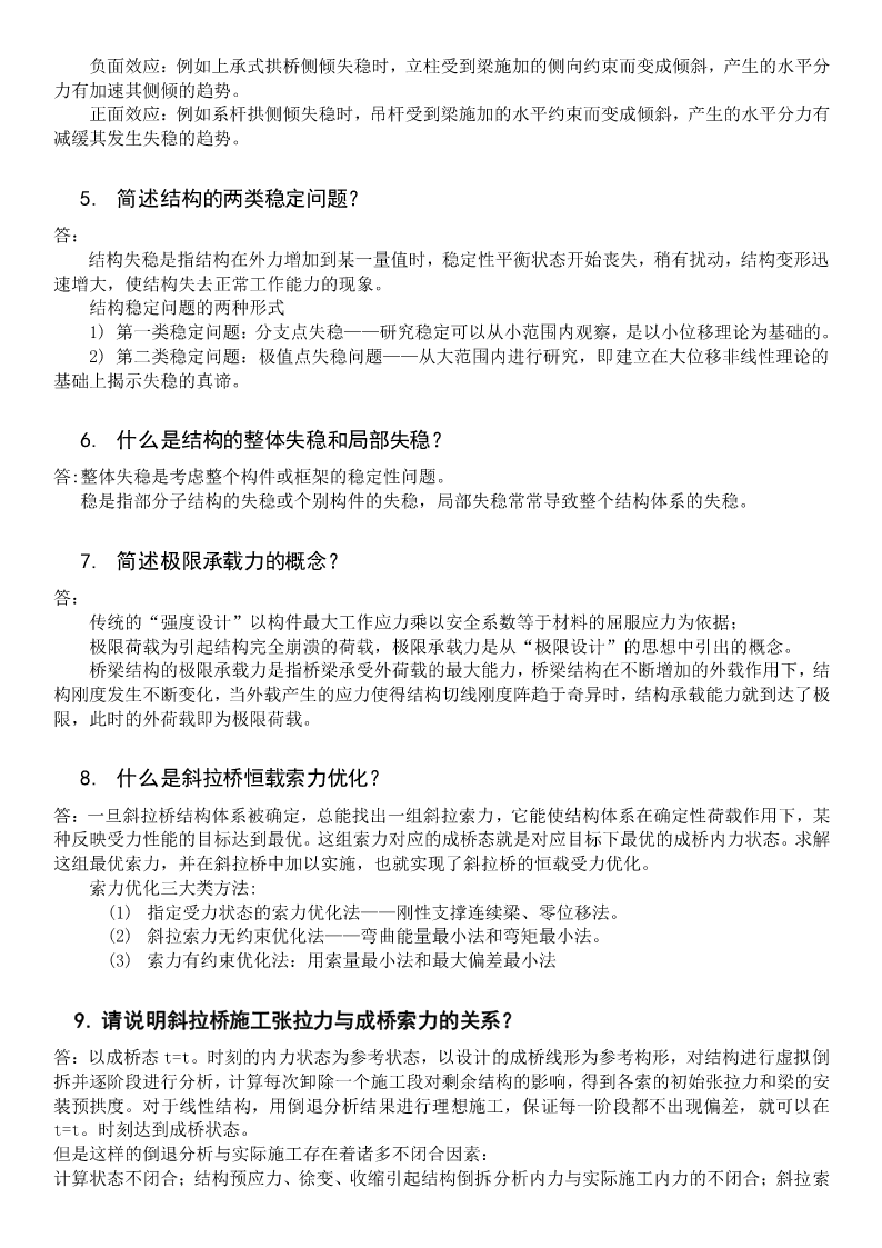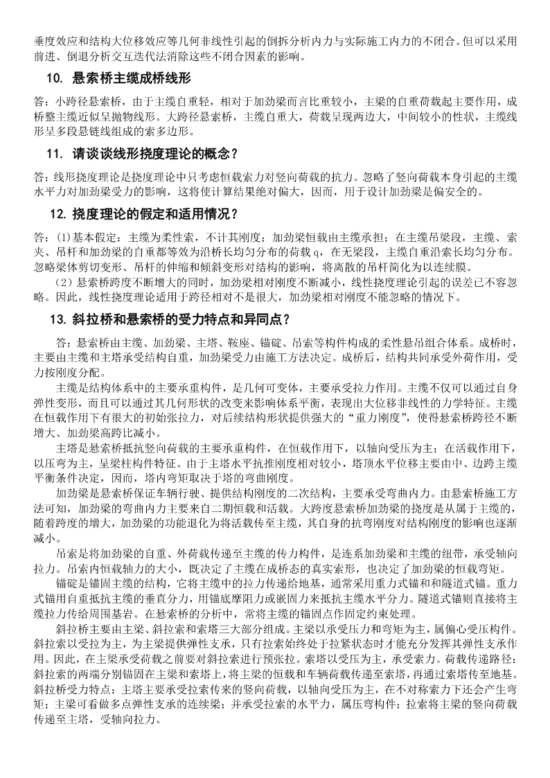 1.什么是结构的几何非线性问题?几何非线性效应有哪几个因素?答:定义:放弃小位移假设,从几何上严格分析单元体的尺寸、形状变化,得到非线性的几何运动方程,由此造成基本控制方程的非线性问题。建立杆系结构几何非线性平衡方程,一般考虑三方面因素的几何非线性效应。1)单元初内力对单元刚度矩阵的影响。2)大位移对建立结构平衡方程的影响。3)用杆单元近似模拟索类构件,由索垂度引起的单元。2.简述非线性问题的特点和分类?答:材料非线性定义:由材料的非线性应力、应变关系引起基本控制方程的非线性问题。特点:材料不满足虎克定律。工程为题:砼徐变、收缩和弹塑性问题。几何非线性定义:放弃小位移假设,从几何上严格分析单元体的尺寸、形状变化,得到非线性的几何运动方程,由此造成基本控制方程的非线性问题。特点:几何运动方程为非线性。平衡方程建立在结构变形后的位置上,结构刚度除了与材料及初始构形有关外,与受载后的应力、位移整体也有关。工程为题:柔性结构的恒载状态确定问题,柔性结构的恒、活载计算问题;桥梁结构的稳定分析问题。接触问题定义:不满足理想约束假定而引起的边界约束方程的非线性问题。特点:受力后的边界条件在求解前未知。工程为题:悬索桥主缆与鞍座的接触状态;支架上预应力梁张拉后的部分落架现象。3.TL法和UL法在建立平衡方程时的不同点。答:TL法是整个分析过程中,以t=0时的构形作为参考,且参考位形保持不变UL法是选择的参照构形为最后一个已知平衡状态,即以本增量步起始时的t时刻构形为参照构形。计算单刚的积分域:T.L列式在初始构形的体积域内进行;U.L列式在变形后的t时刻体积域内进行,U.L列式必须保留各节点座标值。精度:T.L列式保留了刚度阵中所有线性与非线性项;U.L列式忽略了高阶非线性项,U.L列式的荷载增量不能过大。单刚组集成总刚:T.L列式用初始时刻各单元结构总体座标系中的方向余弦形成转换阵,计算过程中不变;U.L列式用变形后t时刻单元在结构总体座标中的方向余弦形成转换阵,计算过程中不断改变,U.L列式中组集载向量也必须注意方向余弦的改变。本构关系的处理:T.L列式在大应变时,非线性本构关系不易引入;U.L列式比较容易引入大应变非线性本构关系,U.L方法更适用于砼徐变分析。4.什么事非保向力系?对结构有什么影响?答:传力构件随着结构的失稳而改变其传力方向,进而对结构的稳定性产生影响,例如在系杆拱中,将拱肋作为研究对象,传力构件吊杆的作用就成了外力系,它们跟随结构变形而改变其方向,这种力系称为非保向力系。非保向力系对结构稳定性有正面效应,也有负面效应。负面效应:例如上承式拱桥侧倾失稳时,立柱受到梁施加的侧向约束而变成倾斜,产生的水平分力有加速其侧倾的趋势。正面效应:例如系杆拱侧倾失稳时,吊杆受到梁施加的水平约束而变成倾斜,产生的水平分力有减缓其发生失稳的趋势。5.简述结构的两类稳定问题?答:结构失稳是指结构在外力增加到某一量值时,稳定性平衡状态开始丧失,稍有扰动,结构变形迅速增大,使结构失去正常工作能力的现象。结构稳定问题的两种形式1)第一类稳定问题:分支点失稳——研究稳定可以从小范围内观察,是以小位移理论为基础的。2)第二类稳定问题:极值点失稳问题——从大范围内进行研究,即建立在大位移非线性理论的基础上揭示失稳的真谛。6.什么是结构的整体失稳和局部失稳?答:整体失稳是考虑整个构件或框架的稳定性问题。稳是指部分子结构的失稳或个别构件的失稳,局部失稳常常导致整个结构体系的失稳。7.简述极限承载力的概念?答:传统的“强度设计”以构件最大工作应力乘以安全系数等于材料的屈服应力为依据;极限荷载为引起结构完全崩溃的荷载,极限承载力是从“极限设计”的思想中引出的概念。桥梁结构的极限承载力是指桥梁承受外荷载的最大能力,桥梁结构在不断增加的外载作用下,结构刚度发生不断变化,当外载产生的应力使得结构切线刚度阵趋于奇异时,结构承载能力就到达了极限,此时的外荷载即为极限荷载。8.什么是斜拉桥恒载索力优化?答:一旦斜拉桥结构体系被确定,总能找出一组斜拉索力,它能使结构体系在确定性荷载作用下,某种反映受力性能的目标达到最优。这组索力对应的成桥态就是对应目标下最优的成桥内力状态。求解这组最优索力,并在斜拉桥中加以实施,也就实现了斜拉桥的恒载受力优化。索力优化三大类方法:(1)指定受力状态的索力优化法——刚性支撑连续梁、零位移法。(2)斜拉索力无约束优化法——弯曲能量最小法和弯矩最小法。(3)索力有约束优化法:用索量最小法和最大偏差最小法9.请说明斜拉桥施工张拉力与成桥索力的关系?答:以成桥态t=t。时刻的内