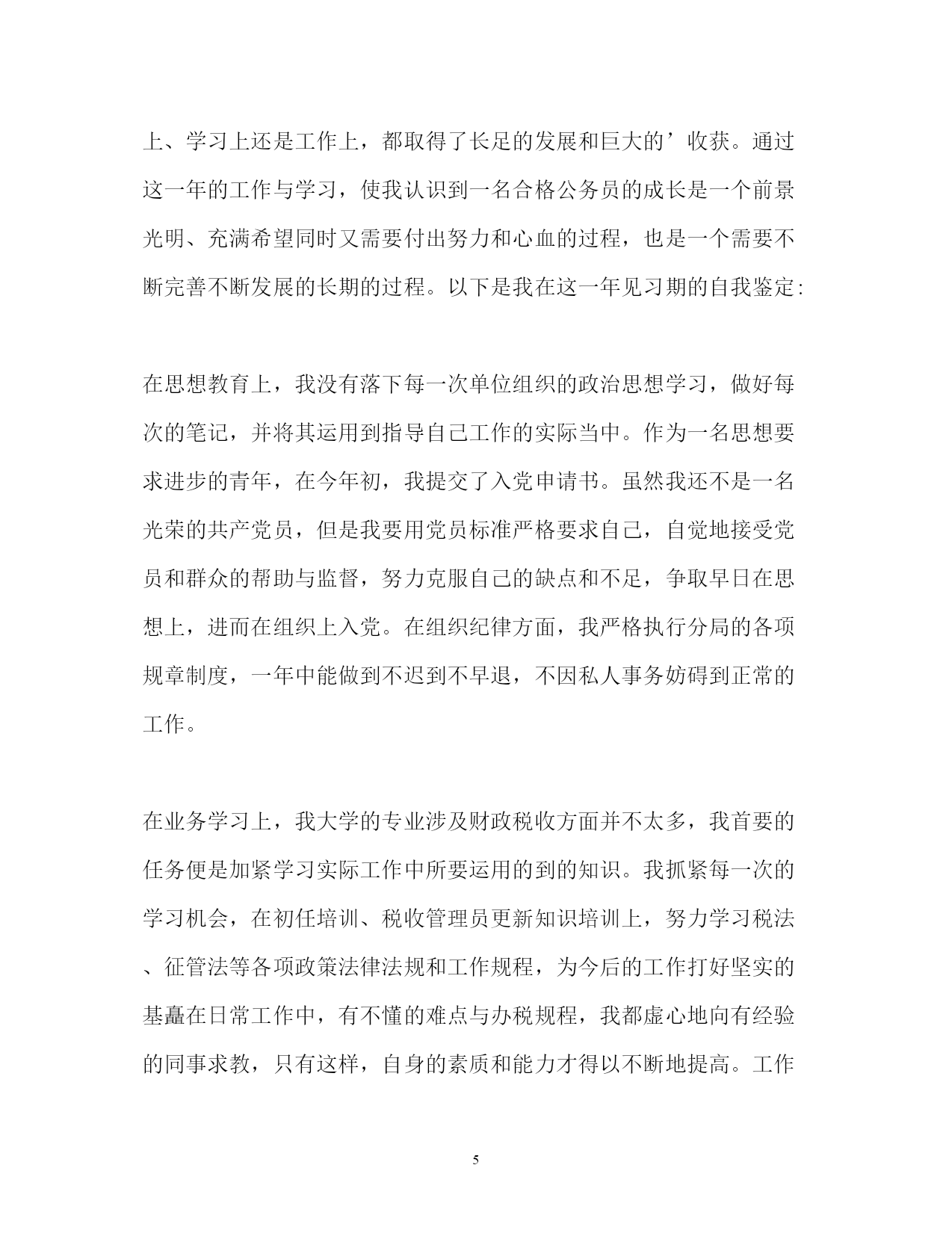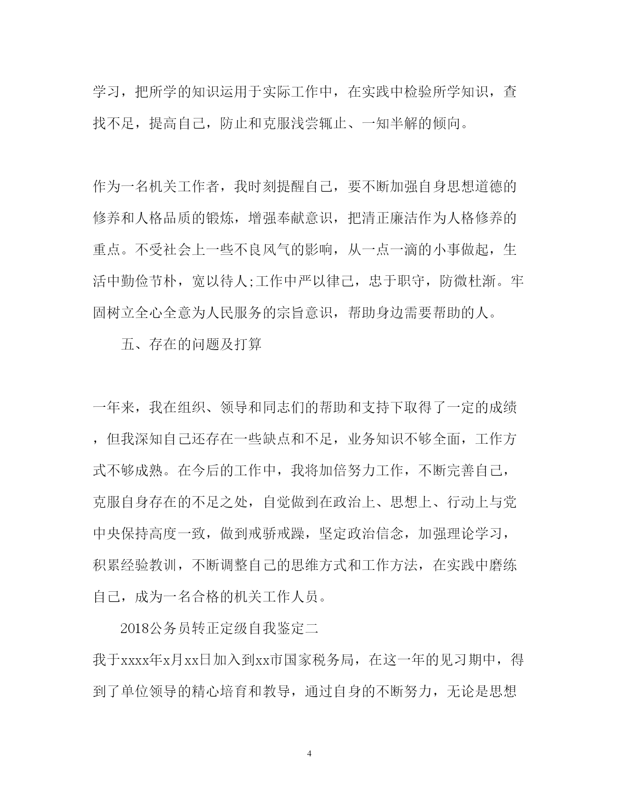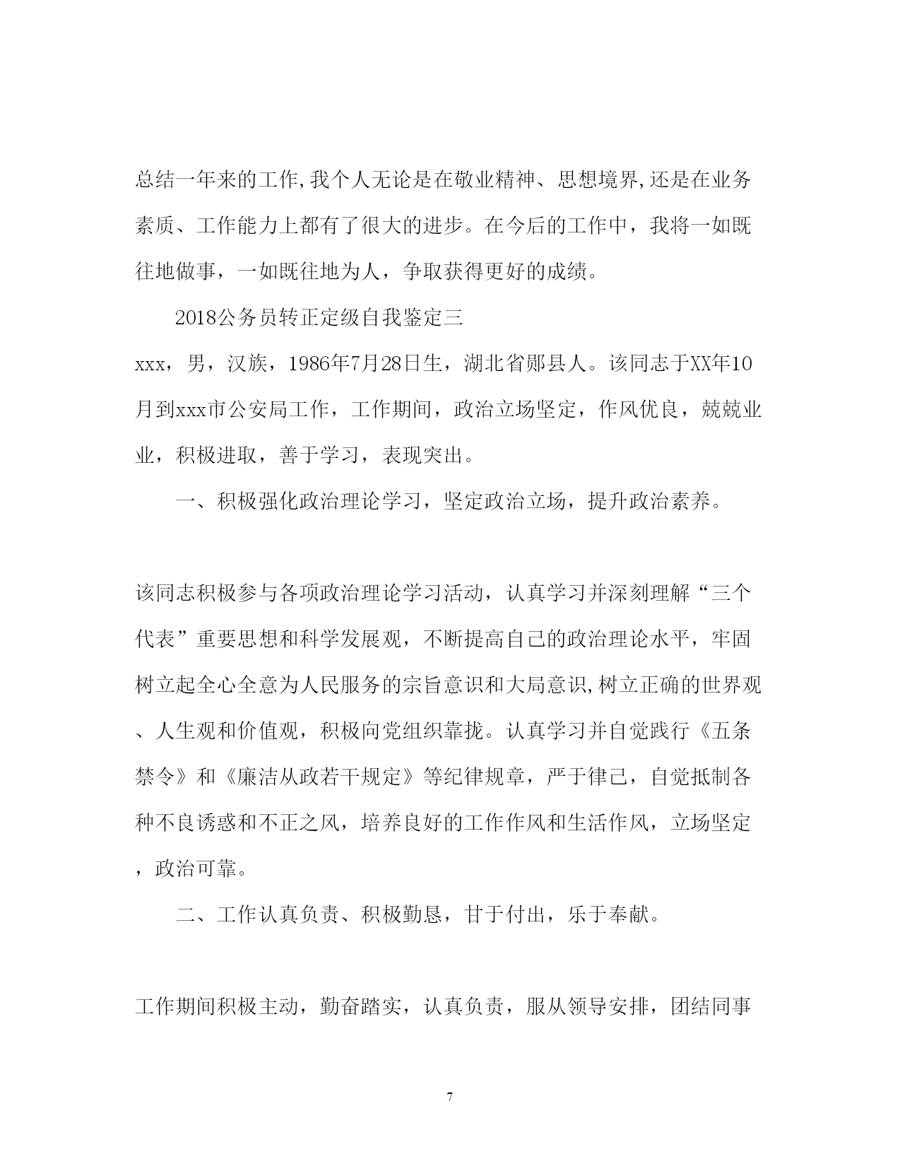 此资料由网络收集而来,如有侵权请告知上传者立即删除。资料共分享,我们负责传递知识。PAGEPAGE9公务员转正定级自我鉴定2018公务员转正定级自我鉴定范文2018公务员转正定级自我鉴定篇一我于**年**月通过县乡事业单位工作人员考试考到区政法委,被安排在政法委综治维稳信息中心工作。工作一年来,在委领导的言传身教、关心培养下,在同事的支持帮助、密切配合下,我不断加强思想政治学习,对工作精益求精,个人思想政治素质和业务工作能力都取得了一定的进步,为今后的工作和学习打下了良好的基础,现将工作学习情况总结如下:一、政治思想方面认真加强思想政治学习,不断提高自己的政治理论水平。始终坚持以“三个代表”重要思想为指导,认真贯彻党的十七大精神,深入领会执行中央、省和市委、市政府的一系列重大方针、政策、措施。牢固树立全心全意为人民服务的宗旨和正确的世界观、人生观和价值观,以开展保持共产党员先进性教育、政法干警核心价值观教育活动为重要契机,加强对马列理论、社会主义市场经济理论及现代经济、科技、法律等与工作领域相关的专业知识的学习,使思想认识和自身素质都有了新的提高。二、学习方面今年以来,我在认真完成学习任务的基础上,还非常注重个人自学,深化了对“三个代表”重要思想和《宪法》、《行政许可法》等法律法规及任长霞、徐正虎、李林森等先进事迹的学习,认真领会精神实质,并自觉地贯彻落实到行动中去,统一到区委的重大决策上来。坚持每天阅读各类文章,并认真做好读书笔记,努力做到融会贯通,联系实际,举一反三。注重学习效果,做到活学活用,学以致用。并根据日新月异的形势发展变化,注重学习新知识,熟悉新学科,努力适应新形势、新任务对本职工作的要求,不断拓宽知识视野。在工作中我有强烈的工作事业心和责任感,有多做事、干好工作的强烈愿望。敢于面对困难,能吃苦耐劳,加班加点毫无怨言。三、业务方面我作为政法委的综治维稳信息中心工作人员,主动为分管领导服好务。今年以来,我认真收集各项信息资料,全面、准确地了解和掌握各方面工作的开展情况,分析工作存在的主要问题,总结工作经验,及时向领导汇报,让领导尽量能全面、准确地了解和掌握最近工作的实际情况,为解决问题作出科学的、正确的决策。认真完成了领导交办讲话及各种汇报、通知、总结、经验交流材料等材料的起草校对工作,及时编写了各类政法方面的信息;对领导交办的各类信访案件做到及时处理、及时报送。全年跟随领导5次下基层进行调研,并撰写了有价值的调研。听从领导,服从安排,今年根据工作的安排,我参加了20xx年度综治考核,在考核过程中,我逐步完善提高业务知识,认真完成考核任务;参与了20xx年区公安协勤人员的招录考试,圆满完成了各项任务,受到了委领导的表扬,年底获得了社会管理创新先进个人奖励。四、学习生活方面今年以来,我严格要求自己,认真遵守办公室的各项规章制度,自觉做到值好班,上班不迟,下班不早退,按要求及时签到,特别是在有急事、到其它单位办事、下单位调研等情况都自觉向办公室请假。在工作过程中,我深深感到加强自身学习、提高自身素质的紧迫性,一是向书本学习,坚持每天挤出一定的时间不断充实自己,端正态度,改进方法,广泛汲取各种“营养”;二是向周围的同志学习,工作中我始终保持谦虚谨慎、虚心求教的态度,主动向领导、同事们请教,学习他们任劳任怨、求真务实的工作作风和处理问题的方法;三是向实践学习,把所学的知识运用于实际工作中,在实践中检验所学知识,查找不足,提高自己,防止和克服浅尝辄止、一知半解的倾向。作为一名机关工作者,我时刻提醒自己,要不断加强自身思想道德的修养和人格品质的锻炼,增强奉献意识,把清正廉洁作为人格修养的重点。不受社会上一些不良风气的影响,从一点一滴的小事做起,生活中勤俭节朴,宽以待人;工作中严以律己,忠于职守,防微杜渐。牢固树立全心全意为人民服务的宗旨意识,帮助身边需要帮助的人。五、存在的问题及打算一年来,我在组织、领导和同志们的帮助和支持下取得了一定的成绩,但我深知自己还存在一些缺点和不足,业务知识不够全面,工作方式不够成熟。在今后的工作中,我将加倍努力工作,不断完善自己,克服自身存在的不足之处,自觉做到在政治上、思想上、行动上与党中央保持高度一致,做到戒骄戒躁,坚定政治信念,加强理论学习,积累经验教训,不断调整自己的思维方式和工作方法,在实践中磨练自己,成为一名合格的机关工作人员。2018公务员转正定级自我鉴定二我于xxxx年x月xx日加入到xx市国家税务局,在这一年的见习期中,得到了单位领导的精心培育和教导,通过自身的不断努力,无论是思想上、学习上还是工作上,都取得了长足的发展和巨大的’收获。通过这一年的工作与学习,使我认识到一名合格公务员的成长是一个前景光明、充满希望同时又需要付