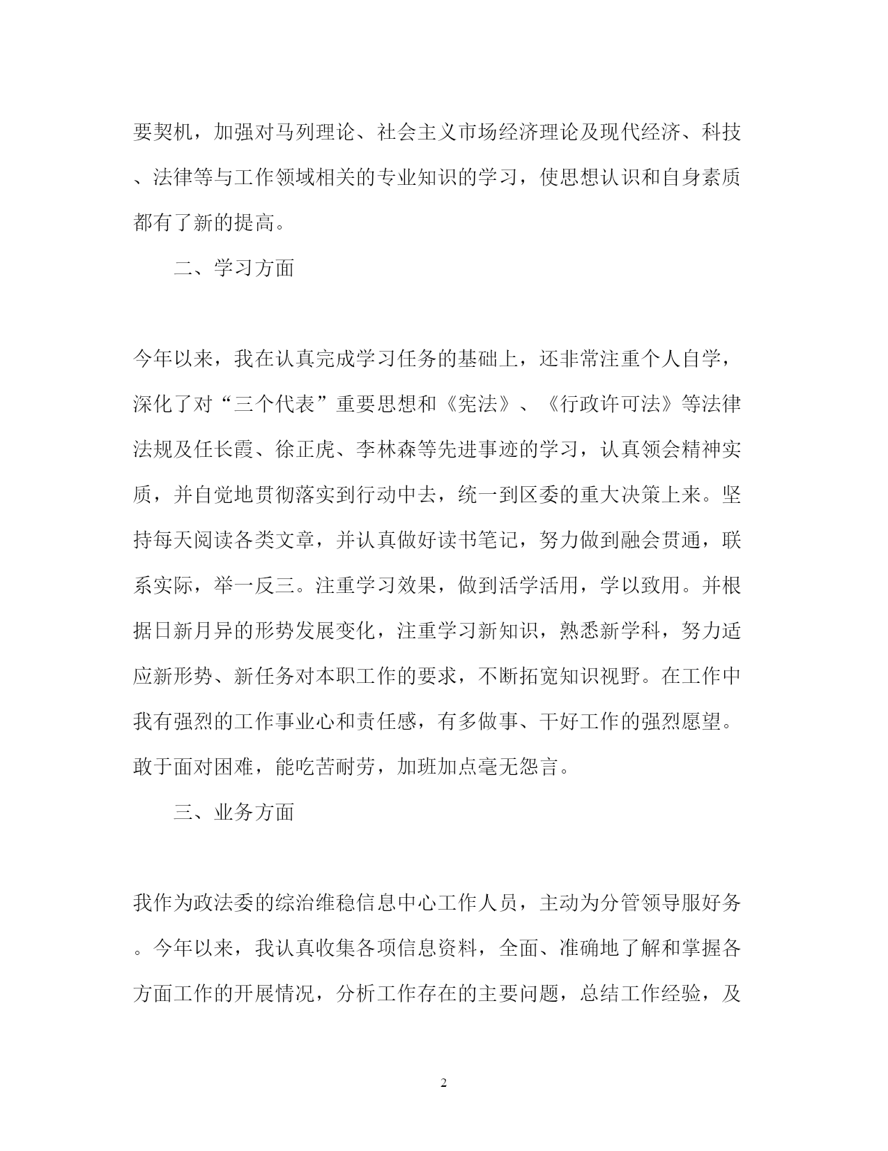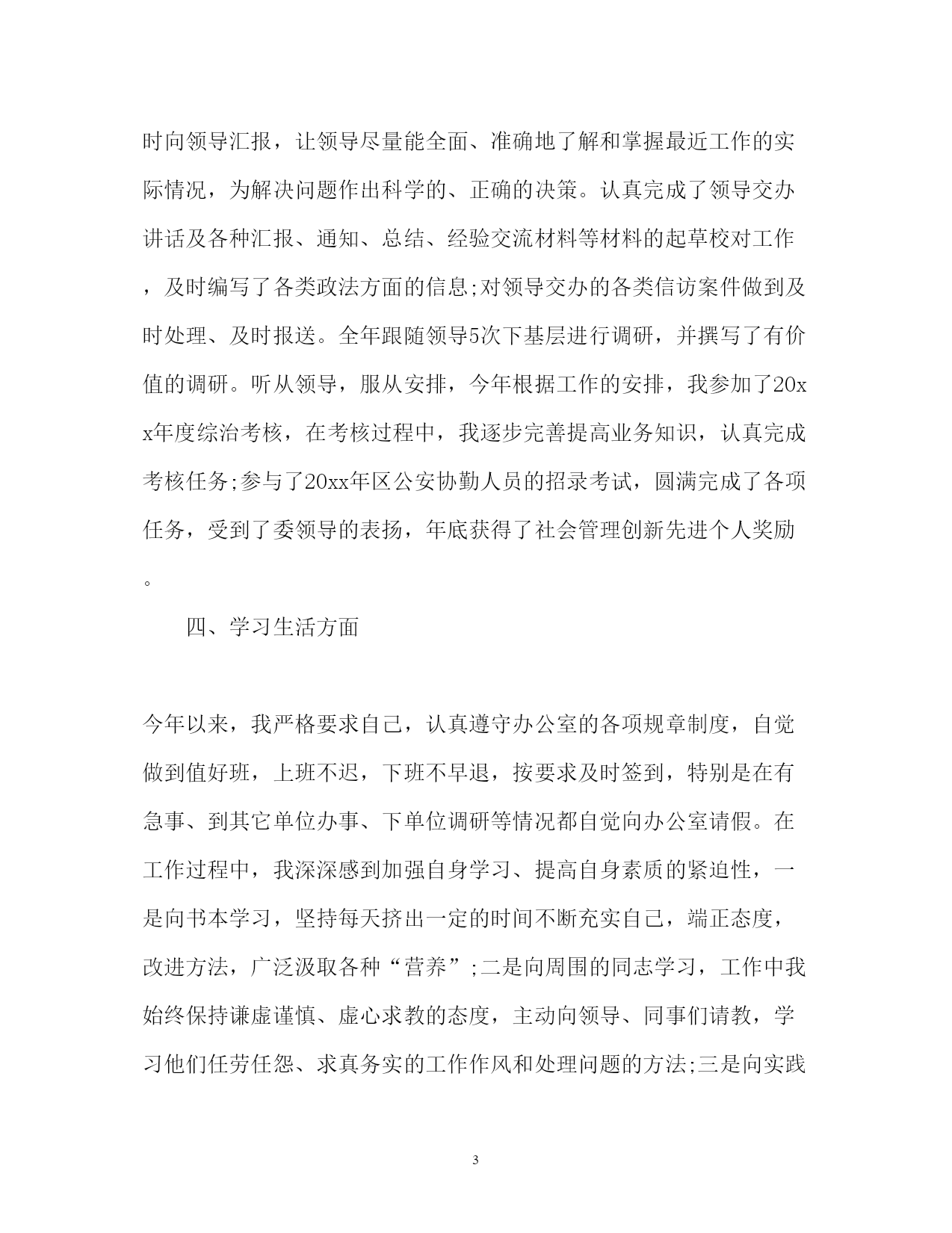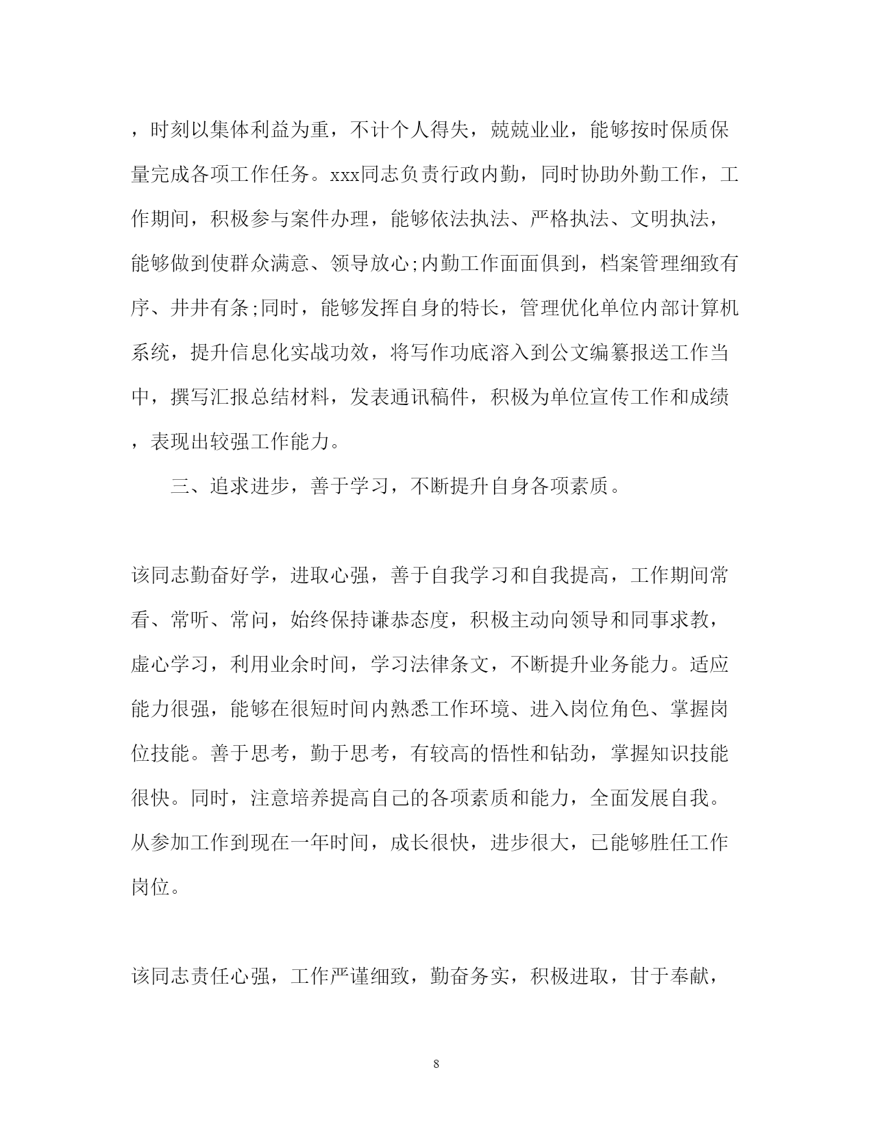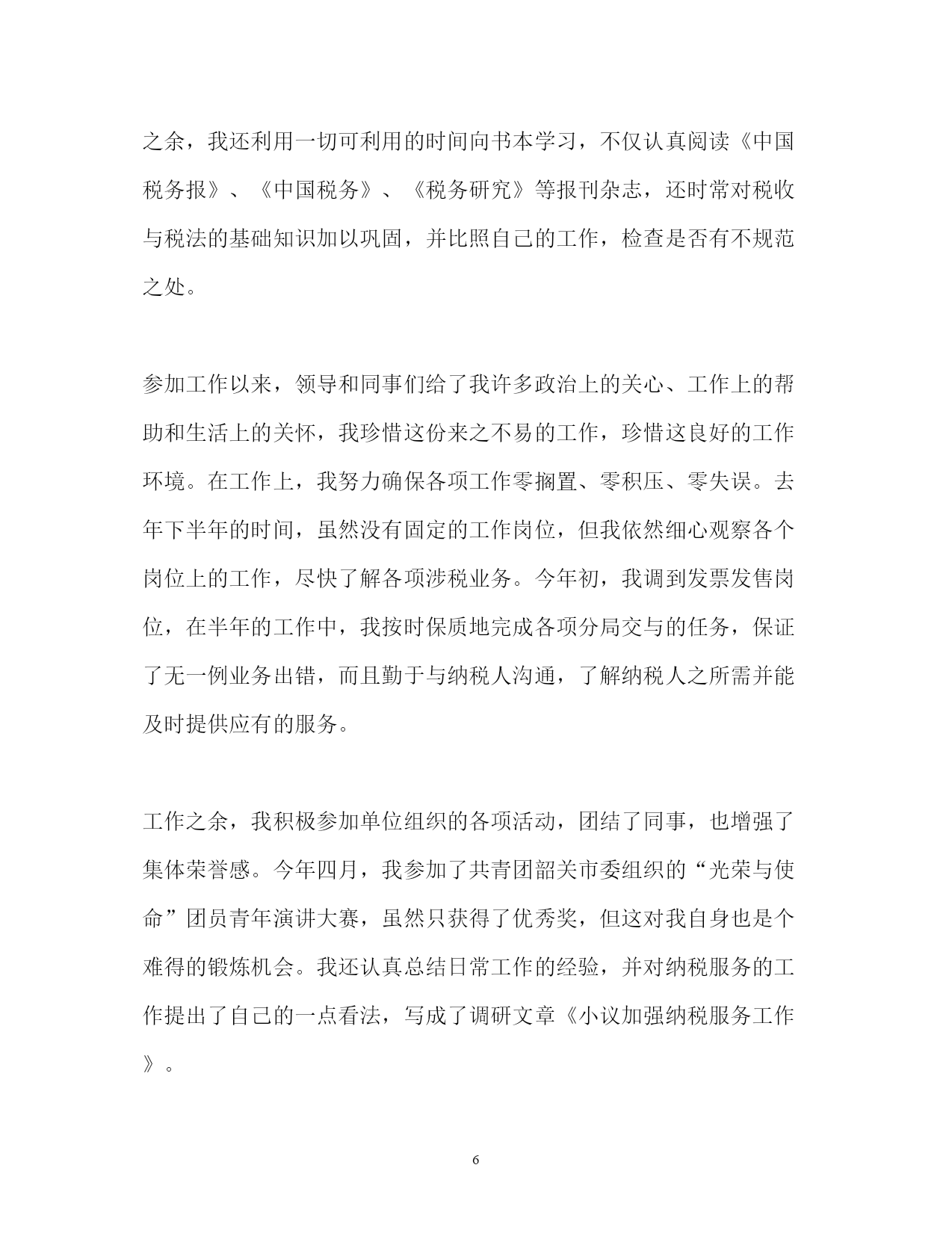 此资料由网络收集而来,如有侵权请告知上传者立即删除。资料共分享,我们负责传递知识。PAGEPAGE9公务员转正定级自我鉴定2018公务员转正定级自我鉴定范文2018公务员转正定级自我鉴定篇一我于**年**月通过县乡事业单位工作人员考试考到区政法委,被安排在政法委综治维稳信息中心工作。工作一年来,在委领导的言传身教、关心培养下,在同事的支持帮助、密切配合下,我不断加强思想政治学习,对工作精益求精,个人思想政治素质和业务工作能力都取得了一定的进步,为今后的工作和学习打下了良好的基础,现将工作学习情况总结如下:一、政治思想方面认真加强思想政治学习,不断提高自己的政治理论水平。始终坚持以“三个代表”重要思想为指导,认真贯彻党的十七大精神,深入领会执行中央、省和市委、市政府的一系列重大方针、政策、措施。牢固树立全心全意为人民服务的宗旨和正确的世界观、人生观和价值观,以开展保持共产党员先进性教育、政法干警核心价值观教育活动为重要契机,加强对马列理论、社会主义市场经济理论及现代经济、科技、法律等与工作领域相关的专业知识的学习,使思想认识和自身素质都有了新的提高。二、学习方面今年以来,我在认真完成学习任务的基础上,还非常注重个人自学,深化了对“三个代表”重要思想和《宪法》、《行政许可法》等法律法规及任长霞、徐正虎、李林森等先进事迹的学习,认真领会精神实质,并自觉地贯彻落实到行动中去,统一到区委的重大决策上来。坚持每天阅读各类文章,并认真做好读书笔记,努力做到融会贯通,联系实际,举一反三。注重学习效果,做到活学活用,学以致用。并根据日新月异的形势发展变化,注重学习新知识,熟悉新学科,努力适应新形势、新任务对本职工作的要求,不断拓宽知识视野。在工作中我有强烈的工作事业心和责任感,有多做事、干好工作的强烈愿望。敢于面对困难,能吃苦耐劳,加班加点毫无怨言。三、业务方面我作为政法委的综治维稳信息中心工作人员,主动为分管领导服好务。今年以来,我认真收集各项信息资料,全面、准确地了解和掌握各方面工作的开展情况,分析工作存在的主要问题,总结工作经验,及时向领导汇报,让领导尽量能全面、准确地了解和掌握最近工作的实际情况,为解决问题作出科学的、正确的决策。认真完成了领导交办讲话及各种汇报、通知、总结、经验交流材料等材料的起草校对工作,及时编写了各类政法方面的信息;对领导交办的各类信访案件做到及时处理、及时报送。全年跟随领导5次下基层进行调研,并撰写了有价值的调研。听从领导,服从安排,今年根据工作的安排,我参加了20xx年度综治考核,在考核过程中,我逐步完善提高业务知识,认真完成考核任务;参与了20xx年区公安协勤人员的招录考试,圆满完成了各项任务,受到了委领导的表扬,年底获得了社会管理创新先进个人奖励。四、学习生活方面今年以来,我严格要求自己,认真遵守办公室的各项规章制度,自觉做到值好班,上班不迟,下班不早退,按要求及时签到,特别是在有急事、到其它单位办事、下单位调研等情况都自觉向办公室请假。在工作过程中,我深深感到加强自身学习、提高自身素质的紧迫性,一是向书本学习,坚持每天挤出一定的时间不断充实自己,端正态度,改进方法,广泛汲取各种“营养”;二是向周围的同志学习,工作中我始终保持谦虚谨慎、虚心求教的态度,主动向领导、同事们请教,学习他们任劳任怨、求真务实的工作作风和处理问题的方法;三是向实践学习,把所学的知识运用于实际工作中,在实践中检验所学知识,查找不足,提高自己,防止和克服浅尝辄止、一知半解的倾向。作为一名机关工作者,我时刻提醒自己,要不断加强自身思想道德的修养和人格品质的锻炼,增强奉献意识,把清正廉洁作为人格修养的重点。不受社会上一些不良风气的影响,从一点一滴的小事做起,生活中勤俭节朴,宽以待人;工作中严以律己,忠于职守,防微杜渐。牢固树立全心全意为人民服务的宗旨意识,帮助身边需要帮助的人。五、存在的问题及打算一年来,我在组织、领导和同志们的帮助和支持下取得了一定的成绩,但我深知自己还存在一些缺点和不足,业务知识不够全面,工作方式不够成熟。在今后的工作中,我将加倍努力工作,不断完善自己,克服自身存在的不足之处,自觉做到在政治上、思想上、行动上与党中央保持高度一致,做到戒骄戒躁,坚定政治信念,加强理论学习,积累经验教训,不断调整自己的思维方式和工作方法,在实践中磨练自己,成为一名合格的机关工作人员。2018公务员转正定级自我鉴定二我于xxxx年x月xx日加入到xx市国家税务局,在这一年的见习期中,得到了单位领导的精心培育和教导,通过自身的不断努力,无论是思想上、学习上还是工作上,都取得了长足的发展和巨大的’收获。通过这一年的工作与学习,使我认识到一名合格公务员的成长是一个前景光明、充满希望同时又需要付