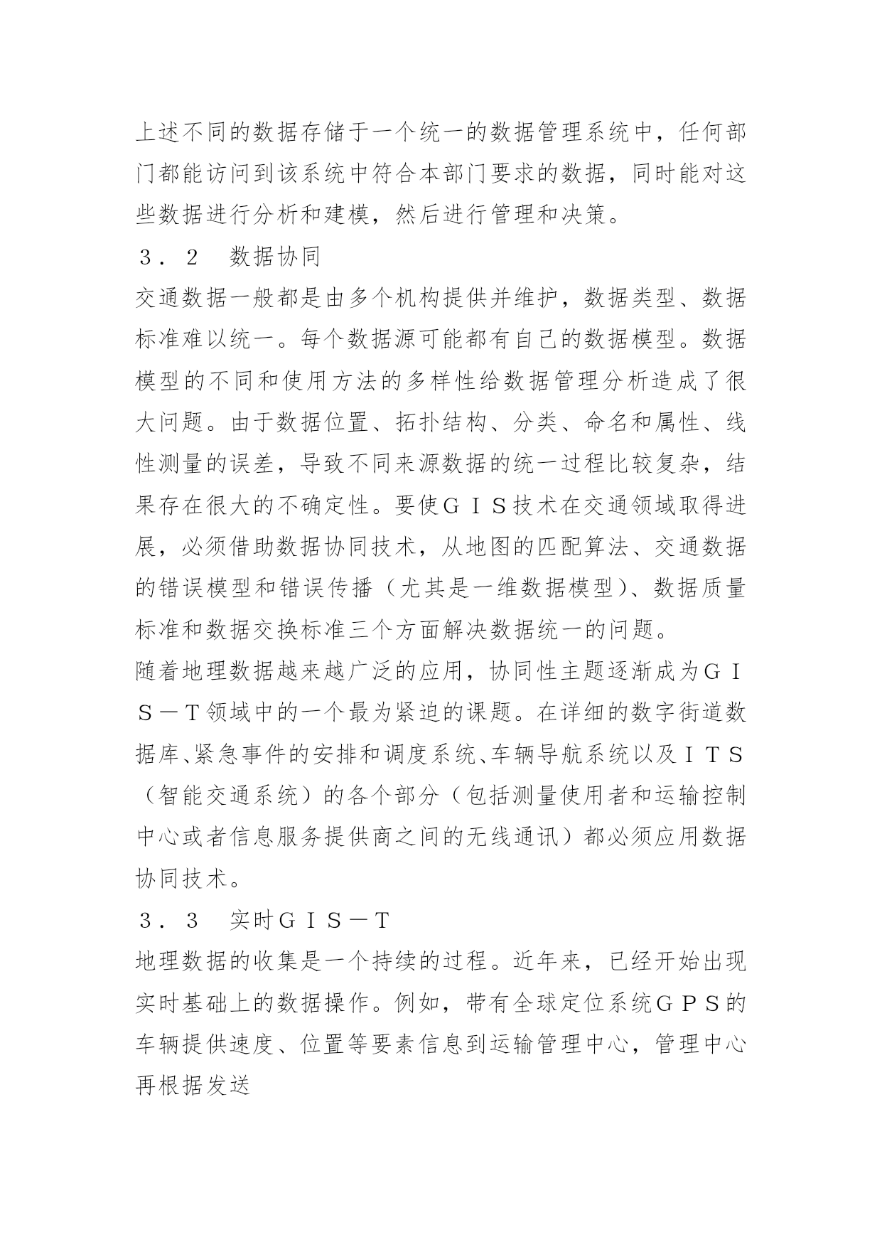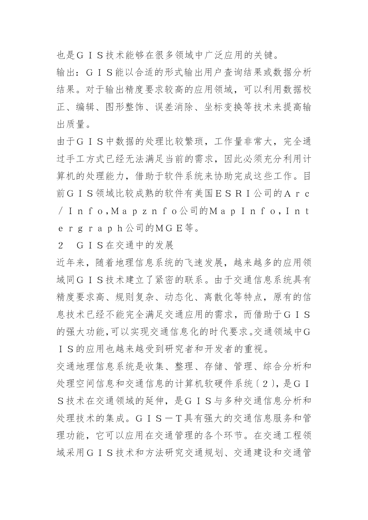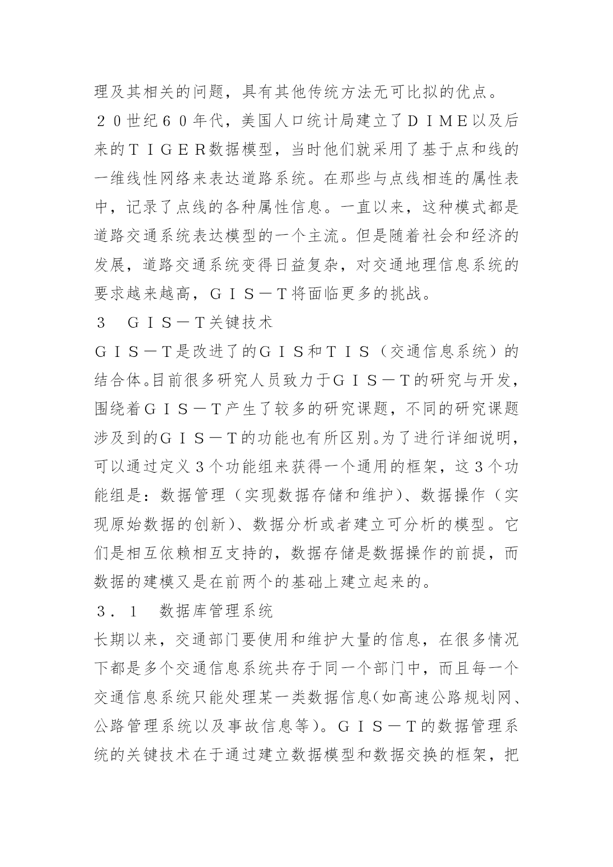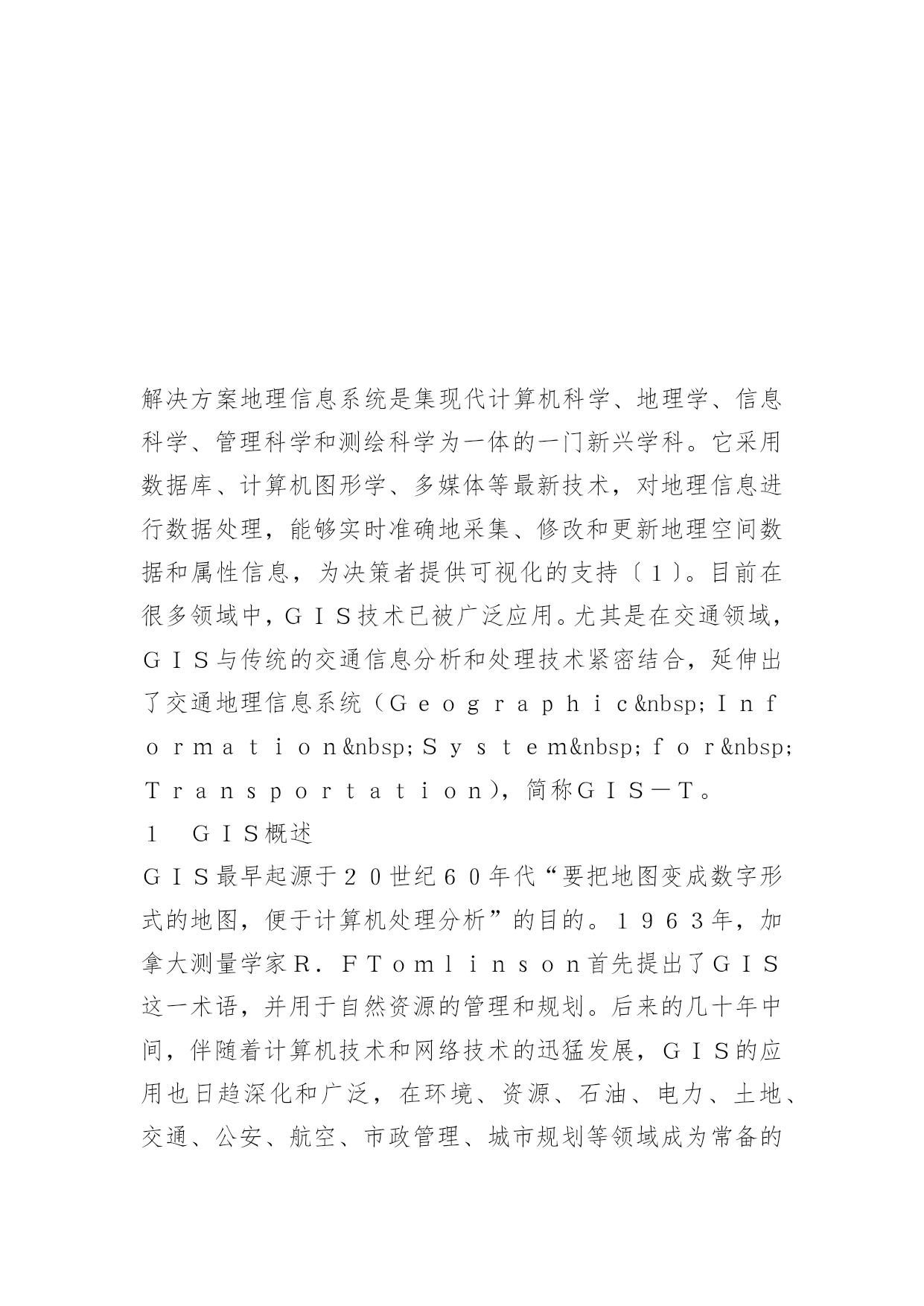 GIS在交通中的应用与发展-GIS在交通中的应用与发展-摘 要:地理信息技术的日臻成熟为GIS在交通领域内的广泛应用创造了一定基础。本文总结了GIS技术的特点,并介绍了GIS在交通领域中的应用—GIS-T。通过对GIS-T中关键技术的分析,对其应用中面临的实际问题作了一定研究,并提出了解决问题的方案。关键词:GISGIS-T关键技术解决方案地理信息系统是集现代计算机科学、地理学、信息科学、管理科学和测绘科学为一体的一门新兴学科。它采用数据库、计算机图形学、多媒体等最新技术,对地理信息进行数据处理,能够实时准确地采集、修改和更新地理空间数据和属性信息,为决策者提供可视化的支持〔1〕。目前在很多领域中,GIS技术已被广泛应用。尤其是在交通领域,GIS与传统的交通信息分析和处理技术紧密结合,延伸出了交通地理信息系统(Geographic Information System for Transportation),简称GIS-T。1GIS概述GIS最早起源于20世纪60年代“要把地图变成数字形式的地图,便于计算机处理分析”的目的。1963年,加拿大测量学家R.FTomlinson首先提出了GIS这一术语,并用于自然资源的管理和规划。后来的几十年中间,伴随着计算机技术和网络技术的迅猛发展,GIS的应用也日趋深化和广泛,在环境、资源、石油、电力、土地、交通、公安、航空、市政管理、城市规划等领域成为常备的工作系统。GIS是图形处理技术、可视技术及数据库等技术的有机结合,并以其混合数据结构和强大的地理空间分析功能而独树一帜。它与CAD系统和DBMS(数据库管理系统)等有着很大的区别。CAD系统虽具有强大的图形处理能力,但其拓扑关系比较简单,管理和分析大型地理数据库的能力也有限;DBMS则侧重于非图形数据的优化存储和查询,而图形查询、显示功能、数据分析功能均相对较弱。众所周知,GIS中最基础的也是最重要的部分是地理数据。GIS能够实现对大量复杂地理数据的输入、存储、操作和分析、输出等一系列功能。输入:GIS数据大多数来自现实世界,数据量比较大。目前被广泛采用的数据输入方法是传统的手工数字化方法。同时,遥感数据正日益成为GIS数据的重要来源,这标志着GIS数据输入已经开始借助于非地图形式。另外,GPS技术的日益成熟也促进了GIS数据采集技术的发展。存储:GIS对数据的存储比较独特,即在大多数的GIS系统中普遍采用了分层技术,所以用户在存储这些数据时,只是处理涉及到层,而不是整幅地图,因而能够对用户的要求作出快速反应。操作和分析:GIS充分继承了CAD和DBMS的图形操作和数据处理的成熟技术。GIS中空间数据与属性数据有着紧密的联系,对数据的一致性要求较高,并且GIS对地理数据有着强大的空间分析功能。这是GIS的精华所在,也是GIS技术能够在很多领域中广泛应用的关键。输出:GIS能以合适的形式输出用户查询结果或数据分析结果。对于输出精度要求较高的应用领域,可以利用数据校正、编辑、图形整饰、误差消除、坐标变换等技术来提高输出质量。由于GIS中数据的处理比较繁琐,工作量非常大,完全通过手工方式已经无法满足当前的需求,因此必须充分利用计算机的处理能力,借助于软件系统来协助完成这些工作。目前GIS领域比较成熟的软件有美国ESRI公司的Arc/Info,Mapznfo公司的MapInfo,Intergraph公司的MGE等。2GIS在交通中的发展近年来,随着地理信息系统的飞速发展,越来越多的应用领域同GIS技术建立了紧密的联系。由于交通信息系统具有精度要求高、规则复杂、动态化、离散化等特点,原有的信息技术已经不能完全满足交通应用的需求,而借助于GIS的强大功能,可以实现交通信息化的时代要求。交通领域中GIS的应用也越来越受到研究者和开发者的重视。交通地理信息系统是收集、整理、存储、管理、综合分析和处理空间信息和交通信息的计算机软硬件系统〔2〕,是GIS技术在交通领域的延伸,是GIS与多种交通信息分析和处理技术的集成。GIS-T具有强大的交通信息服务和管理功能,它可以应用在交通管理的各个环节。在交通工程领域采用GIS技术和方法研究交通规划、交通建设和交通管理及其相关的问题,具有其他传统方法无可比拟的优点。20世纪60年代,美国人口统计局建立了DIME以及后来的TIGER数据模型,当时他们就采用了基于点和线的一维线性网络来表达道路系统。在那些与点线相连的属性表中,记录了点线的各种属性信息。一直以来,这种模式都是道路交通系统表达模型的一个主流。但是随着社会和经济的发展,道路交通系统变得日益复杂,对交通地理信息系统的要求越来越高,GIS-T将面临更多的挑战。3GIS-T关键技术GIS-T是改进了的GIS和TIS