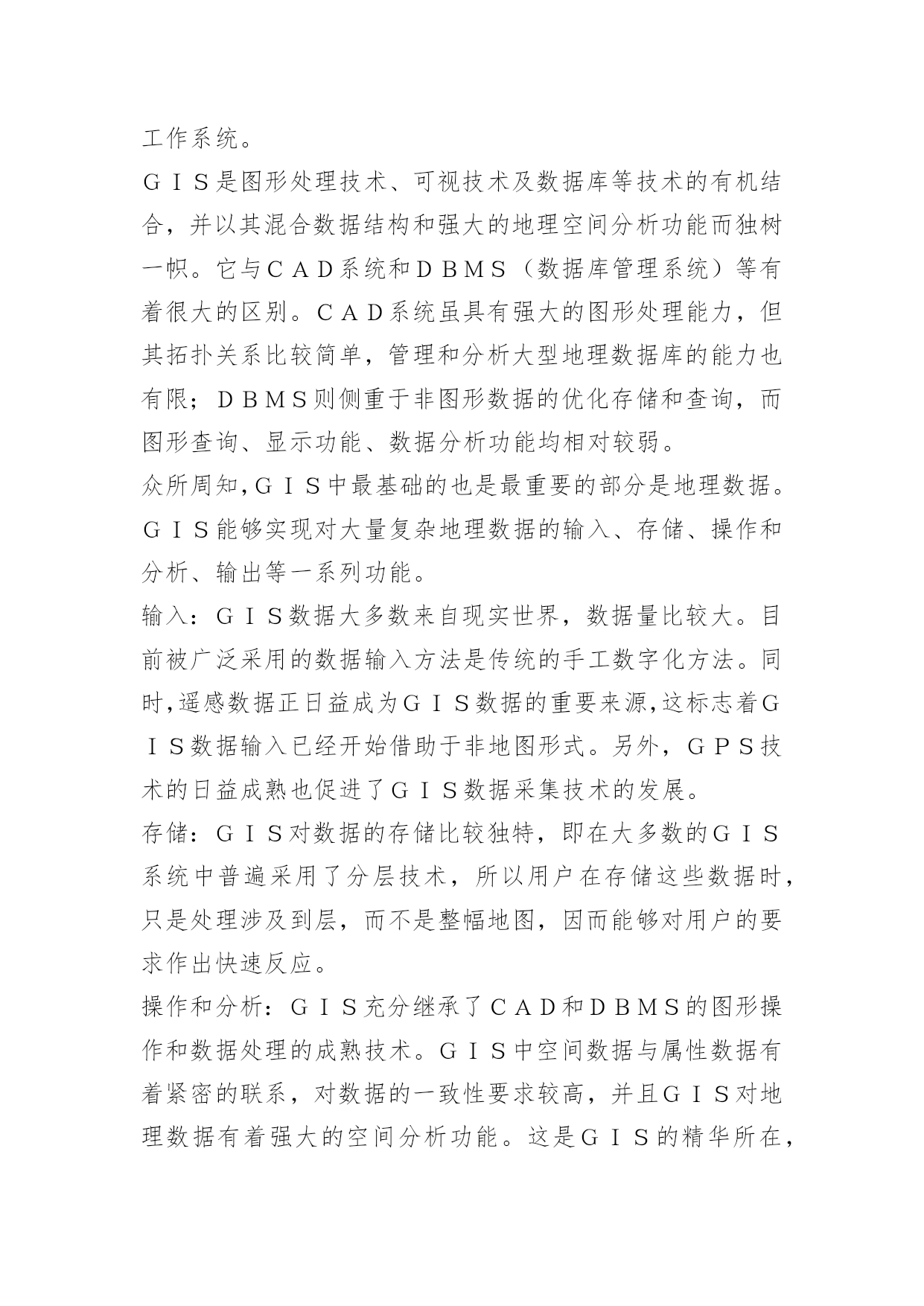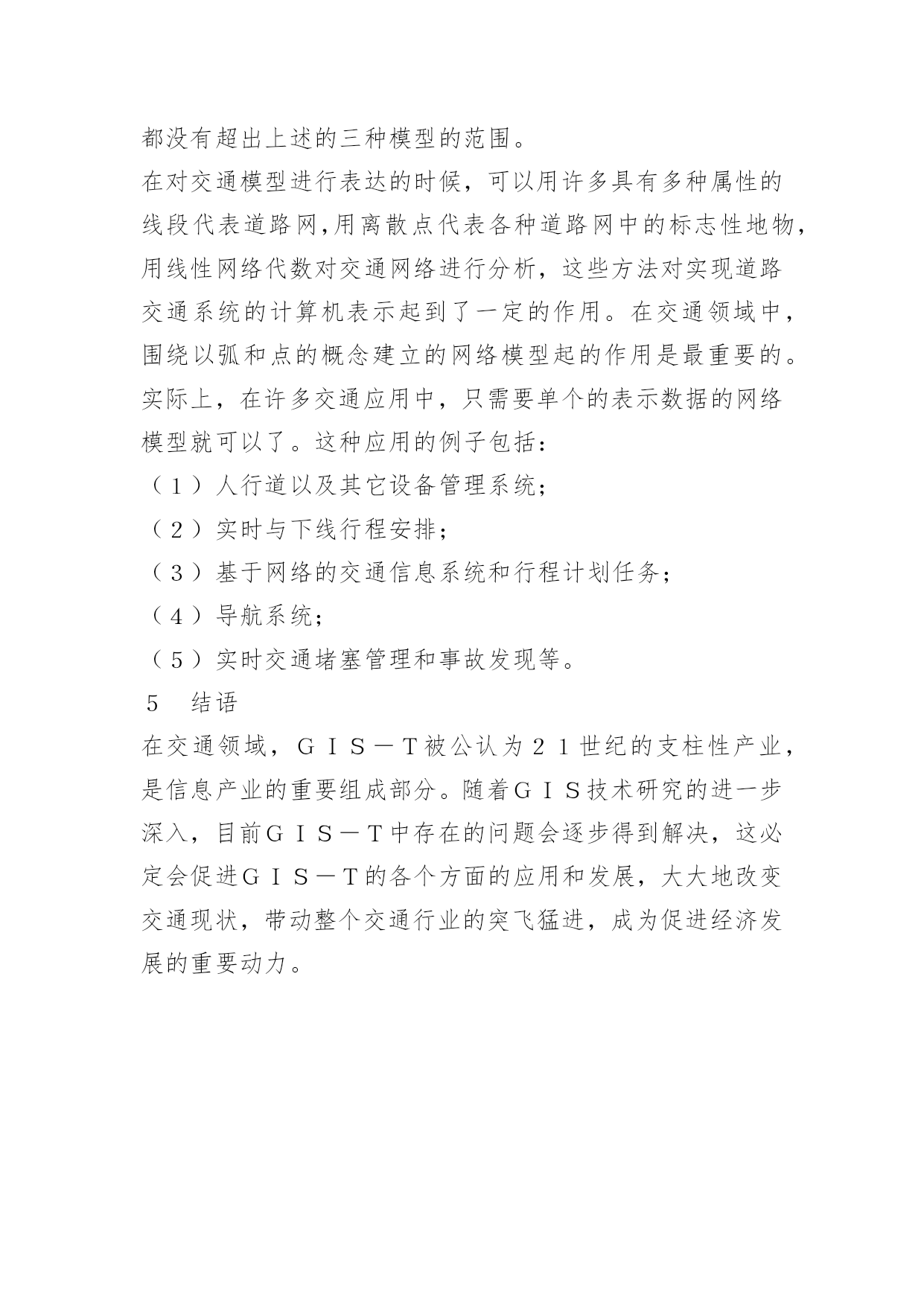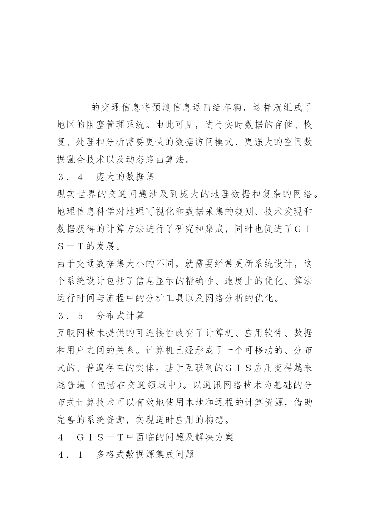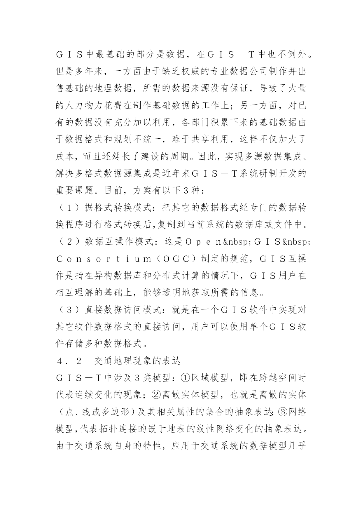 GIS在交通中的应用与发展-GIS在交通中的应用与发展-摘 要:地理信息技术的日臻成熟为GIS在交通领域内的广泛应用创造了一定基础。本文总结了GIS技术的特点,并介绍了GIS在交通领域中的应用—GIS-T。通过对GIS-T中关键技术的分析,对其应用中面临的实际问题作了一定研究,并提出了解决问题的方案。关键词:GISGIS-T关键技术解决方案地理信息系统是集现代计算机科学、地理学、信息科学、管理科学和测绘科学为一体的一门新兴学科。它采用数据库、计算机图形学、多媒体等最新技术,对地理信息进行数据处理,能够实时准确地采集、修改和更新地理空间数据和属性信息,为决策者提供可视化的支持〔1〕。目前在很多领域中,GIS技术已被广泛应用。尤其是在交通领域,GIS与传统的交通信息分析和处理技术紧密结合,延伸出了交通地理信息系统(Geographic Information System for Transportation),简称GIS-T。1GIS概述GIS最早起源于20世纪60年代“要把地图变成数字形式的地图,便于计算机处理分析”的目的。1963年,加拿大测量学家R.FTomlinson首先提出了GIS这一术语,并用于自然资源的管理和规划。后来的几十年中间,伴随着计算机技术和网络技术的迅猛发展,GIS的应用也日趋深化和广泛,在环境、资源、石油、电力、土地、交通、公安、航空、市政管理、城市规划等领域成为常备的工作系统。GIS是图形处理技术、可视技术及数据库等技术的有机结合,并以其混合数据结构和强大的地理空间分析功能而独树一帜。它与CAD系统和DBMS(数据库管理系统)等有着很大的区别。CAD系统虽具有强大的图形处理能力,但其拓扑关系比较简单,管理和分析大型地理数据库的能力也有限;DBMS则侧重于非图形数据的优化存储和查询,而图形查询、显示功能、数据分析功能均相对较弱。众所周知,GIS中最基础的也是最重要的部分是地理数据。GIS能够实现对大量复杂地理数据的输入、存储、操作和分析、输出等一系列功能。输入:GIS数据大多数来自现实世界,数据量比较大。目前被广泛采用的数据输入方法是传统的手工数字化方法。同时,遥感数据正日益成为GIS数据的重要来源,这标志着GIS数据输入已经开始借助于非地图形式。另外,GPS技术的日益成熟也促进了GIS数据采集技术的发展。存储:GIS对数据的存储比较独特,即在大多数的GIS系统中普遍采用了分层技术,所以用户在存储这些数据时,只是处理涉及到层,而不是整幅地图,因而能够对用户的要求作出快速反应。操作和分析:GIS充分继承了CAD和DBMS的图形操作和数据处理的成熟技术。GIS中空间数据与属性数据有着紧密的联系,对数据的一致性要求较高,并且GIS对地理数据有着强大的空间分析功能。这是GIS的精华所在,也是GIS技术能够在很多领域中广泛应用的关键。输出:GIS能以合适的形式输出用户查询结果或数据分析结果。对于输出精度要求较高的应用领域,可以利用数据校正、编辑、图形整饰、误差消除、坐标变换等技术来提高输出质量。由于GIS中数据的处理比较繁琐,工作量非常大,完全通过手工方式已经无法满足当前的需求,因此必须充分利用计算机的处理能力,借助于软件系统来协助完成这些工作。目前GIS领域比较成熟的软件有美国ESRI公司的Arc/Info,Mapznfo公司的MapInfo,Intergraph公司的MGE等。2GIS在交通中的发展近年来,随着地理信息系统的飞速发展,越来越多的应用领域同GIS技术建立了紧密的联系。由于交通信息系统具有精度要求高、规则复杂、动态化、离散化等特点,原有的信息技术已经不能完全满足交通应用的需求,而借助于GIS的强大功能,可以实现交通信息化的时代要求。交通领域中GIS的应用也越来越受到研究者和开发者的重视。交通地理信息系统是收集、整理、存储、管理、综合分析和处理空间信息和交通信息的计算机软硬件系统〔2〕,是GIS技术在交通领域的延伸,是GIS与多种交通信息分析和处理技术的集成。GIS-T具有强大的交通信息服务和管理功能,它可以应用在交通管理的各个环节。在交通工程领域采用GIS技术和方法研究交通规划、交通建设和交通管理及其相关的问题,具有其他传统方法无可比拟的优点。20世纪60年代,美国人口统计局建立了DIME以及后来的TIGER数据模型,当时他们就采用了基于点和线的一维线性网络来表达道路系统。在那些与点线相连的属性表中,记录了点线的各种属性信息。一直以来,这种模式都是道路交通系统表达模型的一个主流。但是随着社会和经济的发展,道路交通系统变得日益复杂,对交通地理信息系统的要求越来越高,GIS-T将面临更多的挑战。3GIS-T关键技术GIS-T是改进了的GIS和TIS