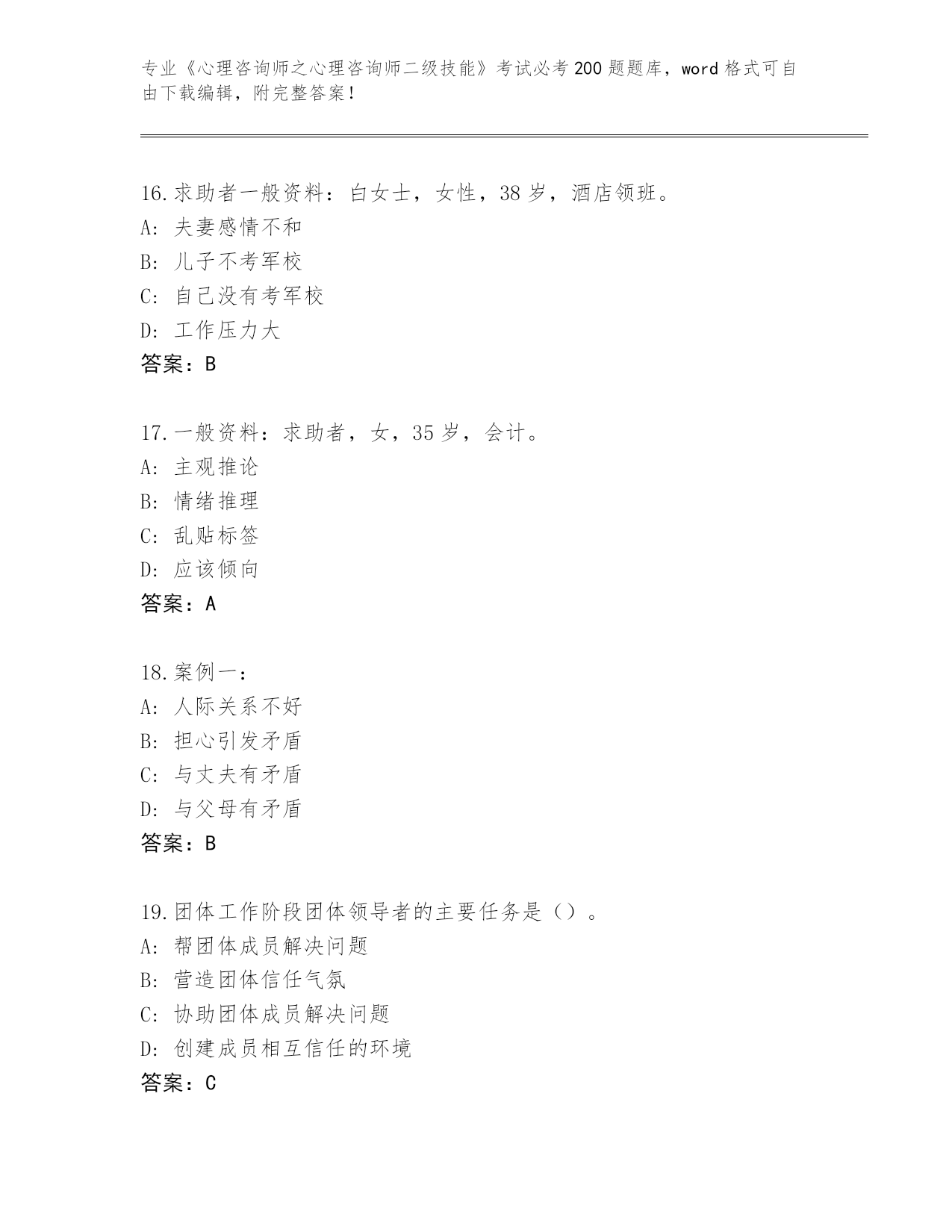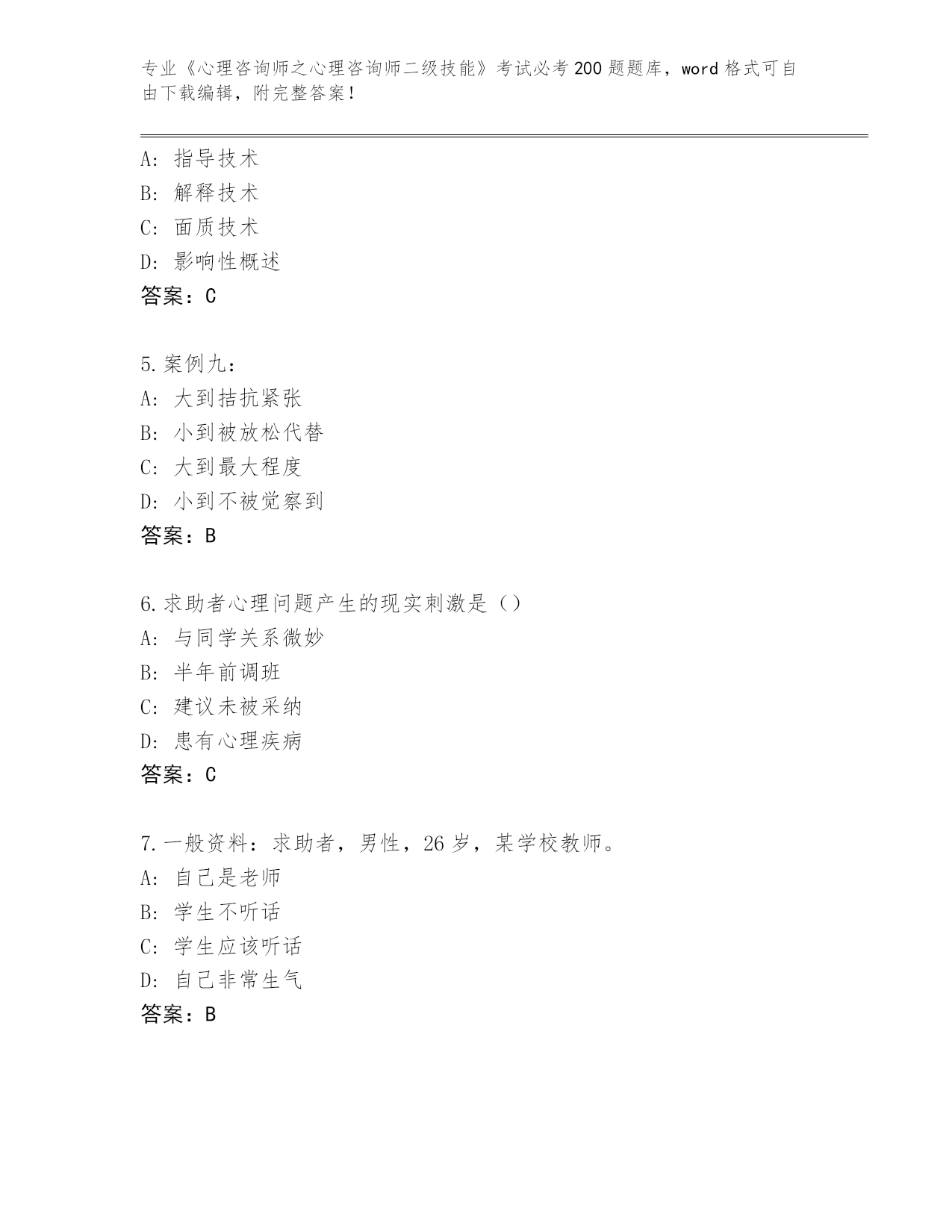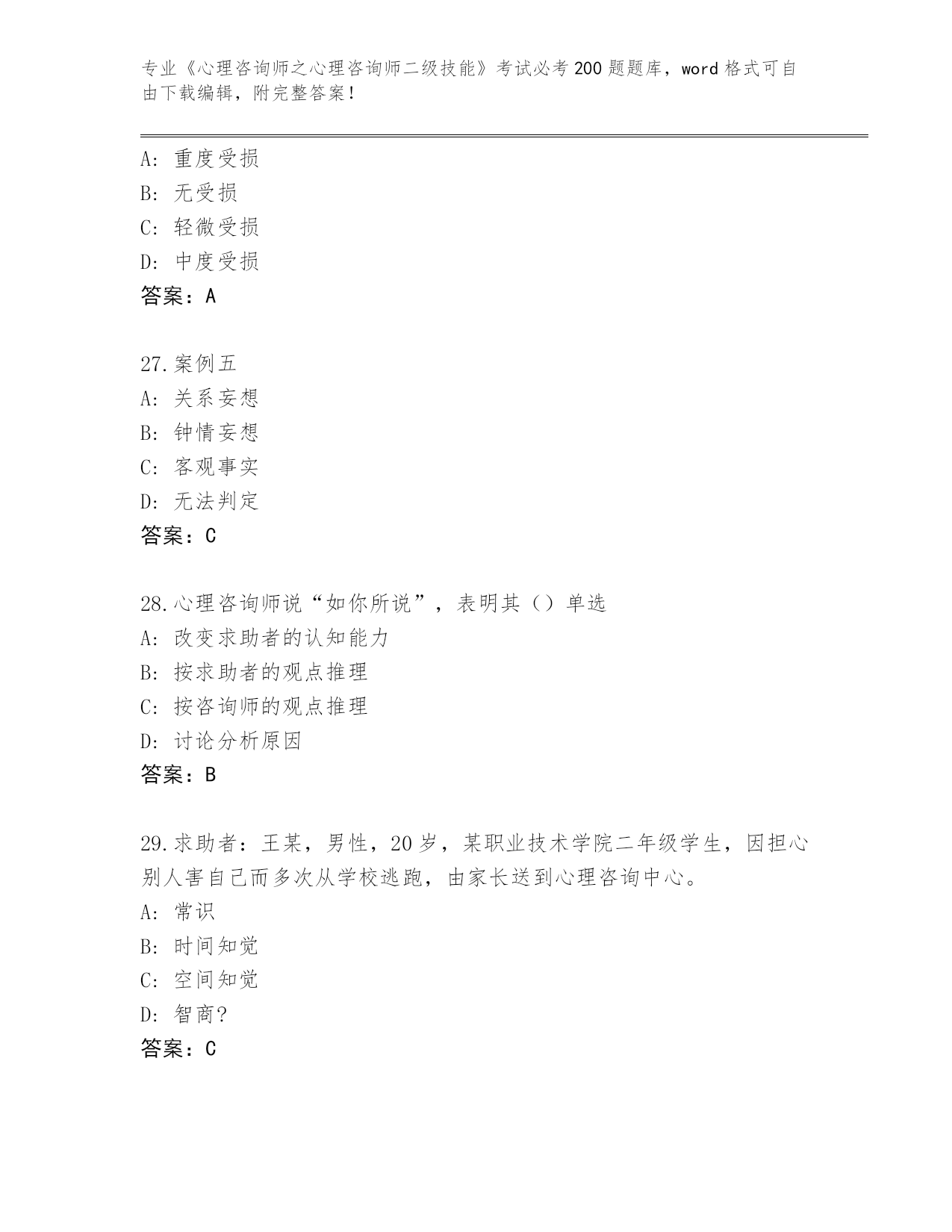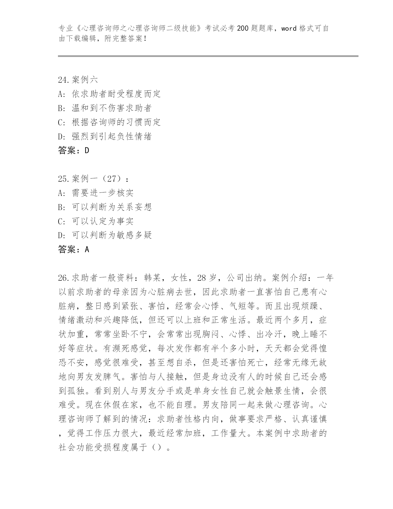陕西省黄陵县2024年《心理咨询师之心理咨询师二级技能》考试必考200题真题附答案【精练】