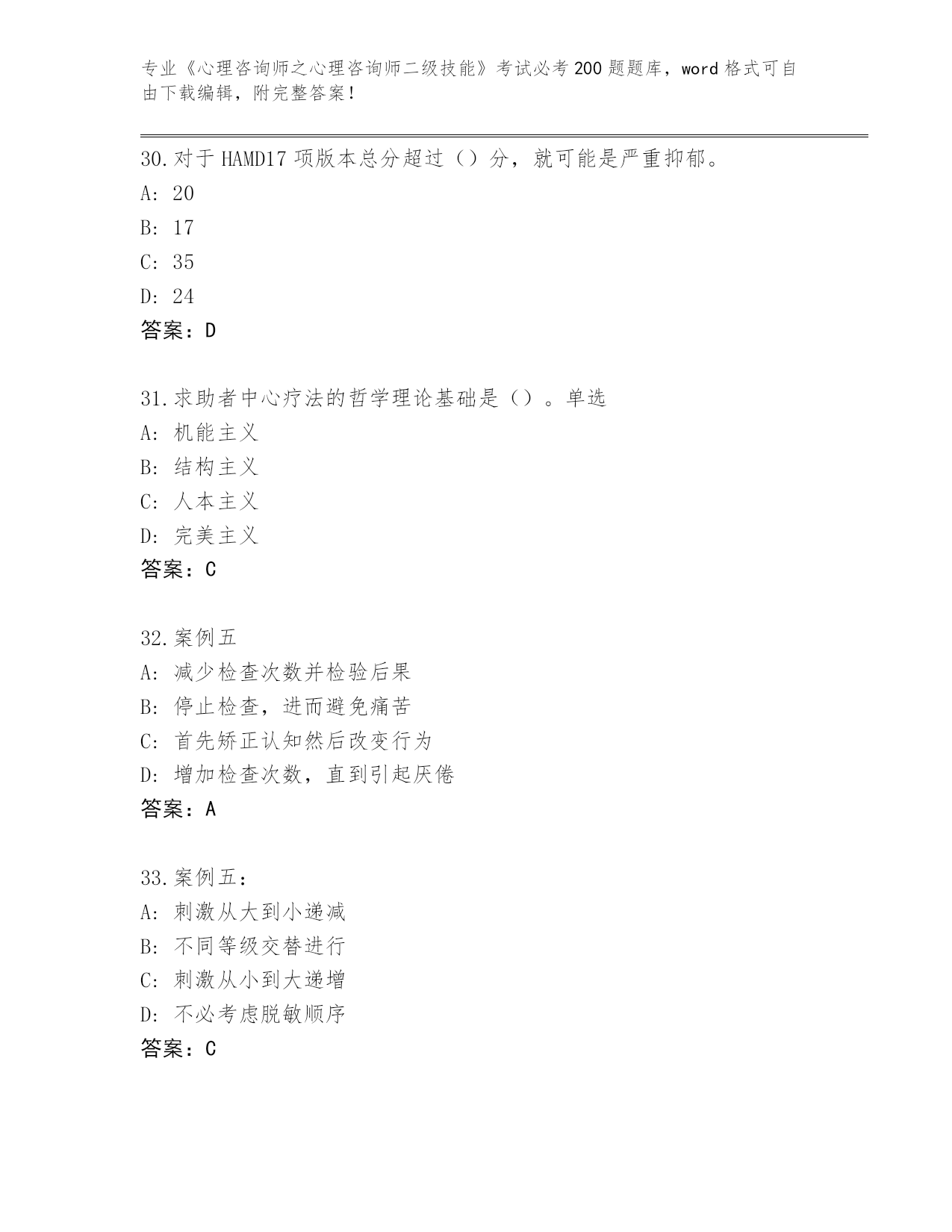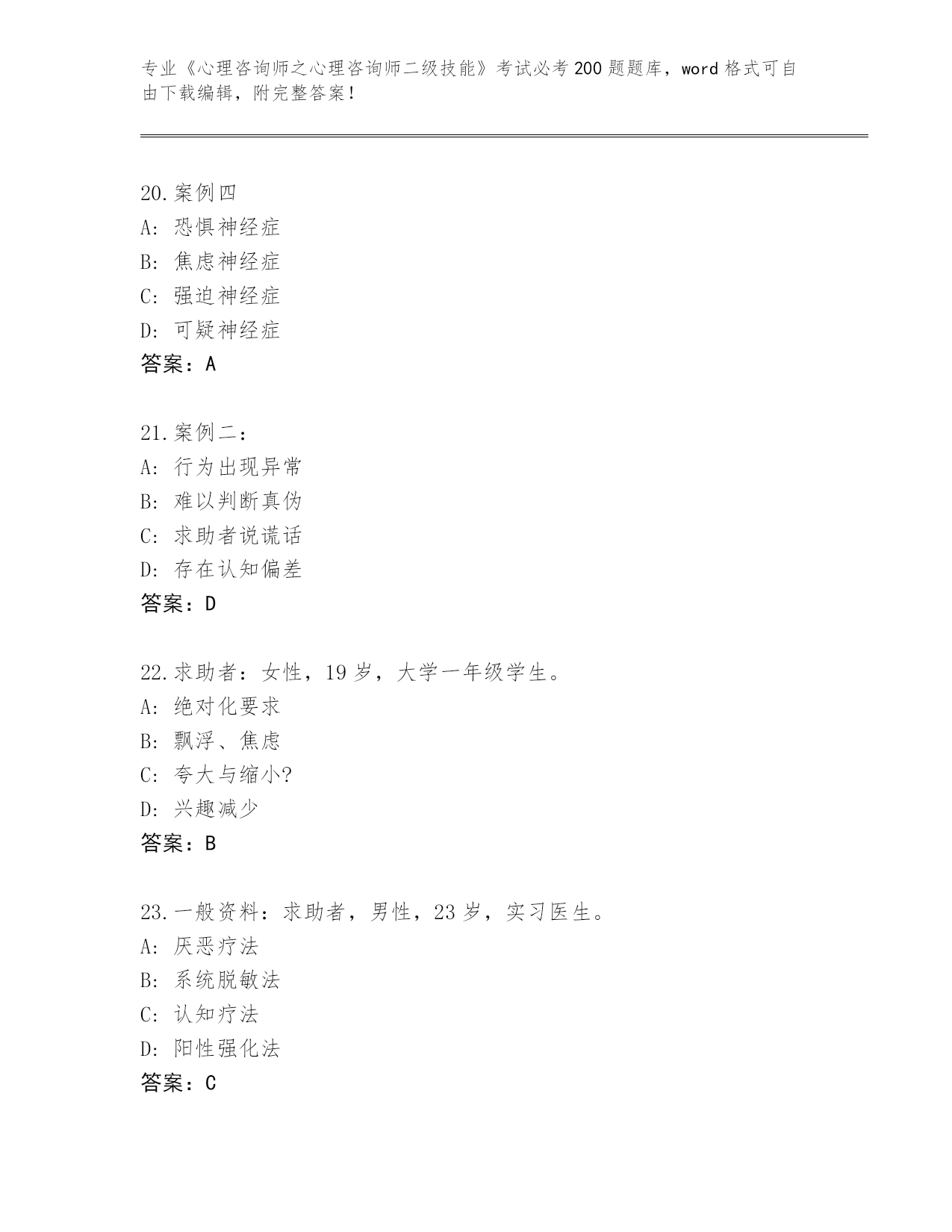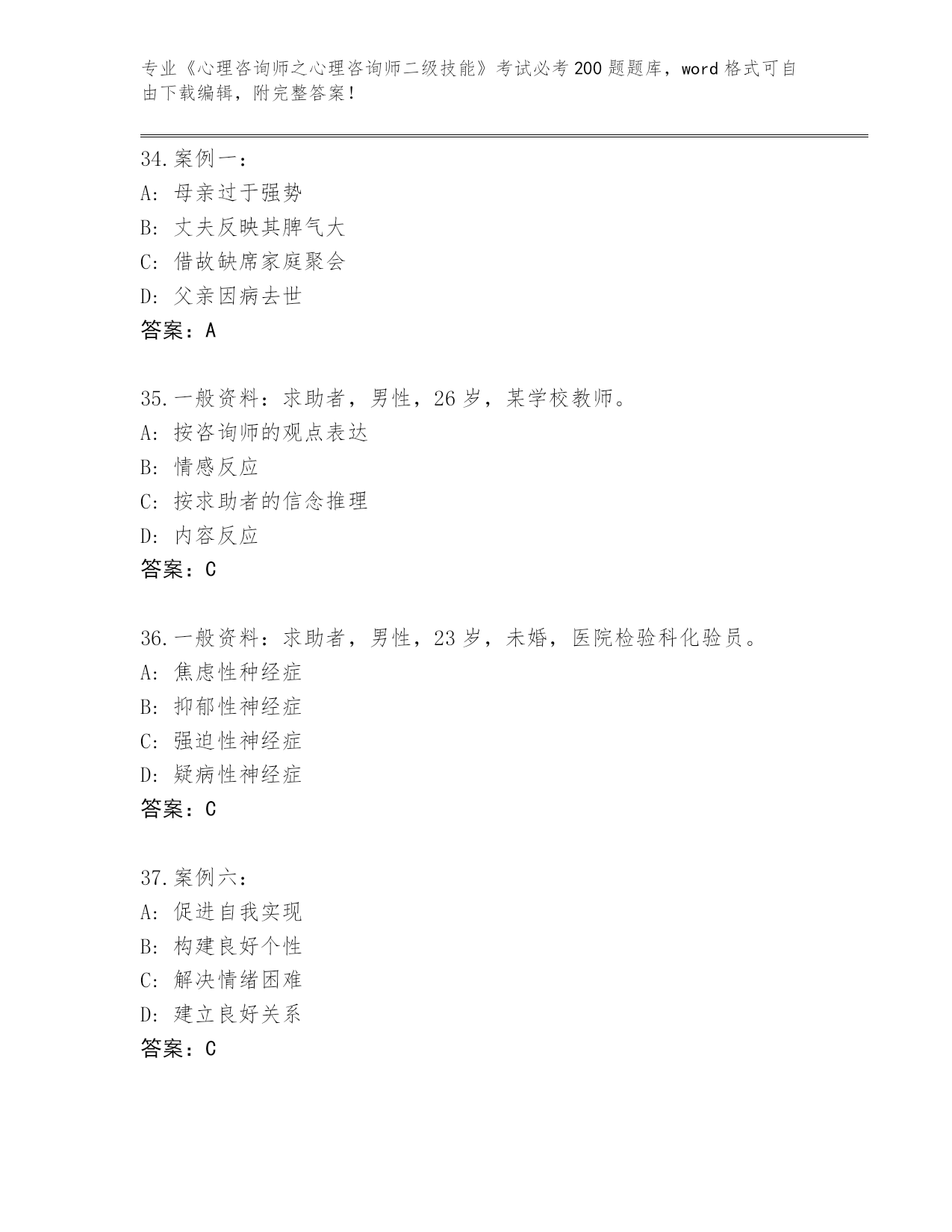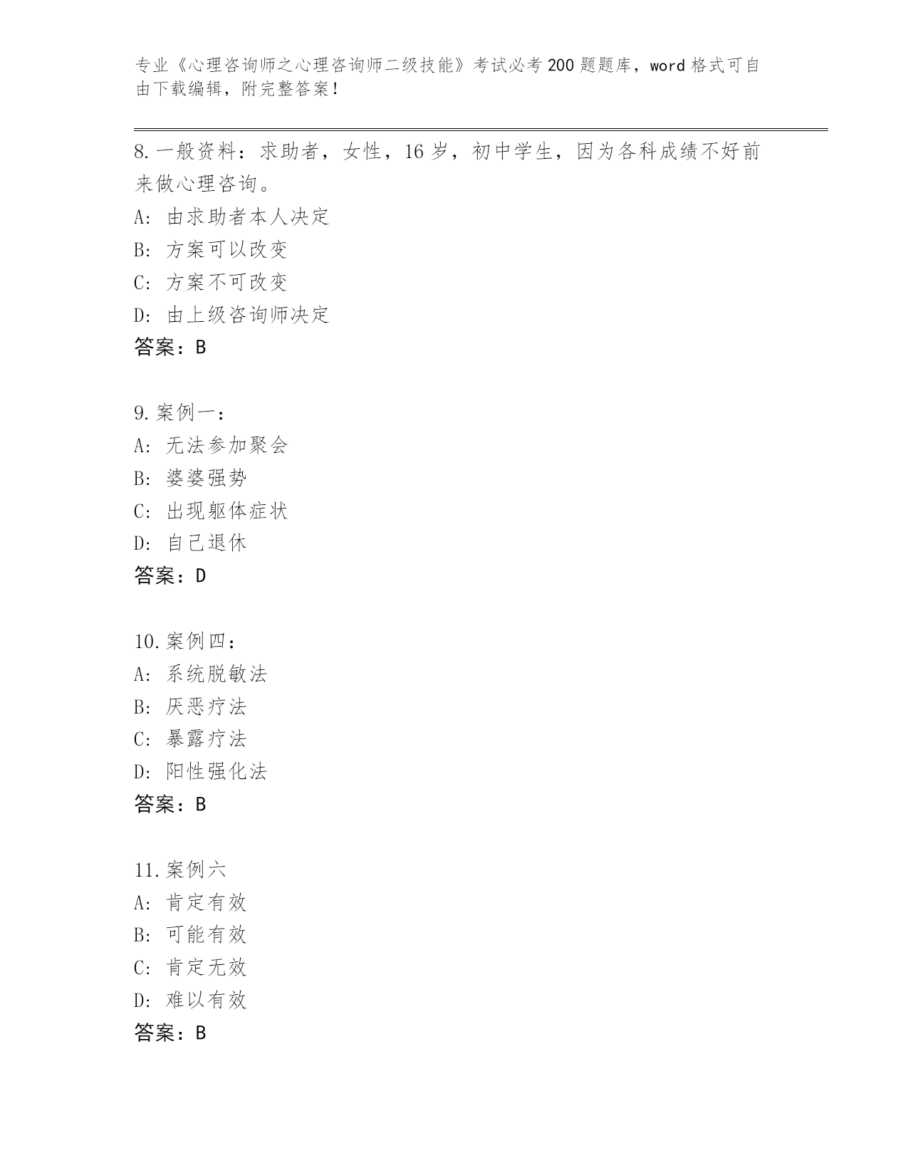 陕西省黄陵县2024年《心理咨询师之心理咨询师二级技能》考试必考200题真题附答案【精练】