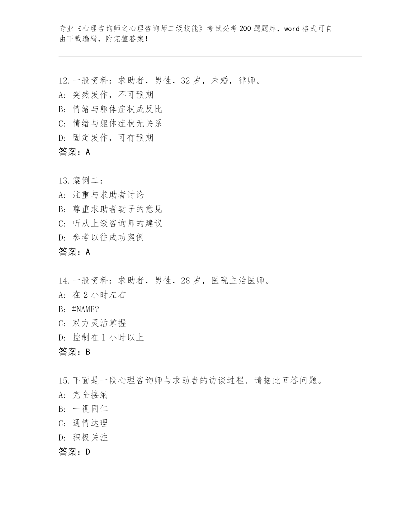 2024年安徽省《心理咨询师之心理咨询师二级技能》考试必考200题题库有答案