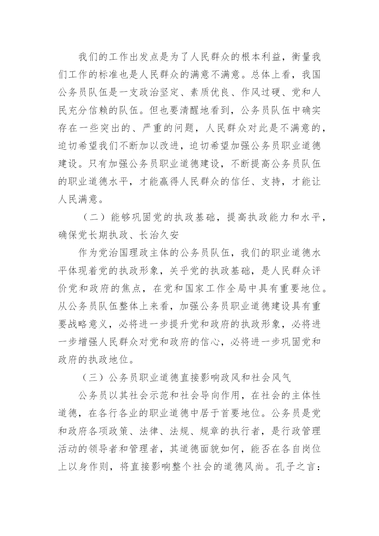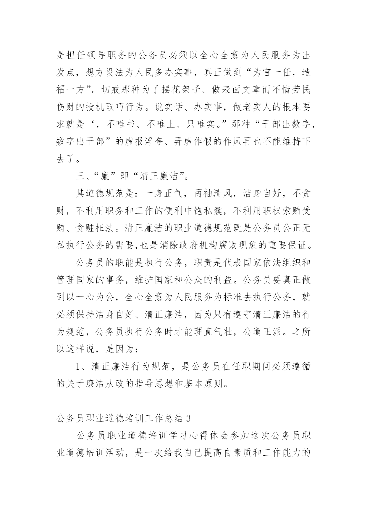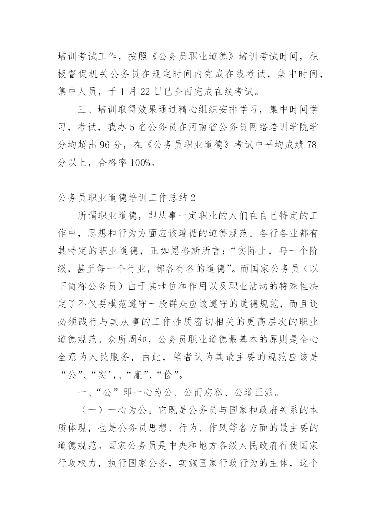公务员职业道德培训工作总结总结是事后对某一时期、某一项目或某些工作进行回顾和分析,从而做出带有规律性的结论,写总结有利于我们学习和工作能力的提高,是时候写一份总结了。我们该怎么去写总结呢?下面是小编整理的公务员职业道德培训工作总结,供大家参考借鉴,希望可以帮助到有需要的朋友。公务员职业道德培训工作总结1市爱卫办开展按照市人事局和公务员局《关于对全市行政机关公务员开展职业道德教育培训情况考试考核的通知》精神,我办高度重视,认真组织学习培训。现将培训总结如下:一、抓好培训学习我办积极召开全体干部会议,由党组书记组织学习《关于印发在全市行政机关公务员中开展以责随职走心随职走为主题的职业道德教育培训实施方案的通知》,要求全体职工认识到培训学习的重要性,结合实际工作主动学习,合理安排自学时间,要求每名同志在河南省公务员网络培训学院自学公务员职业道德教育培训等必修课程,要求每名同志的学分不得低于96学分。并在每周五下午集中学习《加强公务员职业道德建设读本》在学习过程中互相学习,互相帮助,真正提高身服务素质和工作能力,做一名合格的公务员。二、组织在线考试我办指定一名工作人员专门负责此次培训考试工作,按照《公务员职业道德》培训考试时间,积极督促机关公务员在规定时间内完成在线考试,集中时间,集中人员,于1月22日已全面完成在线考试。三、培训取得效果通过精心组织安排学习,集中时间学习,考试,我办5名公务员在河南省公务员网络培训学院学分均超出96分,在《公务员职业道德》考试中平均成绩78分以上,合格率100%。公务员职业道德培训工作总结2所谓职业道德,即从事一定职业的人们在自己特定的工作中,思想和行为方面应该遵循的道德规范。各行各业都有其特定的职业道德,正如恩格斯所言:“实际上,每一个阶级,甚至每一个行业,都各有各的道德”。而国家公务员(以下简称公务员)由于其地位和作用以及职业活动的特殊性决定了不仅要模范遵守一般群众应该遵守的道德规范,而且还必须践行与其从事的工作性质密切相关的更高层次的职业道德规范。众所周知,公务员职业道德最基本的原则是全心全意为人民服务,由此,笔者认为其最主要的规范应该是“公”、“实’,、“廉”、“俭”。一、“公”即一心为公、公而忘私、公道正派。(一)一心为公。它既是公务员与国家和政府关系的本质体现,也是公务员思想、行为、作风等各方面的最主要的道德规范。国家公务员是中央和地方各级人民政府行使国家行政权力,执行国家公务,实施国家行政行为的主体,这个根本属性决定了公务员的职业行为必须无条件服从国家意志,处处考虑和维护国家的尊严和政府的声誉。具体地说就是必须坚持四项基本原则,坚持改革开放,坚决贯彻执行党的路线、方针、政策‘集中表现为坚持’‘一个中心,两个基本点”以及提出的政治方向、政治立场、政治观点、政治纪律、政治鉴别和政治敏锐性等行为规范。(二)公而忘私。公务员要真正做到“一心为公”必须正确处理好国家利益、人民利益和个人利益之间的关系。因为公务员在工作和生活过程中,必然会面对着利益的取舍问题,尤其是当国家利益或人民利益与个人利益之间发生矛盾的时候,更加不可避免的迫使其作出抉择。作为一切言行都以合乎广大人民群众的最大利益为最高目标的公务员,个人利益必须眼从于人民利益,只有在保障人民利益的前提下,才能实现个人利益与人民利益的统一。这是公务员职业道德规范中处理利益取舍问题时最起码、最经常的要求。而在个人利益和人民利益发生冲突的情况下,自觉地无条件地服从于人民利益,在人民需要的时候,为了人民的利益勇于牺牲个人利益甚至自己的生命,则是公务员职业道德原则最重要的归宿,也是衡量一个公务员职业道德水平高低的尺度。在这方面,我们有许多榜样,60年代的焦裕禄和90年代的孔繁森就是典范。(三)公道正派。公务员的职业性质决定了不管他头上有没有“帽”,手中总会有点“权”。要使公务员能够正确行使权力,切实保证全心全意为人民服务的宗旨不变,就必须具备执政为民、用权为公、奉法1}理、正直无私、公事公办等职业道德规范。也只有这样才能真正做到:处理问题,秉公办事;解决问题,主持公道;遇到干扰,铁面无私。从而杜绝‘“不给好处不办事,给了好处乱办事”等腐败现象。二、“实”即实事求是,一切从实际出发;说实话,办实事,做老实人。(一)实事求是一切从实际出发。这是公务员在行使行政管理权力,执行公务时必须遵循的又一主要的职业道德行为规范。邓小平同志指出:“实事求是,是无产阶级世界观的基础,是马克思主义的思想基础。过去我们搞革命所取得的一切胜利,是靠实事求是,现在我们要实现四个现代化,同样要靠实事求是”。公务员肩负着上传下达以及管理政务的重任,要使政策“从群众中来又到群众中去”真正反映人民的意志,首要的是一切从实际出发,忠于事实,尊重客观规律。只有这样才能从中得出事物中固有的而