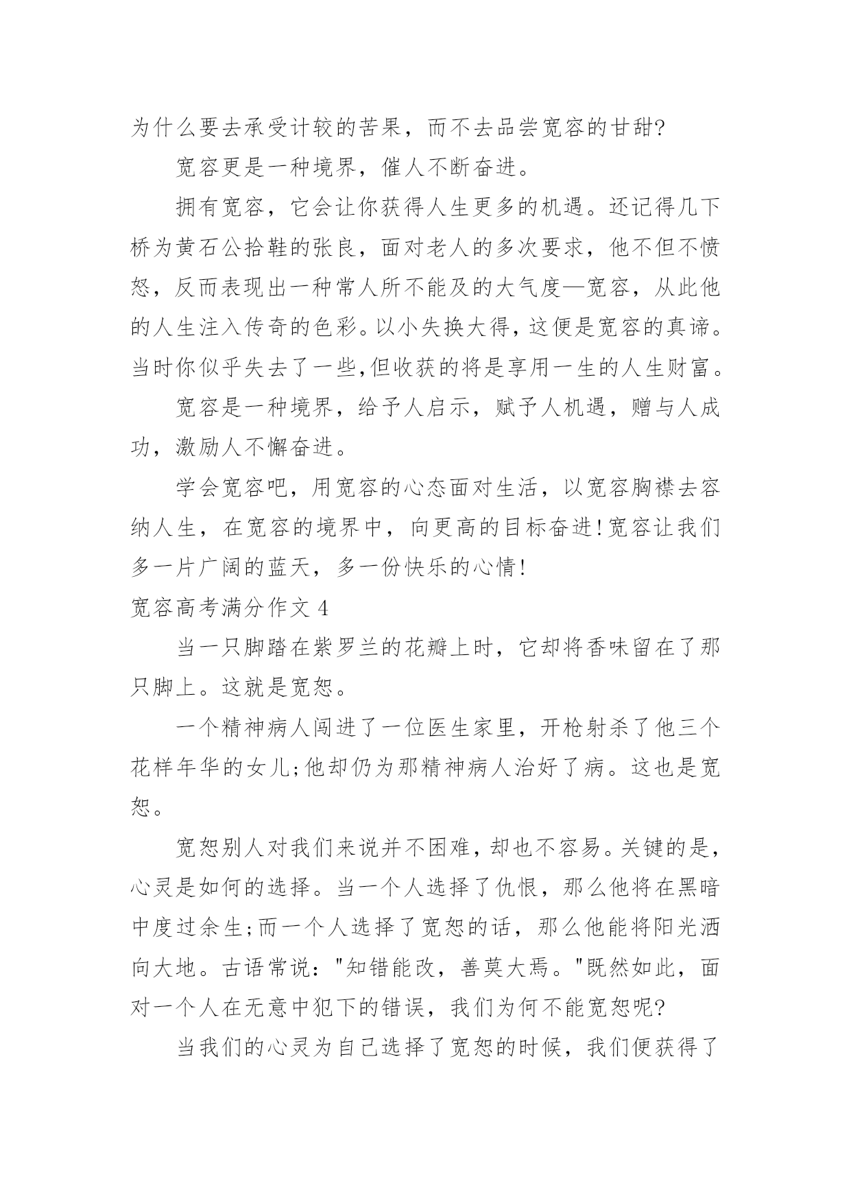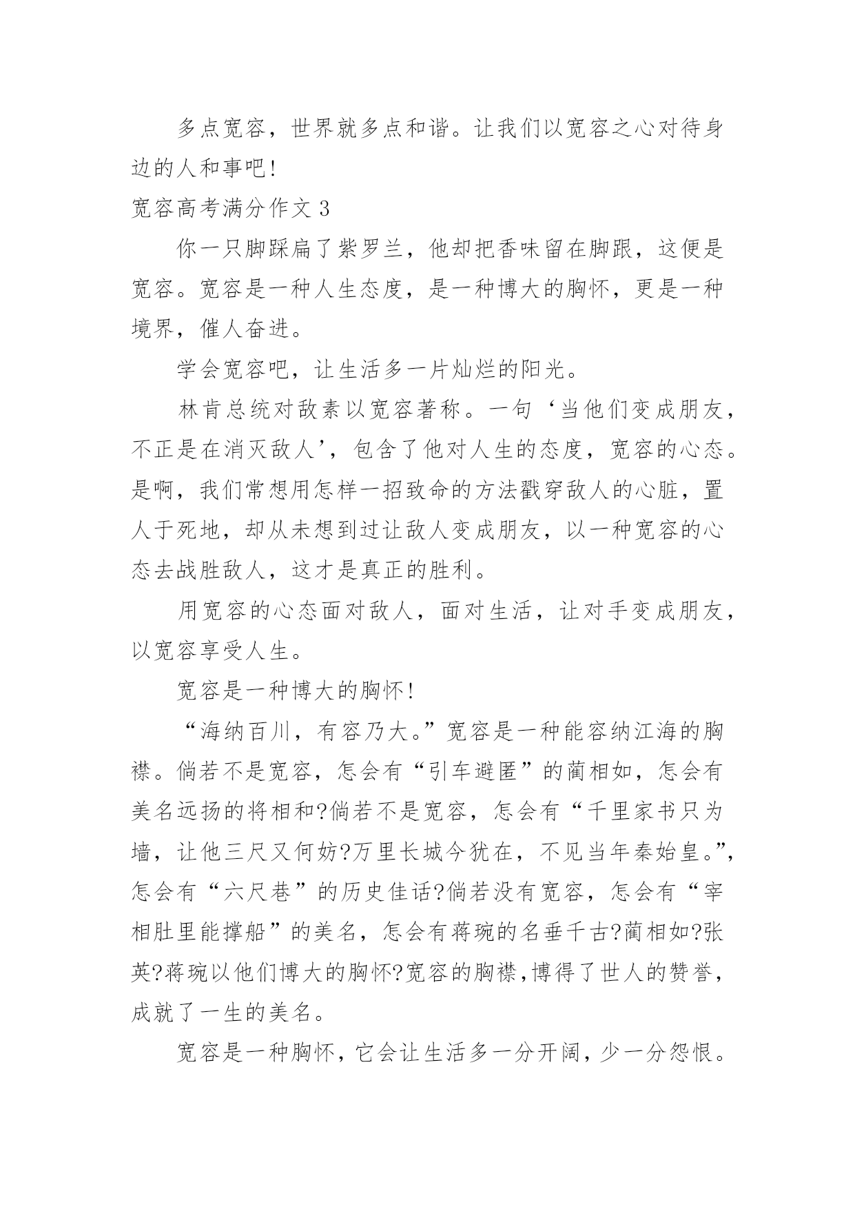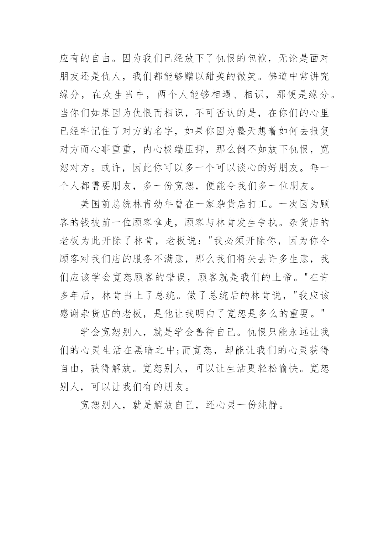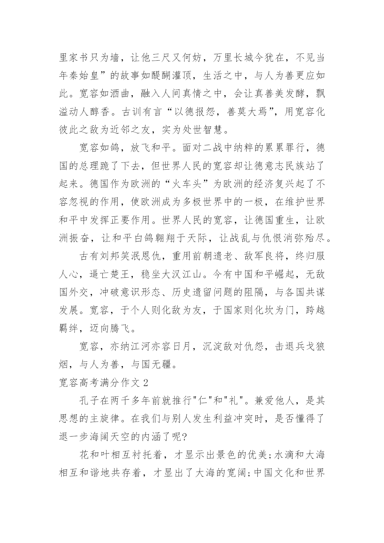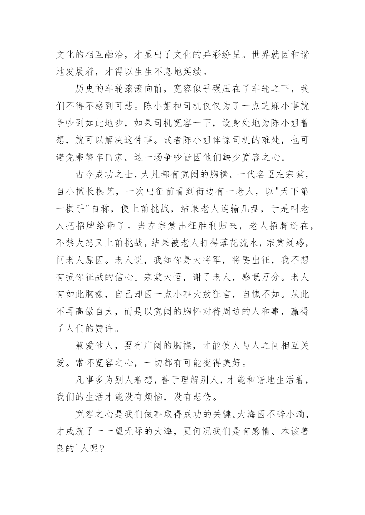 宽容高考满分作文宽容高考满分作文在日常学习、工作或生活中,说到作文,大家肯定都不陌生吧,写作文是培养人们的观察力、联想力、想象力、思考力和记忆力的重要手段。你知道作文怎样写才规范吗?下面是小编精心整理的宽容高考满分作文,希望能够帮助到大家。宽容高考满分作文1宽容似海,汇四方江河,有容乃大;宽容似天,聚日月星辰,互映光辉;宽容似山,育生灵万物,亘古博然。宽容是化敌为友的良策,是为人处世的智慧。牧场主不计前嫌,以德报怨,送给猎户儿子羔羊,使其为保护儿子的宠物,主动锁起猎犬,最终两家成为好邻居。足见宽容化干戈为玉帛的功效。宽容如阳,暖人心房。曼德拉当选南非总统后,黑人们叫嚣着要复仇,白人害怕被清算,他却放下仇怨,呼吁平等、和平,就职典礼上他曾主动牵起曾看管他的狱卒的手。把他介绍给大家,那一刻,宽容之阳终销蚀了人们心中种族歧视的坚冰,让“彩虹之国”重现光芒。因为宽容,曼德拉能团结国内力量,化敌为友,共同致力于南非的建设,使其成为非洲少有的发达国家,傲立非洲大陆。宽容如酒,酝酿真情。“六尺街”的典故记忆犹新,“千里家书只为墙,让他三尺又何妨,万里长城今犹在,不见当年秦始皇”的故事如醍醐灌顶,生活之中,与人为善更应如此。宽容如酒曲,融入人间真情之中,会让真善美发酵,飘溢动人醇香。古训有言“以德报怨,善莫大焉”,用宽容化彼此之敌为近邻之友,实为处世智慧。宽容如鸽,放飞和平。面对二战中纳粹的累累罪行,德国的总理跪了下去,但世界人民的宽容却让德意志民族站了起来。德国作为欧洲的“火车头”为欧洲的经济复兴起了不容忽视的作用,使欧洲成为多极世界中的一极,在维护世界和平中发挥正要作用。世界人民的宽容,让德国重生,让欧洲振奋,让和平白鸽翱翔于天际,让战乱与仇恨消弥殆尽。古有刘邦笑泯恩仇,重用前朝遗老、敌军良将,终归服人心,逼亡楚王,稳坐大汉江山。今有中国和平崛起,无敌国外交,冲破意识形态、历史遗留问题的阻隔,与各国共谋发展。宽容,于个人则化敌为友,于国家则化坎为门,跨越羁绊,迈向腾飞。宽容,亦纳江河亦容日月,沉淀敌对仇怨,击退兵戈狼烟,与人为善,与国无疆。宽容高考满分作文2孔子在两千多年前就推行"仁"和"礼"。兼爱他人,是其思想的主旋律。在我们与别人发生利益冲突时,是否懂得了退一步海阔天空的内涵了呢?花和叶相互衬托着,才显示出景色的优美;水滴和大海相互和谐地共存着,才显出了大海的宽阔;中国文化和世界文化的相互融洽,才显出了文化的异彩纷呈。世界就因和谐地发展着,才得以生生不息地延续。历史的车轮滚滚向前,宽容似乎碾压在了车轮之下,我们不得不感到可悲。陈小姐和司机仅仅为了一点芝麻小事就争吵到如此地步,如果司机宽容一下,设身处地为陈小姐着想,就可以解决这件事。或者陈小姐体谅司机的难处,也可避免乘警车回家。这一场争吵皆因他们缺少宽容之心。古今成功之士,大凡都有宽阔的胸襟。一代名臣左宗棠,自小擅长棋艺,一次出征前看到街边有一老人,以"天下第一棋手"自称,便上前挑战,结果老人连输几盘,于是叫老人把招牌给砸了。当左宗棠出征胜利归来,老人招牌还在,不禁大怒又上前挑战,结果被老人打得落花流水,宗棠疑惑,问老人原因。老人说,我知你是大将军,将要出征,我不想有损你征战的信心。宗棠大悟,谢了老人,感慨万分。老人有如此胸襟,自己却因一点小事大放狂言,自愧不如。从此不再高傲自大,而是以宽阔的胸怀对待周边的人和事,赢得了人们的赞许。兼爱他人,要有广阔的胸襟,才能使人与人之间相互关爱。常怀宽容之心,一切都有可能变得美好。凡事多为别人着想,善于理解别人,才能和谐地生活着,我们的生活才能没有烦恼,没有悲伤。宽容之心是我们做事取得成功的关键。大海因不辞小滴,才成就了一一望无际的大海,更何况我们是有感情、本该善良的`人呢?多点宽容,世界就多点和谐。让我们以宽容之心对待身边的人和事吧!宽容高考满分作文3你一只脚踩扁了紫罗兰,他却把香味留在脚跟,这便是宽容。宽容是一种人生态度,是一种博大的胸怀,更是一种境界,催人奋进。学会宽容吧,让生活多一片灿烂的阳光。林肯总统对敌素以宽容著称。一句‘当他们变成朋友,不正是在消灭敌人’,包含了他对人生的态度,宽容的心态。是啊,我们常想用怎样一招致命的方法戳穿敌人的心脏,置人于死地,却从未想到过让敌人变成朋友,以一种宽容的心态去战胜敌人,这才是真正的胜利。用宽容的心态面对敌人,面对生活,让对手变成朋友,以宽容享受人生。宽容是一种博大的胸怀!“海纳百川,有容乃大。”宽容是一种能容纳江海的胸襟。倘若不是宽容,怎会有“引车避匿”的蔺相如,怎会有美名远扬的将相和?倘若不是宽容,怎会有“千里家书只为墙,让他三尺又何妨?万里长城今犹在,不见当年秦始皇。”,怎会有“六尺巷”的历史佳话?倘若没有宽容,怎会有“宰相肚里能撑船”的美名,怎会有蒋琬的名垂千古?蔺相如?张英?蒋琬以他们博