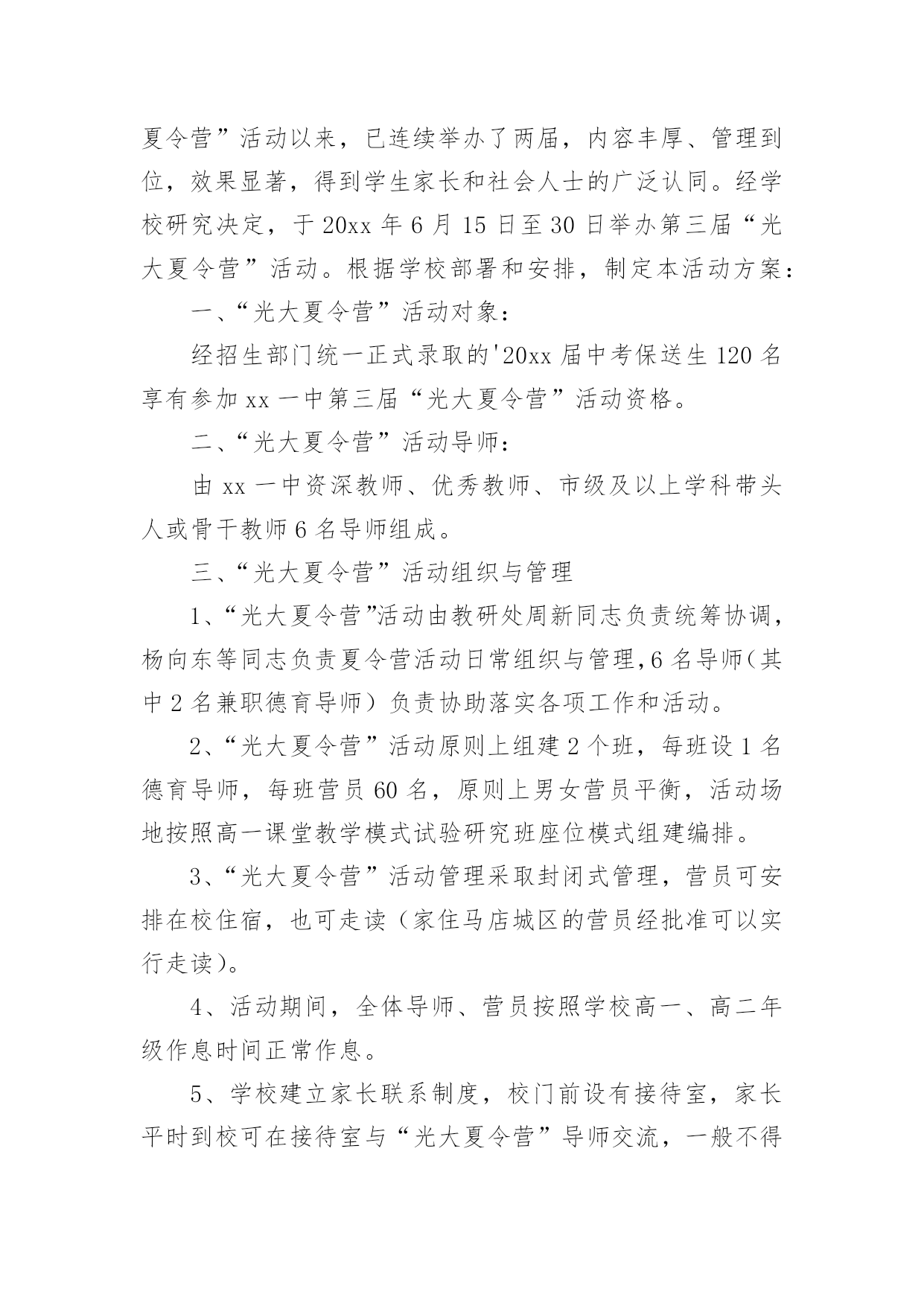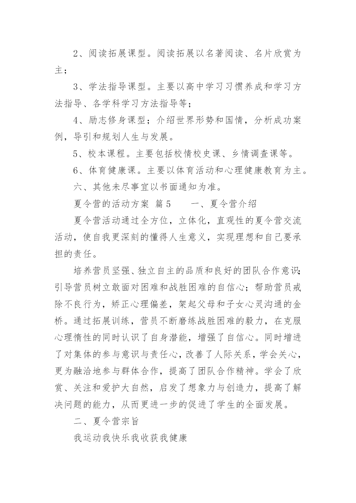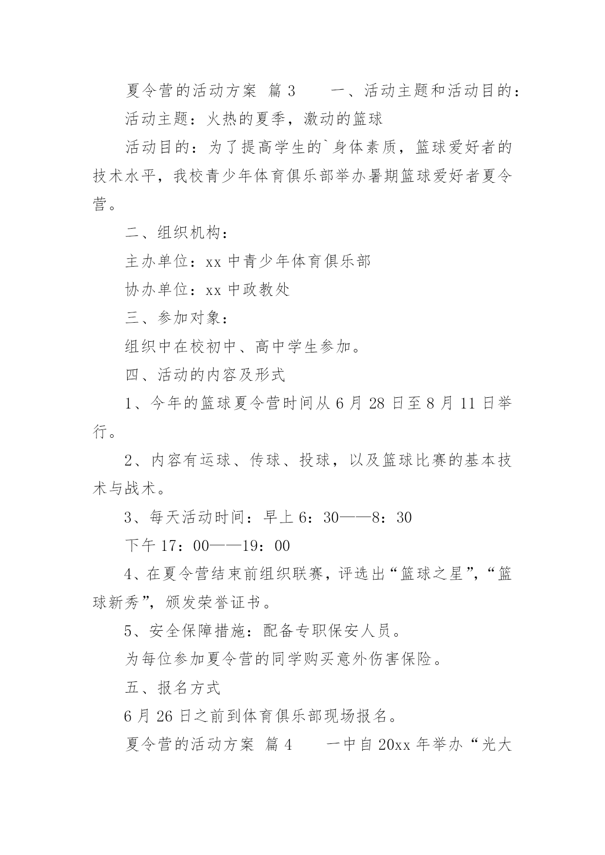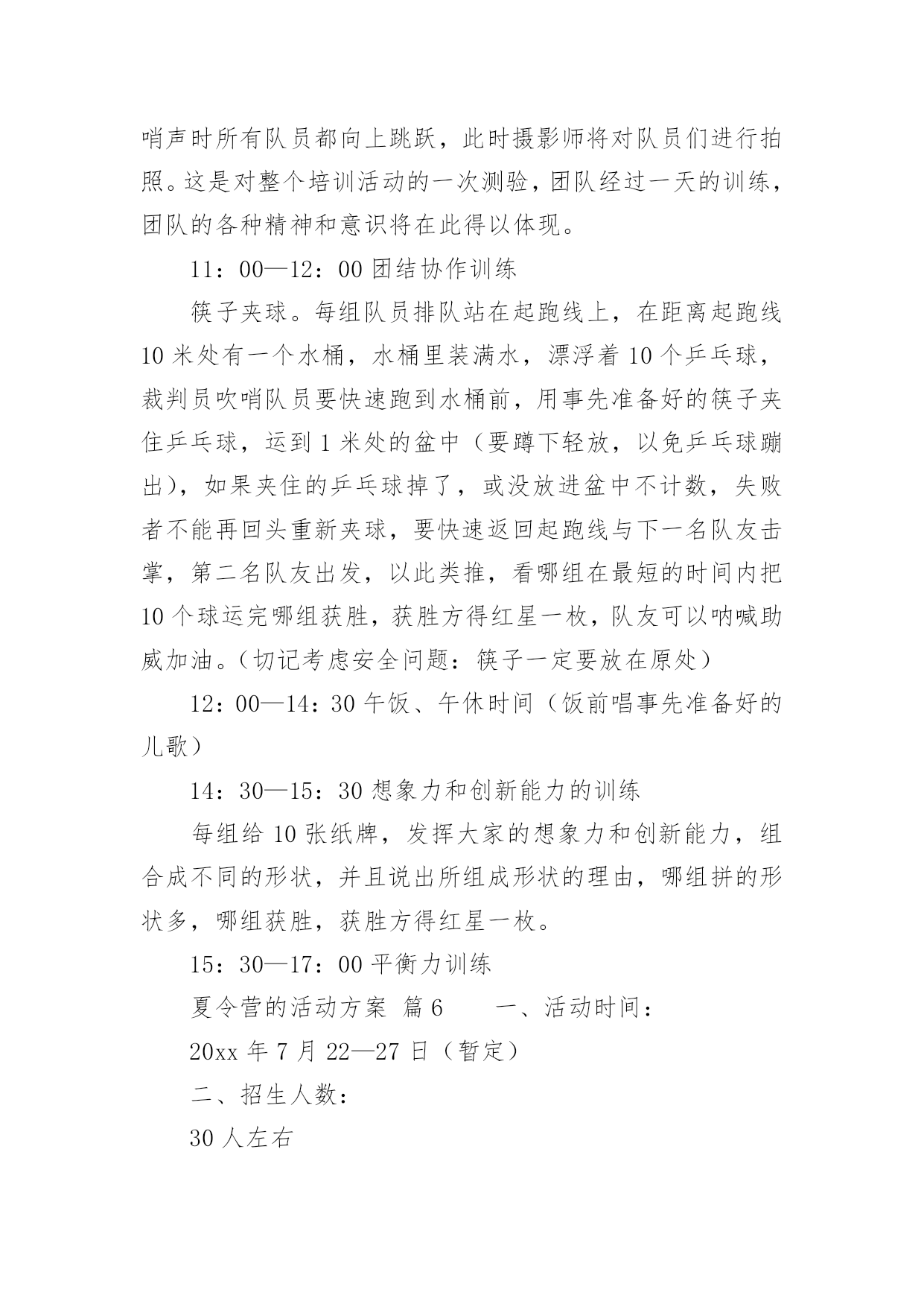 夏令营的活动方案夏令营的活动方案(通用12篇)为了保障活动顺利、圆满进行,时常需要预先制定一份周密的活动方案,活动方案指的是为某一次活动所制定的计划类文书。那要怎么制定科学的活动方案呢?下面是小编整理的夏令营的活动方案(通用12篇),欢迎大家借鉴与参考,希望对大家有所帮助。夏令营的活动方案篇1一、活动的背景现在的孩子基本上都是独生子女,他们的要求家长都会极力满足。因此也就养成了孩子的一些不良的生活品质:任性、自私、责任感不强、合作意识薄弱、意志力不够坚韧等。因此,夏令营以快乐成长为宗旨增强孩子责任心,培养孩子的自我管理能力。让孩子在自然环境中关心他人,在客服困境中建立顽强精神,在团队竞赛中建立自信和团队精神,在学习过程中积累学习方法。二、活动目的培养青少年积极健康的.心态,积极进取的人生态度;了解自身优点,更积极客观的看待缺点,提高自我认知能;激发孩子与人交往的能力,锻炼孩子与人沟通和交流的能力;能够让孩子感受到有知心朋友的关心,感受到积极的情感沟通;理解和支持他人,有较强的换位思考能力;处理事情的应变能力以及面对困境的勇气;培养孩子的创新思维、组织能力、人格魅力的展现;回归大自然,陶冶情操,磨练意志,接受考验,挑战自我,熔炼团队!三、活动的意义为了培养孩子的心智成长,通过团体活动、感恩教育、心理游戏、拓展训练等形式,逐渐完善孩子的认知能力、情绪调节能力、人际沟通能力及坚强的意志力。四、活动的主题成长与快乐融合青少年实训夏令营。联系人:xxx联系电话:xxxxx夏令营的活动方案篇2一、活动主题和目的活动主题:团结协作挑战自我追逐彩虹放飞理想活动目的:新奇的体验、好玩的游戏、培养团队精神和磨练人的`意志,掌握一些书本上没有、课堂上无法得到的人生有益的知识。二、组织机构主办单位:xx市教育局承办单位:xx市中小学生生产实践教育基地、xx中政教处三、参加对象组织七年级、八年级在校学生四、报名及活动形式以班级为单位报名汇总之后,报学校政教处,并由政教处将学生名单报至承办单位xx市中小学生生产实践教育基地。按照夏令营时间安排表进行活动。夏令营的活动方案篇3一、活动主题和活动目的:活动主题:火热的夏季,激动的篮球活动目的:为了提高学生的`身体素质,篮球爱好者的技术水平,我校青少年体育俱乐部举办暑期篮球爱好者夏令营。二、组织机构:主办单位:xx中青少年体育俱乐部协办单位:xx中政教处三、参加对象:组织中在校初中、高中学生参加。四、活动的内容及形式1、今年的篮球夏令营时间从6月28日至8月11日举行。2、内容有运球、传球、投球,以及篮球比赛的基本技术与战术。3、每天活动时间:早上6:30——8:30下午17:00——19:004、在夏令营结束前组织联赛,评选出“篮球之星”,“篮球新秀”,颁发荣誉证书。5、安全保障措施:配备专职保安人员。为每位参加夏令营的同学购买意外伤害保险。五、报名方式6月26日之前到体育俱乐部现场报名。夏令营的活动方案篇4一中自20xx年举办“光大夏令营”活动以来,已连续举办了两届,内容丰厚、管理到位,效果显著,得到学生家长和社会人士的广泛认同。经学校研究决定,于20xx年6月15日至30日举办第三届“光大夏令营”活动。根据学校部署和安排,制定本活动方案:一、“光大夏令营”活动对象:经招生部门统一正式录取的'20xx届中考保送生120名享有参加xx一中第三届“光大夏令营”活动资格。二、“光大夏令营”活动导师:由xx一中资深教师、优秀教师、市级及以上学科带头人或骨干教师6名导师组成。三、“光大夏令营”活动组织与管理1、“光大夏令营”活动由教研处周新同志负责统筹协调,杨向东等同志负责夏令营活动日常组织与管理,6名导师(其中2名兼职德育导师)负责协助落实各项工作和活动。2、“光大夏令营”活动原则上组建2个班,每班设1名德育导师,每班营员60名,原则上男女营员平衡,活动场地按照高一课堂教学模式试验研究班座位模式组建编排。3、“光大夏令营”活动管理采取封闭式管理,营员可安排在校住宿,也可走读(家住马店城区的营员经批准可以实行走读)。4、活动期间,全体导师、营员按照学校高一、高二年级作息时间正常作息。5、学校建立家长联系制度,校门前设有接待室,家长平时到校可在接待室与“光大夏令营”导师交流,一般不得进入校内。家长带给学生的钱物由接待室人员交德育导师转给营员本人。四、“光大夏令营”活动主要内容与重大活动安排。主要内容安排:以语数外物化等学科初高中衔接文化课教学为主线,以课外拓展、学法指导、励志修身报告为特色,穿插校史校情乡情、参观调查走访等综合实践活动。重大活动安排:1、6月15日上午夏令营活动正式启动,营员报到注册,下午参观校陈列室、观看记录片、熟悉校园,编制学习小组,编排座位及寝室。2、6月16日(周二)上午9:00在问xx小学