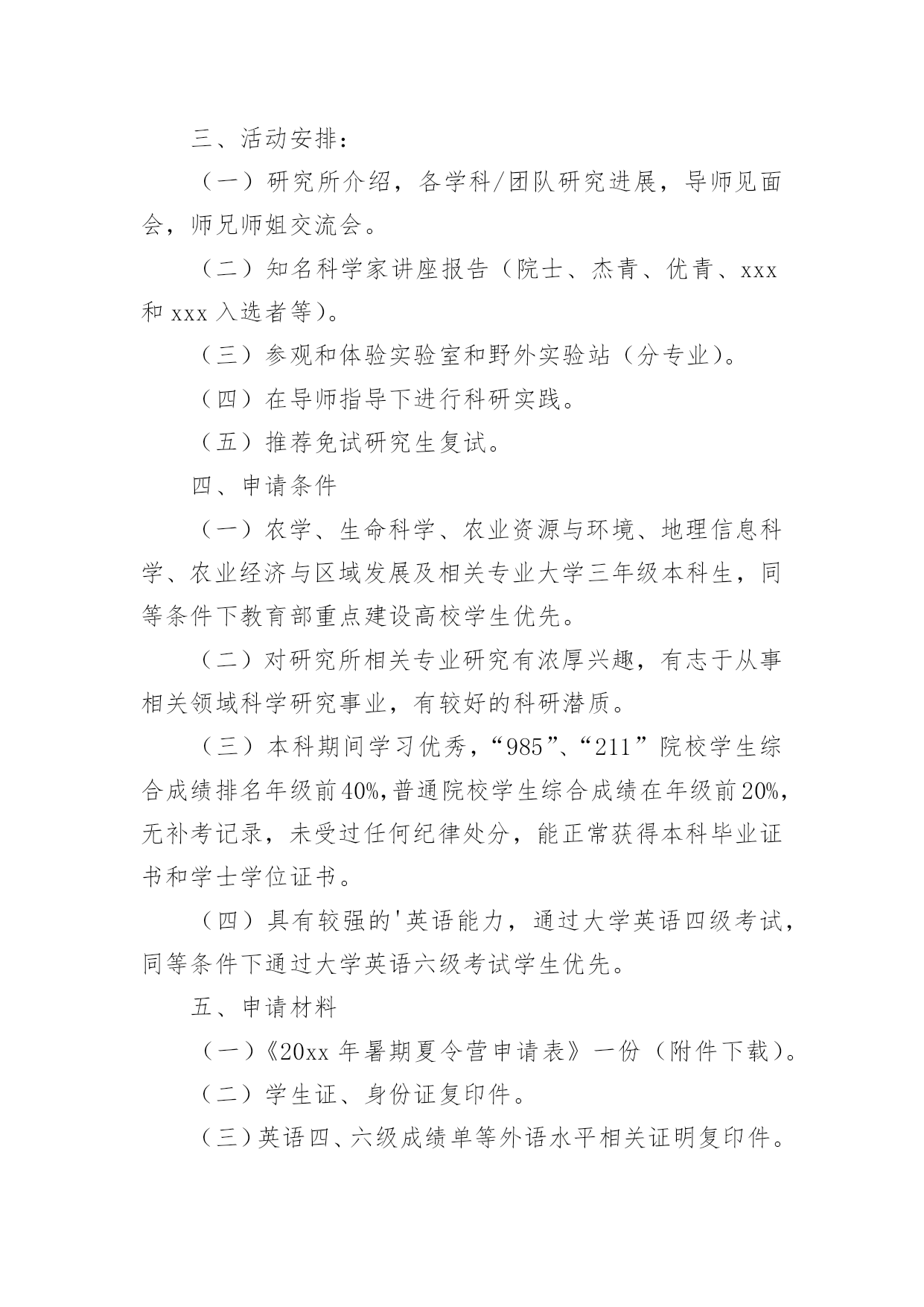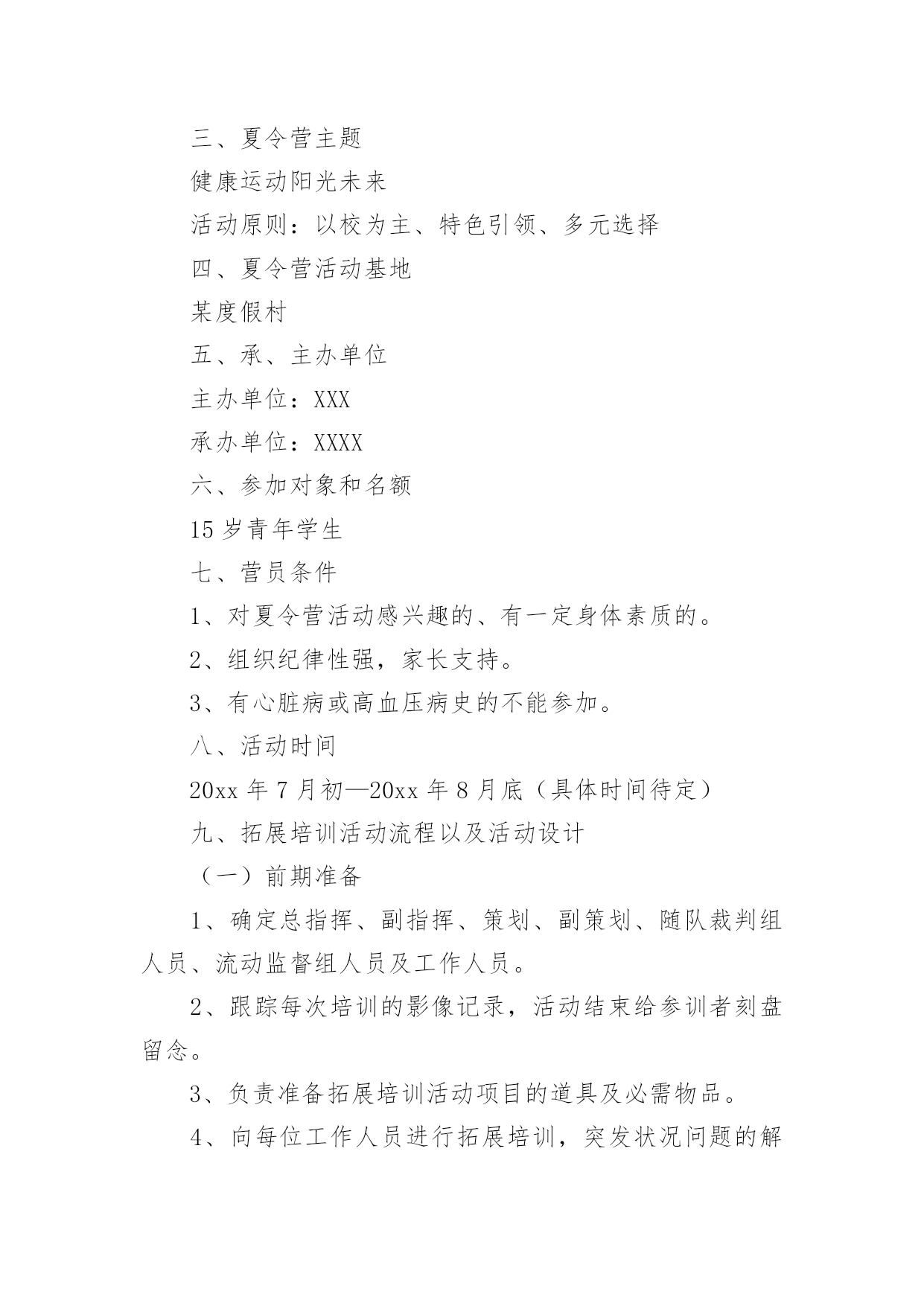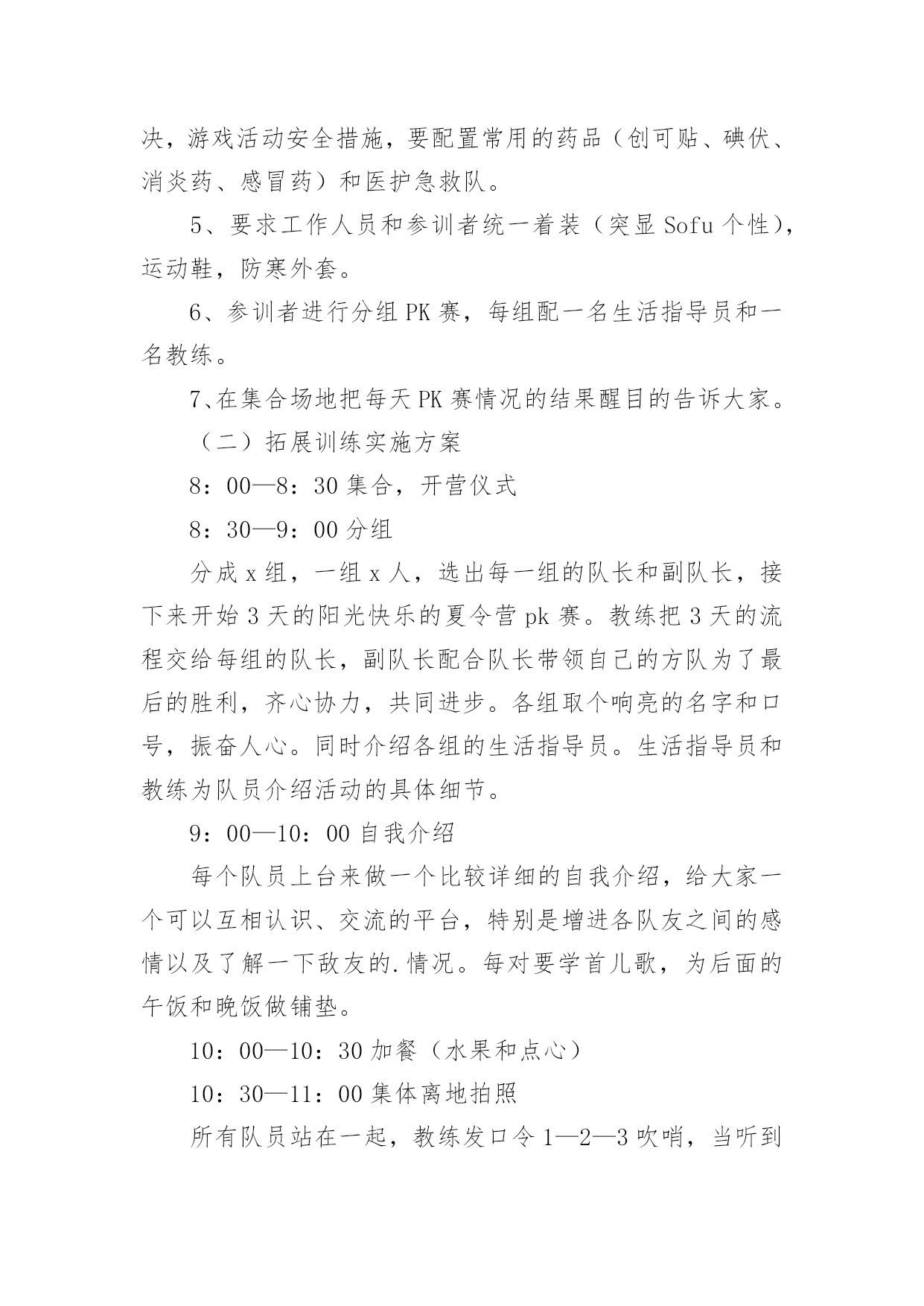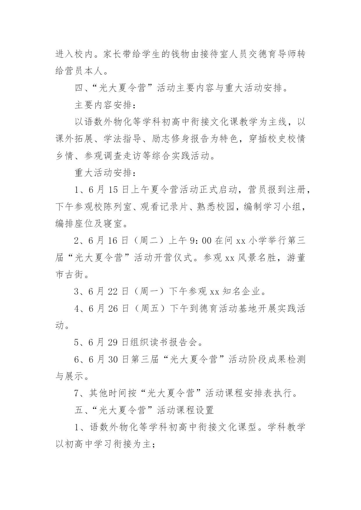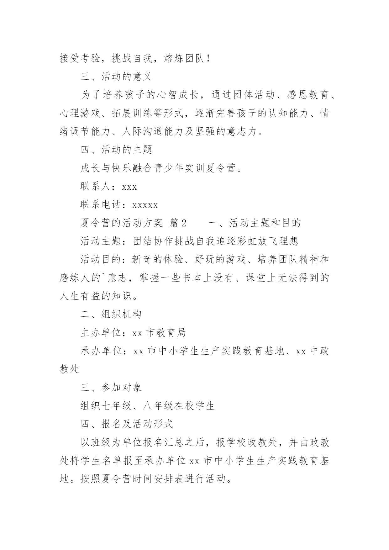 夏令营的活动方案夏令营的活动方案(通用12篇)为了保障活动顺利、圆满进行,时常需要预先制定一份周密的活动方案,活动方案指的是为某一次活动所制定的计划类文书。那要怎么制定科学的活动方案呢?下面是小编整理的夏令营的活动方案(通用12篇),欢迎大家借鉴与参考,希望对大家有所帮助。夏令营的活动方案篇1一、活动的背景现在的孩子基本上都是独生子女,他们的要求家长都会极力满足。因此也就养成了孩子的一些不良的生活品质:任性、自私、责任感不强、合作意识薄弱、意志力不够坚韧等。因此,夏令营以快乐成长为宗旨增强孩子责任心,培养孩子的自我管理能力。让孩子在自然环境中关心他人,在客服困境中建立顽强精神,在团队竞赛中建立自信和团队精神,在学习过程中积累学习方法。二、活动目的培养青少年积极健康的.心态,积极进取的人生态度;了解自身优点,更积极客观的看待缺点,提高自我认知能;激发孩子与人交往的能力,锻炼孩子与人沟通和交流的能力;能够让孩子感受到有知心朋友的关心,感受到积极的情感沟通;理解和支持他人,有较强的换位思考能力;处理事情的应变能力以及面对困境的勇气;培养孩子的创新思维、组织能力、人格魅力的展现;回归大自然,陶冶情操,磨练意志,接受考验,挑战自我,熔炼团队!三、活动的意义为了培养孩子的心智成长,通过团体活动、感恩教育、心理游戏、拓展训练等形式,逐渐完善孩子的认知能力、情绪调节能力、人际沟通能力及坚强的意志力。四、活动的主题成长与快乐融合青少年实训夏令营。联系人:xxx联系电话:xxxxx夏令营的活动方案篇2一、活动主题和目的活动主题:团结协作挑战自我追逐彩虹放飞理想活动目的:新奇的体验、好玩的游戏、培养团队精神和磨练人的`意志,掌握一些书本上没有、课堂上无法得到的人生有益的知识。二、组织机构主办单位:xx市教育局承办单位:xx市中小学生生产实践教育基地、xx中政教处三、参加对象组织七年级、八年级在校学生四、报名及活动形式以班级为单位报名汇总之后,报学校政教处,并由政教处将学生名单报至承办单位xx市中小学生生产实践教育基地。按照夏令营时间安排表进行活动。夏令营的活动方案篇3一、活动主题和活动目的:活动主题:火热的夏季,激动的篮球活动目的:为了提高学生的`身体素质,篮球爱好者的技术水平,我校青少年体育俱乐部举办暑期篮球爱好者夏令营。二、组织机构:主办单位:xx中青少年体育俱乐部协办单位:xx中政教处三、参加对象:组织中在校初中、高中学生参加。四、活动的内容及形式1、今年的篮球夏令营时间从6月28日至8月11日举行。2、内容有运球、传球、投球,以及篮球比赛的基本技术与战术。3、每天活动时间:早上6:30——8:30下午17:00——19:004、在夏令营结束前组织联赛,评选出“篮球之星”,“篮球新秀”,颁发荣誉证书。5、安全保障措施:配备专职保安人员。为每位参加夏令营的同学购买意外伤害保险。五、报名方式6月26日之前到体育俱乐部现场报名。夏令营的活动方案篇4一中自20xx年举办“光大夏令营”活动以来,已连续举办了两届,内容丰厚、管理到位,效果显著,得到学生家长和社会人士的广泛认同。经学校研究决定,于20xx年6月15日至30日举办第三届“光大夏令营”活动。根据学校部署和安排,制定本活动方案:一、“光大夏令营”活动对象:经招生部门统一正式录取的'20xx届中考保送生120名享有参加xx一中第三届“光大夏令营”活动资格。二、“光大夏令营”活动导师:由xx一中资深教师、优秀教师、市级及以上学科带头人或骨干教师6名导师组成。三、“光大夏令营”活动组织与管理1、“光大夏令营”活动由教研处周新同志负责统筹协调,杨向东等同志负责夏令营活动日常组织与管理,6名导师(其中2名兼职德育导师)负责协助落实各项工作和活动。2、“光大夏令营”活动原则上组建2个班,每班设1名德育导师,每班营员60名,原则上男女营员平衡,活动场地按照高一课堂教学模式试验研究班座位模式组建编排。3、“光大夏令营”活动管理采取封闭式管理,营员可安排在校住宿,也可走读(家住马店城区的营员经批准可以实行走读)。4、活动期间,全体导师、营员按照学校高一、高二年级作息时间正常作息。5、学校建立家长联系制度,校门前设有接待室,家长平时到校可在接待室与“光大夏令营”导师交流,一般不得进入校内。家长带给学生的钱物由接待室人员交德育导师转给营员本人。四、“光大夏令营”活动主要内容与重大活动安排。主要内容安排:以语数外物化等学科初高中衔接文化课教学为主线,以课外拓展、学法指导、励志修身报告为特色,穿插校史校情乡情、参观调查走访等综合实践活动。重大活动安排:1、6月15日上午夏令营活动正式启动,营员报到注册,下午参观校陈列室、观看记录片、熟悉校园,编制学习小组,编排座位及寝室。2、6月16日(周二)上午9:00在问xx小学