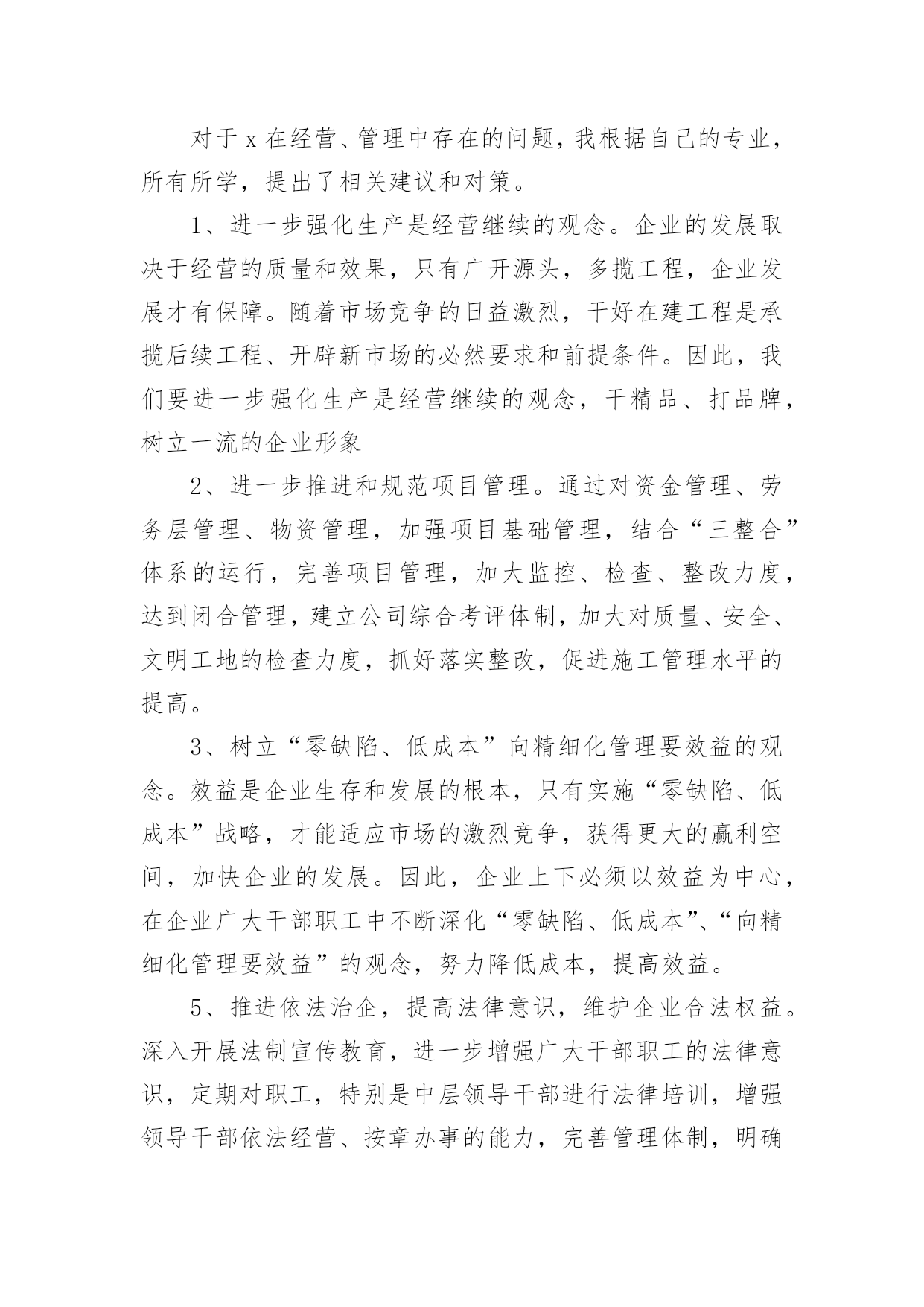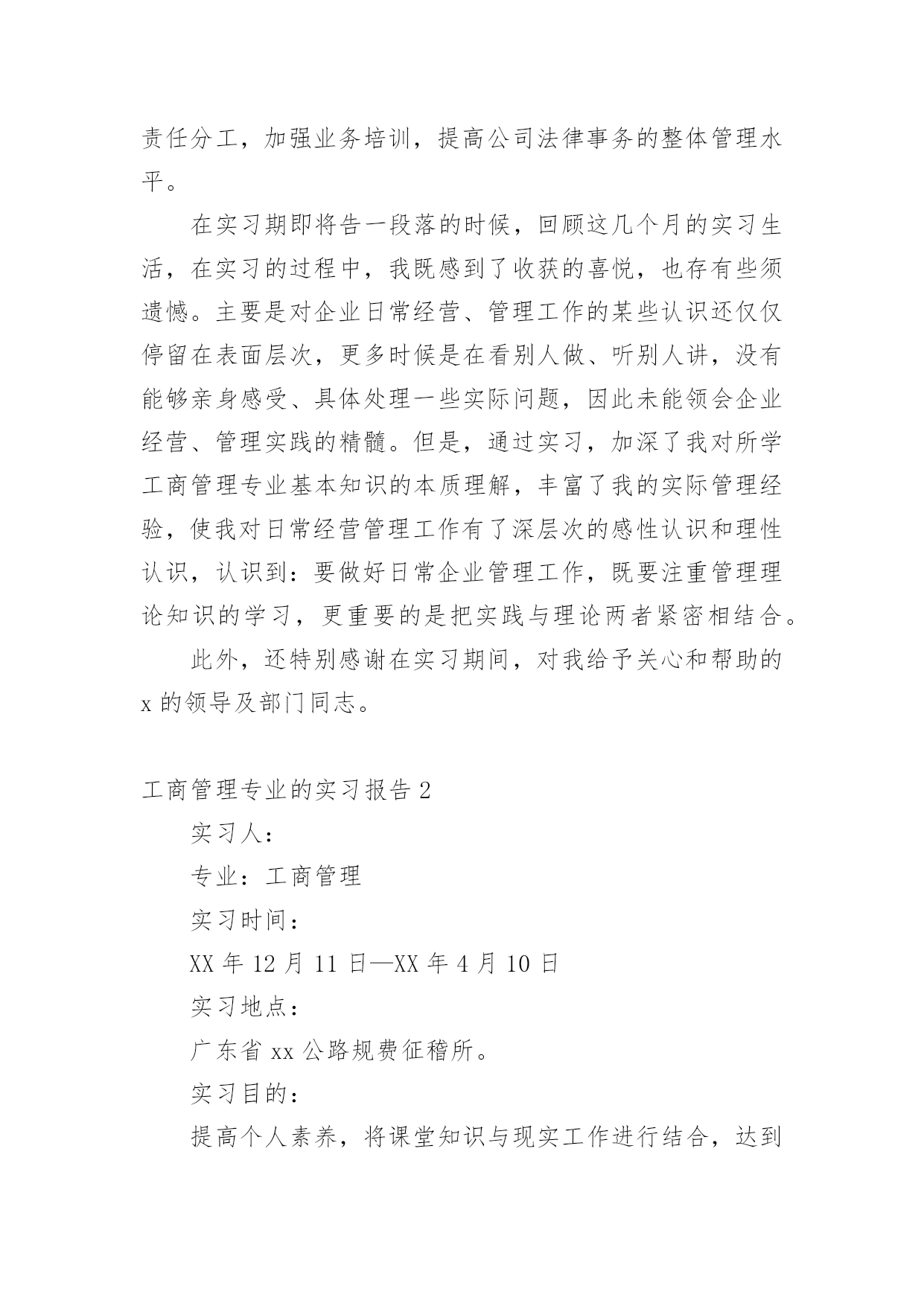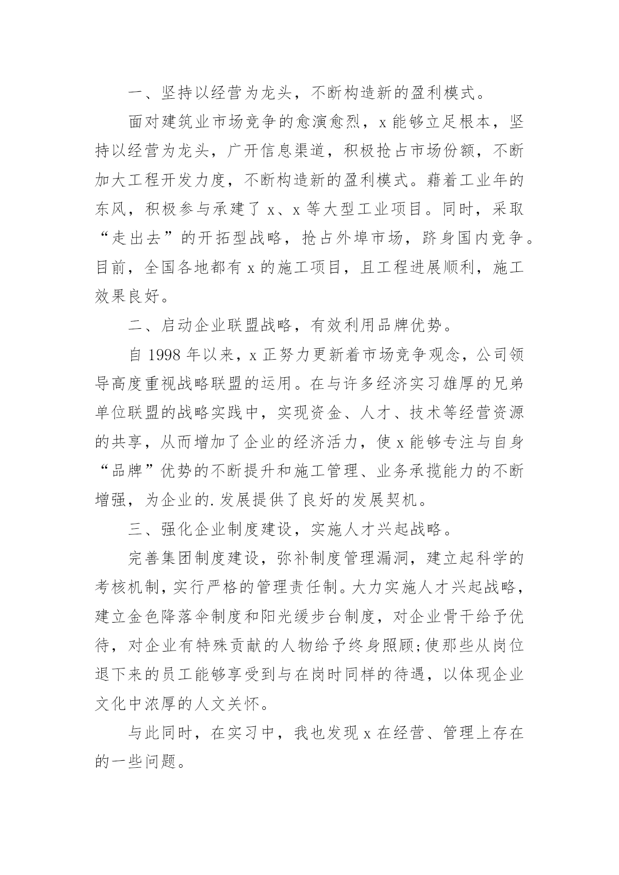 工商管理专业的实习报告【实用】工商管理专业的实习报告在经济发展迅速的今天,报告与我们愈发关系密切,报告成为了一种新兴产业。一听到写报告马上头昏脑涨?以下是小编收集整理的工商管理专业的实习报告,欢迎阅读,希望大家能够喜欢。工商管理专业的实习报告1从今年3月末开始,我在x毕业实习。实习期间,我在领导、同事们的热心关怀和悉心指导下,主动参与x的日常管理工作,注意把书本上学到的工商管理专业的相关理论知识应用到工作实践中。用理论加深对实践的感性认识,用实践来验证理论知识的准确性,积极探求日常管理工作的本质与规律。实习生活,满含着紧张和新奇,更从中收获了丰硕的成果。版权所有我所实习的x,是经国家建设部批准的、具有房屋建筑工程施工总承包壹级资质门类齐全的国有控股企业。现有员工x人,其中中级以上职称x人、工程技术人员x人,注册资本金x元人民币,总资产x元人民币。回首实习生活,虽然只有短短几个月的时间,却感触颇深。实习过程中,我采用了勤看、勤问、勤学、勤练的方式,对x日常管理工作的开展有了比较全面而深入的了解。在系统分析了公司经营管理的特点、方式和运做规律后,对x经营理念、企业精神有了深刻的认识。一、坚持以经营为龙头,不断构造新的盈利模式。面对建筑业市场竞争的愈演愈烈,x能够立足根本,坚持以经营为龙头,广开信息渠道,积极抢占市场份额,不断加大工程开发力度,不断构造新的盈利模式。藉着工业年的东风,积极参与承建了x、x等大型工业项目。同时,采取“走出去”的开拓型战略,抢占外埠市场,跻身国内竞争。目前,全国各地都有x的施工项目,且工程进展顺利,施工效果良好。二、启动企业联盟战略,有效利用品牌优势。自1998年以来,x正努力更新着市场竞争观念,公司领导高度重视战略联盟的运用。在与许多经济实习雄厚的兄弟单位联盟的战略实践中,实现资金、人才、技术等经营资源的共享,从而增加了企业的经济活力,使x能够专注与自身“品牌”优势的不断提升和施工管理、业务承揽能力的不断增强,为企业的.发展提供了良好的发展契机。三、强化企业制度建设,实施人才兴起战略。完善集团制度建设,弥补制度管理漏洞,建立起科学的考核机制,实行严格的管理责任制。大力实施人才兴起战略,建立金色降落伞制度和阳光缓步台制度,对企业骨干给予优待,对企业有特殊贡献的人物给予终身照顾;使那些从岗位退下来的员工能够享受到与在岗时同样的待遇,以体现企业文化中浓厚的人文关怀。与此同时,在实习中,我也发现x在经营、管理上存在的一些问题。1、市场观念和经营体制与公司快速发展的要求不相适应,市场开拓的步伐与企业快速发展的要求存在差距。主要表现在经营体制不完善,经营队伍、经营人员的责、权、利还有待于进一步提高。2、对分包队伍的管理制度不健全、管理程序不完善。在分包合同管理方面存在程序不衔接、管理不闭合的现象;项目部的技术、安全管理人员对分包队伍管理的重视程度不够,服务意识不强,在管理手段和制度落实上存在薄弱环节。3、成本意识不强,成本控制水平不高。个别项目存在管理粗放、施工大手大脚的现象,向管理要效益,向科技创新要效益的意识还没有牢固树立起来,此外,车辆管理、办公用品的消耗等机关非生产性支出的不断加大,使x的成本控制与一流的施工企业还存在较大的差距,市场竞争力因此降低。4、依法治企、依法维权和自我保护意识不强。集团某些领导干部的法律知识和依法治企的意识还不适应市场经济的要求,不能够充分运用法律手段来维护企业利益,尤其实在债权、债务等问题的处理上不尽如人意,使企业蒙受了巨大的损失,严重者甚至威胁到企业的稳定。5、施工组织管理观念有待于进一步转变。在施工过程中按照施工合同要求进行施工组织管理的意识不强,施工管理现状与施工管理科学化、规范化存在较大差距,使得有些项目在开工初级阶段和施工过程中难以进入状态,达到预期效果。对于x在经营、管理中存在的问题,我根据自己的专业,所有所学,提出了相关建议和对策。1、进一步强化生产是经营继续的观念。企业的发展取决于经营的质量和效果,只有广开源头,多揽工程,企业发展才有保障。随着市场竞争的日益激烈,干好在建工程是承揽后续工程、开辟新市场的必然要求和前提条件。因此,我们要进一步强化生产是经营继续的观念,干精品、打品牌,树立一流的企业形象2、进一步推进和规范项目管理。通过对资金管理、劳务层管理、物资管理,加强项目基础管理,结合“三整合”体系的运行,完善项目管理,加大监控、检查、整改力度,达到闭合管理,建立公司综合考评体制,加大对质量、安全、文明工地的检查力度,抓好落实整改,促进施工管理水平的提高。3、树立“零缺陷、低成本”向精细化管理要效益的观念。效益是企业生存和发展的根本,只有实施“零缺陷、低成本”战略,才能适应市场的激烈竞争,获得更大的赢利空间,加快企业的发展。因此,企业上下必须以效益为中心,在