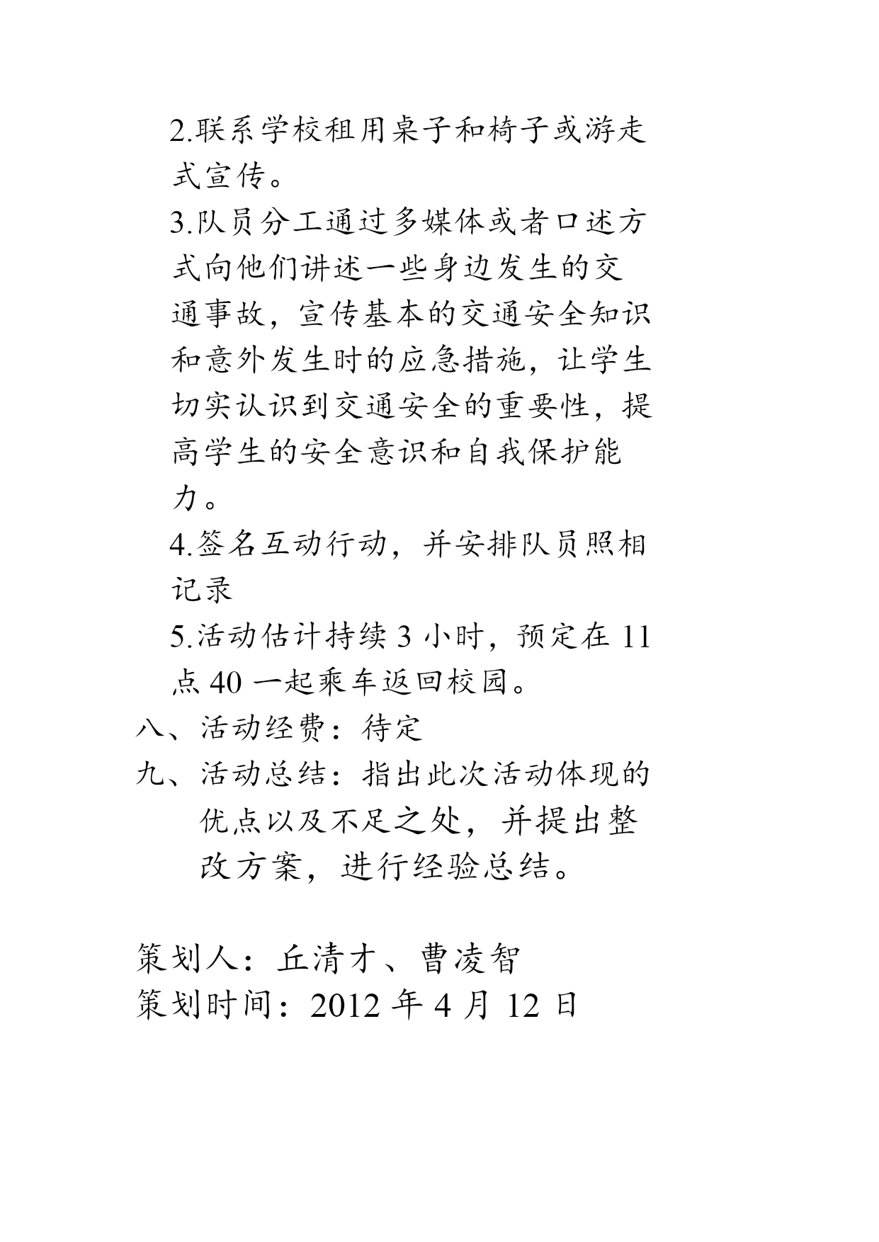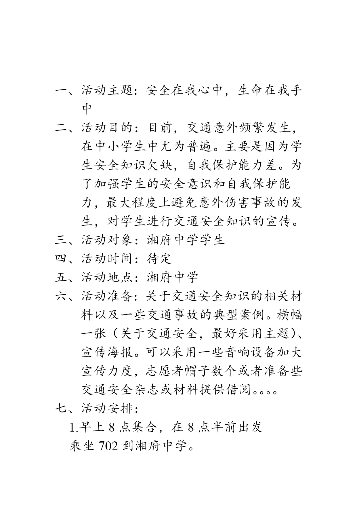 交通安全知识宣传策划书主办单位:服务一队策划时间:2012年4月12日目录活动主题………………..活动目的………………..活动对象………………..活动时间………………..活动地点………………..活动准备………………..活动安排………………..活动经费………………..活动总结………………..一、活动主题:安全在我心中,生命在我手中二、活动目的:目前,交通意外频繁发生,在中小学生中尤为普遍。主要是因为学生安全知识欠缺,自我保护能力差。为了加强学生的安全意识和自我保护能力,最大程度上避免意外伤害事故的发生,对学生进行交通安全知识的宣传。三、活动对象:湘府中学学生四、活动时间:待定五、活动地点:湘府中学六、活动准备:关于交通安全知识的相关材料以及一些交通事故的典型案例。横幅一张(关于交通安全,最好采用主题)、宣传海报。可以采用一些音响设备加大宣传力度,志愿者帽子数个或者准备些交通安全杂志或材料提供借阅。。。。七、活动安排:1.早上8点集合,在8点半前出发乘坐702到湘府中学。2.联系学校租用桌子和椅子或游走式宣传。3.队员分工通过多媒体或者口述方式向他们讲述一些身边发生的交通事故,宣传基本的交通安全知识和意外发生时的应急措施,让学生切实认识到交通安全的重要性,提高学生的安全意识和自我保护能力。4.签名互动行动,并安排队员照相记录5.活动估计持续3小时,预定在11点40一起乘车返回校园。八、活动经费:待定九、活动总结:指出此次活动体现的优点以及不足之处,并提出整改方案,进行经验总结。策划人:丘清才、曹凌智策划时间:2012年4月12日