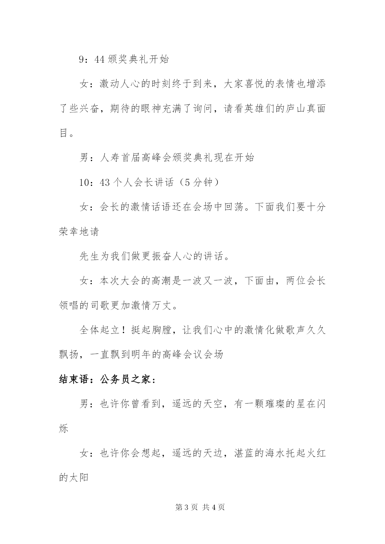 第PAGE\*Arabic\*MERGEFORMAT4页共NUMPAGES\*MERGEFORMAT4页保险公司会议主持词尊敬的各位嘉宾、各位领导、来自全国的伙伴们:大家好!男:在这充满激情的日子里,让我们来共同欢庆属于我们自己的节日女:人寿保险股份有限公司首届高峰会议合:现在开始男:今天,是我们业务人员的盛会,更是业务精英的舞台,让我们以最热烈的掌声和欢呼声欢迎今天的英雄们——首届高峰会会员入场!女:请公司领导迎接会员女:首先入场的是分公司的名精英们,长途跋涉,你们一定很辛苦,但你们热情洋溢的笑容已告诉大家,你们的心里是快乐无比的。欢迎你们!男:最后入场的是营业总部的精英们,一行人的庞大精英队伍,是士气如虹呀。这次峰会每个奖项都有你们的精英,真不愧是我们的营业总部。欢迎你们!女;感谢总公司领导,请入座。入场式结束,公司领导入座9:20---9:25介绍嘉宾和公司领导9:25----9:30董事长致开幕词9:30---9:38舞狮表演男:各位嘉宾,领导,劳苦功高的精英们,下面,两只活泼可爱的狮子将为你们助兴,喝彩(不要害怕哦),有请董事长先生为雄狮点睛。9:38---9:40会旗入场主持人串场:男:让我们用热烈的掌声迎接高峰会会旗入场。女:我们的会旗,(会旗的意义)。9:40---9:42授旗仪式男:看我们,两位会长精神抖擞,英姿飒爽。她们是高峰军团的代表,更是接受会旗的当之无愧的代表。下面,有请保险公司总经理先生向她们授旗9:42---9:44高峰会议会长领诵司训女:全体起立,请两位会长领诵司训。请坐。9:44颁奖典礼开始女:激动人心的时刻终于到来,大家喜悦的表情也增添了些兴奋,期待的眼神充满了询问,请看英雄们的庐山真面目。男:人寿首届高峰会颁奖典礼现在开始10:43个人会长讲话(5分钟)女:会长的激情话语还在会场中回荡。下面我们要十分荣幸地请先生为我们做更振奋人心的讲话。女:本次大会的高潮是一波又一波,下面由,两位会长领唱的司歌更加激情万丈。全体起立!挺起胸膛,让我们心中的激情化做歌声久久飘扬,一直飘到明年的高峰会议会场结束语:公务员之家:男:也许你曾看到,遥远的天空,有一颗璀璨的星在闪烁女:也许你会想起,遥远的天边,湛蓝的海水托起火红的太阳男:也许昨日的辛劳,还让你感到一丝的疲惫女:也许在今后的岁月里,将面临更严峻的考验女:在此春意融融的时节里,不经意间新的一年已经走过四月男:在这阳光灿烂的日子里,我们掸去身上的征尘,向着红日奔跑,我们时刻听从新华的召唤合:我们坚信:用我们睿智的头脑,骄人的业绩,尽展新华人新世纪的风采。明年见!
