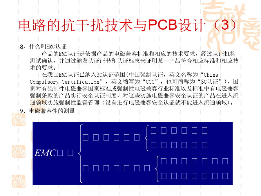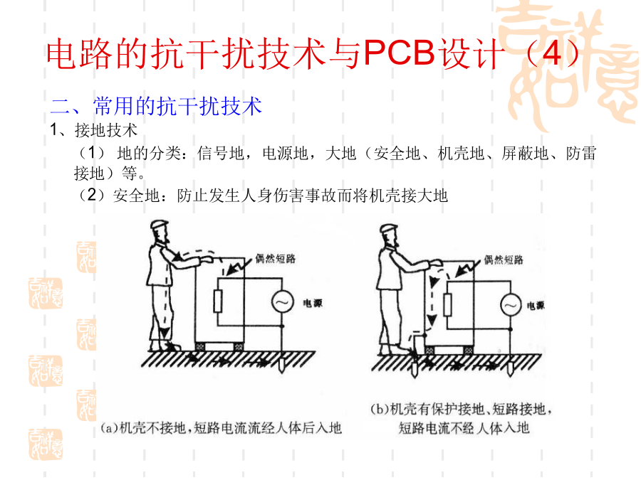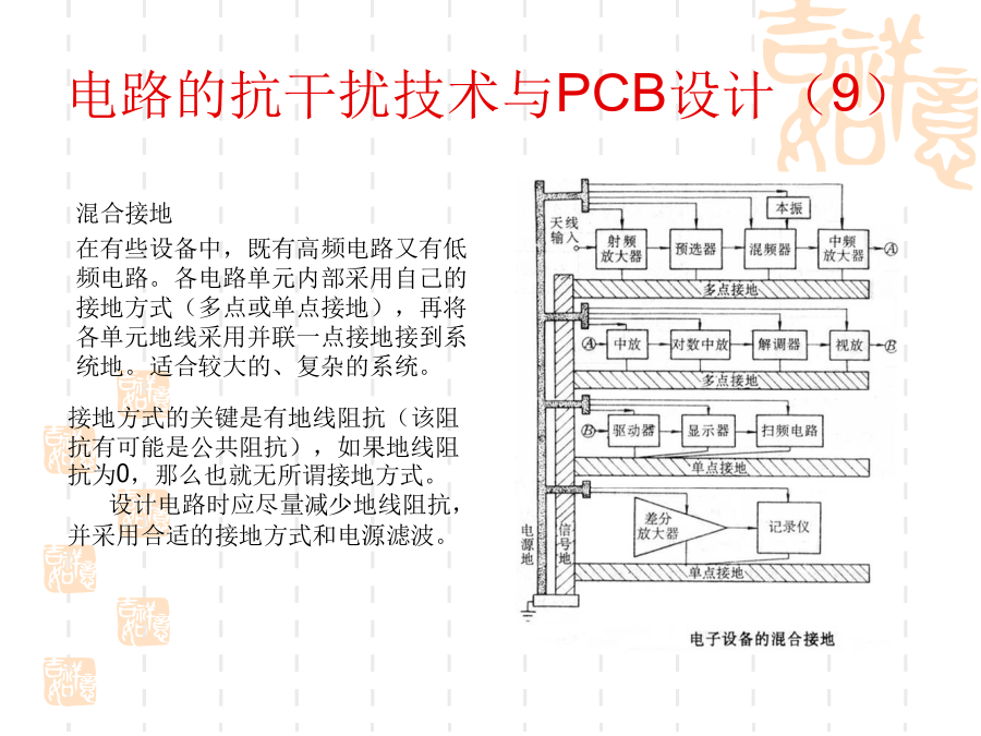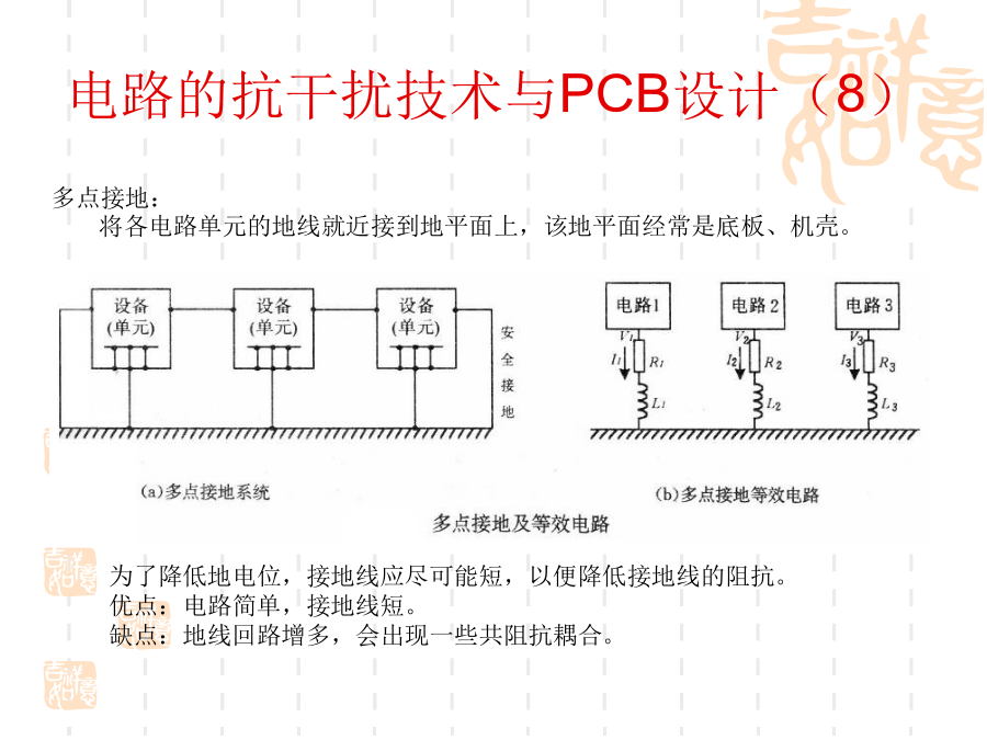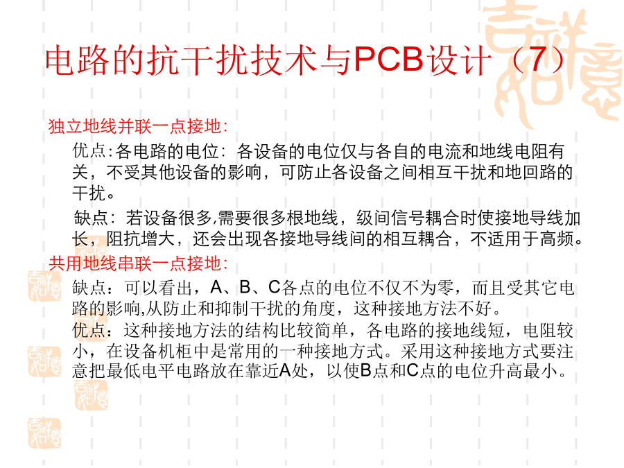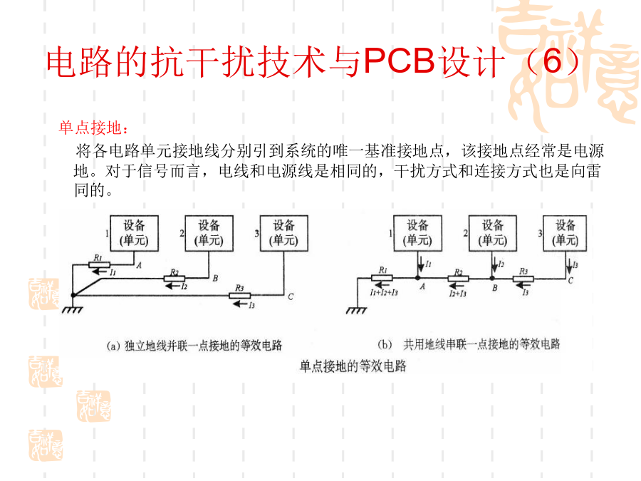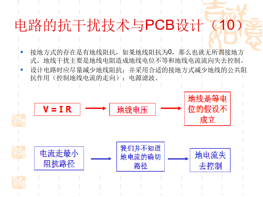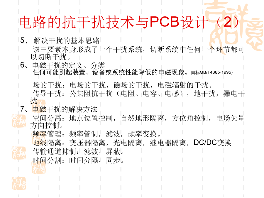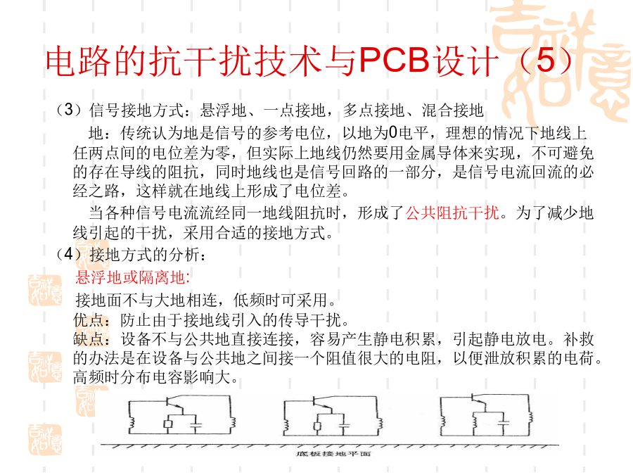 一、电磁兼容的基本概念1、问题的提出:随着电子技术的发展,电子设备的应用越来越普及,电子系统的规模越来越庞大,而体积却越来越小,电子设备的安装越来越密集,电子设备内部元器件的安装密度越来越高。使得电子设备之间、设备内部电路之间的干扰问题越来越突出。2、什么是电磁兼容?电磁兼容性(ElectromagneticCompatibility----EMC)是指设备或系统在其电磁环境中能正常工作且不对该环境中任何事物构成不能承受的电磁干扰的能力。(国标GB/T4365-1995)通俗的讲:电磁兼容是指多个设备或系统在同一环境中能够正常工作。其含义包括两个方面:不能形成干扰,也不能被干扰。换句话说:电磁兼容解决的是设备间干扰与被干扰的问题。3、电磁兼容研究的主要内容:电磁兼容设计;电磁兼容测试;电磁兼容标准及电磁兼容预测。4、电磁干扰的三要素:电路的抗干扰技术与PCB设计(2)电路的抗干扰技术与PCB设计(3)电路的抗干扰技术与PCB设计(4)电路的抗干扰技术与PCB设计(5)电路的抗干扰技术与PCB设计(6)电路的抗干扰技术与PCB设计(7)电路的抗干扰技术与PCB设计(8)电路的抗干扰技术与PCB设计(9)电路的抗干扰技术与PCB设计(10)电路的抗干扰技术与PCB设计(11)电路的抗干扰技术与PCB设计(12)电路的抗干扰技术与PCB设计(13)电路的抗干扰技术与PCB设计(14)电路的抗干扰技术与PCB设计(15)电路的抗干扰技术与PCB设计(16)电路的抗干扰技术与PCB设计(17)电路的抗干扰技术与PCB设计(18)电路的抗干扰技术与PCB设计(19)电路的抗干扰技术与PCB设计(20)电路的抗干扰技术与PCB设计(21)电路的抗干扰技术与PCB设计(22)电路的抗干扰技术与PCB设计(23)电路的抗干扰技术与PCB设计(24)电路的抗干扰技术与PCB设计(25)电路的抗干扰技术与PCB设计(26)电路的抗干扰技术与PCB设计(27)电路的抗干扰技术与PCB设计(28)电路的抗干扰技术与PCB设计(29)电路的抗干扰技术与PCB设计(30)电路的抗干扰技术与PCB设计(31)电路的抗干扰技术与PCB设计(32)电路的抗干扰技术与PCB设计(33)电路的抗干扰技术与PCB设计(34)电路的抗干扰技术与PCB设计(35)电路的抗干扰技术与PCB设计(36)电路的抗干扰技术与PCB设计(37)在设计印制板时需要先行绘制原理图。这样可以保证不会出现电路原理上的错误;资料完整;添加元件速度快。原理图绘制的基本原则:(1)符合人的读图习惯(2)尽量体现出电路原理方面的结构、特点等,容易理解(图形文件)(3)符合一定的技术标准原理图中的几个要素:(1)元件:元件标号、参数和型号、封装等(2)连线:细线、总线、节点(3)网络标号(4)注释原理图绘制的步骤与考虑(1)布局电路的主要部分布置在图纸的中间部分,次要部分布置在图纸的周围以信号的流程为导向,从左到右、从上到下排列属于同一电路单元内的元件集中放置不同电路单元之间留有间隔(电路图是有节奏的)整个图纸布局要相对匀称,清晰特殊元件的位置要体现出元件的功能和要求(2)布线横平竖直,减少交叉,便于视线追踪对于相同性质的多根连线使用总线连接对于连接距离比较长的连线用标号连接电路的抗干扰技术与PCB设计(41)电路的抗干扰技术与PCB设计(42)电路的抗干扰技术与PCB设计(43)电路的抗干扰技术与PCB设计(44)电路的抗干扰技术与PCB设计(45)电路的抗干扰技术与PCB设计(46)电路的抗干扰技术与PCB设计(47)电路的抗干扰技术与PCB设计(48)电路的抗干扰技术与PCB设计(49)电路的抗干扰技术与PCB设计(50)电路的抗干扰技术与PCB设计(51)电路的抗干扰技术与PCB设计(52)电路的抗干扰技术与PCB设计(53)