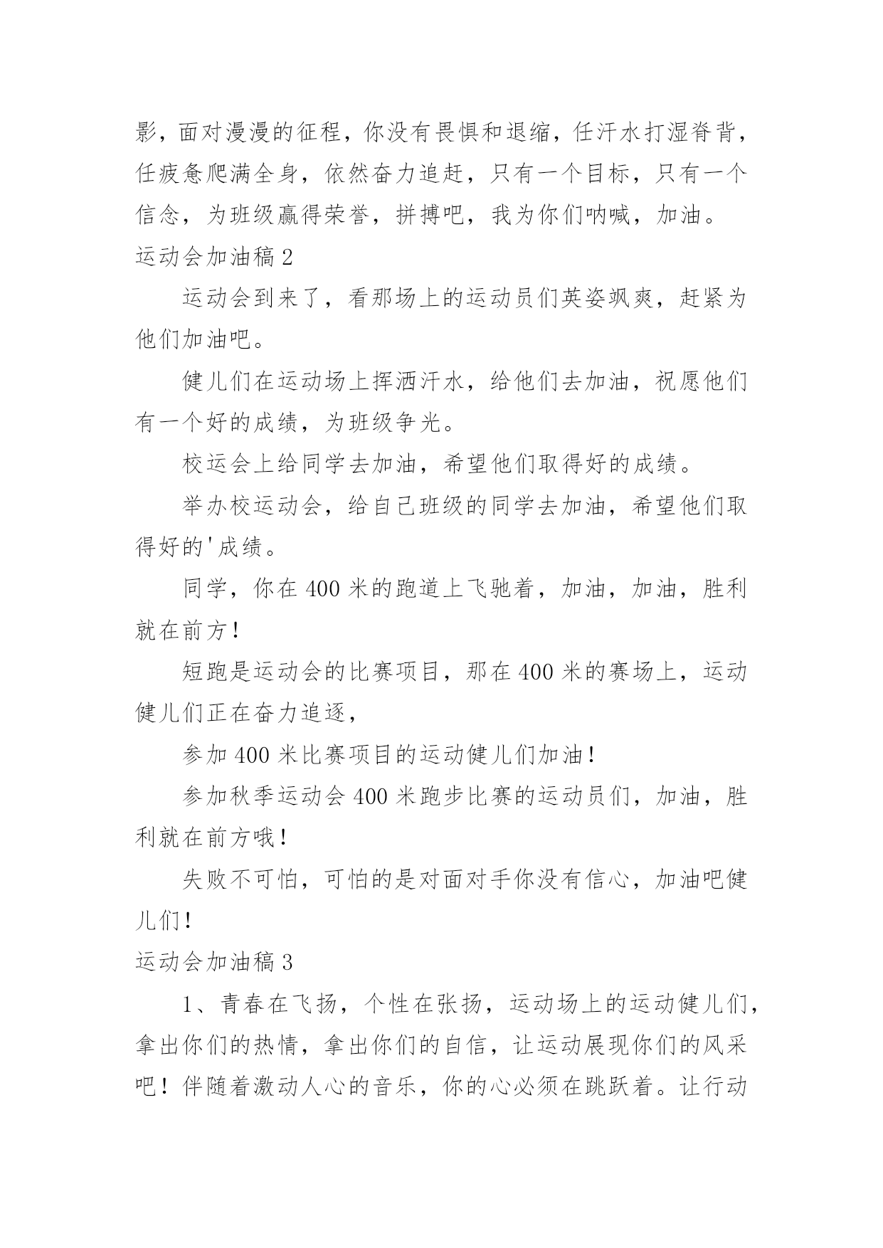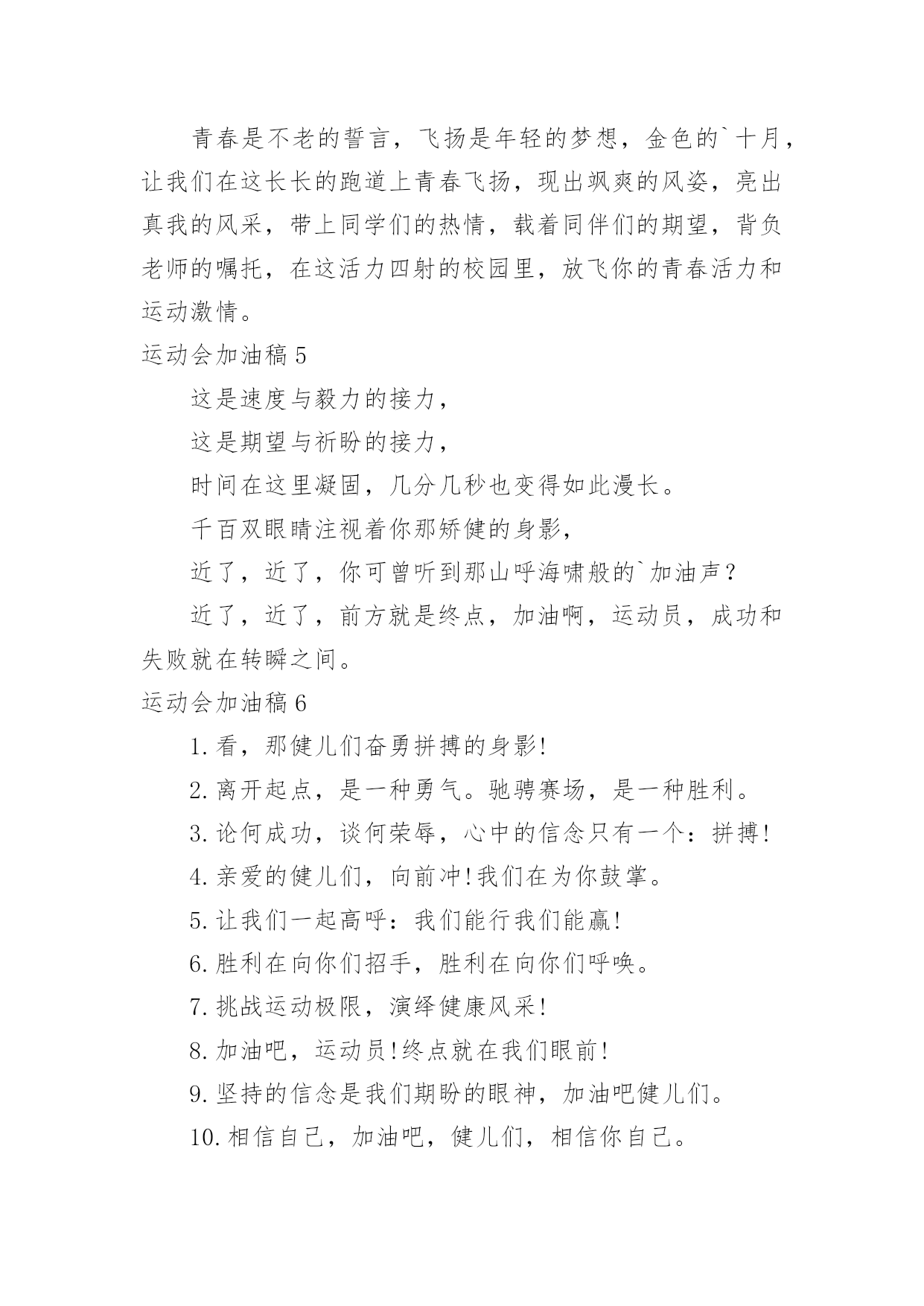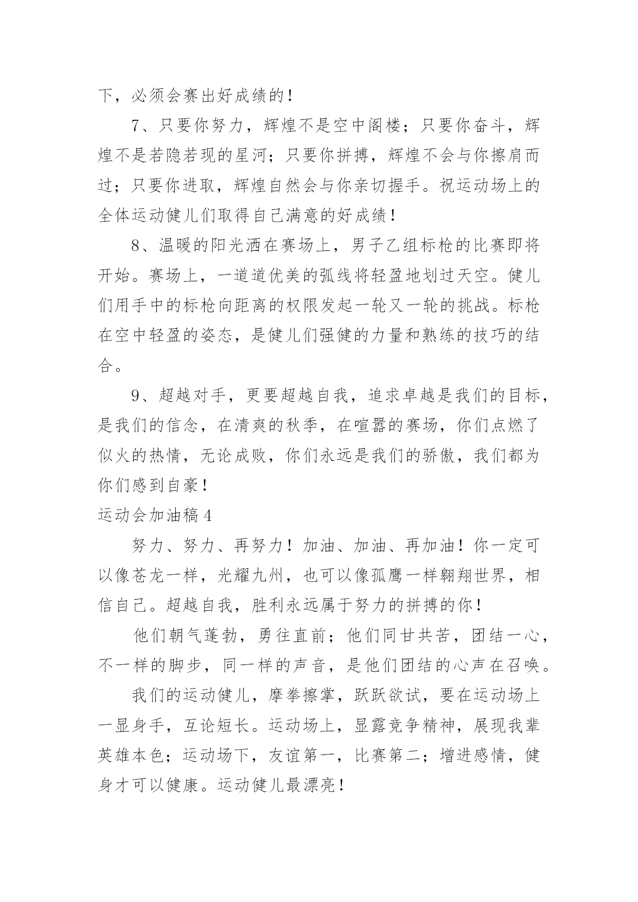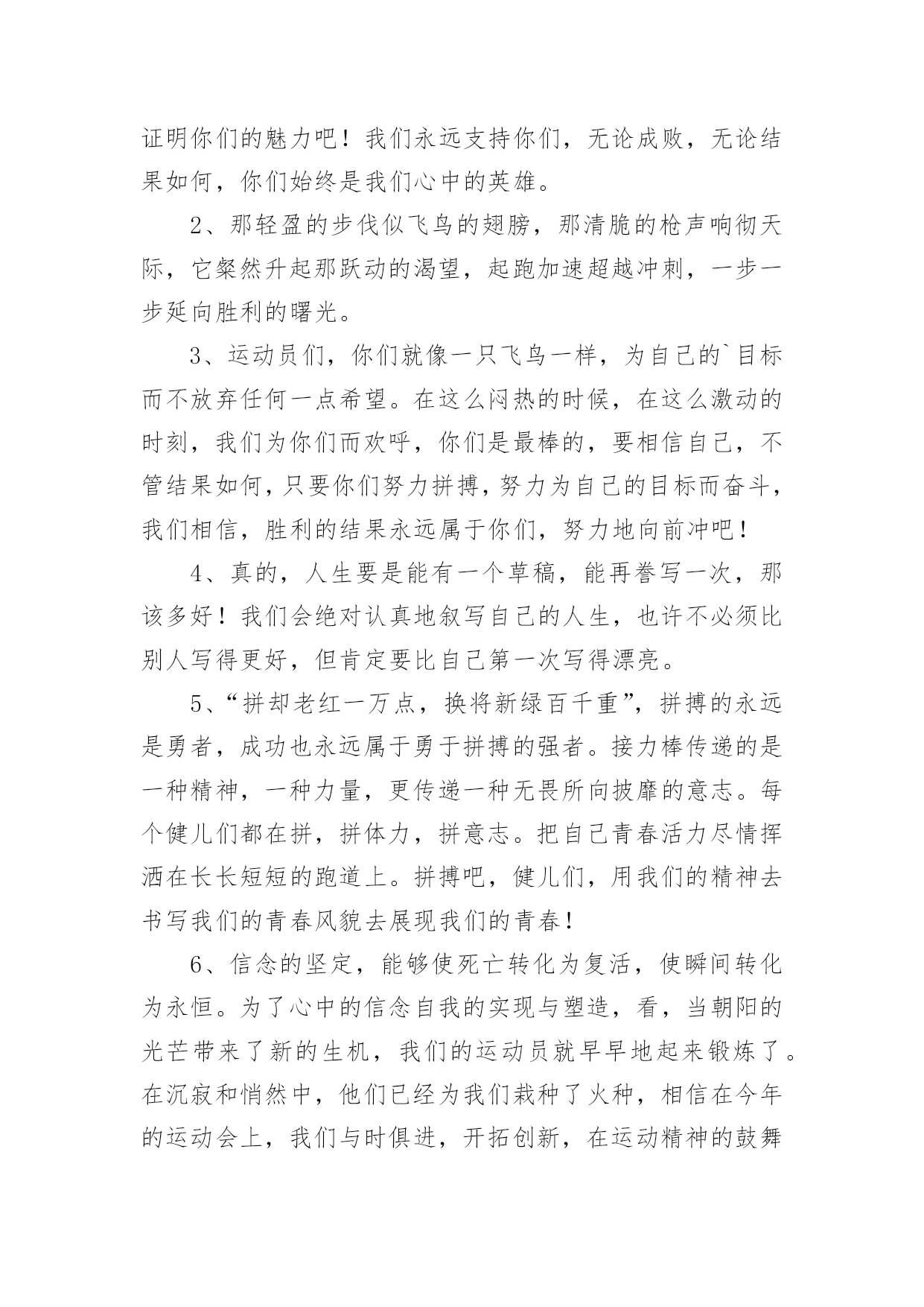 运动会加油稿运动会加油稿在社会发展不断提速的今天,越来越多地方需要用到加油稿,借助加油稿可以激起人的希望,催人奋进。还是对加油稿一筹莫展吗?以下是小编收集整理的运动会加油稿,希望能够帮助到大家。运动会加油稿1晨风轻轻地唤醒骄阳,校园的操场传来发令枪的声响,彩旗与呐喊声一起在飘荡着,心和起点紧紧的相连,用青春和热血来铺洒白色的跑道,用激情点燃胜利的曙光。倒下的时候,生命又怎能屹立!歪歪斜斜的.身影,又怎耐的住风雨的洗礼。你若有一个不屈的灵魂,脚下才会有一方坚实的土地。昨日的失败已经过去,胜利不仅仅是一个完美的话题。泰戈尔在诗中说,天空没有翅膀的影子,但我已飞过;艾青对朋友说,也许有人到达不了彼岸,但我们共同拥有大海。也许你们没有显赫的成绩,但运动场上留下了你们的足迹。也许你们没有奖品,但我们心中留下了你们拼搏的身影。所有的努力都是为了迎接这一刹那,所有的拼搏都是为了这一声令下。运动场上有你们的飒爽英姿,运动场上有你们拼搏的身影,面对漫漫的征程,你没有畏惧和退缩,任汗水打湿脊背,任疲惫爬满全身,依然奋力追赶,只有一个目标,只有一个信念,为班级赢得荣誉,拼搏吧,我为你们呐喊,加油。运动会加油稿2运动会到来了,看那场上的运动员们英姿飒爽,赶紧为他们加油吧。健儿们在运动场上挥洒汗水,给他们去加油,祝愿他们有一个好的成绩,为班级争光。校运会上给同学去加油,希望他们取得好的成绩。举办校运动会,给自己班级的同学去加油,希望他们取得好的'成绩。同学,你在400米的跑道上飞驰着,加油,加油,胜利就在前方!短跑是运动会的比赛项目,那在400米的赛场上,运动健儿们正在奋力追逐,参加400米比赛项目的运动健儿们加油!参加秋季运动会400米跑步比赛的运动员们,加油,胜利就在前方哦!失败不可怕,可怕的是对面对手你没有信心,加油吧健儿们!运动会加油稿31、青春在飞扬,个性在张扬,运动场上的运动健儿们,拿出你们的热情,拿出你们的自信,让运动展现你们的风采吧!伴随着激动人心的音乐,你的心必须在跳跃着。让行动证明你们的魅力吧!我们永远支持你们,无论成败,无论结果如何,你们始终是我们心中的英雄。2、那轻盈的步伐似飞鸟的翅膀,那清脆的枪声响彻天际,它粲然升起那跃动的渴望,起跑加速超越冲刺,一步一步延向胜利的曙光。3、运动员们,你们就像一只飞鸟一样,为自己的`目标而不放弃任何一点希望。在这么闷热的时候,在这么激动的时刻,我们为你们而欢呼,你们是最棒的,要相信自己,不管结果如何,只要你们努力拼搏,努力为自己的目标而奋斗,我们相信,胜利的结果永远属于你们,努力地向前冲吧!4、真的,人生要是能有一个草稿,能再誊写一次,那该多好!我们会绝对认真地叙写自己的人生,也许不必须比别人写得更好,但肯定要比自己第一次写得漂亮。5、“拼却老红一万点,换将新绿百千重”,拼搏的永远是勇者,成功也永远属于勇于拼搏的强者。接力棒传递的是一种精神,一种力量,更传递一种无畏所向披靡的意志。每个健儿们都在拼,拼体力,拼意志。把自己青春活力尽情挥洒在长长短短的跑道上。拼搏吧,健儿们,用我们的精神去书写我们的青春风貌去展现我们的青春!6、信念的坚定,能够使死亡转化为复活,使瞬间转化为永恒。为了心中的信念自我的实现与塑造,看,当朝阳的光芒带来了新的生机,我们的运动员就早早地起来锻炼了。在沉寂和悄然中,他们已经为我们栽种了火种,相信在今年的运动会上,我们与时俱进,开拓创新,在运动精神的鼓舞下,必须会赛出好成绩的!7、只要你努力,辉煌不是空中阁楼;只要你奋斗,辉煌不是若隐若现的星河;只要你拼搏,辉煌不会与你擦肩而过;只要你进取,辉煌自然会与你亲切握手。祝运动场上的全体运动健儿们取得自己满意的好成绩!8、温暖的阳光洒在赛场上,男子乙组标枪的比赛即将开始。赛场上,一道道优美的弧线将轻盈地划过天空。健儿们用手中的标枪向距离的权限发起一轮又一轮的挑战。标枪在空中轻盈的姿态,是健儿们强健的力量和熟练的技巧的结合。9、超越对手,更要超越自我,追求卓越是我们的目标,是我们的信念,在清爽的秋季,在喧嚣的赛场,你们点燃了似火的热情,无论成败,你们永远是我们的骄傲,我们都为你们感到自豪!运动会加油稿4努力、努力、再努力!加油、加油、再加油!你一定可以像苍龙一样,光耀九州,也可以像孤鹰一样翱翔世界,相信自己。超越自我,胜利永远属于努力的拼搏的你!他们朝气蓬勃,勇往直前;他们同甘共苦,团结一心,不一样的脚步,同一样的声音,是他们团结的心声在召唤。我们的运动健儿,摩拳擦掌,跃跃欲试,要在运动场上一显身手,互论短长。运动场上,显露竞争精神,展现我辈英雄本色;运动场下,友谊第一,比赛第二;增进感情,健身才可以健康。运动健儿最漂亮!青春是不老的誓言,飞扬是年轻的梦想,金色的`十月,让我们在这长长的跑道上青春飞扬,现出飒爽的风姿,亮出真我的风