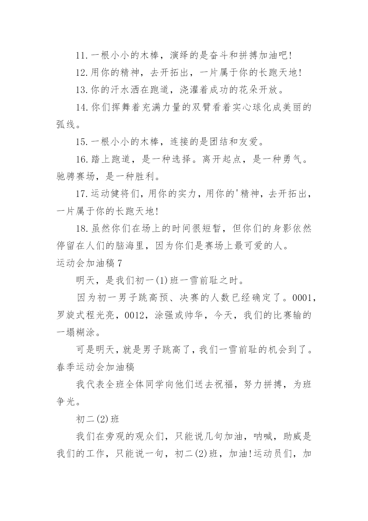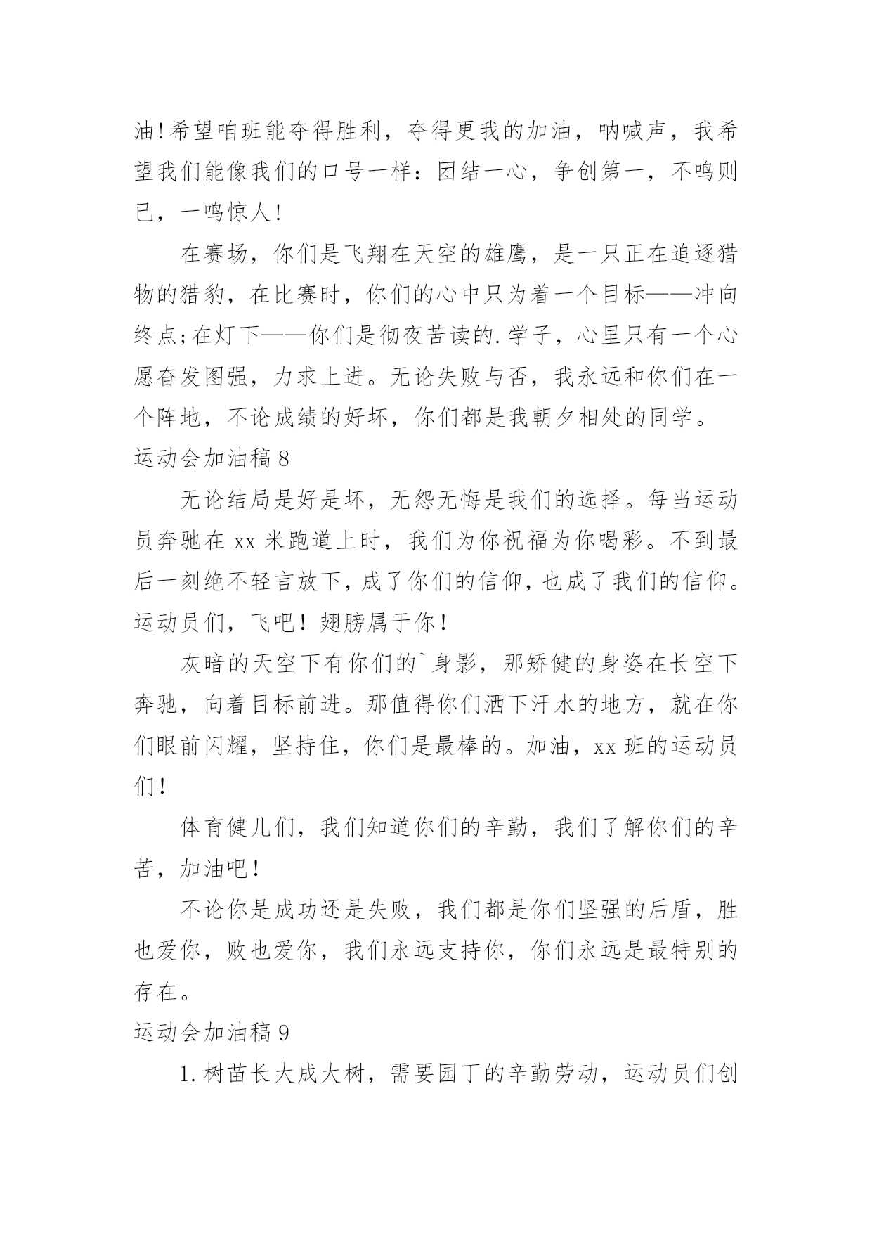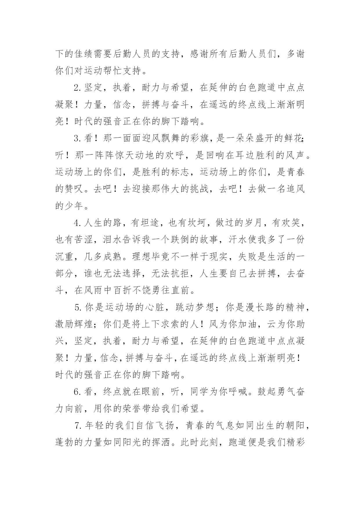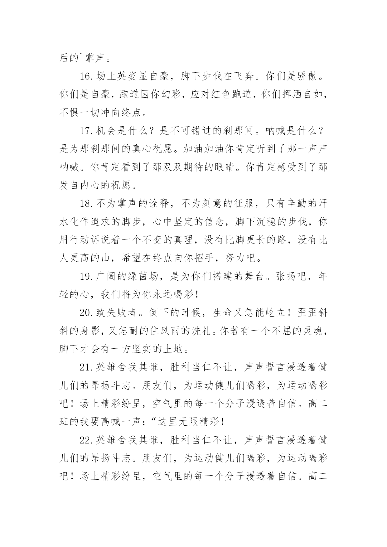 运动会加油稿运动会加油稿在社会发展不断提速的今天,越来越多地方需要用到加油稿,借助加油稿可以激起人的希望,催人奋进。还是对加油稿一筹莫展吗?以下是小编收集整理的运动会加油稿,希望能够帮助到大家。运动会加油稿1晨风轻轻地唤醒骄阳,校园的操场传来发令枪的声响,彩旗与呐喊声一起在飘荡着,心和起点紧紧的相连,用青春和热血来铺洒白色的跑道,用激情点燃胜利的曙光。倒下的时候,生命又怎能屹立!歪歪斜斜的.身影,又怎耐的住风雨的洗礼。你若有一个不屈的灵魂,脚下才会有一方坚实的土地。昨日的失败已经过去,胜利不仅仅是一个完美的话题。泰戈尔在诗中说,天空没有翅膀的影子,但我已飞过;艾青对朋友说,也许有人到达不了彼岸,但我们共同拥有大海。也许你们没有显赫的成绩,但运动场上留下了你们的足迹。也许你们没有奖品,但我们心中留下了你们拼搏的身影。所有的努力都是为了迎接这一刹那,所有的拼搏都是为了这一声令下。运动场上有你们的飒爽英姿,运动场上有你们拼搏的身影,面对漫漫的征程,你没有畏惧和退缩,任汗水打湿脊背,任疲惫爬满全身,依然奋力追赶,只有一个目标,只有一个信念,为班级赢得荣誉,拼搏吧,我为你们呐喊,加油。运动会加油稿2运动会到来了,看那场上的运动员们英姿飒爽,赶紧为他们加油吧。健儿们在运动场上挥洒汗水,给他们去加油,祝愿他们有一个好的成绩,为班级争光。校运会上给同学去加油,希望他们取得好的成绩。举办校运动会,给自己班级的同学去加油,希望他们取得好的'成绩。同学,你在400米的跑道上飞驰着,加油,加油,胜利就在前方!短跑是运动会的比赛项目,那在400米的赛场上,运动健儿们正在奋力追逐,参加400米比赛项目的运动健儿们加油!参加秋季运动会400米跑步比赛的运动员们,加油,胜利就在前方哦!失败不可怕,可怕的是对面对手你没有信心,加油吧健儿们!运动会加油稿31、青春在飞扬,个性在张扬,运动场上的运动健儿们,拿出你们的热情,拿出你们的自信,让运动展现你们的风采吧!伴随着激动人心的音乐,你的心必须在跳跃着。让行动证明你们的魅力吧!我们永远支持你们,无论成败,无论结果如何,你们始终是我们心中的英雄。2、那轻盈的步伐似飞鸟的翅膀,那清脆的枪声响彻天际,它粲然升起那跃动的渴望,起跑加速超越冲刺,一步一步延向胜利的曙光。3、运动员们,你们就像一只飞鸟一样,为自己的`目标而不放弃任何一点希望。在这么闷热的时候,在这么激动的时刻,我们为你们而欢呼,你们是最棒的,要相信自己,不管结果如何,只要你们努力拼搏,努力为自己的目标而奋斗,我们相信,胜利的结果永远属于你们,努力地向前冲吧!4、真的,人生要是能有一个草稿,能再誊写一次,那该多好!我们会绝对认真地叙写自己的人生,也许不必须比别人写得更好,但肯定要比自己第一次写得漂亮。5、“拼却老红一万点,换将新绿百千重”,拼搏的永远是勇者,成功也永远属于勇于拼搏的强者。接力棒传递的是一种精神,一种力量,更传递一种无畏所向披靡的意志。每个健儿们都在拼,拼体力,拼意志。把自己青春活力尽情挥洒在长长短短的跑道上。拼搏吧,健儿们,用我们的精神去书写我们的青春风貌去展现我们的青春!6、信念的坚定,能够使死亡转化为复活,使瞬间转化为永恒。为了心中的信念自我的实现与塑造,看,当朝阳的光芒带来了新的生机,我们的运动员就早早地起来锻炼了。在沉寂和悄然中,他们已经为我们栽种了火种,相信在今年的运动会上,我们与时俱进,开拓创新,在运动精神的鼓舞下,必须会赛出好成绩的!7、只要你努力,辉煌不是空中阁楼;只要你奋斗,辉煌不是若隐若现的星河;只要你拼搏,辉煌不会与你擦肩而过;只要你进取,辉煌自然会与你亲切握手。祝运动场上的全体运动健儿们取得自己满意的好成绩!8、温暖的阳光洒在赛场上,男子乙组标枪的比赛即将开始。赛场上,一道道优美的弧线将轻盈地划过天空。健儿们用手中的标枪向距离的权限发起一轮又一轮的挑战。标枪在空中轻盈的姿态,是健儿们强健的力量和熟练的技巧的结合。9、超越对手,更要超越自我,追求卓越是我们的目标,是我们的信念,在清爽的秋季,在喧嚣的赛场,你们点燃了似火的热情,无论成败,你们永远是我们的骄傲,我们都为你们感到自豪!运动会加油稿4努力、努力、再努力!加油、加油、再加油!你一定可以像苍龙一样,光耀九州,也可以像孤鹰一样翱翔世界,相信自己。超越自我,胜利永远属于努力的拼搏的你!他们朝气蓬勃,勇往直前;他们同甘共苦,团结一心,不一样的脚步,同一样的声音,是他们团结的心声在召唤。我们的运动健儿,摩拳擦掌,跃跃欲试,要在运动场上一显身手,互论短长。运动场上,显露竞争精神,展现我辈英雄本色;运动场下,友谊第一,比赛第二;增进感情,健身才可以健康。运动健儿最漂亮!青春是不老的誓言,飞扬是年轻的梦想,金色的`十月,让我们在这长长的跑道上青春飞扬,现出飒爽的风姿,亮出真我的风