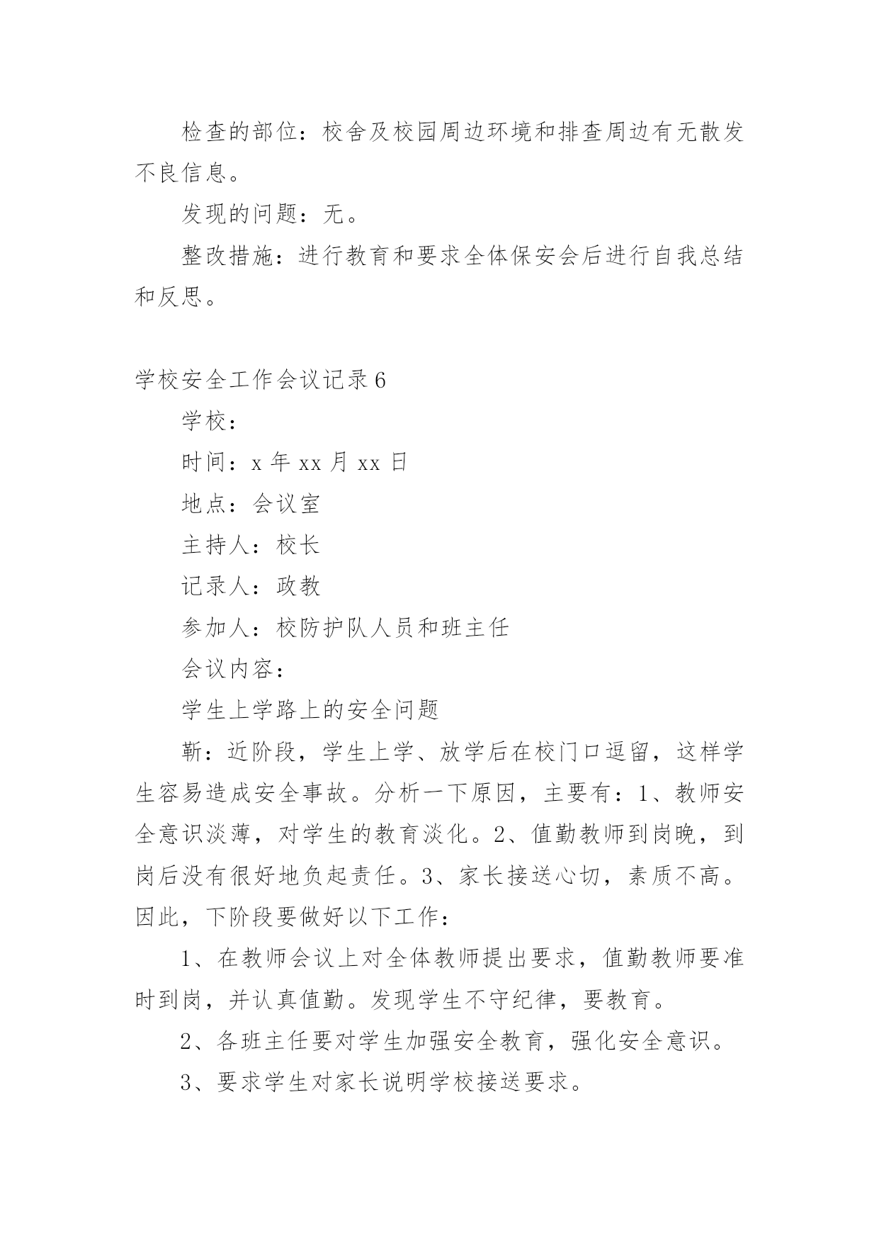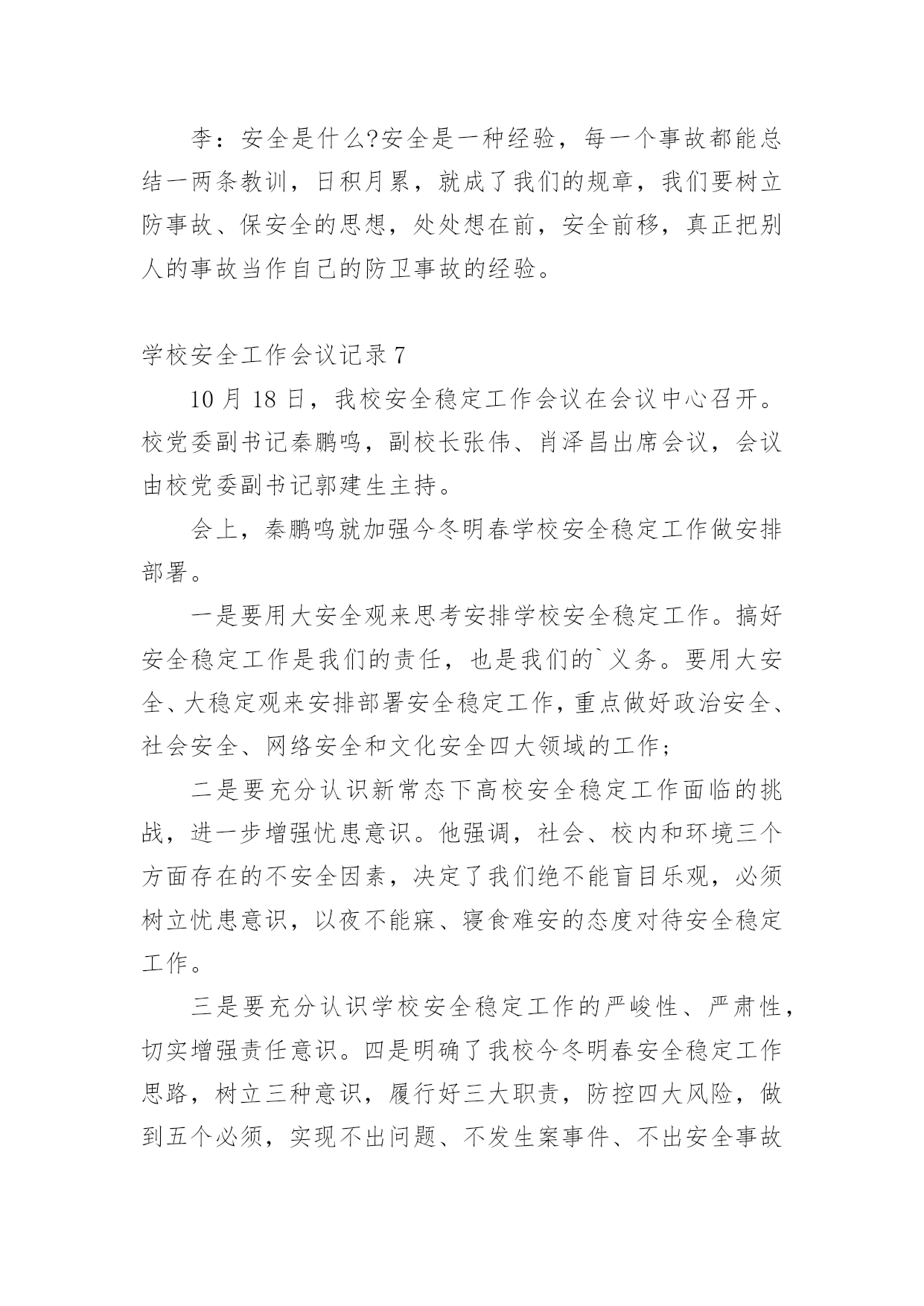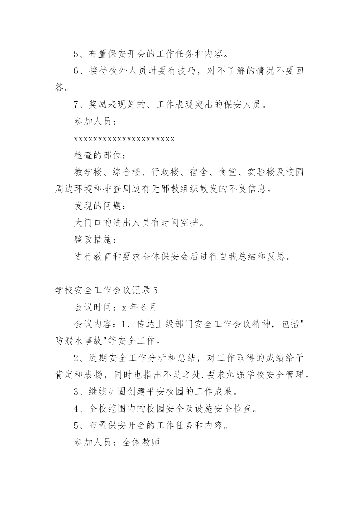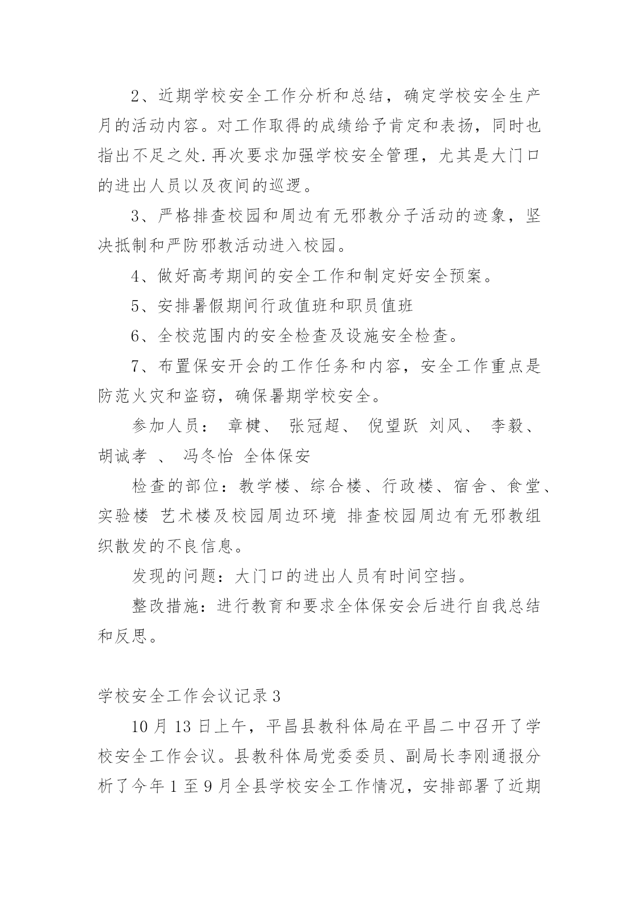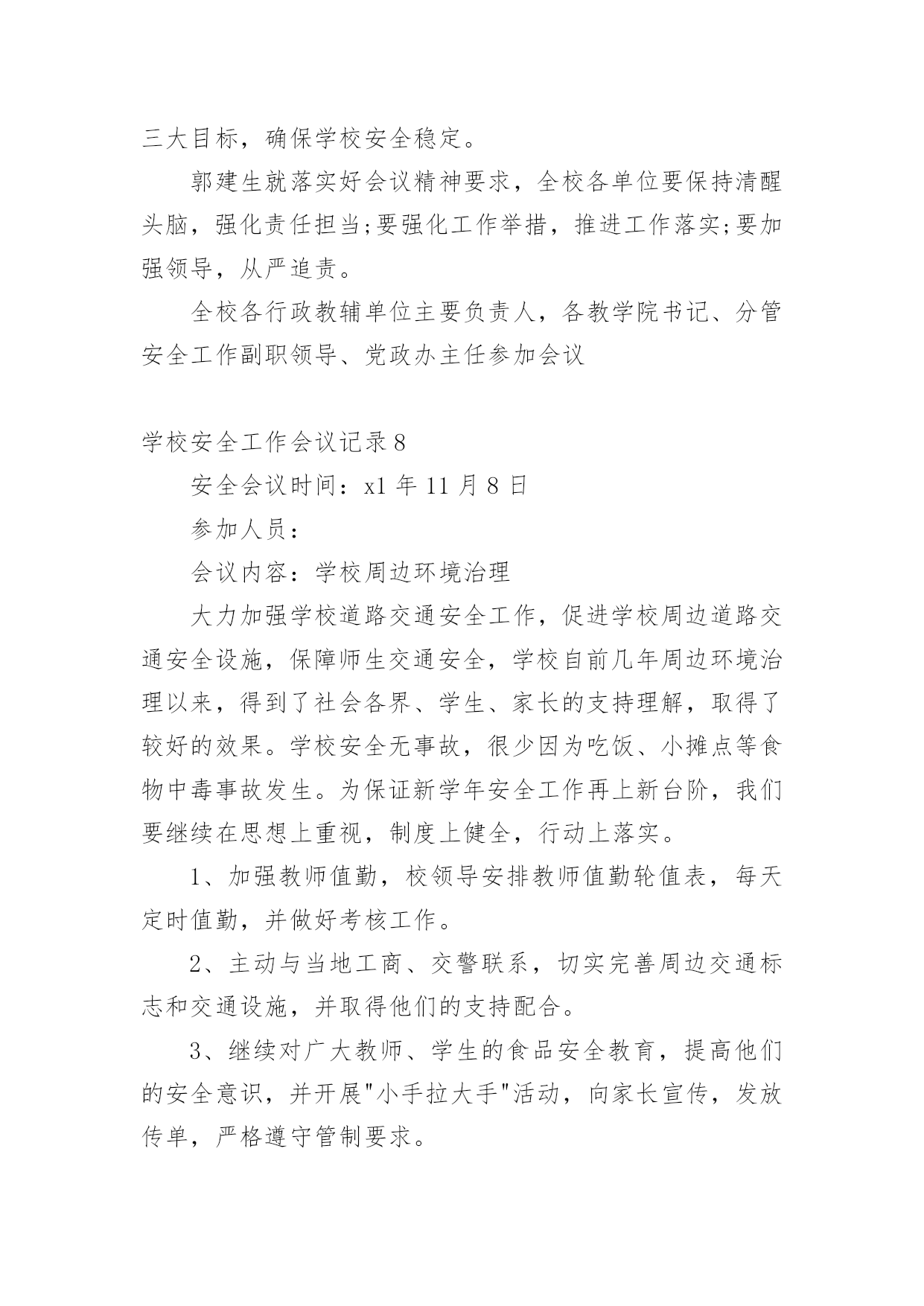 学校安全工作会议记录学校安全工作会议记录1安全会议时间:20xx年3月5日会议地点:学校会议室会议记录员:何春燕会议内容:1、传达县教育局和镇中心小学的安全会议精神和要求。近期学校安全工作分析,制定和落实相应的安全工作。2、要求学校教师加强班级管理,严格纪律,杜绝各种伤害事故的发生。3、要求教师加强对学生进行防交通、防溺水,防食物中毒,防传染病等各种安全教育。4、安排对正分校校舍进行检查的教师。5、组织教师学习《学校体育工作条例》。学校安全工作会议记录2安全会议时间:20xx年6月会议内容:1、传达杭州市教育局安全工作会议精神和要求,确定学校安全工作重心为维稳工作。2、近期学校安全工作分析和总结,确定学校安全生产月的活动内容。对工作取得的成绩给予肯定和表扬,同时也指出不足之处.再次要求加强学校安全管理,尤其是大门口的进出人员以及夜间的巡逻。3、严格排查校园和周边有无邪教分子活动的迹象,坚决抵制和严防邪教活动进入校园。4、做好高考期间的安全工作和制定好安全预案。5、安排暑假期间行政值班和职员值班6、全校范围内的安全检查及设施安全检查。7、布置保安开会的工作任务和内容,安全工作重点是防范火灾和盗窃,确保暑期学校安全。参加人员:章楗、张冠超、倪望跃刘风、李毅、胡诚孝、冯冬怡全体保安检查的部位:教学楼、综合楼、行政楼、宿舍、食堂、实验楼艺术楼及校园周边环境排查校园周边有无邪教组织散发的不良信息。发现的问题:大门口的进出人员有时间空挡。整改措施:进行教育和要求全体保安会后进行自我总结和反思。学校安全工作会议记录310月13日上午,平昌县教科体局在平昌二中召开了学校安全工作会议。县教科体局党委委员、副局长李刚通报分析了今年1至9月全县学校安全工作情况,安排部署了近期及今后的学校安全工作。会议指出,全县各级各类学校的安全风险意识和责任意识进一步增强,基础管理工作更加落实,学校安全工作的总体形势较好;学生安全事故较之去年同期呈下降趋势,但学生课间休息或活动期间伤害事故仍然处于多发频发的状态,充分暴露了学校安全管理工作中的薄弱环节。会议要求,各校必须持续抓好以下四个方面的安全工作:持续抓好校园及周边隐患排查整治工作;持续抓好学生安全行为习惯的养成教育;持续抓好学生交通安全及校车安全管理;持续抓好师生风险防控管理工作。各片区督导站站长、中小学校长、民办学校负责人、江口示范幼儿园和民办幼儿园园长参加了会议。学校安全工作会议记录4安全会议时间:xxxx年xx月会议内容:1、传达上级部门安全工作会议精神,包括“防潮水事故”、国庆期间的安全工作等。2、近期安全工作分析和总结,对工作取得的成绩给予肯定和表扬,同时也指出不足之处.要求加强学校安全管理,尤其是大门口的进出人员以及夜间的巡逻。3、继续巩固创建平安校园的工作成果。4、全校范围内的校园安全及设施安全检查。5、布置保安开会的工作任务和内容。6、接待校外人员时要有技巧,对不了解的情况不要回答。7、奖励表现好的、工作表现突出的保安人员。参加人员:xxxxxxxxxxxxxxxxxxxxx检查的部位:教学楼、综合楼、行政楼、宿舍、食堂、实验楼及校园周边环境和排查周边有无邪教组织散发的不良信息。发现的问题:大门口的进出人员有时间空挡。整改措施:进行教育和要求全体保安会后进行自我总结和反思。学校安全工作会议记录5会议时间:x年6月会议内容:1、传达上级部门安全工作会议精神,包括"防溺水事故"等安全工作。2、近期安全工作分析和总结,对工作取得的成绩给予肯定和表扬,同时也指出不足之处.要求加强学校安全管理。3、继续巩固创建平安校园的工作成果。4、全校范围内的校园安全及设施安全检查。5、布置保安开会的工作任务和内容。参加人员:全体教师检查的部位:校舍及校园周边环境和排查周边有无散发不良信息。发现的问题:无。整改措施:进行教育和要求全体保安会后进行自我总结和反思。学校安全工作会议记录6学校:时间:x年xx月xx日地点:会议室主持人:校长记录人:政教参加人:校防护队人员和班主任会议内容:学生上学路上的安全问题靳:近阶段,学生上学、放学后在校门口逗留,这样学生容易造成安全事故。分析一下原因,主要有:1、教师安全意识淡薄,对学生的教育淡化。2、值勤教师到岗晚,到岗后没有很好地负起责任。3、家长接送心切,素质不高。因此,下阶段要做好以下工作:1、在教师会议上对全体教师提出要求,值勤教师要准时到岗,并认真值勤。发现学生不守纪律,要教育。2、各班主任要对学生加强安全教育,强化安全意识。3、要求学生对家长说明学校接送要求。李:安全是什么?安全是一种经验,每一个事故都能总结一两条教训,日积月累,就成了我们的规章,我们要树立防事故、保安全的思想,处处想在前,安全前移,真正把别人的事故当作自己的防卫事故的经验。学校安全工作会议记录71