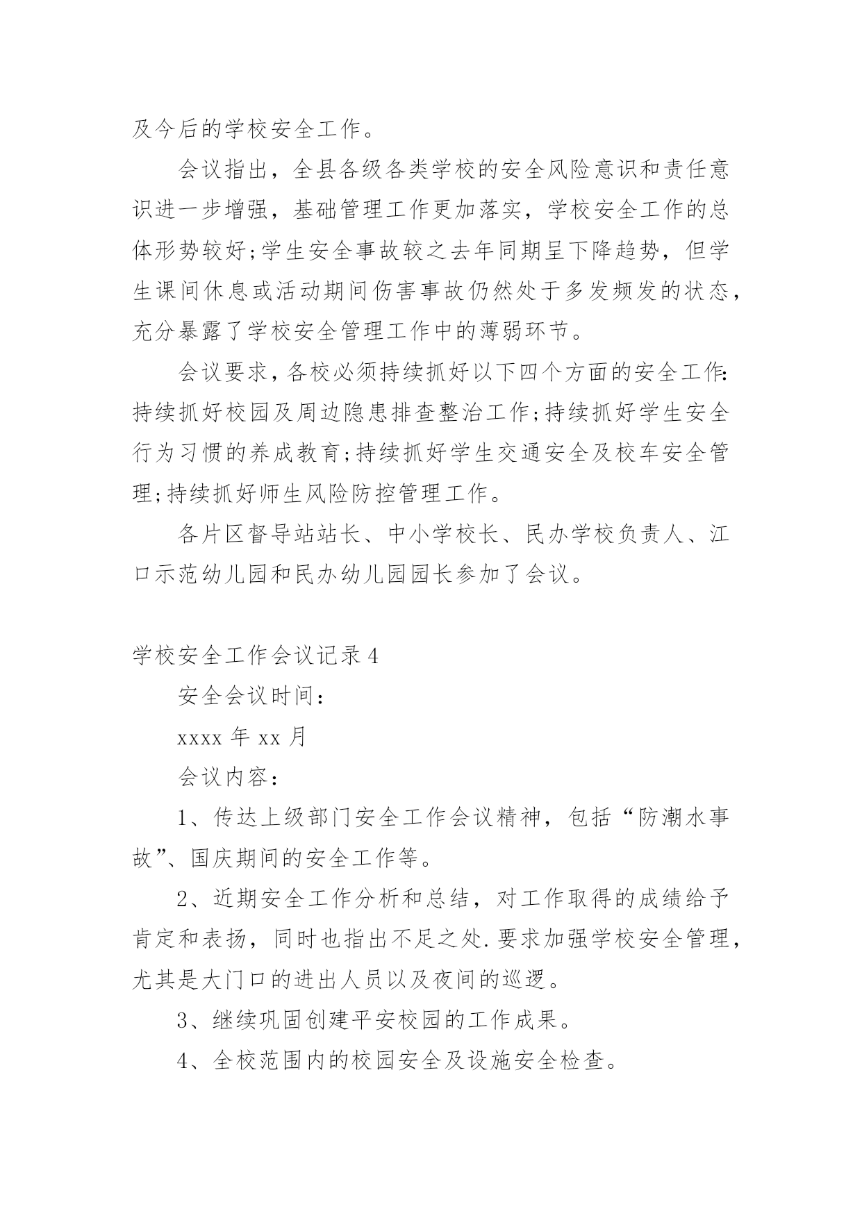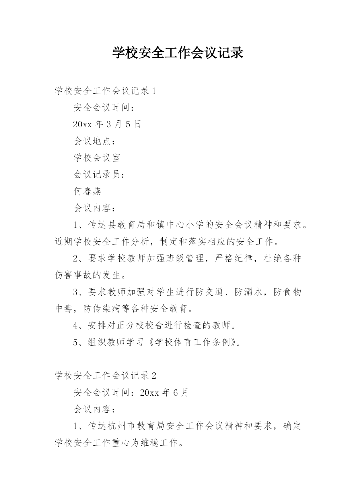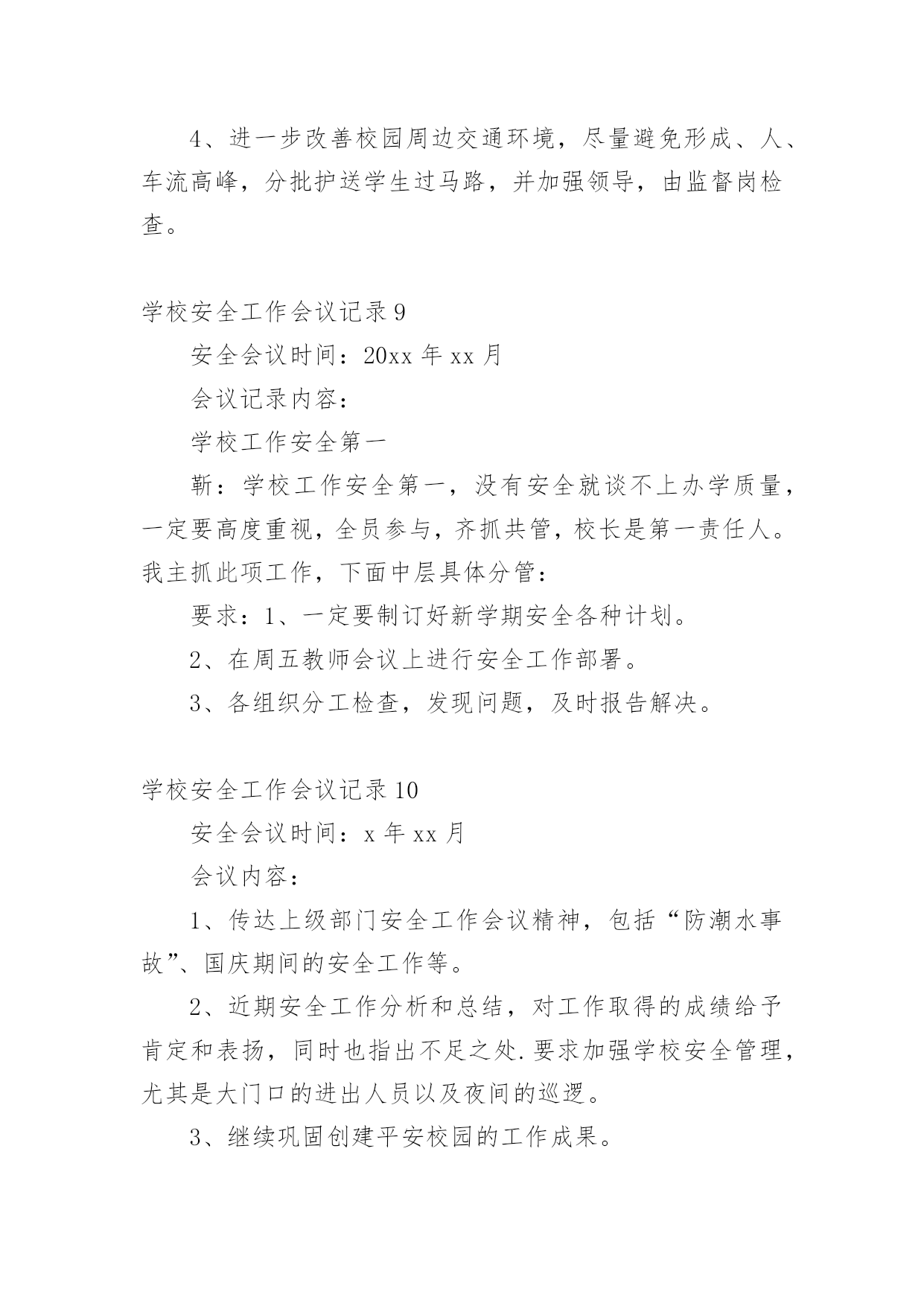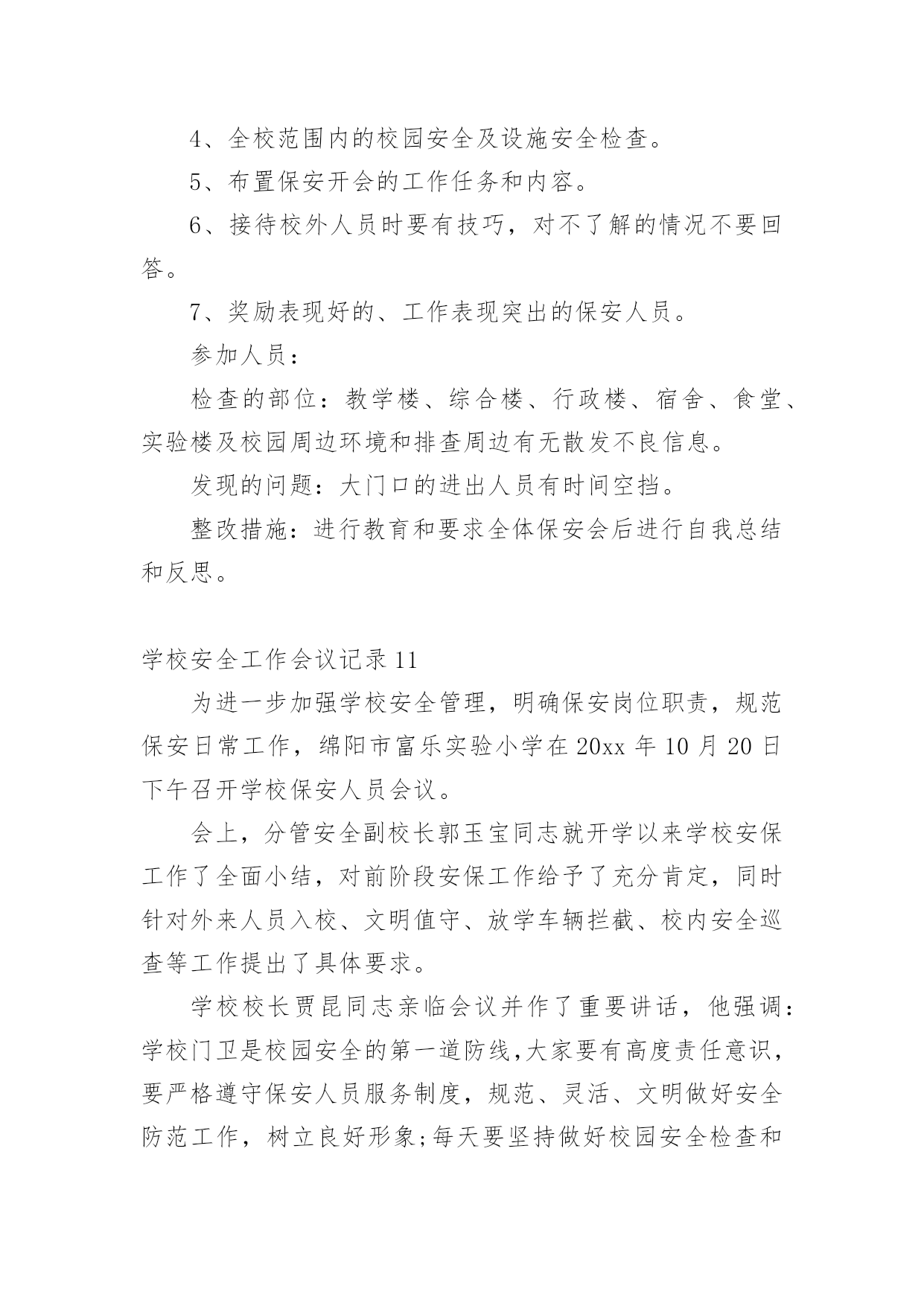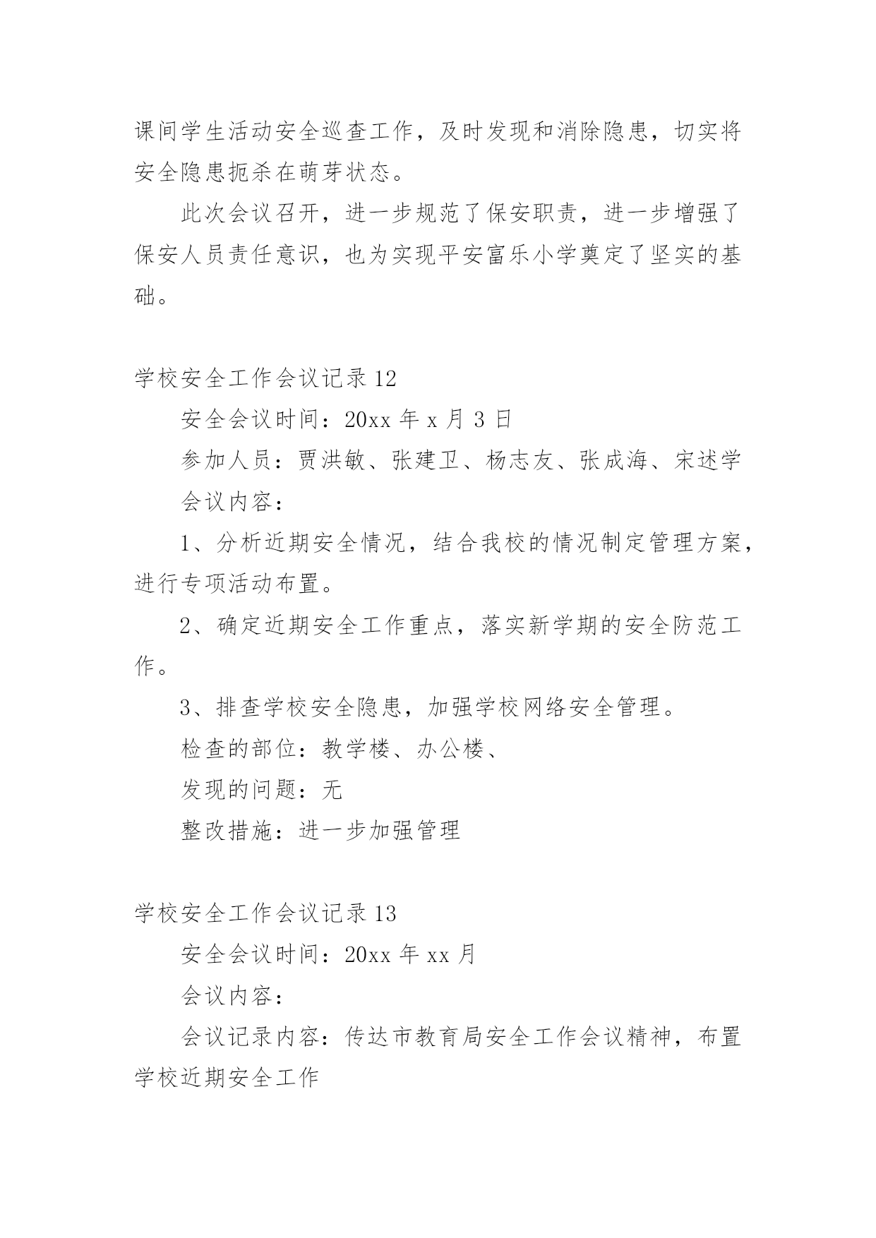 学校安全工作会议记录学校安全工作会议记录1安全会议时间:20xx年3月5日会议地点:学校会议室会议记录员:何春燕会议内容:1、传达县教育局和镇中心小学的安全会议精神和要求。近期学校安全工作分析,制定和落实相应的安全工作。2、要求学校教师加强班级管理,严格纪律,杜绝各种伤害事故的发生。3、要求教师加强对学生进行防交通、防溺水,防食物中毒,防传染病等各种安全教育。4、安排对正分校校舍进行检查的教师。5、组织教师学习《学校体育工作条例》。学校安全工作会议记录2安全会议时间:20xx年6月会议内容:1、传达杭州市教育局安全工作会议精神和要求,确定学校安全工作重心为维稳工作。2、近期学校安全工作分析和总结,确定学校安全生产月的活动内容。对工作取得的成绩给予肯定和表扬,同时也指出不足之处.再次要求加强学校安全管理,尤其是大门口的进出人员以及夜间的巡逻。3、严格排查校园和周边有无邪教分子活动的迹象,坚决抵制和严防邪教活动进入校园。4、做好高考期间的安全工作和制定好安全预案。5、安排暑假期间行政值班和职员值班6、全校范围内的安全检查及设施安全检查。7、布置保安开会的工作任务和内容,安全工作重点是防范火灾和盗窃,确保暑期学校安全。参加人员:章楗、张冠超、倪望跃刘风、李毅、胡诚孝、冯冬怡全体保安检查的部位:教学楼、综合楼、行政楼、宿舍、食堂、实验楼艺术楼及校园周边环境排查校园周边有无邪教组织散发的不良信息。发现的问题:大门口的进出人员有时间空挡。整改措施:进行教育和要求全体保安会后进行自我总结和反思。学校安全工作会议记录310月13日上午,平昌县教科体局在平昌二中召开了学校安全工作会议。县教科体局党委委员、副局长李刚通报分析了今年1至9月全县学校安全工作情况,安排部署了近期及今后的学校安全工作。会议指出,全县各级各类学校的安全风险意识和责任意识进一步增强,基础管理工作更加落实,学校安全工作的总体形势较好;学生安全事故较之去年同期呈下降趋势,但学生课间休息或活动期间伤害事故仍然处于多发频发的状态,充分暴露了学校安全管理工作中的薄弱环节。会议要求,各校必须持续抓好以下四个方面的安全工作:持续抓好校园及周边隐患排查整治工作;持续抓好学生安全行为习惯的养成教育;持续抓好学生交通安全及校车安全管理;持续抓好师生风险防控管理工作。各片区督导站站长、中小学校长、民办学校负责人、江口示范幼儿园和民办幼儿园园长参加了会议。学校安全工作会议记录4安全会议时间:xxxx年xx月会议内容:1、传达上级部门安全工作会议精神,包括“防潮水事故”、国庆期间的安全工作等。2、近期安全工作分析和总结,对工作取得的成绩给予肯定和表扬,同时也指出不足之处.要求加强学校安全管理,尤其是大门口的进出人员以及夜间的巡逻。3、继续巩固创建平安校园的工作成果。4、全校范围内的校园安全及设施安全检查。5、布置保安开会的工作任务和内容。6、接待校外人员时要有技巧,对不了解的情况不要回答。7、奖励表现好的、工作表现突出的保安人员。参加人员:xxxxxxxxxxxxxxxxxxxxx检查的部位:教学楼、综合楼、行政楼、宿舍、食堂、实验楼及校园周边环境和排查周边有无邪教组织散发的不良信息。发现的问题:大门口的进出人员有时间空挡。整改措施:进行教育和要求全体保安会后进行自我总结和反思。学校安全工作会议记录5会议时间:x年6月会议内容:1、传达上级部门安全工作会议精神,包括"防溺水事故"等安全工作。2、近期安全工作分析和总结,对工作取得的成绩给予肯定和表扬,同时也指出不足之处.要求加强学校安全管理。3、继续巩固创建平安校园的工作成果。4、全校范围内的校园安全及设施安全检查。5、布置保安开会的工作任务和内容。参加人员:全体教师检查的部位:校舍及校园周边环境和排查周边有无散发不良信息。发现的问题:无。整改措施:进行教育和要求全体保安会后进行自我总结和反思。学校安全工作会议记录6学校:时间:x年xx月xx日地点:会议室主持人:校长记录人:政教参加人:校防护队人员和班主任会议内容:学生上学路上的安全问题靳:近阶段,学生上学、放学后在校门口逗留,这样学生容易造成安全事故。分析一下原因,主要有:1、教师安全意识淡薄,对学生的教育淡化。2、值勤教师到岗晚,到岗后没有很好地负起责任。3、家长接送心切,素质不高。因此,下阶段要做好以下工作:1、在教师会议上对全体教师提出要求,值勤教师要准时到岗,并认真值勤。发现学生不守纪律,要教育。2、各班主任要对学生加强安全教育,强化安全意识。3、要求学生对家长说明学校接送要求。李:安全是什么?安全是一种经验,每一个事故都能总结一两条教训,日积月累,就成了我们的规章,我们要树立防事故、保安全的思想,处处想在前,安全前移,真正把别人的事故当作自己的防卫事故的经验。学校安全工作会议记录71