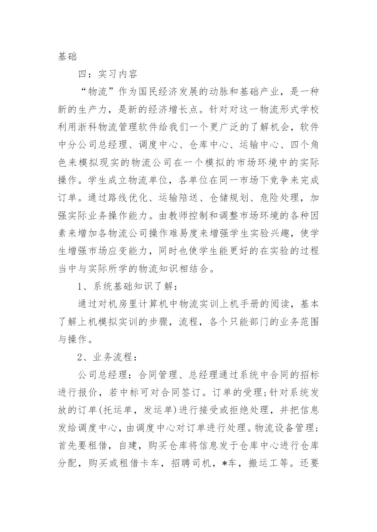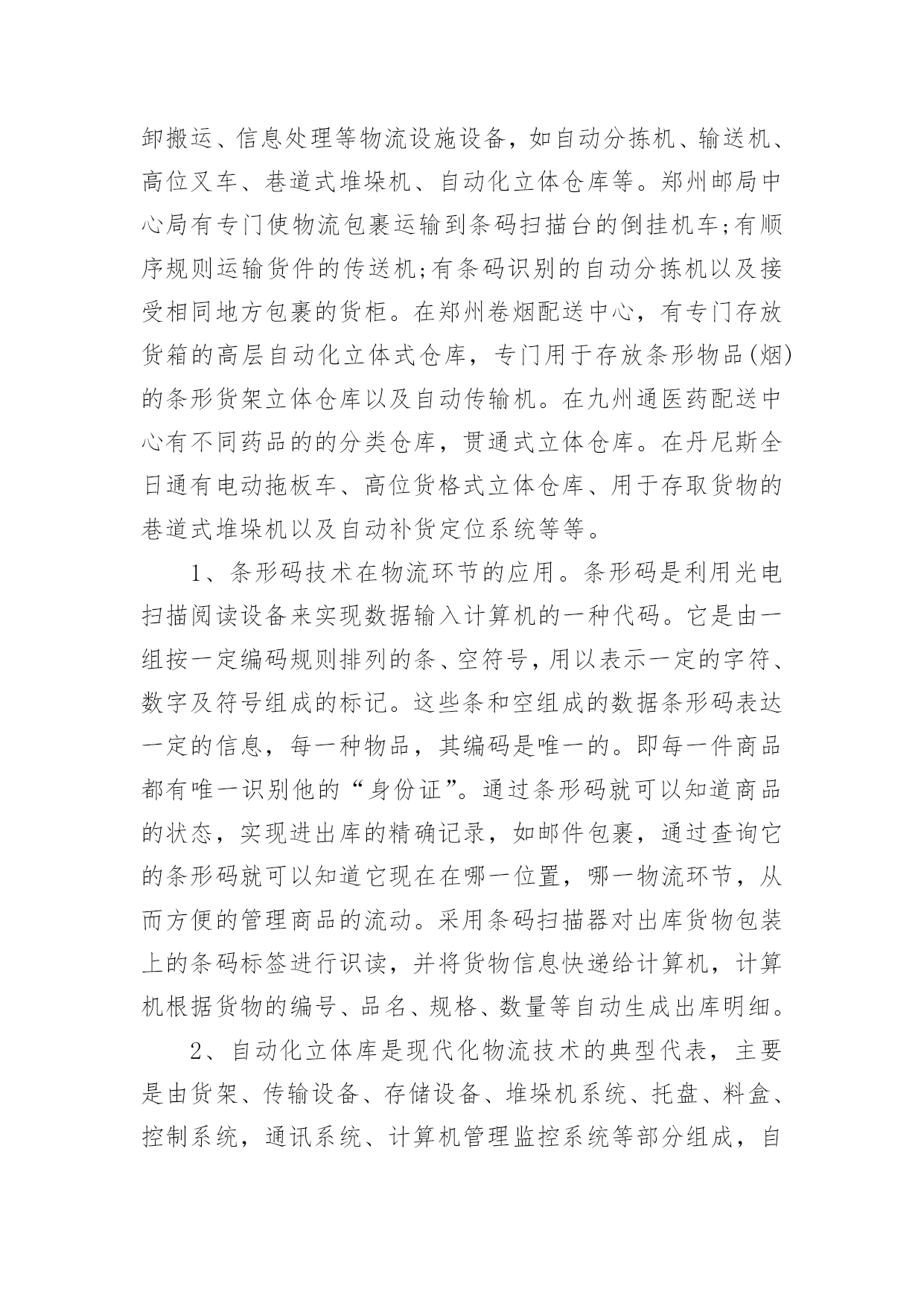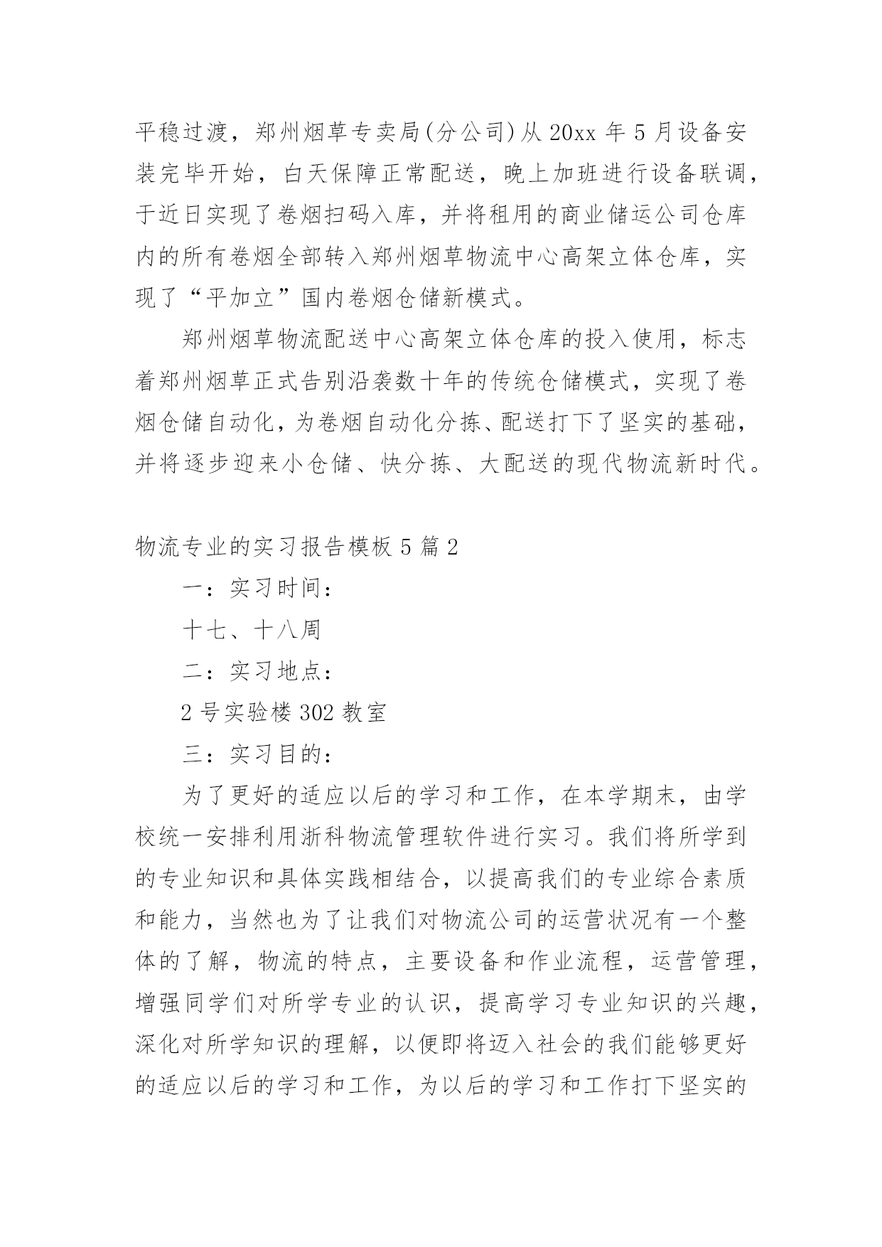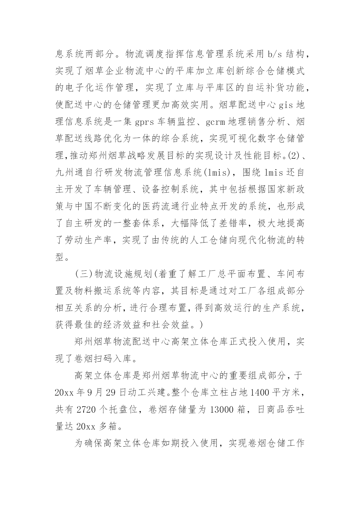 物流专业的实习报告物流专业的实习报告模板5篇在现实生活中,报告与我们愈发关系密切,要注意报告在写作时具有一定的格式。写起报告来就毫无头绪?以下是小编收集整理的物流专业的实习报告模板5篇,欢迎大家借鉴与参考,希望对大家有所帮助。物流专业的实习报告模板5篇1一、认识实习目的物流管理专业的认识实习,是学生在完成教学计划规定的相关专业基础课程后所进行的综合性实习,是课堂教学的延伸和补充,是理论联系实际的重要教学环节。通过到不同企业的参观实习,使物流管理专业学生在理论学习的基础上,能直观地接触实际工作和具体业务,进一步熟悉物流管理的工作内容,了解物流管理运作流程和方法,弥补单纯课堂教学的不足,进一步掌握所学理论,做到理论与实践相结合,提高学生分析和解决实际问题的能力,培养学生合作意识、创新精神和实践能力,为深入学习后续物流专业课程以及将来走上工作岗位打下一定基础。1、通过认识实习,较全面地了解物流实际环节、企业的物流流程,一般的岗位操作技能和方法;2、进一步消化和深化已学到的物流管理知识,并为以后的物流管理专业课程学习作好准备;3、培养发现问题、分析问题、解决具体事物的能力;4、培养理论和实践相结合的能力。二、认识实习基本内容1、宏观层次(1)企业发展基本概况,如企业发展历史、企业家简介、企业定位、企业主要经营范围、企业规模、组织结构、供应链组成和市场竞争状况等。认识实习报告范文。(2)熟悉企业的业务特点、基本工作程序、流转过程,如采购、储存、配货等。(3)企业管理信息系统的使用情况和特点以及相关软件的使用情况。(4)企业文化、客户服务的内容和方式、企业的发展前景。(5)企业现存的问题,结合企业的现实,寻求解决的办法。2、微观层次微观层次的实习分物流业务流程、物流设施设备、物流设施规划三部分。(1)物流业务流程。如订单处理、商品流通、仓储、包装、运输、配送等物流业务,学生根据货物的实际流动用物流系统的相关知识对物流业务流程进行分析。认识实习报告范文。(2)物流设施设备。参观常用的物流运输、储存、分拣、装卸搬运、信息处理等物流设施设备,如货架、起重机、输送机、叉车、堆垛机、托盘、集装箱等,了解简单操作并对工作场合、工作流程、工作要求进行学习和了解。(3)物流设施规划。着重了解工厂总平面布置、车间布置及物料搬运系统等内容,其目标是通过对工厂各组成部分相互关系的分析,进行合理布置,得到高效运行的生产系统,获得最佳的经济效益和社会效益。三、认识实习时间5月3日至5月8日四、认识实习地点郑州邮区中心局:属于国家二级中心局,是全国重要的邮政枢纽,担负着十分重要的邮政通信任务,长期以来,郑州邮区中心局就在全网发挥着举足轻重的作用。它具有邮件分拣封发、邮件接发、邮件运输、报刊分发、邮件容器管理调拨、全省报刊汇总要数等职能,担负着5条火车邮路、7条省际汽车邮路、16条29个班次二级干线邮件运输任务,昼夜接发火车58趟次,汽车108趟,30个一级干线航班,日接发转运邮件5万余袋,旺季日最高量达到7多万袋;郑州邮区中心局邮件接发量和邮件中转量均居全国前列。河南九州通医药物流中心:河南九州通医药有限公司于20xx年2月正式开业。其经营范围宽广,经营产品品种齐全。销售网络以河南省为中心,辐射到陕西、山西、宁夏、安徽、河北等周边省区。20xx年实现对外销售收入13亿元,已成为河南省规模最大的医药物流企业。在河南九州通正在形成,低成本经营、快速周转、大数量销售、全品种代理、多客户供销的良性循环经营格局。郑州卷烟烟草配送中心:郑州烟草物流配送中心是一个按照现代流通发展方向而建设的具有较高水平的现代物流工程项目,中心占地50余亩,总建筑面积13000平方米,主体工程主要由联合工房、业务用房、综合站房三大部分组成。设计运营能力为:年卷烟购销量30万箱,日分拣配货均值1250箱,峰值1600箱,最大存储量10000箱,可服务客户30000户,配送半径100公里。丹尼斯物流配送中心:丹尼斯配送中心属国内独特的大型卖场及便利店物流中心,从事郑州丹尼斯百货有限公司经营商品的货物配送(进货、验收、入库、拣选、出库、派车配货)并组织对门店的送货。全天候为分布于本市及大河南地区的21家以上门店提供响应时间小于24小时的高水平配送服务。彻底解决用户多样化需求和厂商大批量专业化生产的矛盾,通过资源、人员的统筹利用,提高作业效率,从而降低库存和输配送费用。在诸多方面提高服务品质,树立丹尼斯在业界良好的企业形象。五、实习认识(一)物流业务流程在整体的业务流程方面看,四家物流企业大体上都遵循入库——仓储——出库的过程。但因为四家企业所侧重的配送物品的不同而有差异。1、郑州邮区中心局的基本作业流程大致可归纳为工作人员将来自不同地区的货件编织袋卸下,并通过倒挂机车将编织袋包裹输送到条码扫视台,然