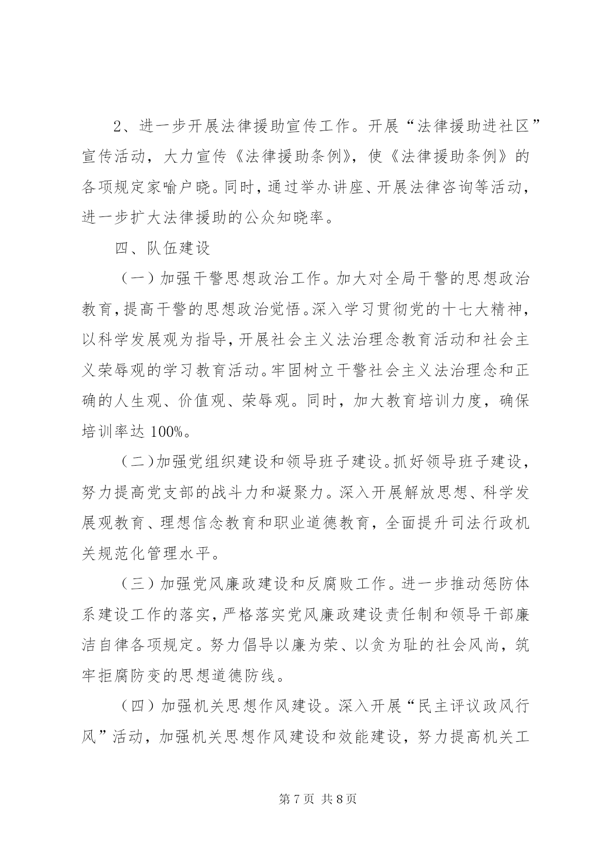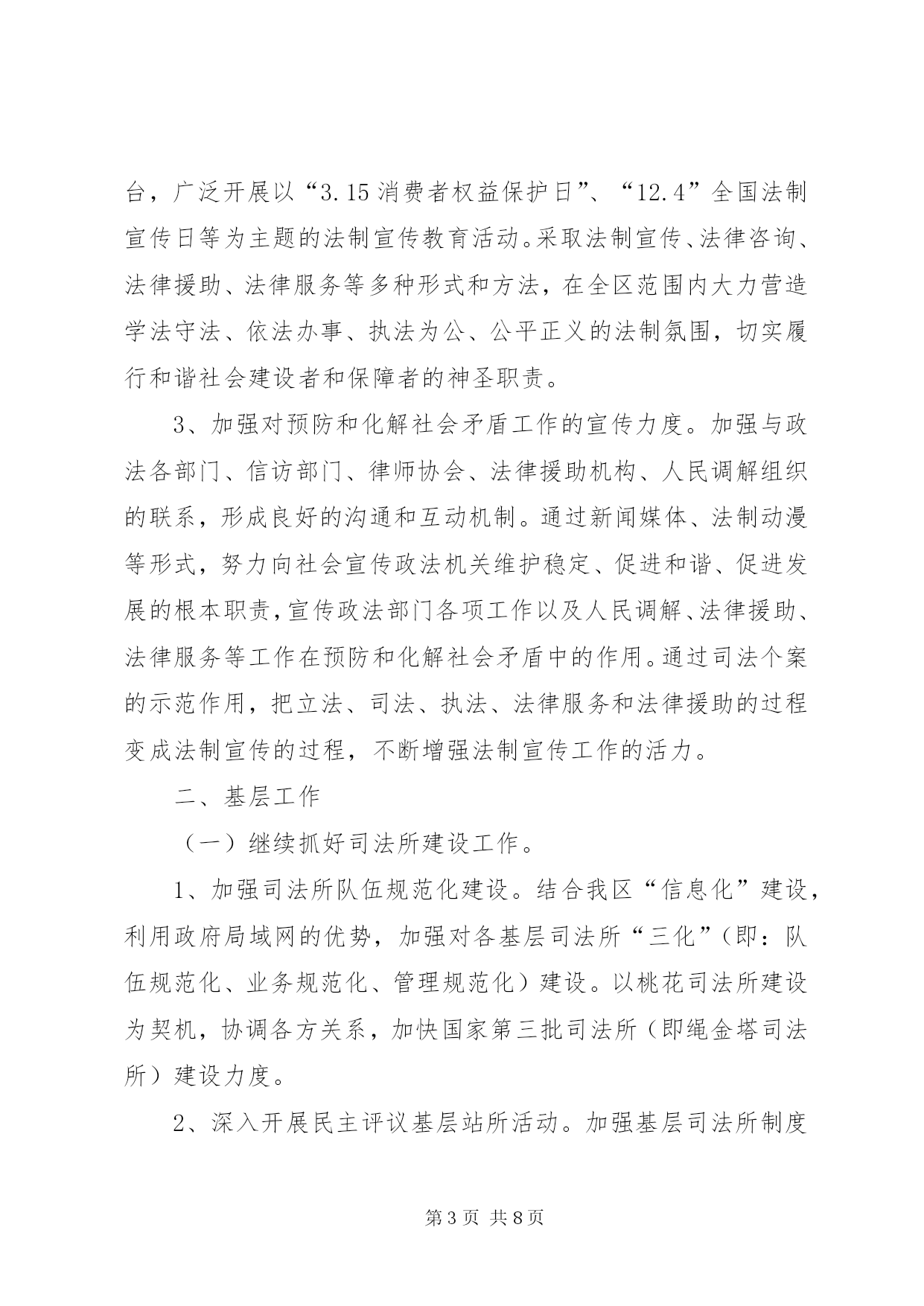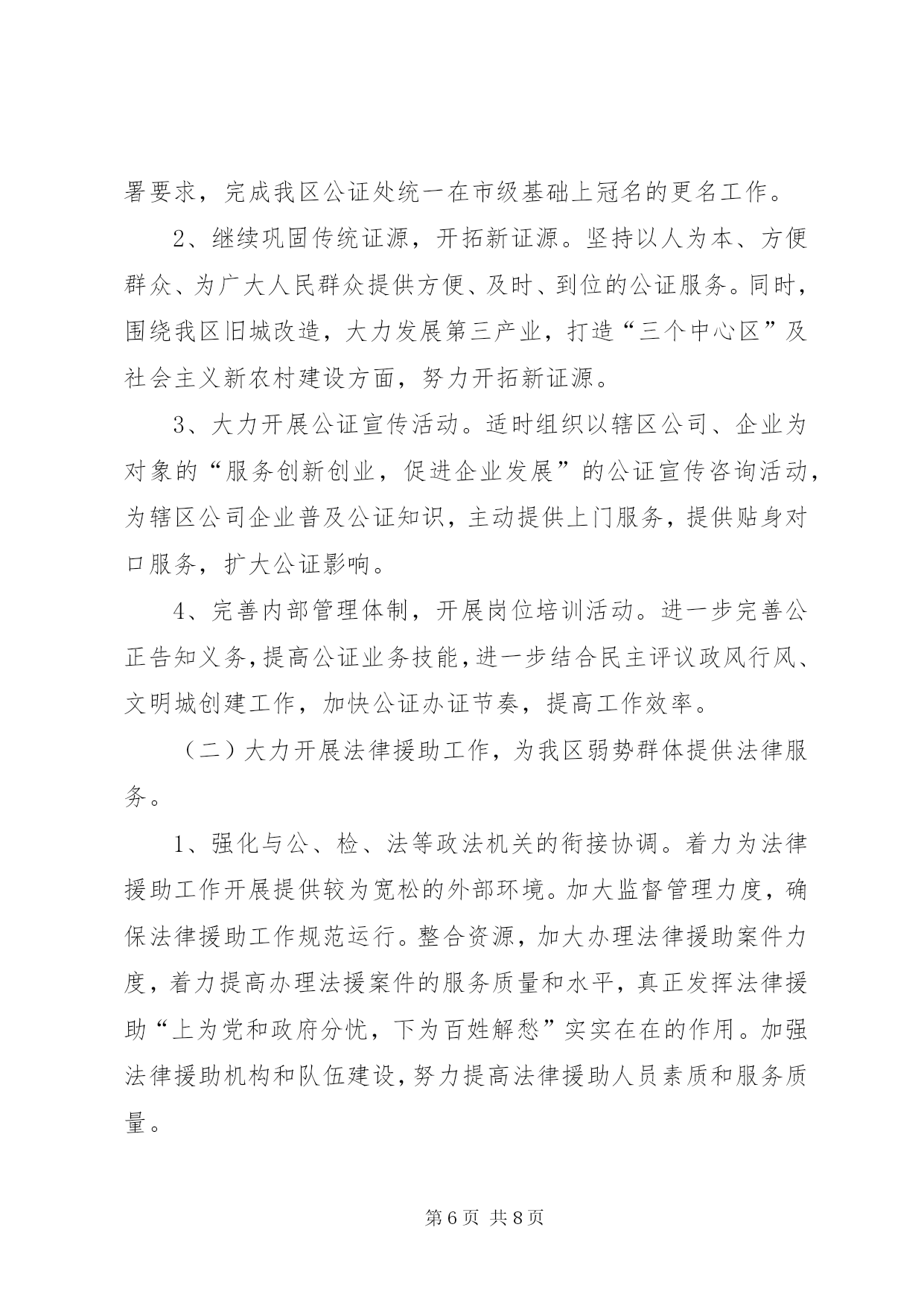 第PAGE\*Arabic\*MERGEFORMAT8页共NUMPAGES\*MERGEFORMAT8页司法局年度工作计划一、普法工作(一)突出重点,全面推进法制宣传教育“六进”工作。深入开展“法律六进”工作,建立健全相关的组织领导机构和办事机构,明确工作要求。1、重点推进“法律进机关”活动。明确“五五”普法期间加强本区领导干部学法用法工作的要求,进一步推进领导干部法制教育制度化、规范化建设,年内全区各级领导干部法制讲座不少于4次。2、大力推进“法律进乡村”、“法律进社区”活动。以民主法治为主题,对居、村“两委”组成人员开展系统法制培训,全面推进“民主法治示范社区(村)”创建活动。3、突出做好进城务工人员的法制教育工作。以大型工地、进城务工人员集居地为重点,组织开展进城务工人员的法制宣传活动,认真总结进城务工人员集聚地区法制宣传教育的经验和做法,探索建立进城务工人员法制教育的长效机制。4、继续推进“法律进学校”、“法律进企业”活动。加强与教育主管部门和共青团组织的沟通联系,落实“法律进学校”的各项任务,提高师生的法律素质。积极探索利用寒暑假开展青少年学法活动的新形式和新途径。加强企业职工学法阵地建设和企业法制讲师团队伍建设,探索建立企业管理人员法制讲座和法制培训制度。(二)夯实基础,进一步加强法制宣传教育的队伍建设和阵地建设。1、加强法制宣传教育的队伍建设。切实加强对社会法制宣传队伍的指导,充分发挥普法宣传队的作用,鼓励和引导普法志愿者为群众提供方便快捷的法律咨询和法律服务。积极探索普法宣传队、普法志愿者、法制副校长、法制辅导员和教师、“法律明白人”、学法带头户等普法队伍建设的良性机制,逐步形成“大普法”工作格局。同时,积极组织法制宣传员、兼职法制副校长和基层司法助理员参加省、市、区举办的各类普法培训,着力提高法制宣传员、兼职法制副校长和基层司法助理员的法制理论水平和实际工作能力。2、加强法制宣传教育的阵地化建设。按照普法宣传园地、普法教育基地、传媒阵地、普法网络、法律服务阵地建设相互补充、协调发展的要求,切实加强法制宣传教育阵地建设,全面扩展法制宣传教育工作平台,扎实有效地开展普法工作,为法制宣传提供广阔的发展空间。(三)创新机制,不断扩大法制宣传教育工作的社会覆盖面。1、坚持网络普法。充分利用好区门户网站,坚持”每月一法”形式的宣传活动,充分调动广大党员干部网上学法的积极性。2、开展各项主题法制宣传教育活动。以各基层司法所为平台,广泛开展以“3.15消费者权益保护日”、“12.4”全国法制宣传日等为主题的法制宣传教育活动。采取法制宣传、法律咨询、法律援助、法律服务等多种形式和方法,在全区范围内大力营造学法守法、依法办事、执法为公、公平正义的法制氛围,切实履行和谐社会建设者和保障者的神圣职责。3、加强对预防和化解社会矛盾工作的宣传力度。加强与政法各部门、信访部门、律师协会、法律援助机构、人民调解组织的联系,形成良好的沟通和互动机制。通过新闻媒体、法制动漫等形式,努力向社会宣传政法机关维护稳定、促进和谐、促进发展的根本职责,宣传政法部门各项工作以及人民调解、法律援助、法律服务等工作在预防和化解社会矛盾中的作用。通过司法个案的示范作用,把立法、司法、执法、法律服务和法律援助的过程变成法制宣传的过程,不断增强法制宣传工作的活力。二、基层工作(一)继续抓好司法所建设工作。1、加强司法所队伍规范化建设。结合我区“信息化”建设,利用政府局域网的优势,加强对各基层司法所“三化”(即:队伍规范化、业务规范化、管理规范化)建设。以桃花司法所建设为契机,协调各方关系,加快国家第三批司法所(即绳金塔司法所)建设力度。2、深入开展民主评议基层站所活动。加强基层司法所制度建设,转变工作作风,进一步增强服务意识,提高工作水平。(二)继续做好人民调解工作。1、进一步加强调解员的培训。按照人民调解协议审核制的要求,努力提高人民调解员调处纠纷、化解矛盾的能力和水平,特别是提高拟定调解协议书的水平。2、切实做细做实矛盾纠纷排查调处工作。坚持重大节假日期间民间矛盾纠纷排查调处工作。配合有关部门,加大对土地征用、企业改制、城市拆迁、下岗失业等重大疑难和热点难点矛盾纠纷的排查调处工作,把发现的早、化解的了、解决在基层的工作落到实处。3、加强人民调解工作的指导和管理,规范人民调解工作。明年我区要进一步指导调委会拓展工作领域,发挥调解职能,主动介入、积极预防和化解公民与法人及其他社会组织之间的民事纠纷,重点是当前一些社会热点、难点等问题引发的民间纠纷,进一步提高调解成功率和协议履行率,充分发挥“第一道防线”作用,为构建和谐平安西湖做出新的贡献。4、落实好“XX县区人民调解联谊、联防、联调联合协议书”内容,做好协调衔接工作,组织召开好联谊、联防、
