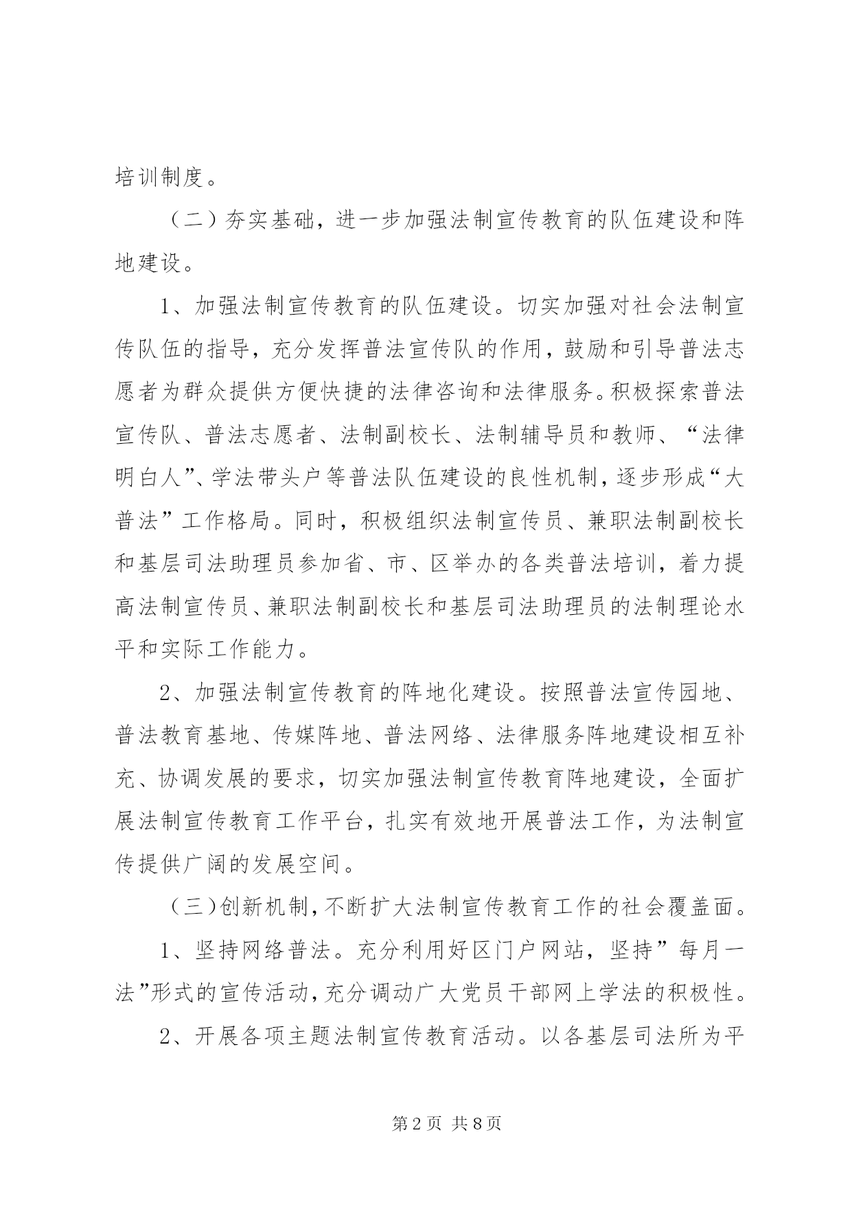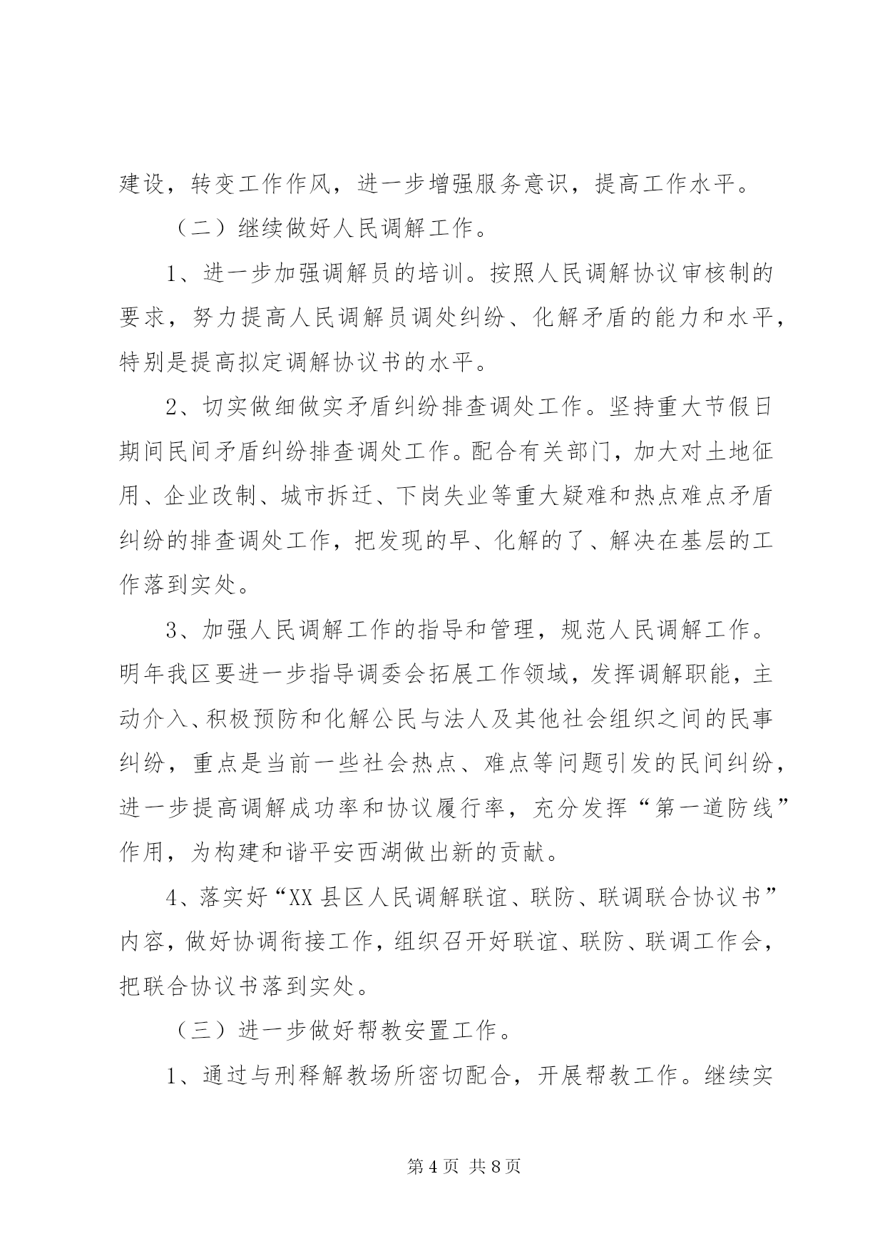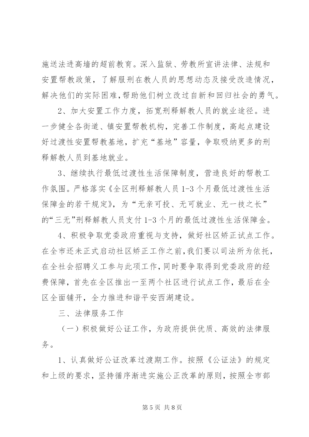 第PAGE\*Arabic\*MERGEFORMAT8页共NUMPAGES\*MERGEFORMAT8页司法局年度工作计划一、普法工作(一)突出重点,全面推进法制宣传教育“六进”工作。深入开展“法律六进”工作,建立健全相关的组织领导机构和办事机构,明确工作要求。1、重点推进“法律进机关”活动。明确“五五”普法期间加强本区领导干部学法用法工作的要求,进一步推进领导干部法制教育制度化、规范化建设,年内全区各级领导干部法制讲座不少于4次。2、大力推进“法律进乡村”、“法律进社区”活动。以民主法治为主题,对居、村“两委”组成人员开展系统法制培训,全面推进“民主法治示范社区(村)”创建活动。3、突出做好进城务工人员的法制教育工作。以大型工地、进城务工人员集居地为重点,组织开展进城务工人员的法制宣传活动,认真总结进城务工人员集聚地区法制宣传教育的经验和做法,探索建立进城务工人员法制教育的长效机制。4、继续推进“法律进学校”、“法律进企业”活动。加强与教育主管部门和共青团组织的沟通联系,落实“法律进学校”的各项任务,提高师生的法律素质。积极探索利用寒暑假开展青少年学法活动的新形式和新途径。加强企业职工学法阵地建设和企业法制讲师团队伍建设,探索建立企业管理人员法制讲座和法制培训制度。(二)夯实基础,进一步加强法制宣传教育的队伍建设和阵地建设。1、加强法制宣传教育的队伍建设。切实加强对社会法制宣传队伍的指导,充分发挥普法宣传队的作用,鼓励和引导普法志愿者为群众提供方便快捷的法律咨询和法律服务。积极探索普法宣传队、普法志愿者、法制副校长、法制辅导员和教师、“法律明白人”、学法带头户等普法队伍建设的良性机制,逐步形成“大普法”工作格局。同时,积极组织法制宣传员、兼职法制副校长和基层司法助理员参加省、市、区举办的各类普法培训,着力提高法制宣传员、兼职法制副校长和基层司法助理员的法制理论水平和实际工作能力。2、加强法制宣传教育的阵地化建设。按照普法宣传园地、普法教育基地、传媒阵地、普法网络、法律服务阵地建设相互补充、协调发展的要求,切实加强法制宣传教育阵地建设,全面扩展法制宣传教育工作平台,扎实有效地开展普法工作,为法制宣传提供广阔的发展空间。(三)创新机制,不断扩大法制宣传教育工作的社会覆盖面。1、坚持网络普法。充分利用好区门户网站,坚持”每月一法”形式的宣传活动,充分调动广大党员干部网上学法的积极性。2、开展各项主题法制宣传教育活动。以各基层司法所为平台,广泛开展以“3.15消费者权益保护日”、“12.4”全国法制宣传日等为主题的法制宣传教育活动。采取法制宣传、法律咨询、法律援助、法律服务等多种形式和方法,在全区范围内大力营造学法守法、依法办事、执法为公、公平正义的法制氛围,切实履行和谐社会建设者和保障者的神圣职责。3、加强对预防和化解社会矛盾工作的宣传力度。加强与政法各部门、信访部门、律师协会、法律援助机构、人民调解组织的联系,形成良好的沟通和互动机制。通过新闻媒体、法制动漫等形式,努力向社会宣传政法机关维护稳定、促进和谐、促进发展的根本职责,宣传政法部门各项工作以及人民调解、法律援助、法律服务等工作在预防和化解社会矛盾中的作用。通过司法个案的示范作用,把立法、司法、执法、法律服务和法律援助的过程变成法制宣传的过程,不断增强法制宣传工作的活力。二、基层工作(一)继续抓好司法所建设工作。1、加强司法所队伍规范化建设。结合我区“信息化”建设,利用政府局域网的优势,加强对各基层司法所“三化”(即:队伍规范化、业务规范化、管理规范化)建设。以桃花司法所建设为契机,协调各方关系,加快国家第三批司法所(即绳金塔司法所)建设力度。2、深入开展民主评议基层站所活动。加强基层司法所制度建设,转变工作作风,进一步增强服务意识,提高工作水平。(二)继续做好人民调解工作。1、进一步加强调解员的培训。按照人民调解协议审核制的要求,努力提高人民调解员调处纠纷、化解矛盾的能力和水平,特别是提高拟定调解协议书的水平。2、切实做细做实矛盾纠纷排查调处工作。坚持重大节假日期间民间矛盾纠纷排查调处工作。配合有关部门,加大对土地征用、企业改制、城市拆迁、下岗失业等重大疑难和热点难点矛盾纠纷的排查调处工作,把发现的早、化解的了、解决在基层的工作落到实处。3、加强人民调解工作的指导和管理,规范人民调解工作。明年我区要进一步指导调委会拓展工作领域,发挥调解职能,主动介入、积极预防和化解公民与法人及其他社会组织之间的民事纠纷,重点是当前一些社会热点、难点等问题引发的民间纠纷,进一步提高调解成功率和协议履行率,充分发挥“第一道防线”作用,为构建和谐平安西湖做出新的贡献。4、落实好“XX县区人民调解联谊、联防、联调联合协议书”内容,做好协调衔接工作,组织召开好联谊、联防、
