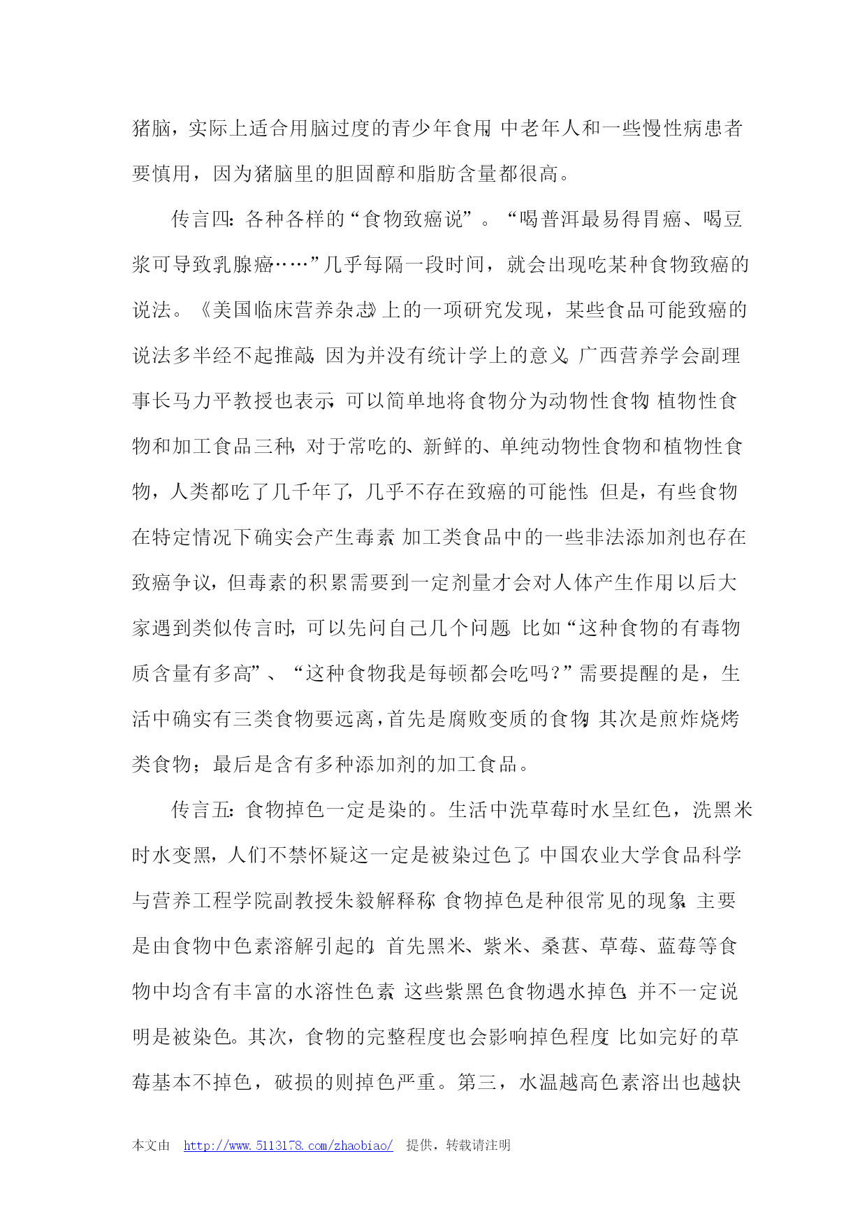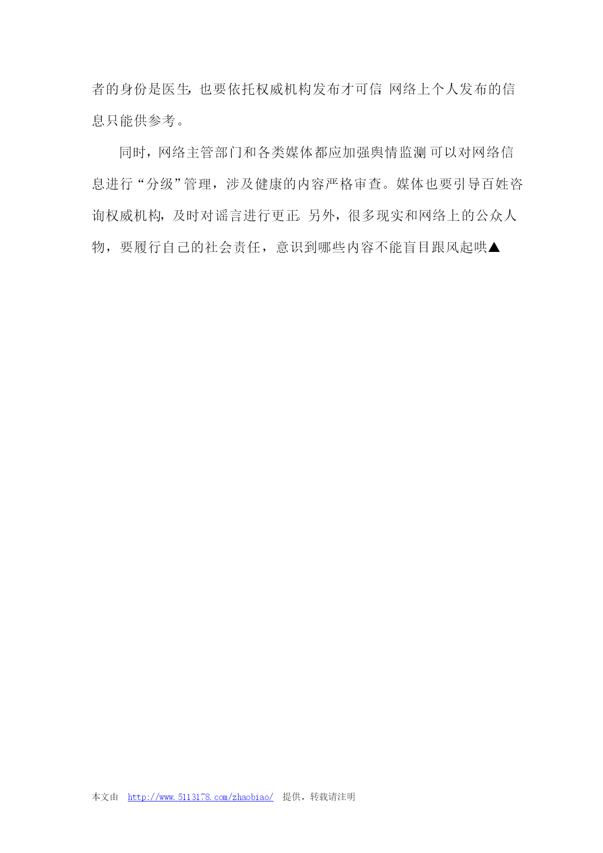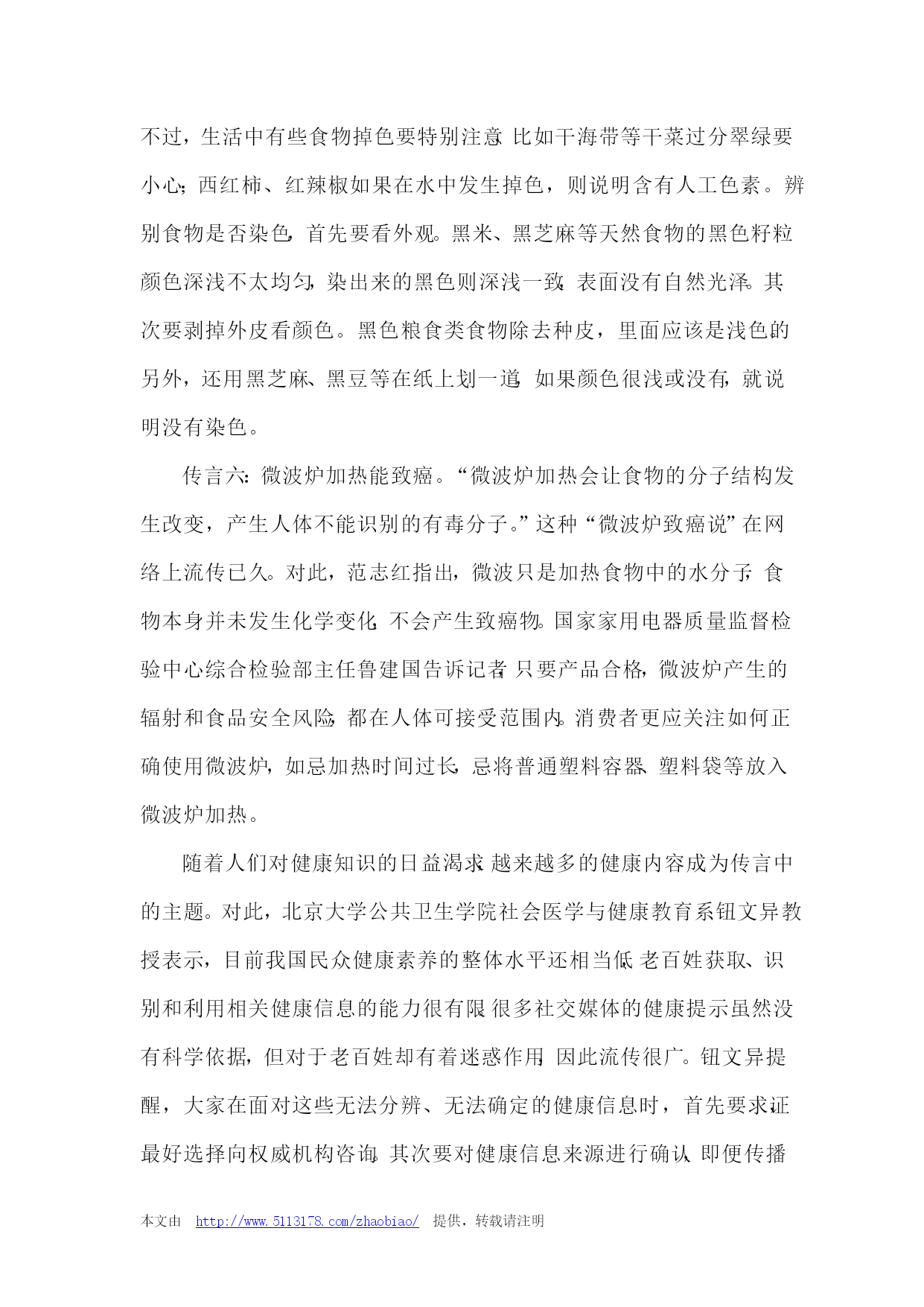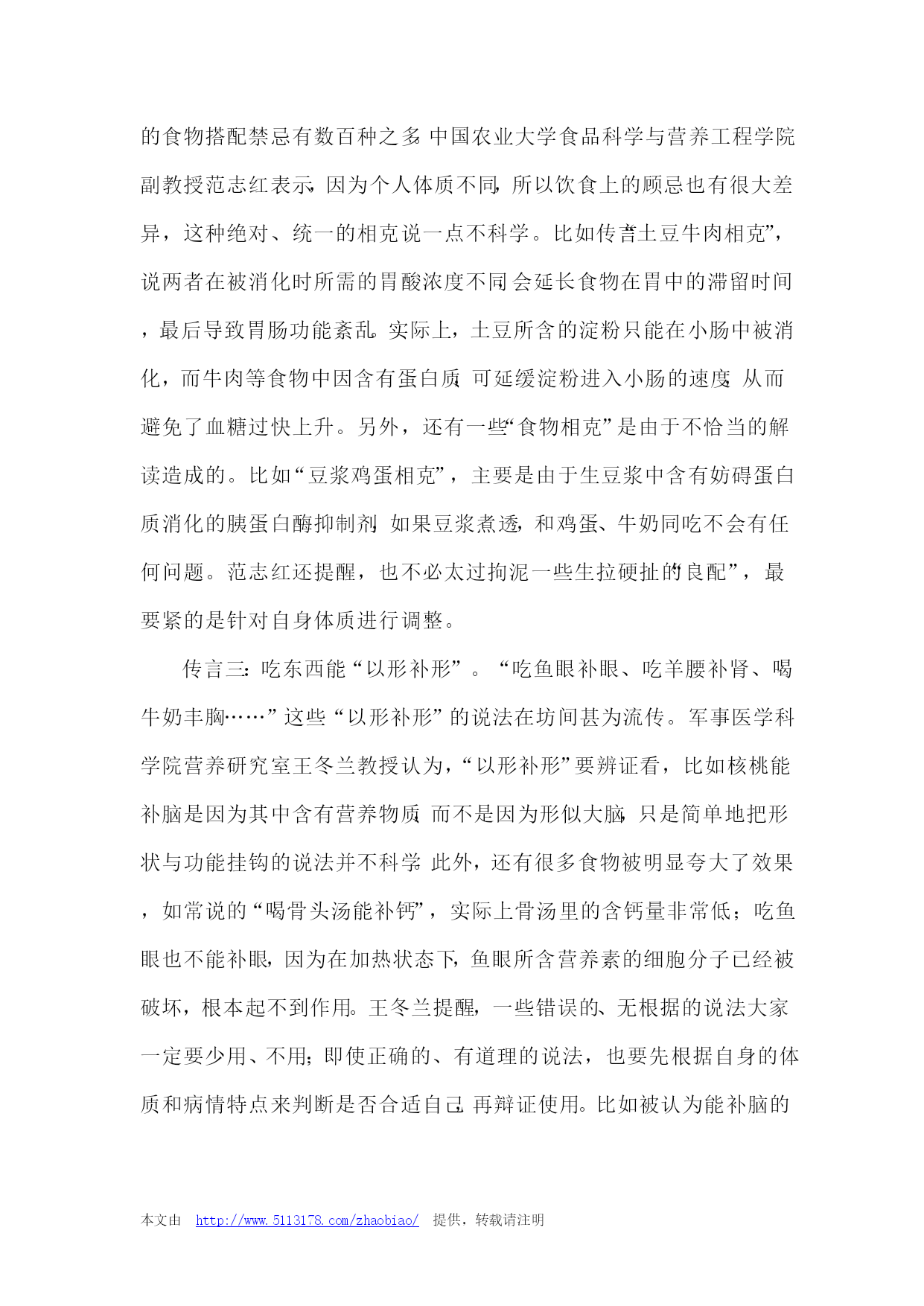 本文由HYPERLINK"http://www.5113178.com/zhaobiao/"http://www.5113178.com/zhaobiao/提供,转载请注明“喝豆浆导致乳腺癌”、“酸性体质是万病根源”……随着社交媒体的普及,几乎每隔一段时间,一些既无权威出处,又无科学支持的健康“警告”便会出现在人们的视线中,并被网友们火热传播。有些说法已经流行了很多年,甚至被传成了“真理”;还有些新的传言则打出各种吸引眼球的标题,在养生节目和保健品广告的热捧中迅速传播,严重影响着百姓生活。本期,《生命时报》采访多位专家,总结出几类传播最久、影响最深、普及度最高的健康传言,一一给您辟谣。传言一:人有酸碱体质之分。近几年,“人有酸碱体质之分,只有呈弱碱性才健康”的养生新说法持续火热。它标榜用碱性食品去中和体内的酸性,最终改变亚健康状况。首都医科大学附属北京安贞医院肾内科谌贻璞教授表示,现代医学中根本没有“酸性体质”、“碱性体质”这些词。正常人体内的酸碱度(pH值)稳定在7.35—7.45之间。中国营养学会前理事长程义勇教授则告诉记者,体质上不会存在酸碱的差别,人体有几大平衡系统,它们可以维持人体内的酸碱平衡,并且这种平衡的状态不会被单纯的食物所影响,比如吃酸性食物不会使身体变成酸性。程义勇表示,按照化学分类鉴定食物酸碱性的做法没有问题,但一些人把简单的概念夸大了。把酸性体质看作百病之源的说法,更是无稽之谈。这种谬论已经伤害了很多人,不少优质蛋白、谷物都被归为酸性食品,人们不敢食用,结果造成营养不良。大家在选择食物时完全没必要从酸碱性的角度考虑。传言二:食物搭配忌讳相克。“土豆牛肉不能一起吃、火腿配牛奶致癌、小葱拌豆腐没营养……”在网上盛传的“食物相克表”中,罗列的食物搭配禁忌有数百种之多。中国农业大学食品科学与营养工程学院副教授范志红表示,因为个人体质不同,所以饮食上的顾忌也有很大差异,这种绝对、统一的相克说一点不科学。比如传言“土豆牛肉相克”,说两者在被消化时所需的胃酸浓度不同,会延长食物在胃中的滞留时间,最后导致胃肠功能紊乱。实际上,土豆所含的淀粉只能在小肠中被消化,而牛肉等食物中因含有蛋白质,可延缓淀粉进入小肠的速度,从而避免了血糖过快上升。另外,还有一些“食物相克”是由于不恰当的解读造成的。比如“豆浆鸡蛋相克”,主要是由于生豆浆中含有妨碍蛋白质消化的胰蛋白酶抑制剂,如果豆浆煮透,和鸡蛋、牛奶同吃不会有任何问题。范志红还提醒,也不必太过拘泥一些生拉硬扯的“良配”,最要紧的是针对自身体质进行调整。传言三:吃东西能“以形补形”。“吃鱼眼补眼、吃羊腰补肾、喝牛奶丰胸……”这些“以形补形”的说法在坊间甚为流传。军事医学科学院营养研究室王冬兰教授认为,“以形补形”要辨证看,比如核桃能补脑是因为其中含有营养物质,而不是因为形似大脑,只是简单地把形状与功能挂钩的说法并不科学。此外,还有很多食物被明显夸大了效果,如常说的“喝骨头汤能补钙”,实际上骨汤里的含钙量非常低;吃鱼眼也不能补眼,因为在加热状态下,鱼眼所含营养素的细胞分子已经被破坏,根本起不到作用。王冬兰提醒,一些错误的、无根据的说法大家一定要少用、不用;即使正确的、有道理的说法,也要先根据自身的体质和病情特点来判断是否合适自己,再辩证使用。比如被认为能补脑的猪脑,实际上适合用脑过度的青少年食用,中老年人和一些慢性病患者要慎用,因为猪脑里的胆固醇和脂肪含量都很高。传言四:各种各样的“食物致癌说”。“喝普洱最易得胃癌、喝豆浆可导致乳腺癌……”几乎每隔一段时间,就会出现吃某种食物致癌的说法。《美国临床营养杂志》上的一项研究发现,某些食品可能致癌的说法多半经不起推敲,因为并没有统计学上的意义。广西营养学会副理事长马力平教授也表示,可以简单地将食物分为动物性食物、植物性食物和加工食品三种,对于常吃的、新鲜的、单纯动物性食物和植物性食物,人类都吃了几千年了,几乎不存在致癌的可能性。但是,有些食物在特定情况下确实会产生毒素,加工类食品中的一些非法添加剂也存在致癌争议,但毒素的积累需要到一定剂量才会对人体产生作用。以后大家遇到类似传言时,可以先问自己几个问题。比如“这种食物的有毒物质含量有多高”、“这种食物我是每顿都会吃吗?”需要提醒的是,生活中确实有三类食物要远离,首先是腐败变质的食物;其次是煎炸烧烤类食物;最后是含有多种添加剂的加工食品。传言五:食物掉色一定是染的。生活中洗草莓时水呈红色,洗黑米时水变黑,人们不禁怀疑这一定是被染过色了。中国农业大学食品科学与营养工程学院副教授朱毅解释称,食物掉色是种很常见的现象,主要是由食物中色素溶解引起的。首先黑米、紫米、桑葚、草莓、蓝莓等食物中均含有丰富的水溶性色素,这些紫黑色食物遇水掉色,并不一定说明是被染色。其次,食物的完整程度也会影