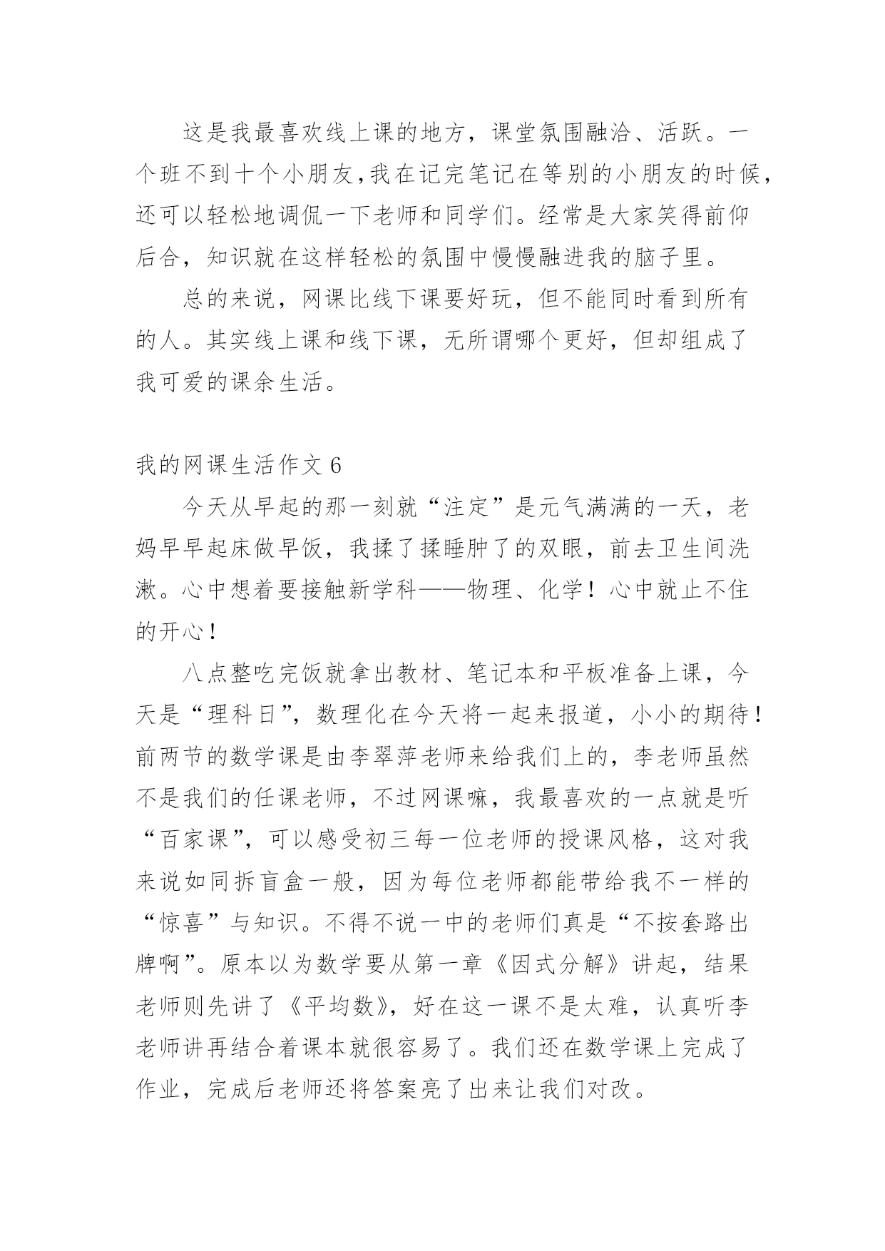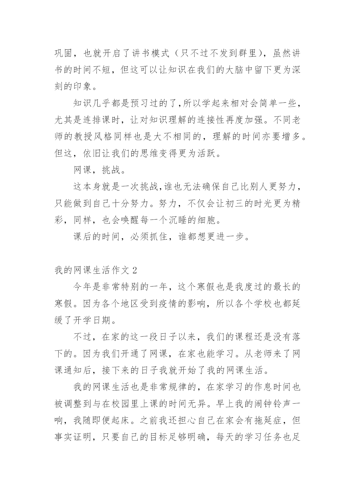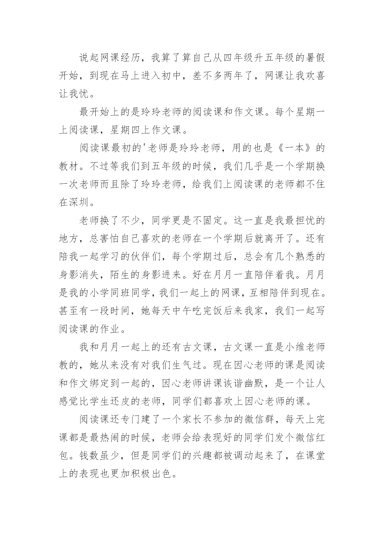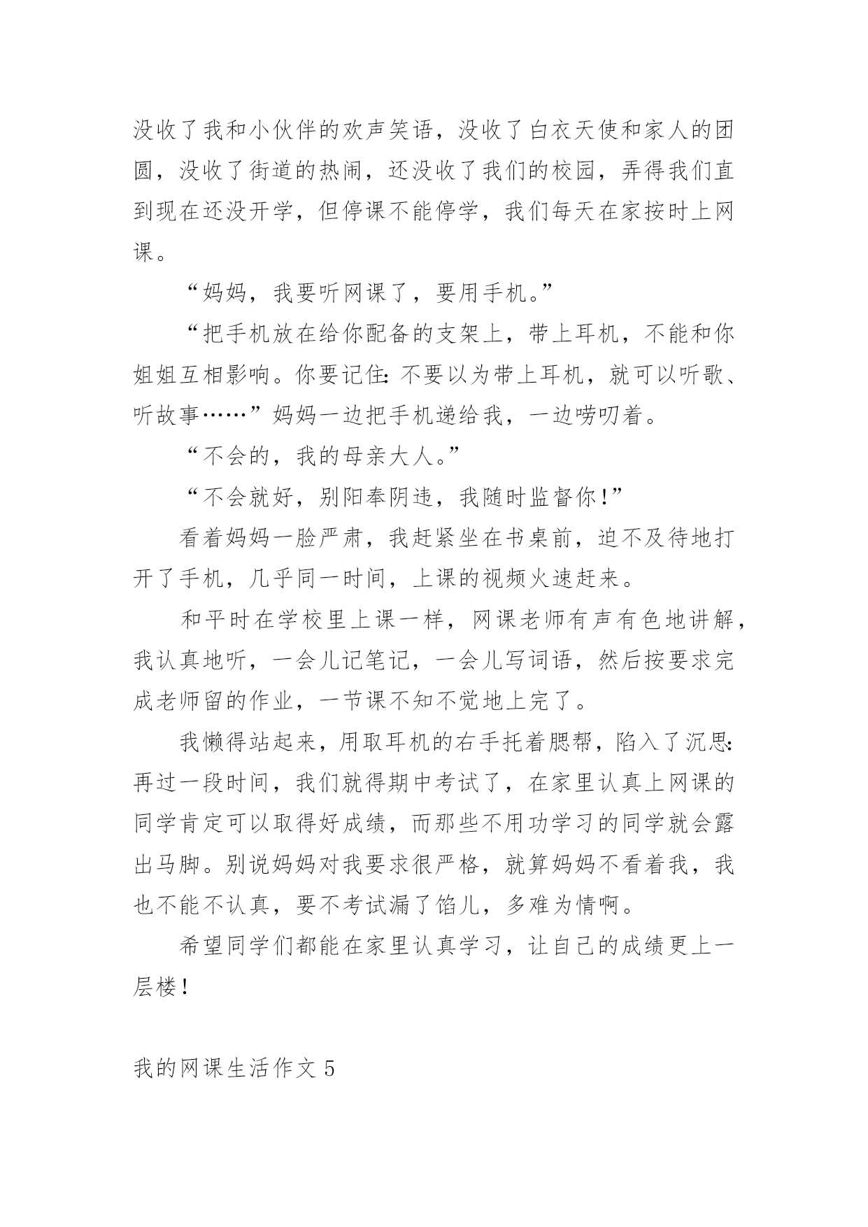 我的网课生活作文在平凡的学习、工作、生活中,大家都不可避免地会接触到作文吧,借助作文可以提高我们的语言组织能力。那么你知道一篇好的作文该怎么写吗?下面是小编整理的我的网课生活作文,仅供参考,大家一起来看看吧。我的网课生活作文1网课的生活已然走过了三天。这三天时光里,是对学习另一种方法的诠释,云里雾里找回了些对之前学习方法的了解,也就理所当然派上了用场。每节课间的十分钟,再也无法用来在欢声笑语中度过了,或埋头拼命补笔记,或写着刚刚布置下来的作业。虽时间不长,但只要时间把握好,知识理解透,完成大部分作业还是比较轻松的。基训的难度并不是很大,于是又买来了五三,讲一节就写一节,如此一来,就不会有拖沓的风险了。昨天连做了三科,发现效果是挺好的,也几乎没有错题,也算物尽其用了吧。从五三里能找到很多新题型,随之就要开动脑筋去思索了。万一答错,还有全面的解析供我参考,这感觉实在是太棒了。做着做着,就慢慢找到了一种类型的技巧与规律,做起来自然就更容易了。当然了,光做题也是不行的,需要先对已学的知识进行巩固,也就开启了讲书模式(只不过不发到群里),虽然讲书的时间不短,但这可以让知识在我们的大脑中留下更为深刻的印象。知识几乎都是预习过的了,所以学起来相对会简单一些,尤其是连排课时,让对知识理解的连接性再度加强。不同老师的教授风格同样也是大不相同的,理解的时间亦要增多。但这,依旧让我们的思维变得更为活跃。网课,挑战。这本身就是一次挑战,谁也无法确保自己比别人更努力,只能做到自己十分努力。努力,不仅会让初三的时光更为精彩,同样,也会唤醒每一个沉睡的细胞。课后的时间,必须抓住,谁都想更进一步。我的网课生活作文2今年是非常特别的一年,这个寒假也是我度过的最长的寒假。因为各个地区受到疫情的影响,所以各个学校也都延缓了开学日期。不过,在家的这一段日子以来,我们的课程还是没有落下的。因为我们开通了网课,在家也能学习。从老师来了网课通知后,接下来的日子我就开始了我的网课生活。我的网课生活也是非常规律的,在家学习的作息时间也被调整到与在校园里上课的时间无异。早上我的闹钟铃声一响,我随即便起床。之前我还担心自己在家会有拖延症,但事实证明,只要自己的目标足够明确,每天的学习任务也足够明晰,那么自己就一定能够克服自身的拖延症。最初,我对网课这种教学模式感到很新奇,也充满着好奇。不过随着上过一节又一节的网课,时间在一天一天中流逝,我对网课的好奇渐渐消退,取而代之的是熟悉。老师同学们线上交流,老师在屏幕里讲解知识和我们的学习内容,同学们守在各自的家里,都在同一时间里一起在电脑里上课。这种上课模式不同于我们传统的上课模式,老师同学们面对面交流,教室里的学习气氛很是浓烈。如今上网课,老师同学们相隔不少距离,但是我们还是能够通过线上来进行交流。不像之前我们直接面对面交流,有问题同学直接举手,然后老师一一解答。现在老师与同学们的交流得需要通过一种媒介,通过网络。在我的网课生活这段时间里,我最大的收获就是更加了解了网络带给我们的便利,不论是从生活上,还是在学习上,网络带给我的认知超越我以往的观念。并且,也因为网课,让我们在这段时间里依旧能在老师的带领下较为系统的去学习。我的网课生活作文3我的网课生活,或许是爷爷奶奶心中的一个谜吧!特别是有一次我调错了频道,听了一节高二年级的化学课后,爷爷奶奶一定更觉得我的网课生活像是一个谜了,还有我在网课上记的笔记,他们一定不是很明白。其实我自己也不是很明白,我为什么经常调错了网课的频道,还认真听了课,认真做了笔记。就拿那天我听的那节化学课来说,我也没有听懂老师讲的内容,可我还是认认真真记了笔记。只是后来我的老师,时不时就要电话我的爸爸妈妈,告诉他们我经常上网课缺席,而帮爸爸妈妈管理我上网课的爷爷奶奶也就莫名其妙被埋怨了,他们都不明白,明明准时上了网课的我,为何还会缺席。那天我听的那节高二年级的化学课,最后还是我的爸爸下班了看到我记得笔记,这才知道我调错了网课的频道,我关心的是我今天的网课没有听懂,而我的爸爸关心的是我今天真正的网课又缺席了。当我的爸爸把这些告诉爷爷奶奶时,爷爷奶奶这才明白白天他们的直觉没有错,网课的内容的确不是他们认为应该是我的网课的内容,只是爷爷奶奶拗不过我,我则一直听不懂也听了一节课,不明白老师写的是什么,也认认真真记了一节课笔记。还有的时候,我的网课没有调错频道,也会让我的爷爷奶奶琢磨不明白。他们只见我跟着我们的老师在家做着运动,什么话也不说,等到网课结束了,一家人围着桌子吃饭了,爷爷奶奶才会问我的爸爸妈妈,我的网课还有做体操的内容,甚至还要在家里跑圈,这又是怎么一回事儿。他们不知道我的网课里面也有体育课,不知道我们老师也在家里的窄小空间里跳着蹦着呢!我的网课生活作文4唉,今年怎么就冒出了个新型冠状病毒?它真可恨!它没收了我