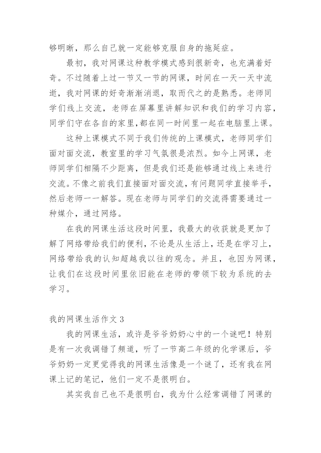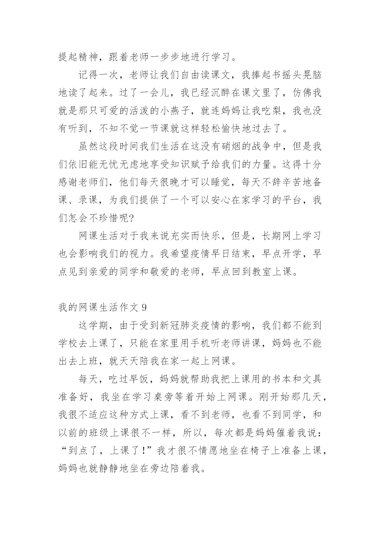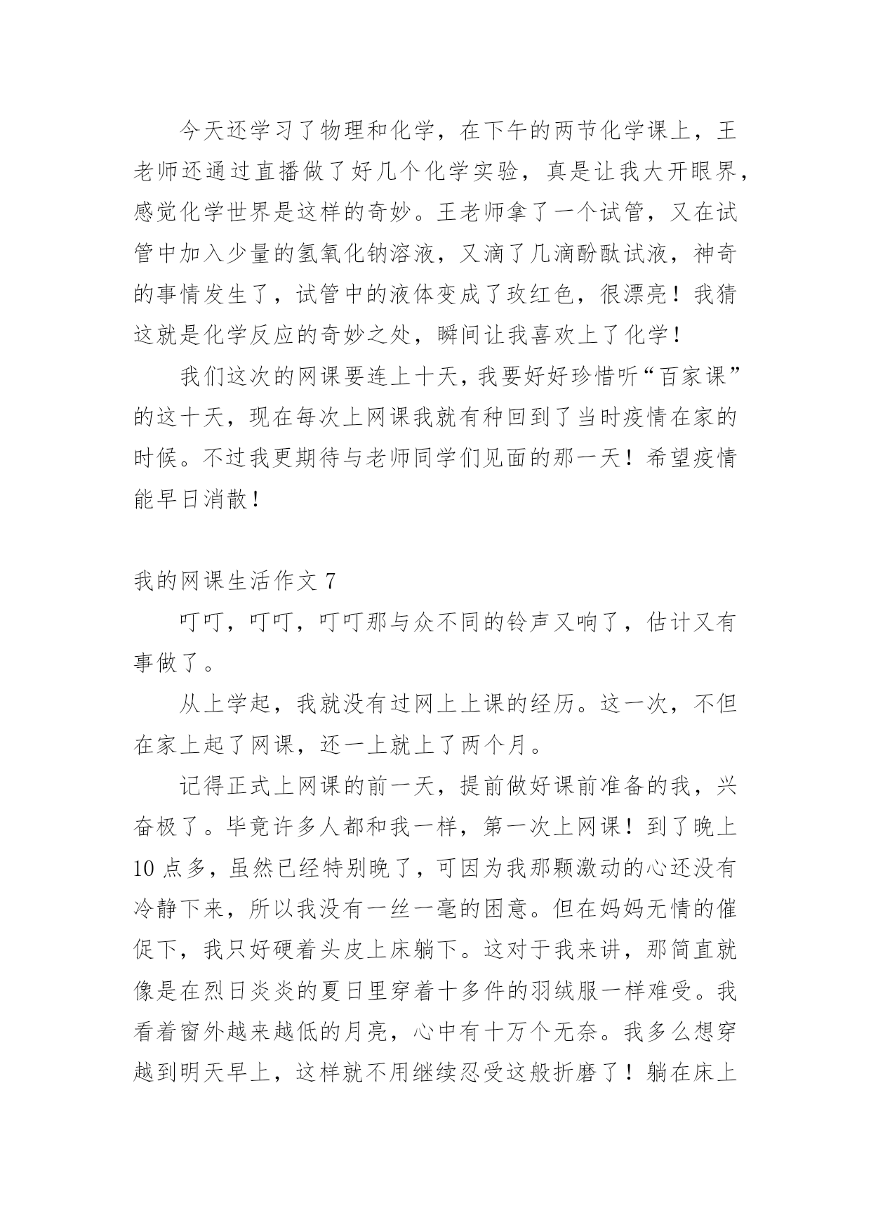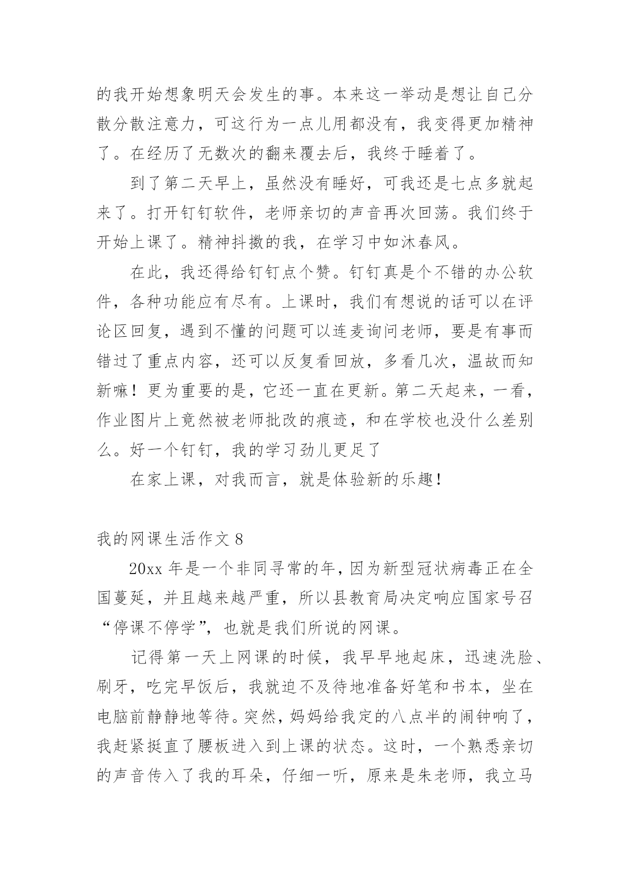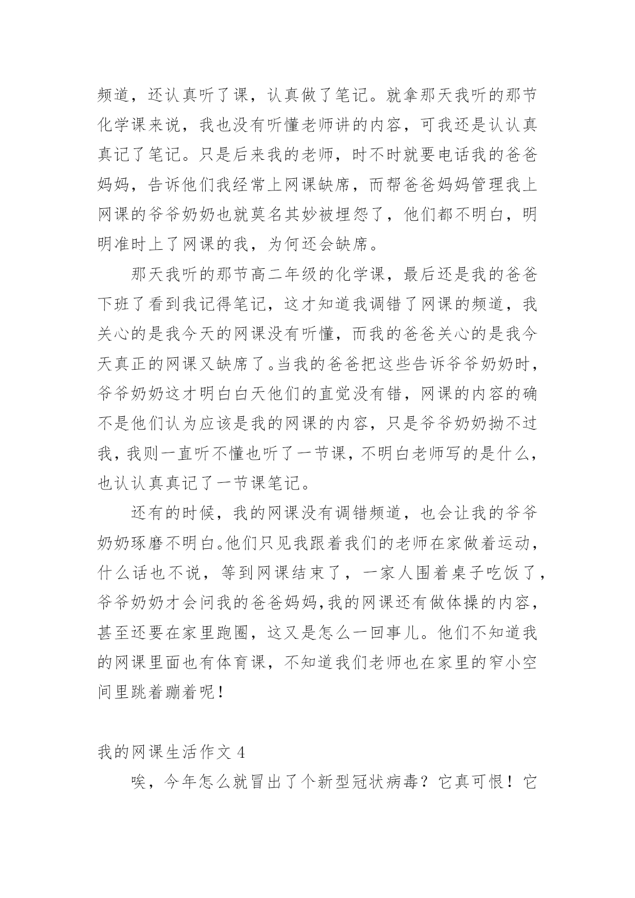 我的网课生活作文在平凡的学习、工作、生活中,大家都不可避免地会接触到作文吧,借助作文可以提高我们的语言组织能力。那么你知道一篇好的作文该怎么写吗?下面是小编整理的我的网课生活作文,仅供参考,大家一起来看看吧。我的网课生活作文1网课的生活已然走过了三天。这三天时光里,是对学习另一种方法的诠释,云里雾里找回了些对之前学习方法的了解,也就理所当然派上了用场。每节课间的十分钟,再也无法用来在欢声笑语中度过了,或埋头拼命补笔记,或写着刚刚布置下来的作业。虽时间不长,但只要时间把握好,知识理解透,完成大部分作业还是比较轻松的。基训的难度并不是很大,于是又买来了五三,讲一节就写一节,如此一来,就不会有拖沓的风险了。昨天连做了三科,发现效果是挺好的,也几乎没有错题,也算物尽其用了吧。从五三里能找到很多新题型,随之就要开动脑筋去思索了。万一答错,还有全面的解析供我参考,这感觉实在是太棒了。做着做着,就慢慢找到了一种类型的技巧与规律,做起来自然就更容易了。当然了,光做题也是不行的,需要先对已学的知识进行巩固,也就开启了讲书模式(只不过不发到群里),虽然讲书的时间不短,但这可以让知识在我们的大脑中留下更为深刻的印象。知识几乎都是预习过的了,所以学起来相对会简单一些,尤其是连排课时,让对知识理解的连接性再度加强。不同老师的教授风格同样也是大不相同的,理解的时间亦要增多。但这,依旧让我们的思维变得更为活跃。网课,挑战。这本身就是一次挑战,谁也无法确保自己比别人更努力,只能做到自己十分努力。努力,不仅会让初三的时光更为精彩,同样,也会唤醒每一个沉睡的细胞。课后的时间,必须抓住,谁都想更进一步。我的网课生活作文2今年是非常特别的一年,这个寒假也是我度过的最长的寒假。因为各个地区受到疫情的影响,所以各个学校也都延缓了开学日期。不过,在家的这一段日子以来,我们的课程还是没有落下的。因为我们开通了网课,在家也能学习。从老师来了网课通知后,接下来的日子我就开始了我的网课生活。我的网课生活也是非常规律的,在家学习的作息时间也被调整到与在校园里上课的时间无异。早上我的闹钟铃声一响,我随即便起床。之前我还担心自己在家会有拖延症,但事实证明,只要自己的目标足够明确,每天的学习任务也足够明晰,那么自己就一定能够克服自身的拖延症。最初,我对网课这种教学模式感到很新奇,也充满着好奇。不过随着上过一节又一节的网课,时间在一天一天中流逝,我对网课的好奇渐渐消退,取而代之的是熟悉。老师同学们线上交流,老师在屏幕里讲解知识和我们的学习内容,同学们守在各自的家里,都在同一时间里一起在电脑里上课。这种上课模式不同于我们传统的上课模式,老师同学们面对面交流,教室里的学习气氛很是浓烈。如今上网课,老师同学们相隔不少距离,但是我们还是能够通过线上来进行交流。不像之前我们直接面对面交流,有问题同学直接举手,然后老师一一解答。现在老师与同学们的交流得需要通过一种媒介,通过网络。在我的网课生活这段时间里,我最大的收获就是更加了解了网络带给我们的便利,不论是从生活上,还是在学习上,网络带给我的认知超越我以往的观念。并且,也因为网课,让我们在这段时间里依旧能在老师的带领下较为系统的去学习。我的网课生活作文3我的网课生活,或许是爷爷奶奶心中的一个谜吧!特别是有一次我调错了频道,听了一节高二年级的化学课后,爷爷奶奶一定更觉得我的网课生活像是一个谜了,还有我在网课上记的笔记,他们一定不是很明白。其实我自己也不是很明白,我为什么经常调错了网课的频道,还认真听了课,认真做了笔记。就拿那天我听的那节化学课来说,我也没有听懂老师讲的内容,可我还是认认真真记了笔记。只是后来我的老师,时不时就要电话我的爸爸妈妈,告诉他们我经常上网课缺席,而帮爸爸妈妈管理我上网课的爷爷奶奶也就莫名其妙被埋怨了,他们都不明白,明明准时上了网课的我,为何还会缺席。那天我听的那节高二年级的化学课,最后还是我的爸爸下班了看到我记得笔记,这才知道我调错了网课的频道,我关心的是我今天的网课没有听懂,而我的爸爸关心的是我今天真正的网课又缺席了。当我的爸爸把这些告诉爷爷奶奶时,爷爷奶奶这才明白白天他们的直觉没有错,网课的内容的确不是他们认为应该是我的网课的内容,只是爷爷奶奶拗不过我,我则一直听不懂也听了一节课,不明白老师写的是什么,也认认真真记了一节课笔记。还有的时候,我的网课没有调错频道,也会让我的爷爷奶奶琢磨不明白。他们只见我跟着我们的老师在家做着运动,什么话也不说,等到网课结束了,一家人围着桌子吃饭了,爷爷奶奶才会问我的爸爸妈妈,我的网课还有做体操的内容,甚至还要在家里跑圈,这又是怎么一回事儿。他们不知道我的网课里面也有体育课,不知道我们老师也在家里的窄小空间里跳着蹦着呢!我的网课生活作文4唉,今年怎么就冒出了个新型冠状病毒?它真可恨!它没收了我
