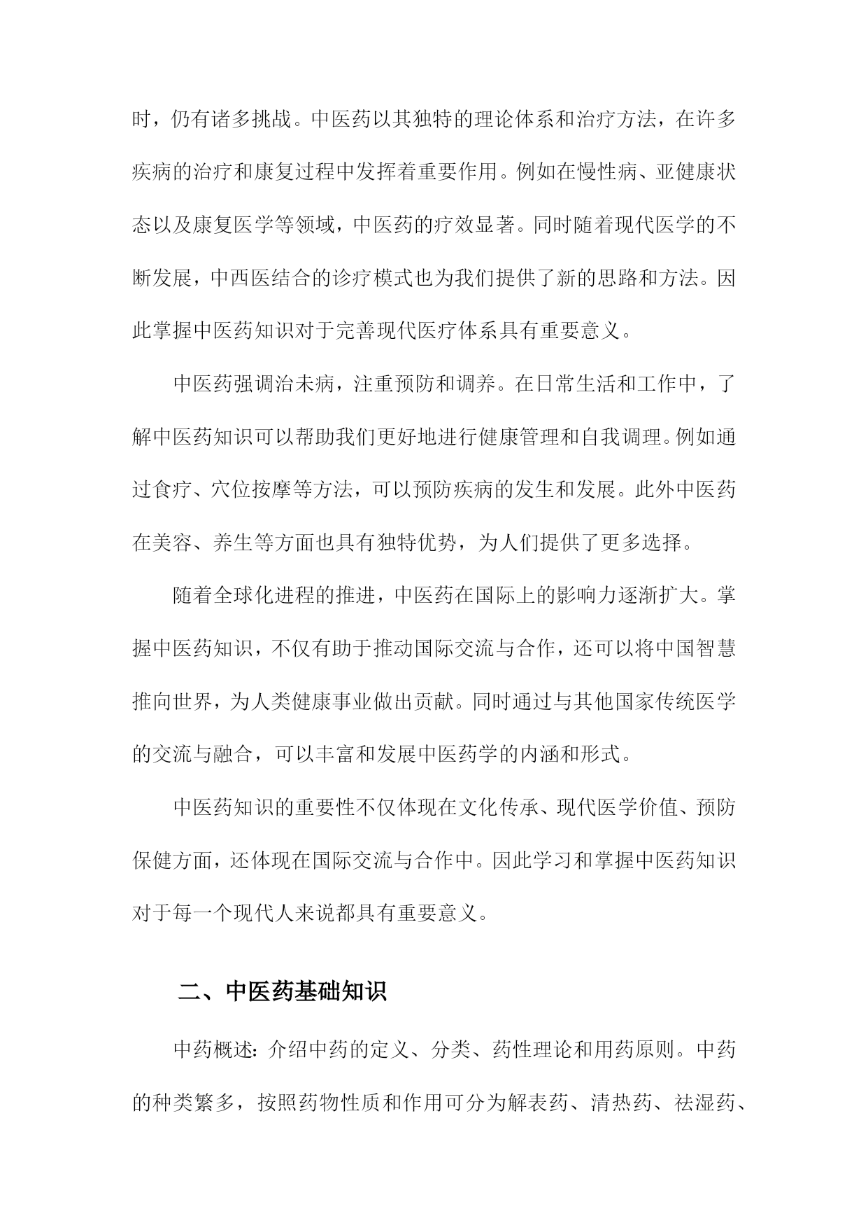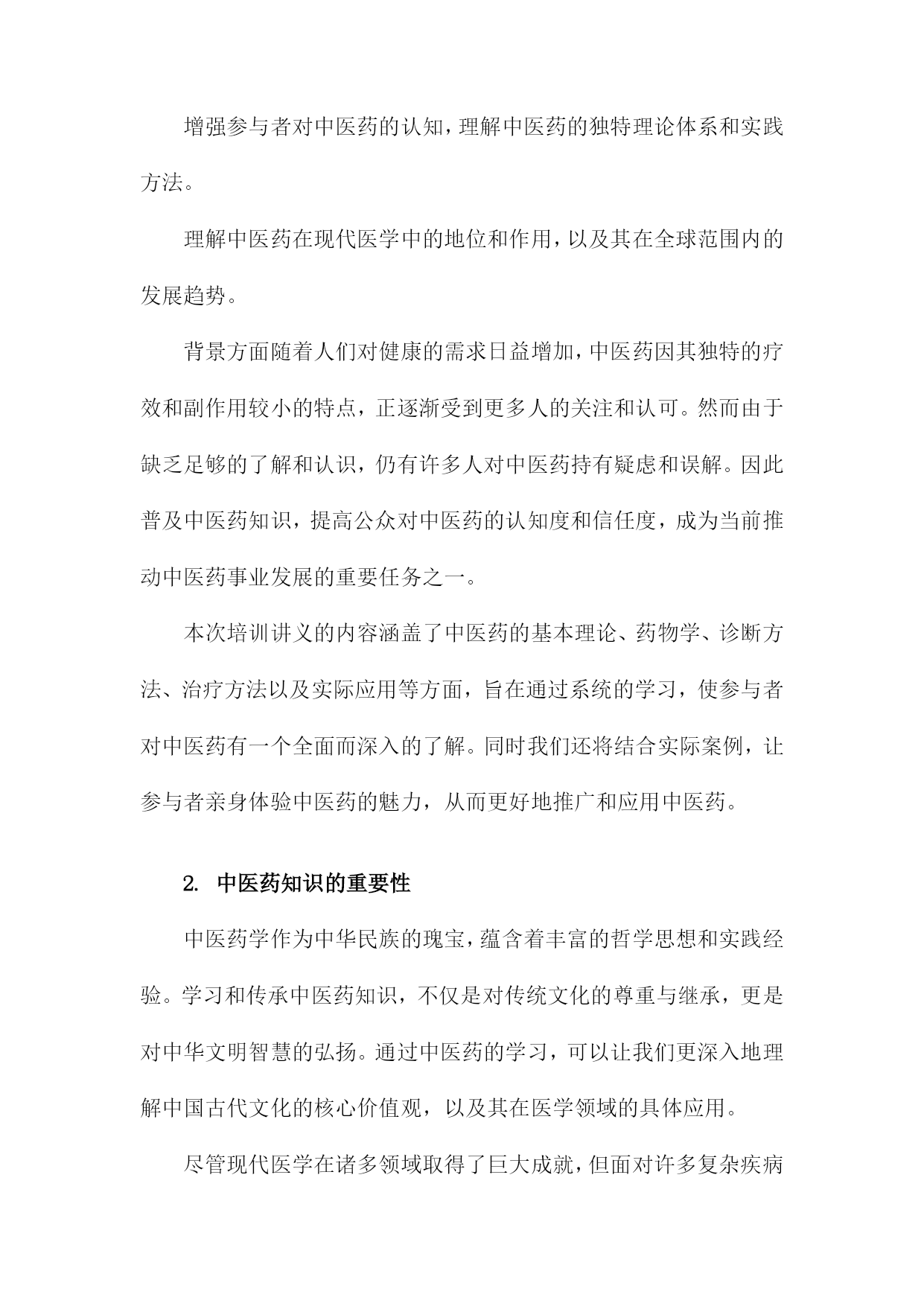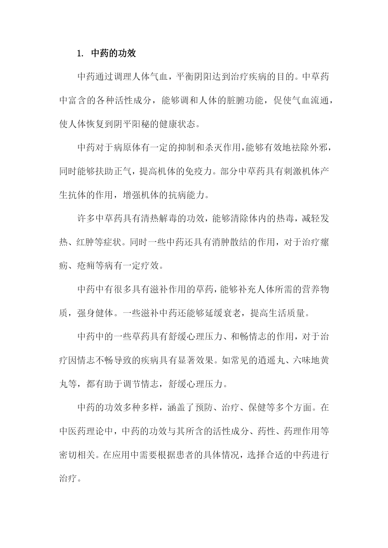 中医药知识培训讲义一、概括《中医药知识培训讲义》是一部系统性介绍中医药理论与实践的文献,旨在普及中医药知识,提升大众对中医药的认知和应用能力。本讲义内容涵盖了中医药的基本理论、药物知识、诊断方法、治疗原则以及实际应用等方面。通过本章节的学习,读者可以对中医药的基本概念有一个全面的了解,为后续深入学习中医药知识打下基础。同时中医药作为我国传统医学的瑰宝,对于维护人民健康、防治疾病具有重要意义,因此普及中医药知识,对于提高全民健康水平具有深远影响。1.培训目的和背景随着全球对自然疗法和传统医学的日益关注,中医药作为中国传统文化的瑰宝,其独特的理论和实践体系在全球范围内逐渐受到重视。在此背景下,为了普及中医药知识,提高公众对中医药的认知度和信任度,推动中医药事业的发展,我们特地编制了这份中医药知识培训讲义。本次培训的目的在于普及中医药基础知识,让参与者对中医药有一个全面而深入的了解。通过本次培训,我们希望达到以下几个目标:增强参与者对中医药的认知,理解中医药的独特理论体系和实践方法。理解中医药在现代医学中的地位和作用,以及其在全球范围内的发展趋势。背景方面随着人们对健康的需求日益增加,中医药因其独特的疗效和副作用较小的特点,正逐渐受到更多人的关注和认可。然而由于缺乏足够的了解和认识,仍有许多人对中医药持有疑虑和误解。因此普及中医药知识,提高公众对中医药的认知度和信任度,成为当前推动中医药事业发展的重要任务之一。本次培训讲义的内容涵盖了中医药的基本理论、药物学、诊断方法、治疗方法以及实际应用等方面,旨在通过系统的学习,使参与者对中医药有一个全面而深入的了解。同时我们还将结合实际案例,让参与者亲身体验中医药的魅力,从而更好地推广和应用中医药。2.中医药知识的重要性中医药学作为中华民族的瑰宝,蕴含着丰富的哲学思想和实践经验。学习和传承中医药知识,不仅是对传统文化的尊重与继承,更是对中华文明智慧的弘扬。通过中医药的学习,可以让我们更深入地理解中国古代文化的核心价值观,以及其在医学领域的具体应用。尽管现代医学在诸多领域取得了巨大成就,但面对许多复杂疾病时,仍有诸多挑战。中医药以其独特的理论体系和治疗方法,在许多疾病的治疗和康复过程中发挥着重要作用。例如在慢性病、亚健康状态以及康复医学等领域,中医药的疗效显著。同时随着现代医学的不断发展,中西医结合的诊疗模式也为我们提供了新的思路和方法。因此掌握中医药知识对于完善现代医疗体系具有重要意义。中医药强调治未病,注重预防和调养。在日常生活和工作中,了解中医药知识可以帮助我们更好地进行健康管理和自我调理。例如通过食疗、穴位按摩等方法,可以预防疾病的发生和发展。此外中医药在美容、养生等方面也具有独特优势,为人们提供了更多选择。随着全球化进程的推进,中医药在国际上的影响力逐渐扩大。掌握中医药知识,不仅有助于推动国际交流与合作,还可以将中国智慧推向世界,为人类健康事业做出贡献。同时通过与其他国家传统医学的交流与融合,可以丰富和发展中医药学的内涵和形式。中医药知识的重要性不仅体现在文化传承、现代医学价值、预防保健方面,还体现在国际交流与合作中。因此学习和掌握中医药知识对于每一个现代人来说都具有重要意义。二、中医药基础知识中药概述:介绍中药的定义、分类、药性理论和用药原则。中药的种类繁多,按照药物性质和作用可分为解表药、清热药、祛湿药、温里药等。了解中药的四气五味、升降浮沉等药性理论,对于正确应用中药具有重要意义。中药的识别与鉴定:介绍常见中药材的外观特征、产地、采收时节等识别要点,以及中药材的鉴定方法和技巧。正确的中药材识别与鉴定是确保中药质量的关键。针灸与经络理论:介绍针灸疗法的基本原理、经络系统的构成和功能,以及穴位分布和主治。针灸作为中医的重要治疗手段,具有独特的疗效。中医诊断原则与方法:阐述中医望、闻、问、切四诊的基本内容,介绍常见病症的中医诊断方法。中医诊断强调整体观念和辨证施治,是中医治疗的基础。常见病症的中医治疗:列举常见病症的中医辨证施治原则,介绍中药方剂的应用。包括感冒、咳嗽、胃痛、泄泻等常见病症的中医药治疗方法,帮助学员了解中医药在临床实践中的应用。通过掌握中医药基础知识,学员可以更好地理解中医药学的独特理论体系,为后续的中医药学习与实践打下坚实的基础。同时了解中医药在防治疾病中的作用,有助于拓宽医疗视野,提高医疗服务质量。1.中医药学概述中医药学简称中药学,是我国传统医学的重要组成部分。它是中华民族在长期生产生活中积累的宝贵医学遗产,至今已有数千年的历史。中医药学不仅包含了丰富的药物知识,更涵盖了独特的理论体系、诊断方法、治疗技术和养生理念。中医药学以阴阳五行、脏腑经络等理论为基础,强调天人合一的整体观念,注重预防疾病和维护健康。它强调的是