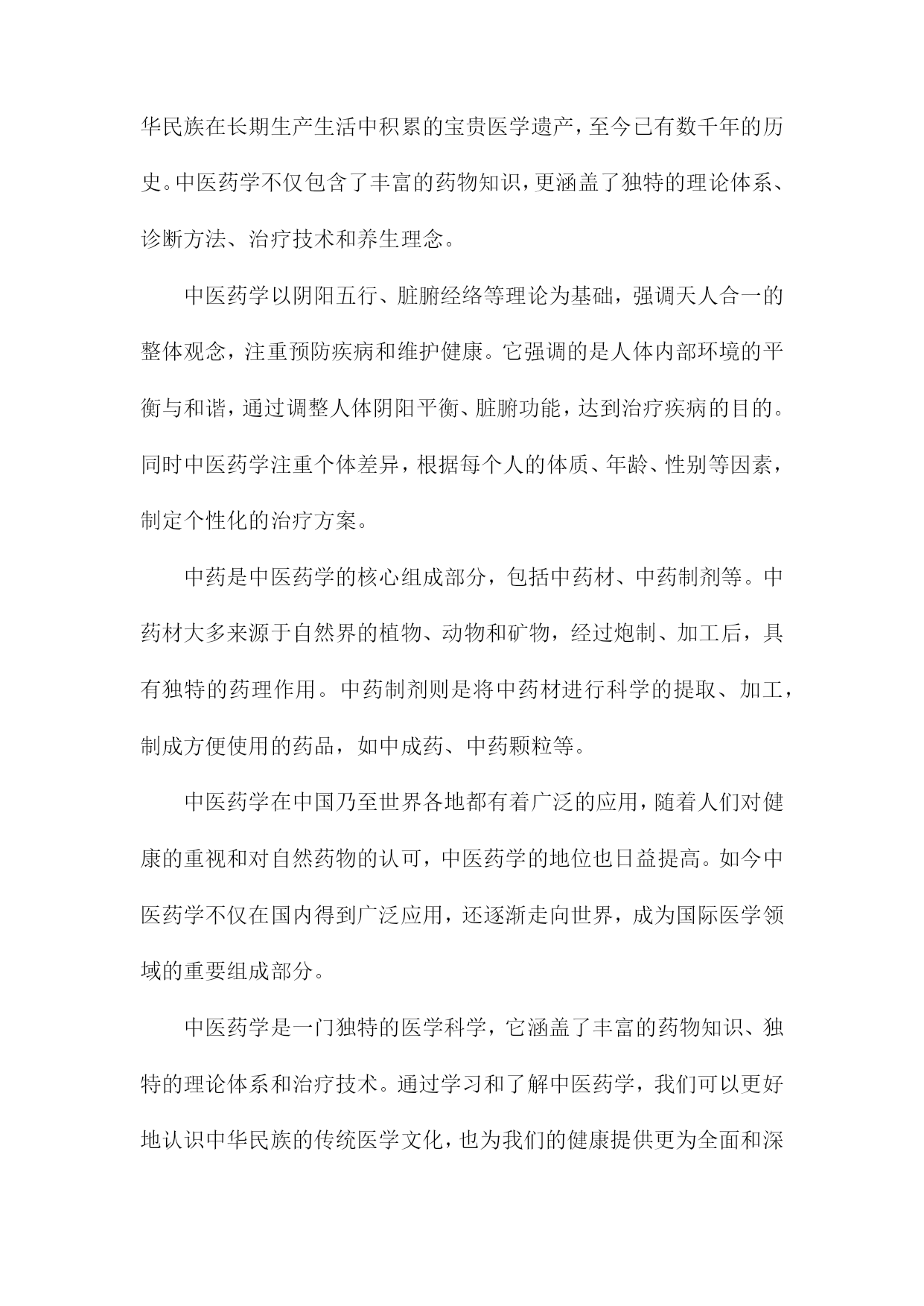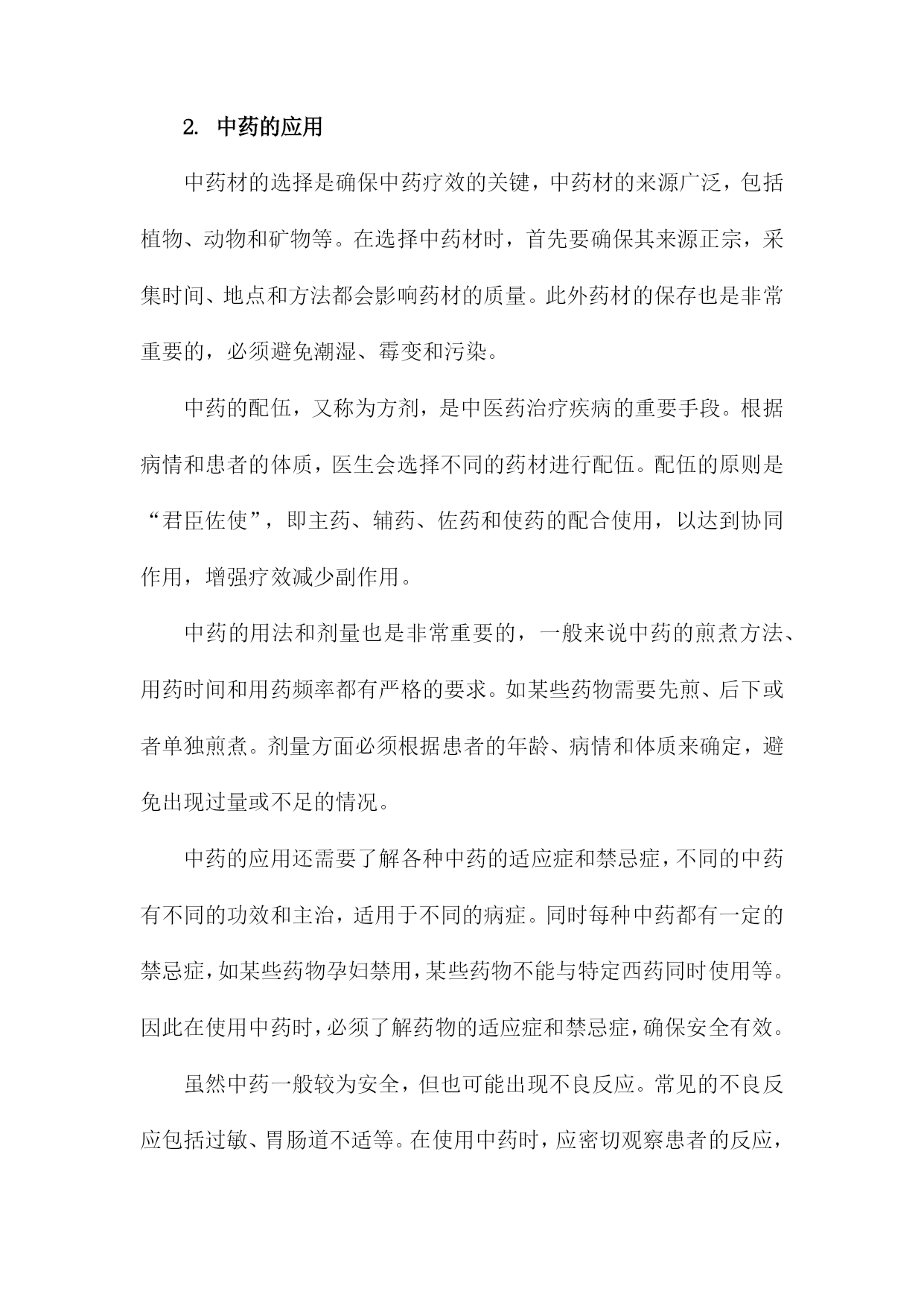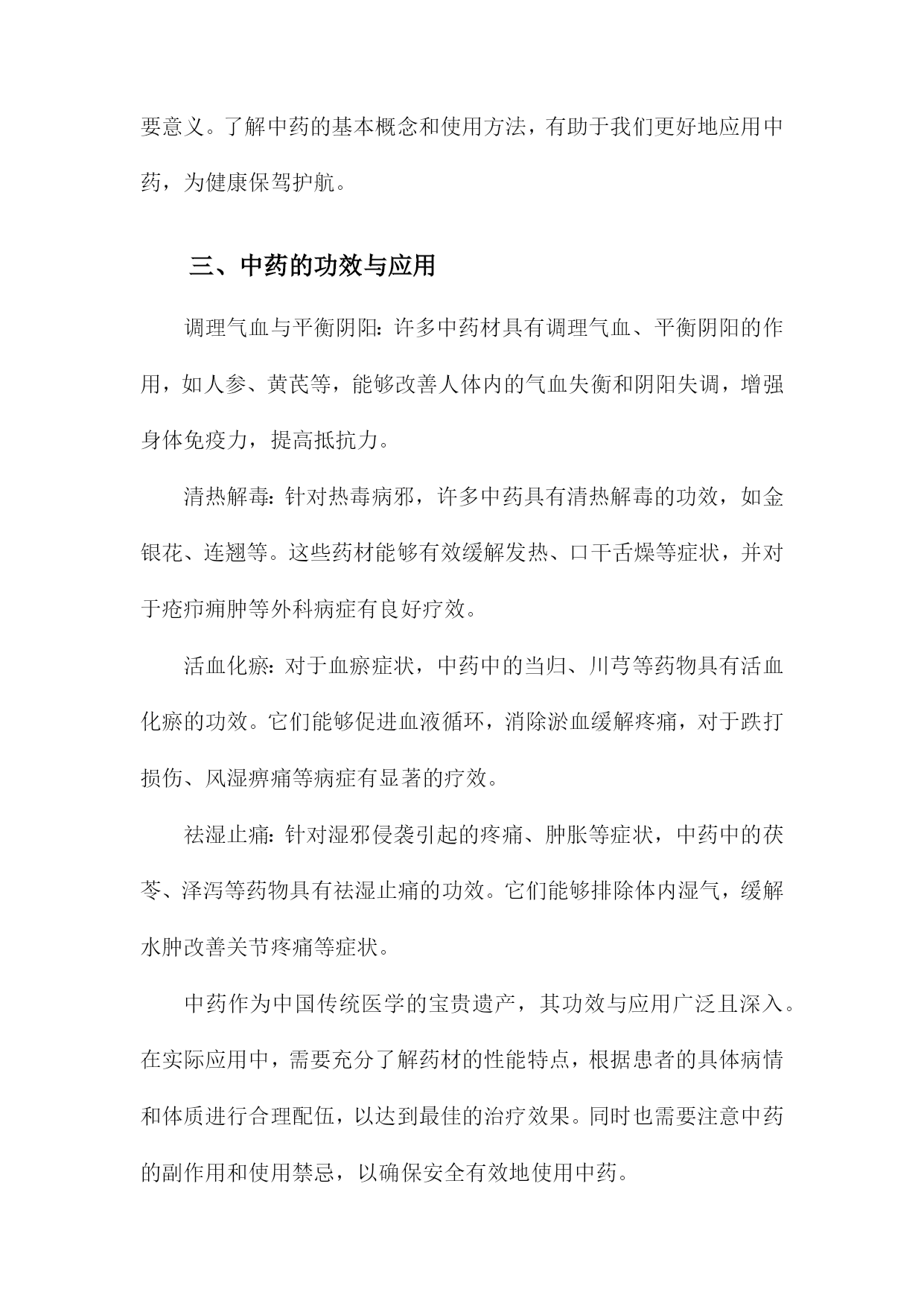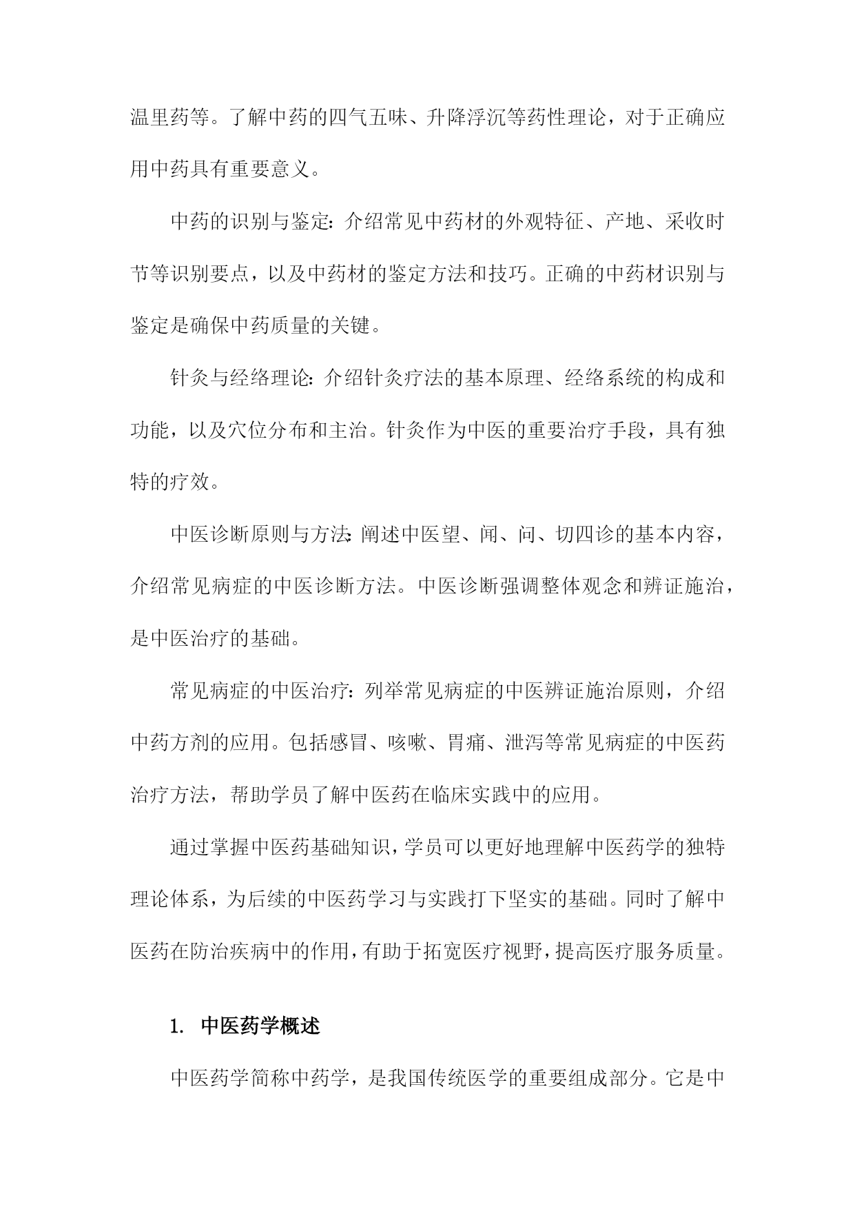 中医药知识培训讲义一、概括《中医药知识培训讲义》是一部系统性介绍中医药理论与实践的文献,旨在普及中医药知识,提升大众对中医药的认知和应用能力。本讲义内容涵盖了中医药的基本理论、药物知识、诊断方法、治疗原则以及实际应用等方面。通过本章节的学习,读者可以对中医药的基本概念有一个全面的了解,为后续深入学习中医药知识打下基础。同时中医药作为我国传统医学的瑰宝,对于维护人民健康、防治疾病具有重要意义,因此普及中医药知识,对于提高全民健康水平具有深远影响。1.培训目的和背景随着全球对自然疗法和传统医学的日益关注,中医药作为中国传统文化的瑰宝,其独特的理论和实践体系在全球范围内逐渐受到重视。在此背景下,为了普及中医药知识,提高公众对中医药的认知度和信任度,推动中医药事业的发展,我们特地编制了这份中医药知识培训讲义。本次培训的目的在于普及中医药基础知识,让参与者对中医药有一个全面而深入的了解。通过本次培训,我们希望达到以下几个目标:增强参与者对中医药的认知,理解中医药的独特理论体系和实践方法。理解中医药在现代医学中的地位和作用,以及其在全球范围内的发展趋势。背景方面随着人们对健康的需求日益增加,中医药因其独特的疗效和副作用较小的特点,正逐渐受到更多人的关注和认可。然而由于缺乏足够的了解和认识,仍有许多人对中医药持有疑虑和误解。因此普及中医药知识,提高公众对中医药的认知度和信任度,成为当前推动中医药事业发展的重要任务之一。本次培训讲义的内容涵盖了中医药的基本理论、药物学、诊断方法、治疗方法以及实际应用等方面,旨在通过系统的学习,使参与者对中医药有一个全面而深入的了解。同时我们还将结合实际案例,让参与者亲身体验中医药的魅力,从而更好地推广和应用中医药。2.中医药知识的重要性中医药学作为中华民族的瑰宝,蕴含着丰富的哲学思想和实践经验。学习和传承中医药知识,不仅是对传统文化的尊重与继承,更是对中华文明智慧的弘扬。通过中医药的学习,可以让我们更深入地理解中国古代文化的核心价值观,以及其在医学领域的具体应用。尽管现代医学在诸多领域取得了巨大成就,但面对许多复杂疾病时,仍有诸多挑战。中医药以其独特的理论体系和治疗方法,在许多疾病的治疗和康复过程中发挥着重要作用。例如在慢性病、亚健康状态以及康复医学等领域,中医药的疗效显著。同时随着现代医学的不断发展,中西医结合的诊疗模式也为我们提供了新的思路和方法。因此掌握中医药知识对于完善现代医疗体系具有重要意义。中医药强调治未病,注重预防和调养。在日常生活和工作中,了解中医药知识可以帮助我们更好地进行健康管理和自我调理。例如通过食疗、穴位按摩等方法,可以预防疾病的发生和发展。此外中医药在美容、养生等方面也具有独特优势,为人们提供了更多选择。随着全球化进程的推进,中医药在国际上的影响力逐渐扩大。掌握中医药知识,不仅有助于推动国际交流与合作,还可以将中国智慧推向世界,为人类健康事业做出贡献。同时通过与其他国家传统医学的交流与融合,可以丰富和发展中医药学的内涵和形式。中医药知识的重要性不仅体现在文化传承、现代医学价值、预防保健方面,还体现在国际交流与合作中。因此学习和掌握中医药知识对于每一个现代人来说都具有重要意义。二、中医药基础知识中药概述:介绍中药的定义、分类、药性理论和用药原则。中药的种类繁多,按照药物性质和作用可分为解表药、清热药、祛湿药、温里药等。了解中药的四气五味、升降浮沉等药性理论,对于正确应用中药具有重要意义。中药的识别与鉴定:介绍常见中药材的外观特征、产地、采收时节等识别要点,以及中药材的鉴定方法和技巧。正确的中药材识别与鉴定是确保中药质量的关键。针灸与经络理论:介绍针灸疗法的基本原理、经络系统的构成和功能,以及穴位分布和主治。针灸作为中医的重要治疗手段,具有独特的疗效。中医诊断原则与方法:阐述中医望、闻、问、切四诊的基本内容,介绍常见病症的中医诊断方法。中医诊断强调整体观念和辨证施治,是中医治疗的基础。常见病症的中医治疗:列举常见病症的中医辨证施治原则,介绍中药方剂的应用。包括感冒、咳嗽、胃痛、泄泻等常见病症的中医药治疗方法,帮助学员了解中医药在临床实践中的应用。通过掌握中医药基础知识,学员可以更好地理解中医药学的独特理论体系,为后续的中医药学习与实践打下坚实的基础。同时了解中医药在防治疾病中的作用,有助于拓宽医疗视野,提高医疗服务质量。1.中医药学概述中医药学简称中药学,是我国传统医学的重要组成部分。它是中华民族在长期生产生活中积累的宝贵医学遗产,至今已有数千年的历史。中医药学不仅包含了丰富的药物知识,更涵盖了独特的理论体系、诊断方法、治疗技术和养生理念。中医药学以阴阳五行、脏腑经络等理论为基础,强调天人合一的整体观念,注重预防疾病和维护健康。它强调的是
