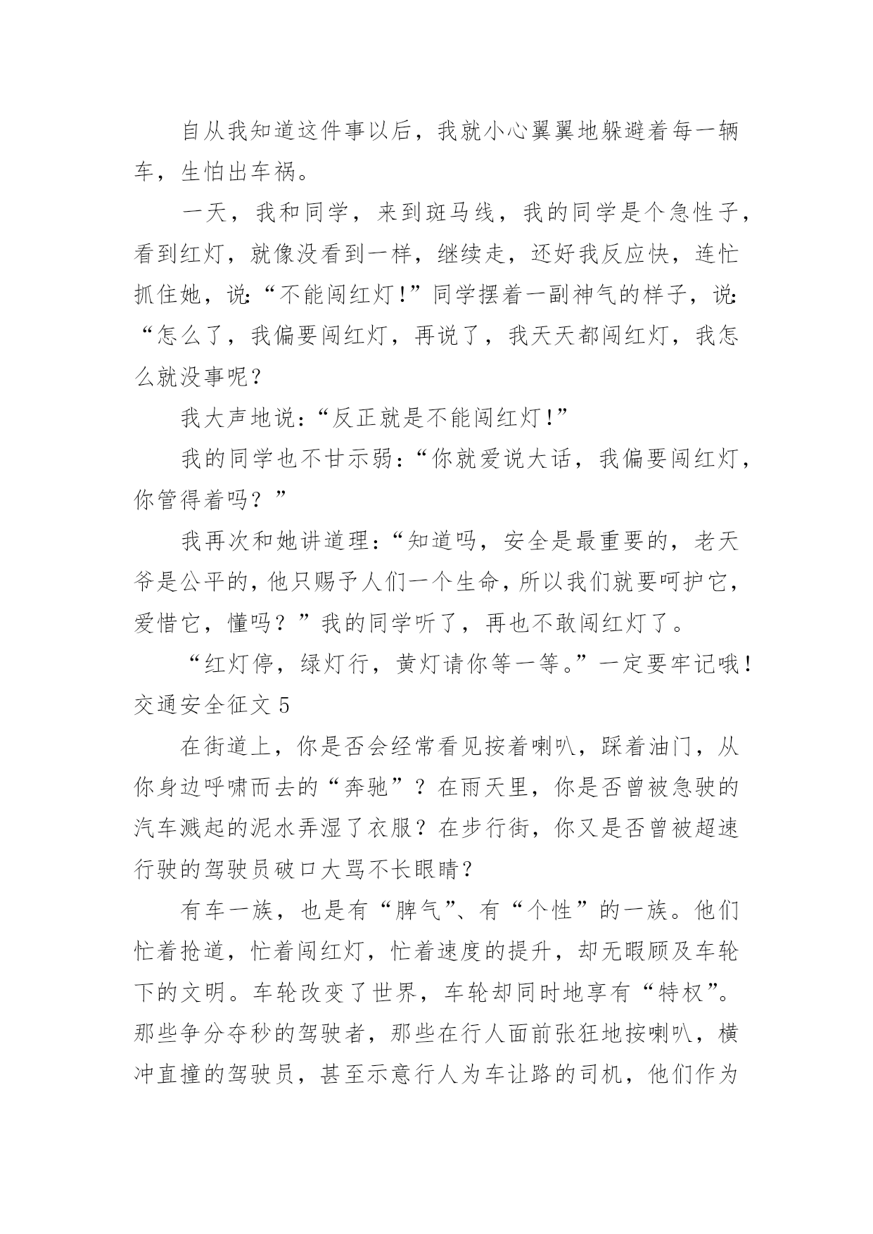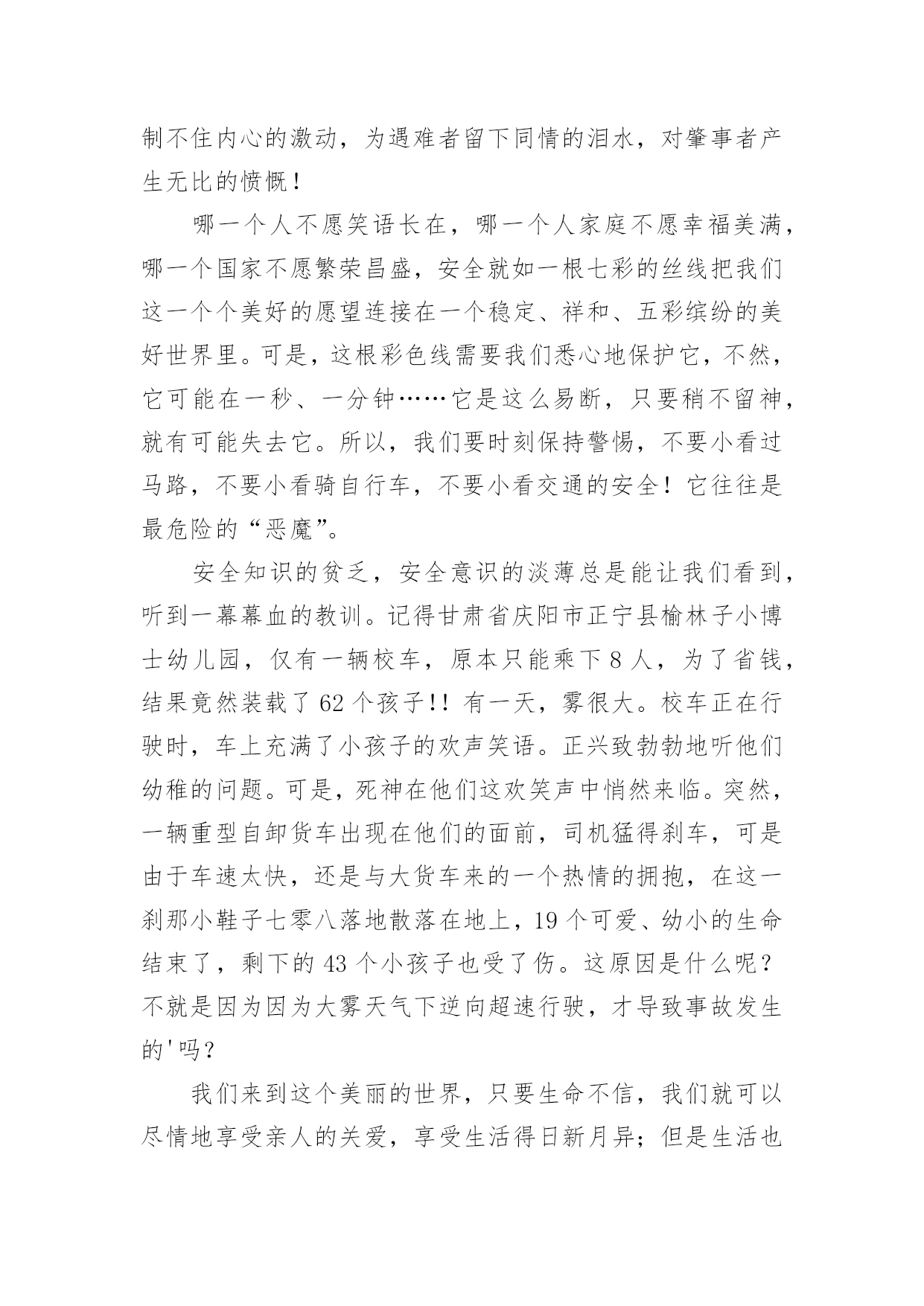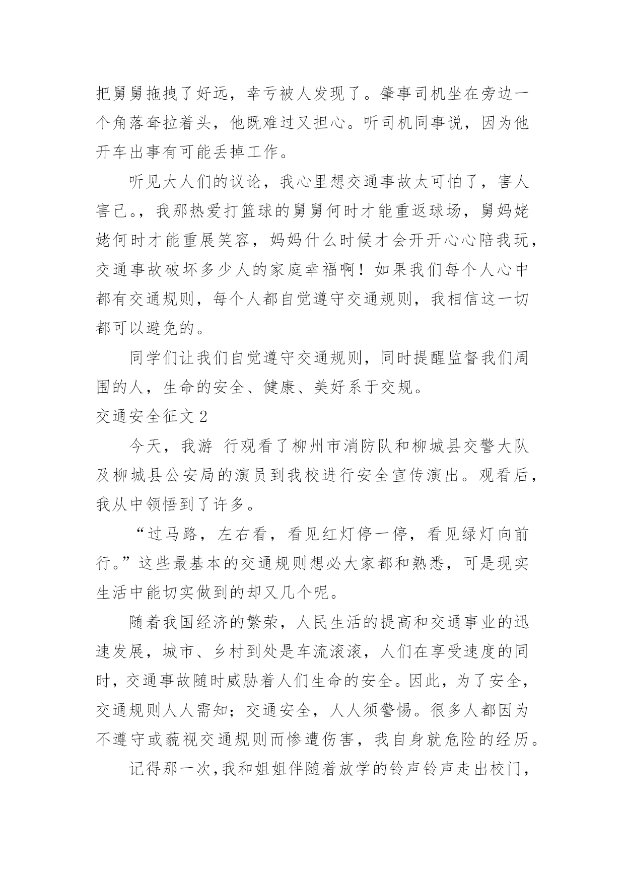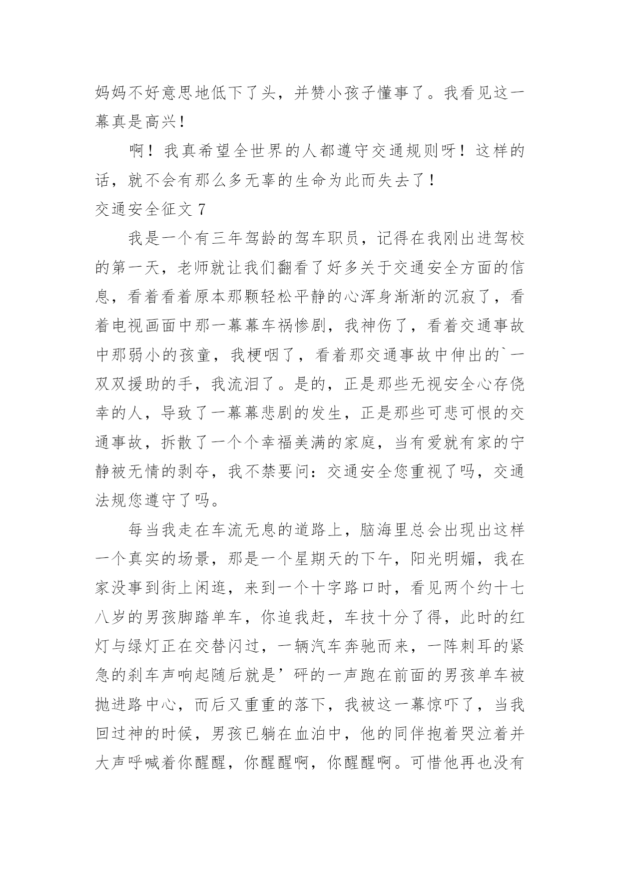 交通安全征文交通安全征文【精】在学习、工作乃至生活中,大家都写过征文吧,征文具有主题鲜明、内容清楚的特点。一篇什么样的征文才能称之为优秀征文呢?下面是小编为大家整理的交通安全征文,希望对大家有所帮助。交通安全征文1造物主给予我们生命,让我们来到这缤纷多彩的大千世界,感受亲情的美好,友情的珍贵,难道我们不应该珍惜这样的幸福吗?当我跟着爸妈在公园里游玩或在学校跟着老师做游戏,我感觉我的生活是多么幸福和美好!但是生活总有这样或那样的`小插曲打破这种宁静。那一天,我和妈妈正准备睡觉,突然接到舅妈的电话,在电话那边舅妈泣不成声“舅舅出事了,被大卡车撞倒了?”。妈妈着急地带着我赶往医院,在医院的长廊,我看见一个人大腿汩汩流血,血肉模糊,脸色惨白,听大人们着急地议论那就是舅舅。我连叫几声舅舅,可是舅舅已经昏迷过去了。姥姥和舅妈在旁边哭泣,见此情景我也吓得哭起来。过了一会儿,舅舅被推进急救室,大人们才镇静下来。原来舅舅骑电动摩托车转弯时,一辆大卡车闯红灯连人带车把舅舅拖拽了好远,幸亏被人发现了。肇事司机坐在旁边一个角落耷拉着头,他既难过又担心。听司机同事说,因为他开车出事有可能丢掉工作。听见大人们的议论,我心里想交通事故太可怕了,害人害己。,我那热爱打篮球的舅舅何时才能重返球场,舅妈姥姥何时才能重展笑容,妈妈什么时候才会开开心心陪我玩,交通事故破坏多少人的家庭幸福啊!如果我们每个人心中都有交通规则,每个人都自觉遵守交通规则,我相信这一切都可以避免的。同学们让我们自觉遵守交通规则,同时提醒监督我们周围的人,生命的安全、健康、美好系于交规。交通安全征文2今天,我游行观看了柳州市消防队和柳城县交警大队及柳城县公安局的演员到我校进行安全宣传演出。观看后,我从中领悟到了许多。“过马路,左右看,看见红灯停一停,看见绿灯向前行。”这些最基本的交通规则想必大家都和熟悉,可是现实生活中能切实做到的却又几个呢。随着我国经济的繁荣,人民生活的提高和交通事业的迅速发展,城市、乡村到处是车流滚滚,人们在享受速度的同时,交通事故随时威胁着人们生命的安全。因此,为了安全,交通规则人人需知;交通安全,人人须警惕。很多人都因为不遵守或藐视交通规则而惨遭伤害,我自身就危险的经历。记得那一次,我和姐姐伴随着放学的铃声铃声走出校门,一路上有说有笑,打打闹闹,一直注意路上来来往往的车辆。当走到小学路口时,需要绕道过马路,煤注意到过往的车辆,就直接本领过去。正当我们奔到马路中央时,突然一辆摩托车飞驰而来,只差一点点的距离就完全把我们刮倒,我们吓得呆立在了马路中央,半天魂收不回来,直到那骑着摩托车的男子回来严厉的批评,我们方回过神了,如今回想起那时的情景,心都还有余悸。从那以后,我深刻意识到了遵守交通规则的重要性。我虽然侥幸逃过了那劫数,可是现在却依然有太多太多的人死在了那无情的车轮下,他们连悔悟和反思的余地都没有,就在浑然中失去了鲜活的'生命。苏联著名作家奥斯特洛夫斯基说过,“人的最宝贵的是生命,而上天给人的生命只有一次。”的确,人的生命是异常宝贵的,失去了,就没有了,我们为什么不好好珍惜呢?同学们,行动起来吧,从我们中学生做起,自觉遵守交通规则,让我们身边减少悲剧的发生,让生活变得更加幸福,和谐。交通安全征文3我国是一个人口大国,人多车多,使道路显得更加拥挤。据统计,我国每年因车祸死亡人数超过10万人,其中,儿童死亡人数近2万人,居世界之首。平均每5分钟就有1人死于车祸,而不到半小时就有一个孩子葬身车轮,这是多么惊人的数字啊!在这背后,有多少个家庭失去欢乐,多少个亲人痛不欲生,多少个生命之花永远凋零。想到这些,我抑制不住内心的激动,为遇难者留下同情的泪水,对肇事者产生无比的愤慨!哪一个人不愿笑语长在,哪一个人家庭不愿幸福美满,哪一个国家不愿繁荣昌盛,安全就如一根七彩的丝线把我们这一个个美好的愿望连接在一个稳定、祥和、五彩缤纷的美好世界里。可是,这根彩色线需要我们悉心地保护它,不然,它可能在一秒、一分钟……它是这么易断,只要稍不留神,就有可能失去它。所以,我们要时刻保持警惕,不要小看过马路,不要小看骑自行车,不要小看交通的安全!它往往是最危险的“恶魔”。安全知识的贫乏,安全意识的淡薄总是能让我们看到,听到一幕幕血的教训。记得甘肃省庆阳市正宁县榆林子小博士幼儿园,仅有一辆校车,原本只能乘下8人,为了省钱,结果竟然装载了62个孩子!!有一天,雾很大。校车正在行驶时,车上充满了小孩子的欢声笑语。正兴致勃勃地听他们幼稚的问题。可是,死神在他们这欢笑声中悄然来临。突然,一辆重型自卸货车出现在他们的面前,司机猛得刹车,可是由于车速太快,还是与大货车来的一个热情的拥抱,在这一刹那小鞋子七零八落地散落在地上,19个可爱、幼小的生命结束了,剩下的43个小孩子也受了伤。这原因是什么呢?不就是因为因为大