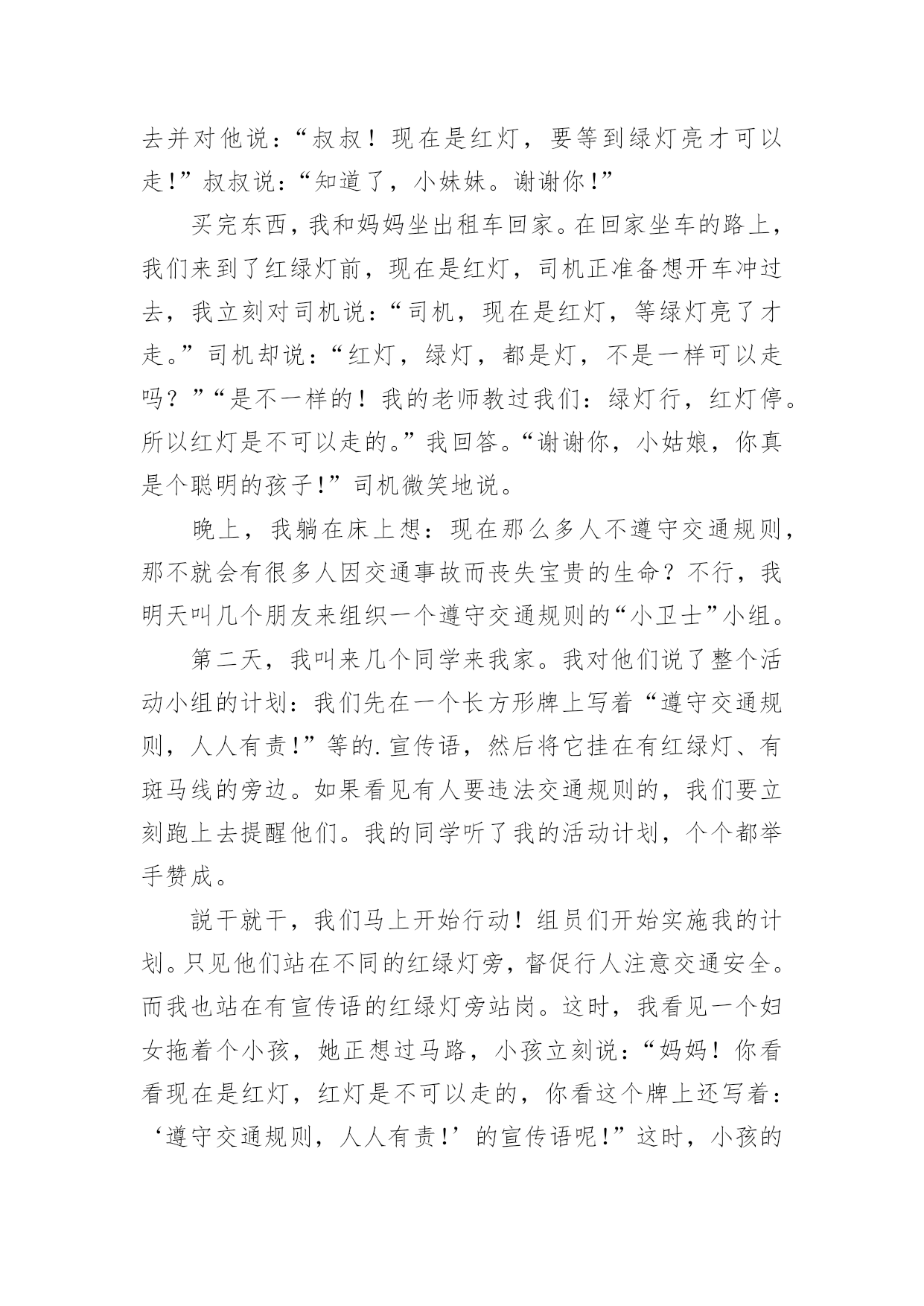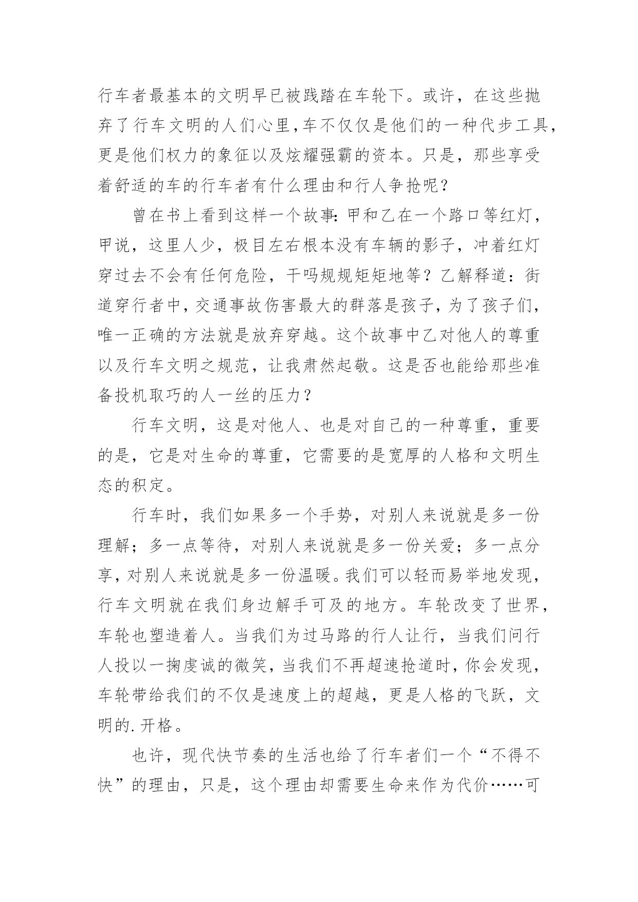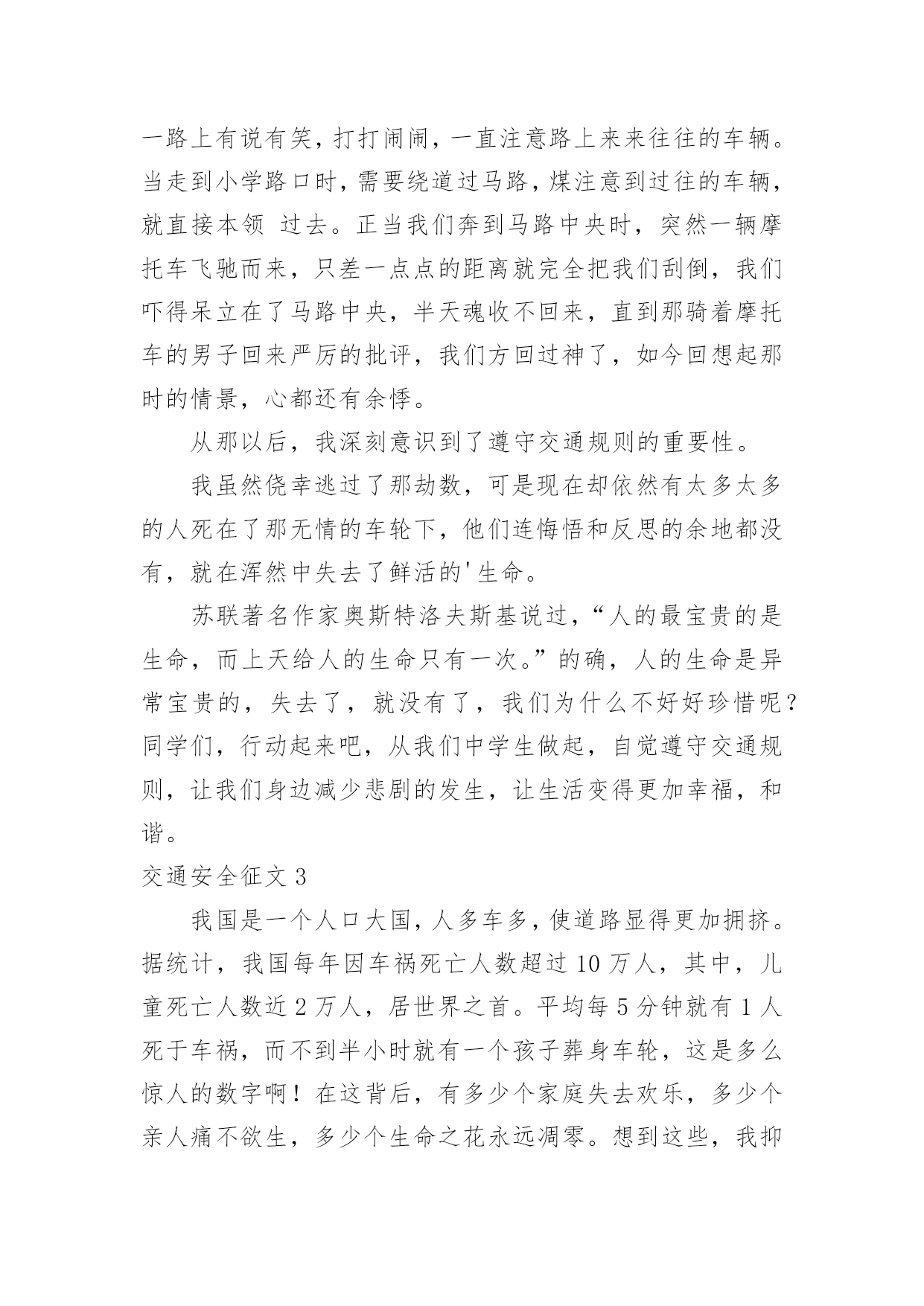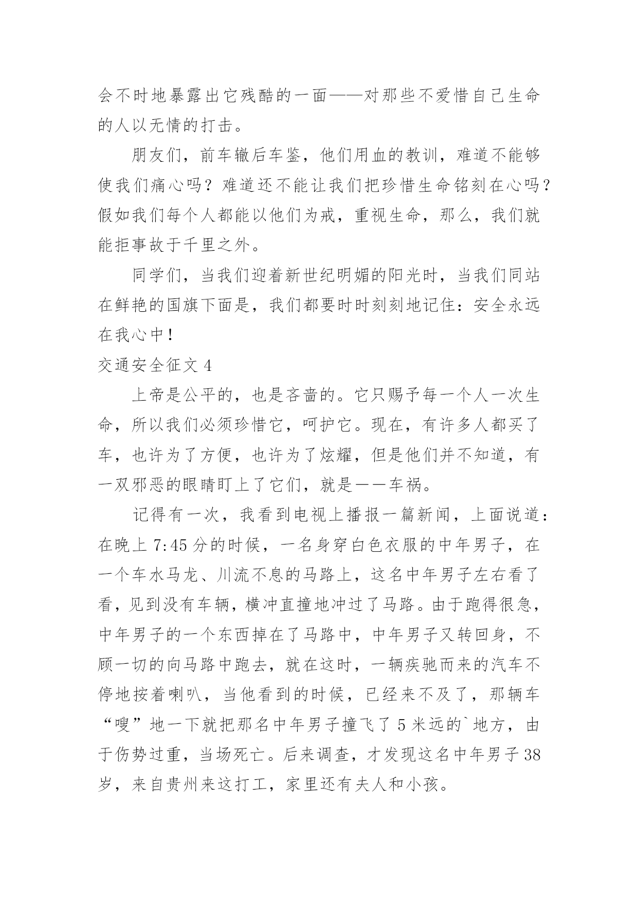 交通安全征文交通安全征文【精】在学习、工作乃至生活中,大家都写过征文吧,征文具有主题鲜明、内容清楚的特点。一篇什么样的征文才能称之为优秀征文呢?下面是小编为大家整理的交通安全征文,希望对大家有所帮助。交通安全征文1造物主给予我们生命,让我们来到这缤纷多彩的大千世界,感受亲情的美好,友情的珍贵,难道我们不应该珍惜这样的幸福吗?当我跟着爸妈在公园里游玩或在学校跟着老师做游戏,我感觉我的生活是多么幸福和美好!但是生活总有这样或那样的`小插曲打破这种宁静。那一天,我和妈妈正准备睡觉,突然接到舅妈的电话,在电话那边舅妈泣不成声“舅舅出事了,被大卡车撞倒了?”。妈妈着急地带着我赶往医院,在医院的长廊,我看见一个人大腿汩汩流血,血肉模糊,脸色惨白,听大人们着急地议论那就是舅舅。我连叫几声舅舅,可是舅舅已经昏迷过去了。姥姥和舅妈在旁边哭泣,见此情景我也吓得哭起来。过了一会儿,舅舅被推进急救室,大人们才镇静下来。原来舅舅骑电动摩托车转弯时,一辆大卡车闯红灯连人带车把舅舅拖拽了好远,幸亏被人发现了。肇事司机坐在旁边一个角落耷拉着头,他既难过又担心。听司机同事说,因为他开车出事有可能丢掉工作。听见大人们的议论,我心里想交通事故太可怕了,害人害己。,我那热爱打篮球的舅舅何时才能重返球场,舅妈姥姥何时才能重展笑容,妈妈什么时候才会开开心心陪我玩,交通事故破坏多少人的家庭幸福啊!如果我们每个人心中都有交通规则,每个人都自觉遵守交通规则,我相信这一切都可以避免的。同学们让我们自觉遵守交通规则,同时提醒监督我们周围的人,生命的安全、健康、美好系于交规。交通安全征文2今天,我游行观看了柳州市消防队和柳城县交警大队及柳城县公安局的演员到我校进行安全宣传演出。观看后,我从中领悟到了许多。“过马路,左右看,看见红灯停一停,看见绿灯向前行。”这些最基本的交通规则想必大家都和熟悉,可是现实生活中能切实做到的却又几个呢。随着我国经济的繁荣,人民生活的提高和交通事业的迅速发展,城市、乡村到处是车流滚滚,人们在享受速度的同时,交通事故随时威胁着人们生命的安全。因此,为了安全,交通规则人人需知;交通安全,人人须警惕。很多人都因为不遵守或藐视交通规则而惨遭伤害,我自身就危险的经历。记得那一次,我和姐姐伴随着放学的铃声铃声走出校门,一路上有说有笑,打打闹闹,一直注意路上来来往往的车辆。当走到小学路口时,需要绕道过马路,煤注意到过往的车辆,就直接本领过去。正当我们奔到马路中央时,突然一辆摩托车飞驰而来,只差一点点的距离就完全把我们刮倒,我们吓得呆立在了马路中央,半天魂收不回来,直到那骑着摩托车的男子回来严厉的批评,我们方回过神了,如今回想起那时的情景,心都还有余悸。从那以后,我深刻意识到了遵守交通规则的重要性。我虽然侥幸逃过了那劫数,可是现在却依然有太多太多的人死在了那无情的车轮下,他们连悔悟和反思的余地都没有,就在浑然中失去了鲜活的'生命。苏联著名作家奥斯特洛夫斯基说过,“人的最宝贵的是生命,而上天给人的生命只有一次。”的确,人的生命是异常宝贵的,失去了,就没有了,我们为什么不好好珍惜呢?同学们,行动起来吧,从我们中学生做起,自觉遵守交通规则,让我们身边减少悲剧的发生,让生活变得更加幸福,和谐。交通安全征文3我国是一个人口大国,人多车多,使道路显得更加拥挤。据统计,我国每年因车祸死亡人数超过10万人,其中,儿童死亡人数近2万人,居世界之首。平均每5分钟就有1人死于车祸,而不到半小时就有一个孩子葬身车轮,这是多么惊人的数字啊!在这背后,有多少个家庭失去欢乐,多少个亲人痛不欲生,多少个生命之花永远凋零。想到这些,我抑制不住内心的激动,为遇难者留下同情的泪水,对肇事者产生无比的愤慨!哪一个人不愿笑语长在,哪一个人家庭不愿幸福美满,哪一个国家不愿繁荣昌盛,安全就如一根七彩的丝线把我们这一个个美好的愿望连接在一个稳定、祥和、五彩缤纷的美好世界里。可是,这根彩色线需要我们悉心地保护它,不然,它可能在一秒、一分钟……它是这么易断,只要稍不留神,就有可能失去它。所以,我们要时刻保持警惕,不要小看过马路,不要小看骑自行车,不要小看交通的安全!它往往是最危险的“恶魔”。安全知识的贫乏,安全意识的淡薄总是能让我们看到,听到一幕幕血的教训。记得甘肃省庆阳市正宁县榆林子小博士幼儿园,仅有一辆校车,原本只能乘下8人,为了省钱,结果竟然装载了62个孩子!!有一天,雾很大。校车正在行驶时,车上充满了小孩子的欢声笑语。正兴致勃勃地听他们幼稚的问题。可是,死神在他们这欢笑声中悄然来临。突然,一辆重型自卸货车出现在他们的面前,司机猛得刹车,可是由于车速太快,还是与大货车来的一个热情的拥抱,在这一刹那小鞋子七零八落地散落在地上,19个可爱、幼小的生命结束了,剩下的43个小孩子也受了伤。这原因是什么呢?不就是因为因为大