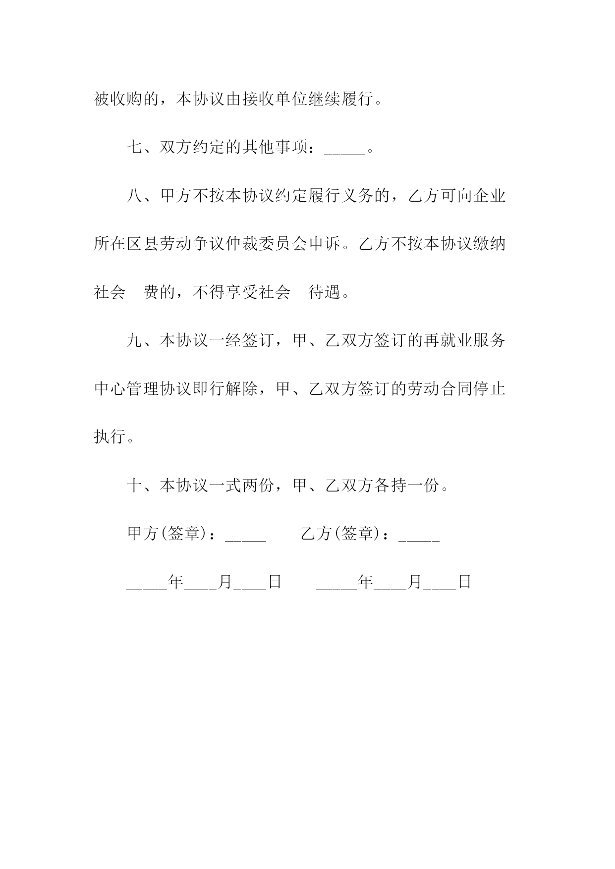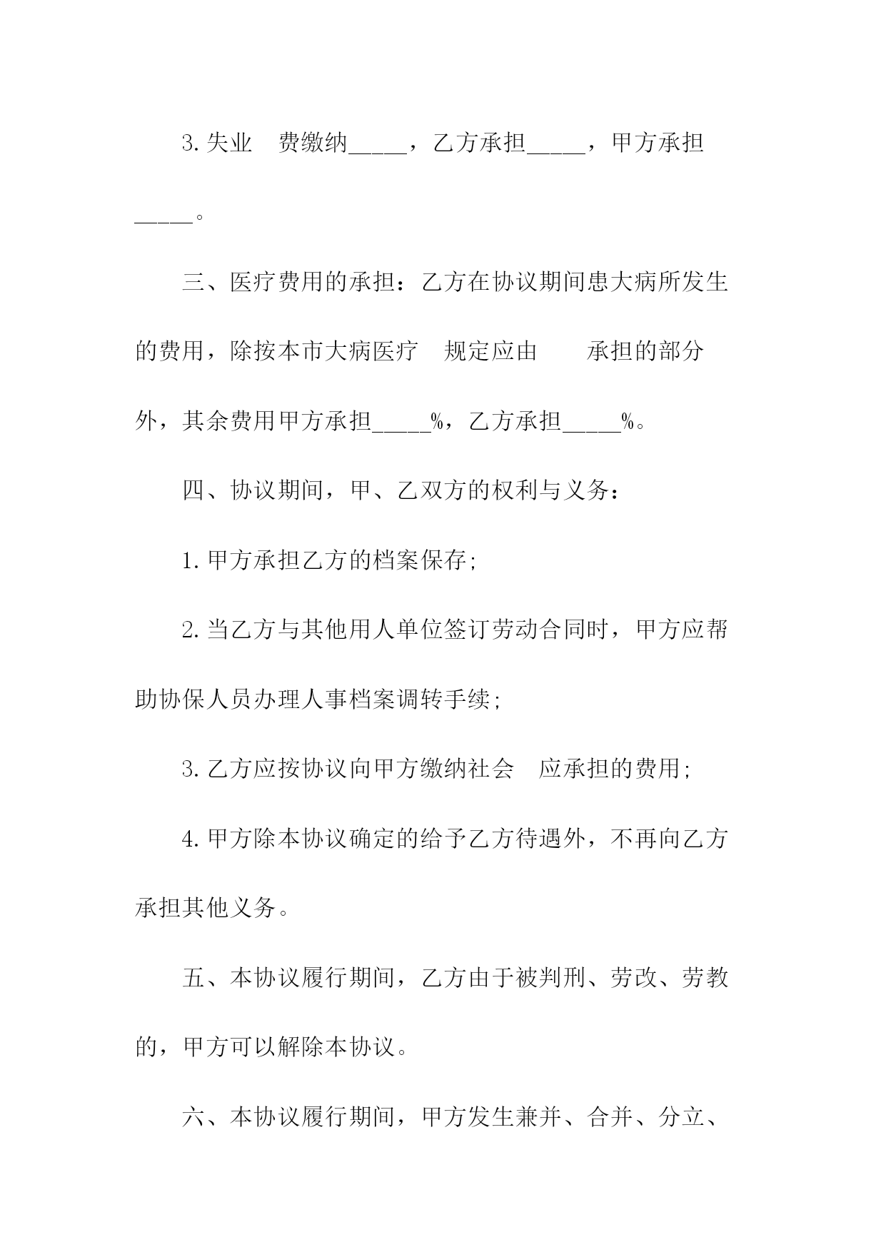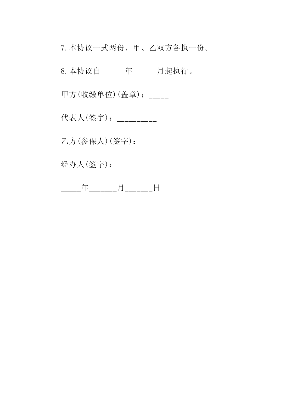 社会协议书甲方:_____(企业名称)乙方:_____(下岗职工)经双方协商一致,就保留社会关系期间和终结时双方权利义务达成如下协议:一、期限:自_____年_____月_____日至_____年_____月_____日止。二、养老、失业、大病医疗的缴纳:企业按国家和本市有关规定,为“协保”人员办理缴纳养老、失业、大病医疗三项社会手续。1.养老的缴费基数为_____,乙方承担_____,甲方承担_____;2.大病医疗缴费基数为_____,乙方承担_____,甲方承担_____;3.失业费缴纳_____,乙方承担_____,甲方承担_____。三、医疗费用的承担:乙方在协议期间患大病所发生的费用,除按本市大病医疗规定应由承担的部分外,其余费用甲方承担_____%,乙方承担_____%。四、协议期间,甲、乙双方的权利与义务:1.甲方承担乙方的档案保存;2.当乙方与其他用人单位签订劳动合同时,甲方应帮助协保人员办理人事档案调转手续;3.乙方应按协议向甲方缴纳社会应承担的费用;4.甲方除本协议确定的给予乙方待遇外,不再向乙方承担其他义务。五、本协议履行期间,乙方由于被判刑、劳改、劳教的,甲方可以解除本协议。六、本协议履行期间,甲方发生兼并、合并、分立、被收购的,本协议由接收单位继续履行。七、双方约定的其他事项:_____。八、甲方不按本协议约定履行义务的,乙方可向企业所在区县劳动争议仲裁委员会申诉。乙方不按本协议缴纳社会费的,不得享受社会待遇。九、本协议一经签订,甲、乙双方签订的再就业服务中心管理协议即行解除,甲、乙双方签订的劳动合同停止执行。十、本协议一式两份,甲、乙双方各持一份。甲方(签章):_____乙方(签章):__________年____月____日_____年____月____日个人委托存档人员参加养老、失业协议书甲方(收缴单位):______乙方(参保人):________根据______的有关规定,双方自愿签订如下协议:1.乙方确认原已(未)参加养老;已(未)参加失业。2.乙方同意按季或按半年、一年足额缴纳养老费。3.乙方同意每年一次性足额缴纳____个月的失业费。4.无论由于乙方何种原因未按规定时间缴费,发生缴费中断而产生的后果由乙方自己承担。5.甲方在规定时间内将乙方缴纳的社会费全额上缴______市社会管理中心。6.如协议中有与______市劳动和社会保障局新颁布规定不一致之处,按新颁布规定执行。7.本协议一式两份,甲、乙双方各执一份。8.本协议自______年______月起执行。甲方(收缴单位)(盖章):_____代表人(签字):__________乙方(参保人)(签字):_____经办人(签字):_______________年_______月_______日中国人寿公司解除担保协议甲方:中国公司_____市分公司住所:__________负责人:_________乙方姓名:________身份证号码:___________住所:__________:__________乙方于_____年_____月_____日与甲方签订了一份保证合同,自愿为甲方代理人_____提供担保,并承担连带保证责任。现乙方因_____原因向甲方提出解除原《保证合同》。经双方友好协商,达成如下协议:一、甲方同意从_____年_____月_____日起解除乙方对代理人_____的保证责任,原《保证合同》同时终止。二、自甲方同意乙方解除担保责任之日起______年内,如甲方发现代理人______在原乙方为其提供担保期间有违反有关法律法规规定及代理合同约定并给甲方造成损失的,乙方仍应在原担保责任范围内承担连带保证责任。如双方因此产生纠纷,仍可向甲方所在地有管辖权的人民法院提起诉讼。三、未尽事宜,甲、乙双方另行协商决定。四、本协议自双方签字或盖章后生效。五、本协议一式三份,甲、乙双方及代理人_____各执一份。甲方(盖章):_____负责人(签字):_____乙方:(签字)____________年_____月_____日居间合约书合约书编号:_______立合约书人:_______代理人股份(以下称甲方)_______先生/女士(以下称乙方)兹因乙方同意为甲方报告订立契约之机会,双方依诚实信用原则订立居间合约如下:第一条合意事项双方依本合约之约定成立居间关系,不适用其它劳务关系相关约定或规定,乙方同意为甲方寻觅及指示可与其签订契约之相对人,而提供签约之机会。第二条居间报酬契约因乙方之居间而成立生效,并逾契约撤销期限确定生效后,乙方始得按甲方之相关报酬标准支领报酬。第三条合约期间本合约自甲方完成相关程序并核定生效日起生效,乙方无异议同意以甲方核定之生效日为准。本合约以个_______月为一期,每期届满后一个月内如