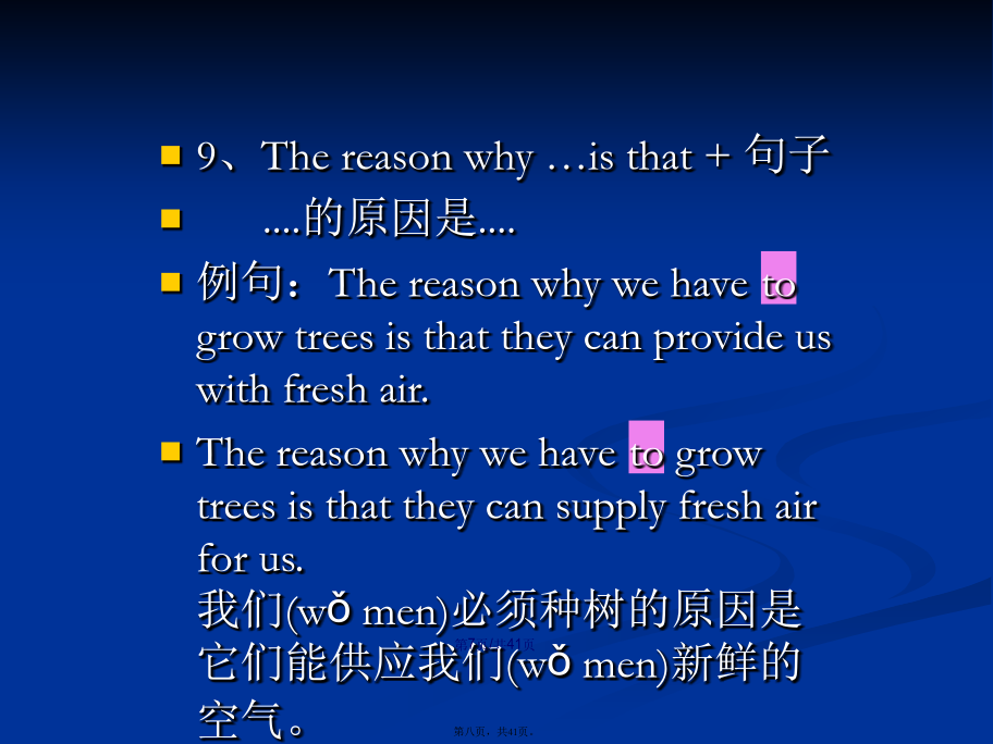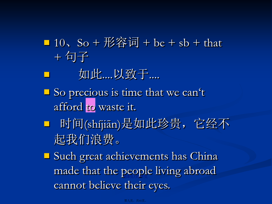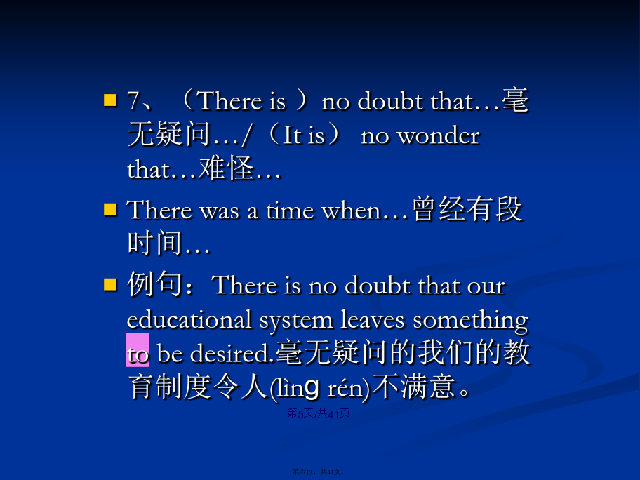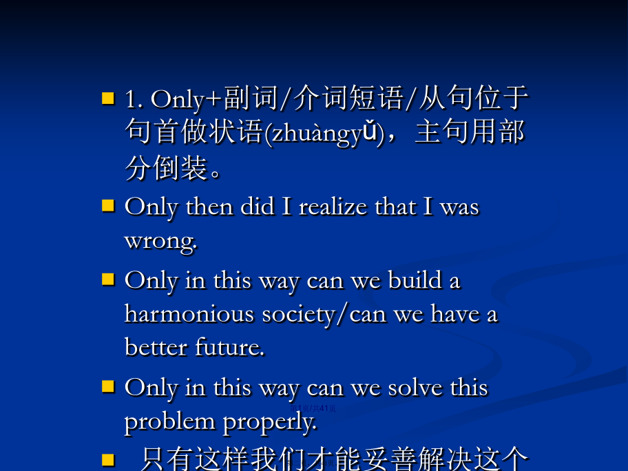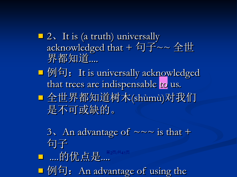 会计学1.Only+副词/介词短语/从句位于句首做状语(zhuàngyǔ),主句用部分倒装。OnlythendidIrealizethatIwaswrong.Onlyinthiswaycanwebuildaharmonioussociety/canwehaveabetterfuture.Onlyinthiswaycanwesolvethisproblemproperly.只有这样我们才能妥善解决这个问题。Onlywhenwegrowupcanweunderstandwhatparentsmeantous.2、Itis(atruth)universallyacknowledgedthat+句子~~全世界都知道....例句:Itisuniversallyacknowledgedthattreesareindispensabletous.全世界都知道树木(shùmù)对我们是不可或缺的。3、Anadvantageof~~~isthat+句子....的优点是....例句:Anadvantageofusingthesolarenergyisthatitwon’tcreate(produce)anypollution.使用太阳能的优点是它不会制造任何污染。6、强调(qiángdiào)句Itisexactlythewaywespeakthatmakesourteacherangry.Itisnot….but…thatcounts/matters.不是…而是…重要Itisnothowmuchyoureadbutwhatyoureadthatcounts/matters(重要,有关系).书读多少并不重要,重要的是你读的是什么.7、(Thereis)nodoubtthat…毫无疑问…/(Itis)nowonderthat…难怪…Therewasatimewhen…曾经有段时间…例句:Thereisnodoubtthatoureducationalsystemleavessomethingtobedesired.毫无疑问的我们的教育制度令人(lìnɡrén)不满意。8、Itislikely/possible/probablethat…很可能…SbbelikelytodosthThereisachancethat…Chancesarethat…有…的可能性Itisobvious/evident/apparentthat+句子很明显…Itisconceivablethat+句子可想而知…例句:Itisconceivablethatknowledgeplaysanimportantroleinourlife.可想而知,知识在我们的一生中扮演一个重要(zhòngyào)的角色。9、Thereasonwhy…isthat+句子....的原因是....例句:Thereasonwhywehavetogrowtreesisthattheycanprovideuswithfreshair.Thereasonwhywehavetogrowtreesisthattheycansupplyfreshairforus.我们(wǒmen)必须种树的原因是它们能供应我们(wǒmen)新鲜的空气。10、So+形容词+be+sb+that+句子如此....以致于....Sopreciousistimethatwecan‘taffordtowasteit.时间(shíjiān)是如此珍贵,它经不起我们浪费。SuchgreatachievementshasChinamadethatthepeoplelivingabroadcannotbelievetheireyes.11、Adj+as/though+Sb+be尽管....例句:Richasourcountryis,thequalitiesofourlivingarebynomeanssatisfactory.{bynomeans=innoway=onnoaccount=atnotime一点也不}虽然我们的国家(guójiā)富有,我们的生活品质绝对令人不满意。Angryas/thoughhewas,hemanagedtospeakcarmly.Childasheis,heisveryknowledgeable.Tryashemight,hestillcould’tworkouttheproblem.12、The+more+Adj+S+V,the+more+Adj+S+V愈....愈....例句:Theharderyouwork,themoreprogressyoumake.你愈努力,你愈进步(jìnbù)。Themorebooksweread,themore