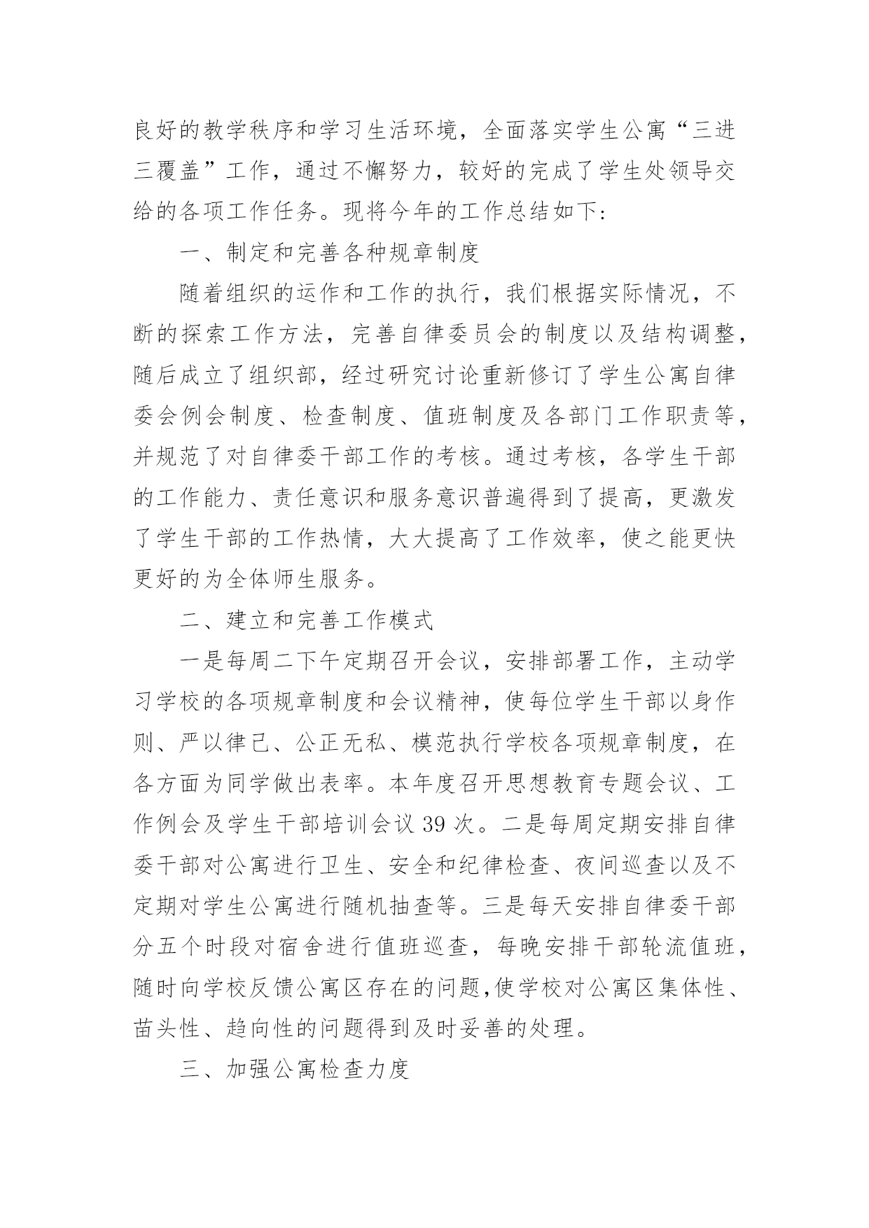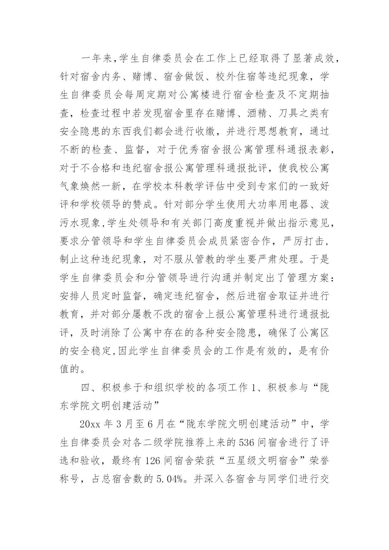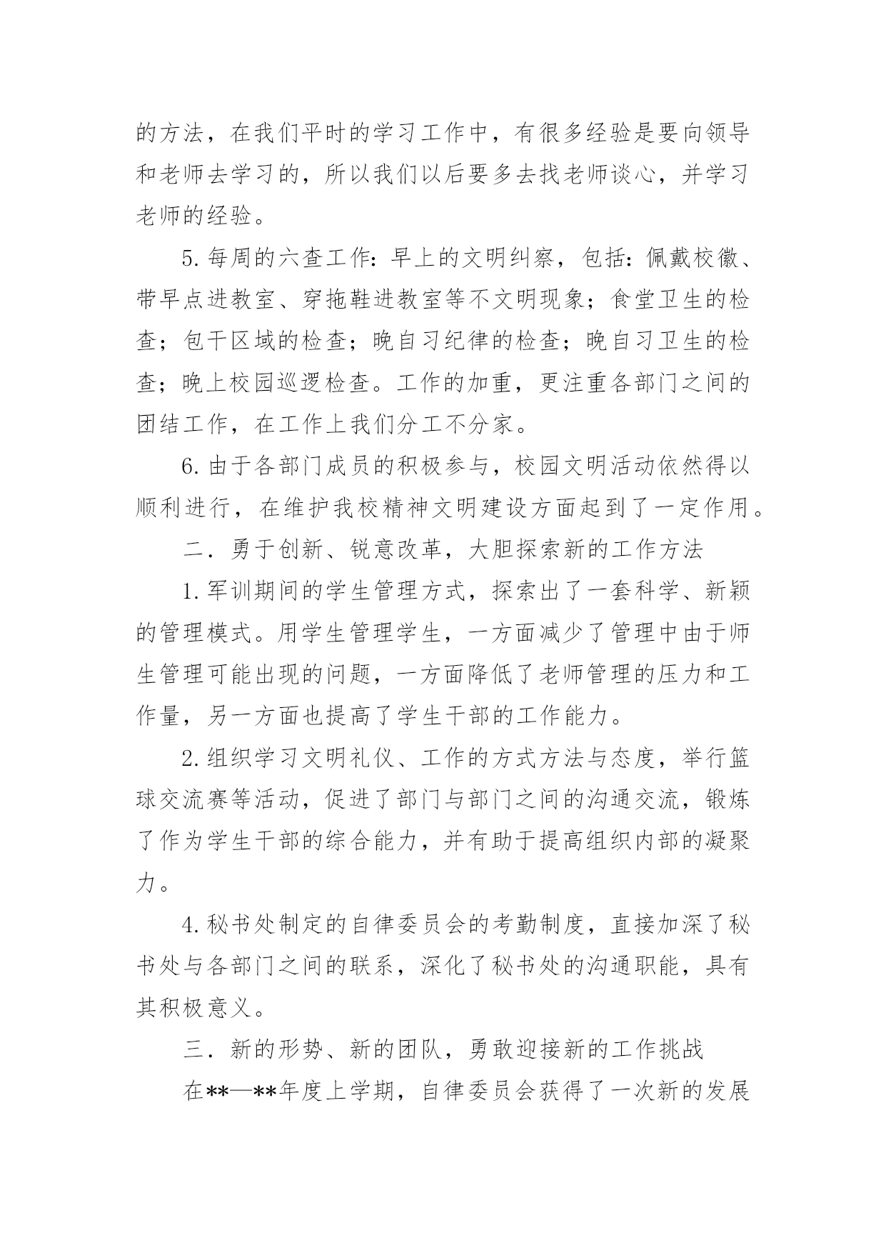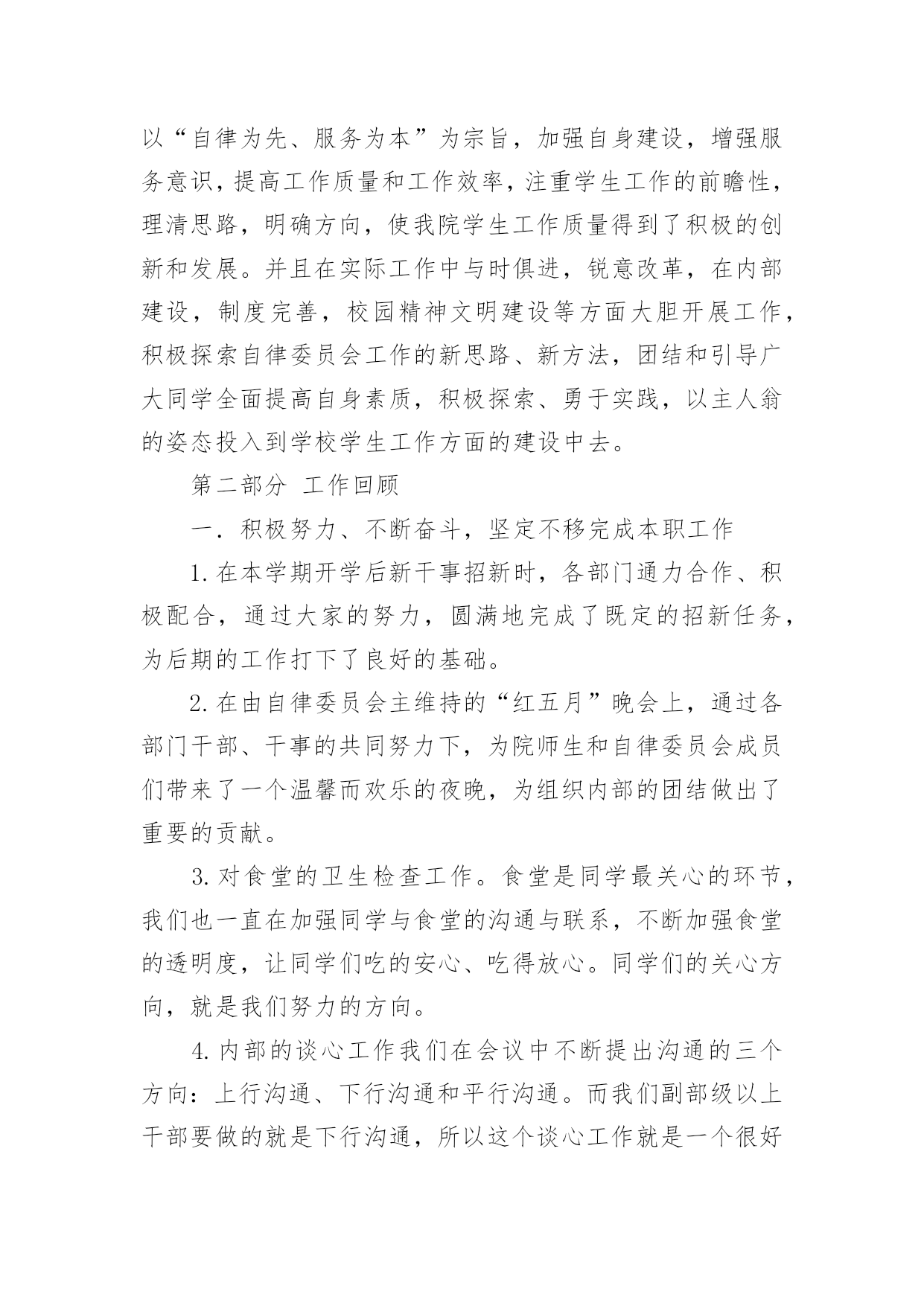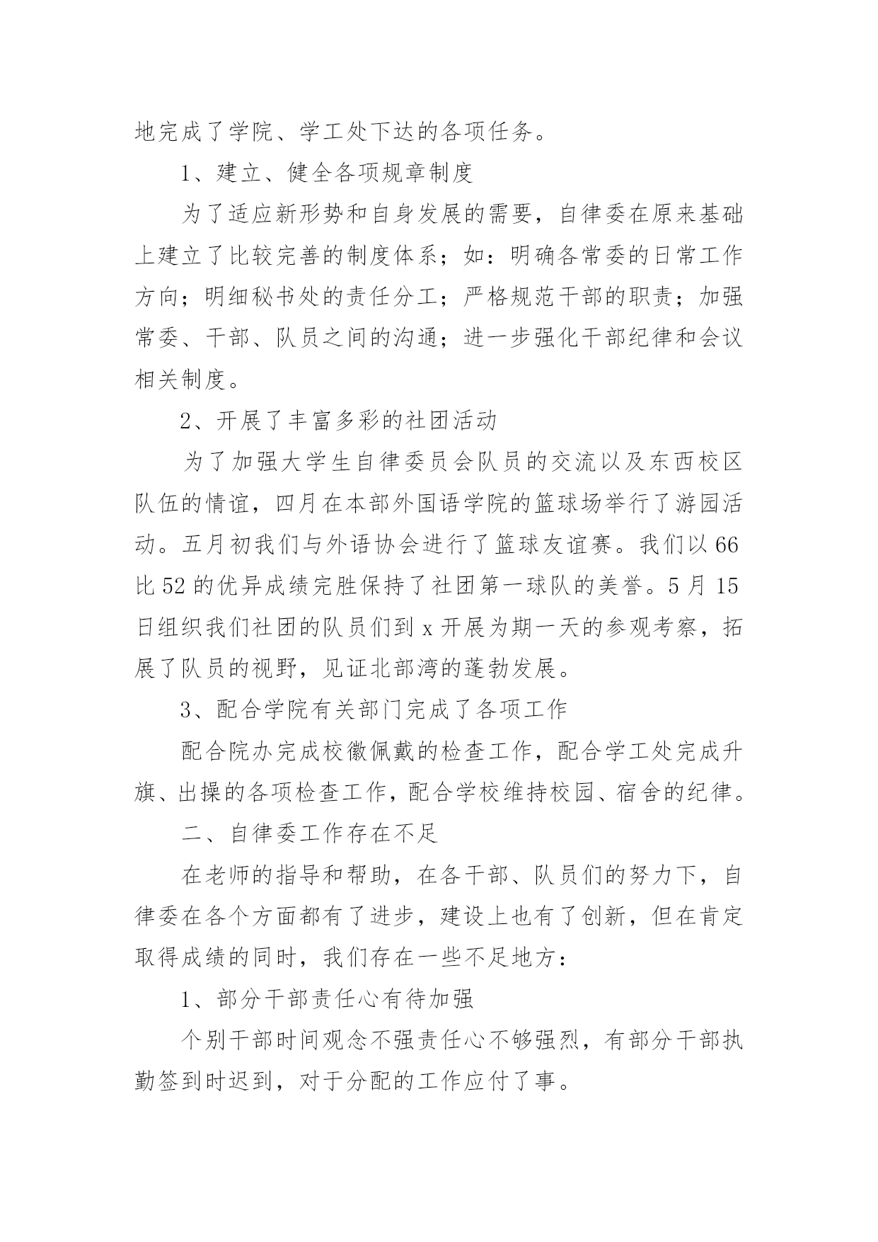 自律委员会工作总结自律委员会工作总结(15篇)总结是事后对某一时期、某一项目或某些工作进行回顾和分析,从而做出带有规律性的结论,它可以给我们下一阶段的学习和工作生活做指导,让我们一起认真地写一份总结吧。我们该怎么去写总结呢?以下是小编整理的自律委员会工作总结,仅供参考,大家一起来看看吧。自律委员会工作总结1尊敬的处长、老师、各位嘉宾、队员们:大家晚上好!我受大学生自律委员会的委托,向大会作工作报告。请予审议,并请各位领导、老师、队员提出宝贵的意见。工作报告分为三部分:一、20xx年春季学期的工作取得成绩:在过去的一个学期中,我们以马克思列宁主义、毛泽东思想、邓小平理论和“三个代表'”重要思想、以及科学发展观作为指导,在院党委的正确领导下,在学工处的悉心指导下,努力培养同学“自我、自我管理、自我服务、自我提高”的意识,积极探索,勇于实践,为学院的校园文化与纪律做出了应有的贡献,得到了学校领导的赞扬和同学们的肯定。在工作中,我们继续发扬优秀作风,勤勤恳恳,兢兢业业,以严谨、严格、严密的工作作风对待每一项工作。出色地完成了学院、学工处下达的各项任务。1、建立、健全各项规章制度为了适应新形势和自身发展的需要,自律委在原来基础上建立了比较完善的制度体系;如:明确各常委的日常工作方向;明细秘书处的责任分工;严格规范干部的职责;加强常委、干部、队员之间的沟通;进一步强化干部纪律和会议相关制度。2、开展了丰富多彩的社团活动为了加强大学生自律委员会队员的交流以及东西校区队伍的情谊,四月在本部外国语学院的篮球场举行了游园活动。五月初我们与外语协会进行了篮球友谊赛。我们以66比52的优异成绩完胜保持了社团第一球队的美誉。5月15日组织我们社团的队员们到x开展为期一天的参观考察,拓展了队员的视野,见证北部湾的蓬勃发展。3、配合学院有关部门完成了各项工作配合院办完成校徽佩戴的检查工作,配合学工处完成升旗、出操的各项检查工作,配合学校维持校园、宿舍的纪律。二、自律委工作存在不足在老师的指导和帮助,在各干部、队员们的努力下,自律委在各个方面都有了进步,建设上也有了创新,但在肯定取得成绩的同时,我们存在一些不足地方:1、部分干部责任心有待加强个别干部时间观念不强责任心不够强烈,有部分干部执勤签到时迟到,对于分配的工作应付了事。2、秘书处人员不足自秘书处日常工作任务繁重,由于人员不足,秘书处人员比较烦累。三、20xx年秋季工作计划1、进一步完善自律委的执勤制度、奖惩制度对于有突出贡献者给予一定的奖励,对于工作任务实行责任问责制。2、积极吸纳综合能力强的干事定于10月31和11月1日晚合班一处,招收新一届干事。3、开展有益于社团发展的活动外出进行考察具体地点待议。初步预定地点为:xxx。4、积极开展与其他社团交流活动如:与外语协会进行篮球友谊赛、与动漫城堡进行排球友谊赛等。以上大学生自律委的工作,如有未完善的地方忘见谅,我们会不断努力去健全。我的汇报到此结束,望在座的各位提出宝贵的意见和建议。谢谢!自律委员会工作总结220xx年,学生自律委员会在学生处的领导下,坚持以学生公寓为工作中心,坚持以“全心全意为同学服务”思想为宗旨,充分发挥“自我教育、自我管理、自我约束、自我服务”的精神,维护校规校纪,倡导良好的校风、学风,促进同学之间,同学与教职工之间的团结与沟通,协助学校建设良好的教学秩序和学习生活环境,全面落实学生公寓“三进三覆盖”工作,通过不懈努力,较好的完成了学生处领导交给的各项工作任务。现将今年的工作总结如下:一、制定和完善各种规章制度随着组织的运作和工作的执行,我们根据实际情况,不断的探索工作方法,完善自律委员会的制度以及结构调整,随后成立了组织部,经过研究讨论重新修订了学生公寓自律委会例会制度、检查制度、值班制度及各部门工作职责等,并规范了对自律委干部工作的考核。通过考核,各学生干部的工作能力、责任意识和服务意识普遍得到了提高,更激发了学生干部的工作热情,大大提高了工作效率,使之能更快更好的为全体师生服务。二、建立和完善工作模式一是每周二下午定期召开会议,安排部署工作,主动学习学校的各项规章制度和会议精神,使每位学生干部以身作则、严以律己、公正无私、模范执行学校各项规章制度,在各方面为同学做出表率。本年度召开思想教育专题会议、工作例会及学生干部培训会议39次。二是每周定期安排自律委干部对公寓进行卫生、安全和纪律检查、夜间巡查以及不定期对学生公寓进行随机抽查等。三是每天安排自律委干部分五个时段对宿舍进行值班巡查,每晚安排干部轮流值班,随时向学校反馈公寓区存在的问题,使学校对公寓区集体性、苗头性、趋向性的问题得到及时妥善的处理。三、加强公寓检查力度一年来,学生自律委员会在工作上已经取得了显著成效,针对宿舍内务、赌博、宿舍做饭、校外住宿等违纪现象,学生自