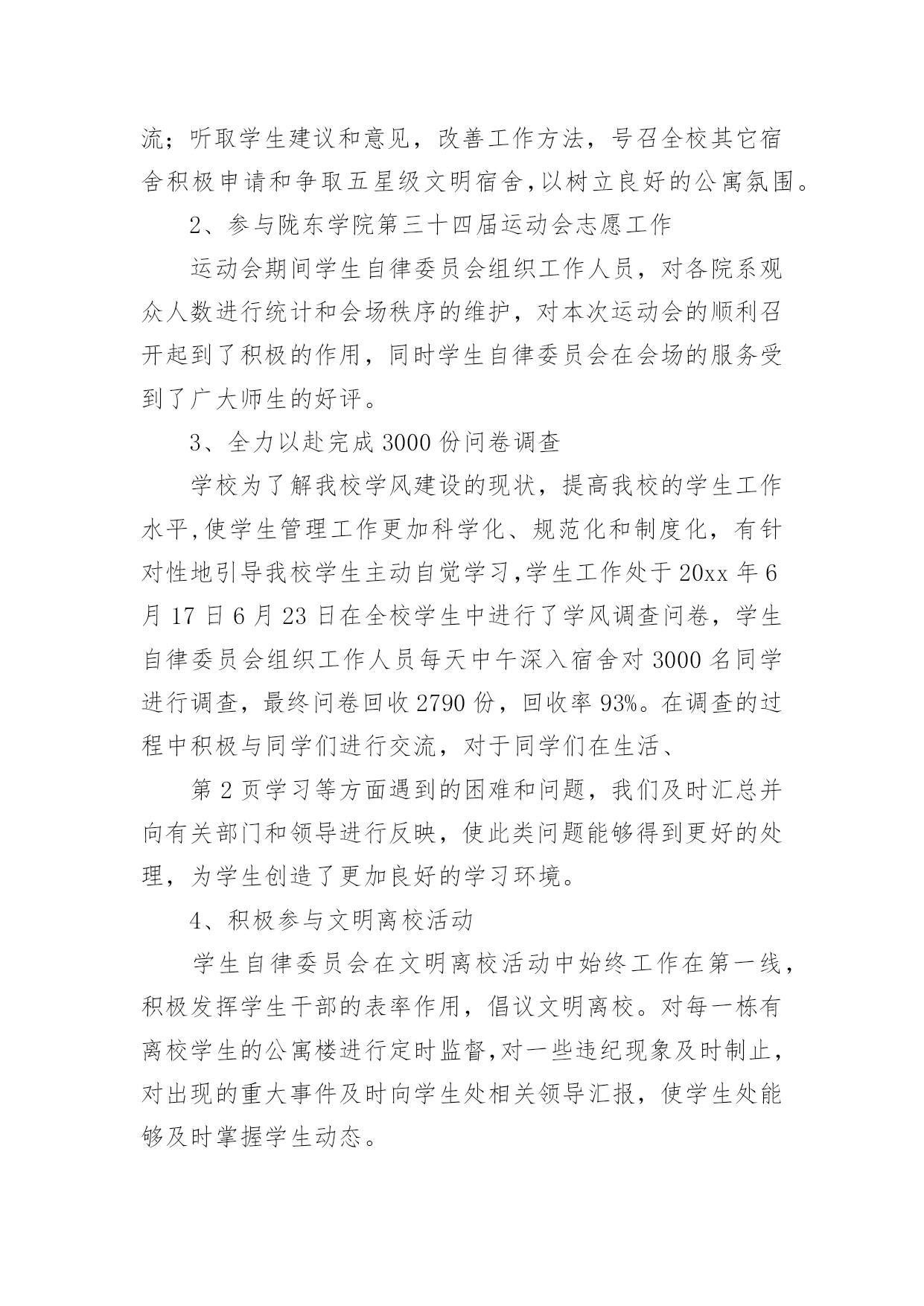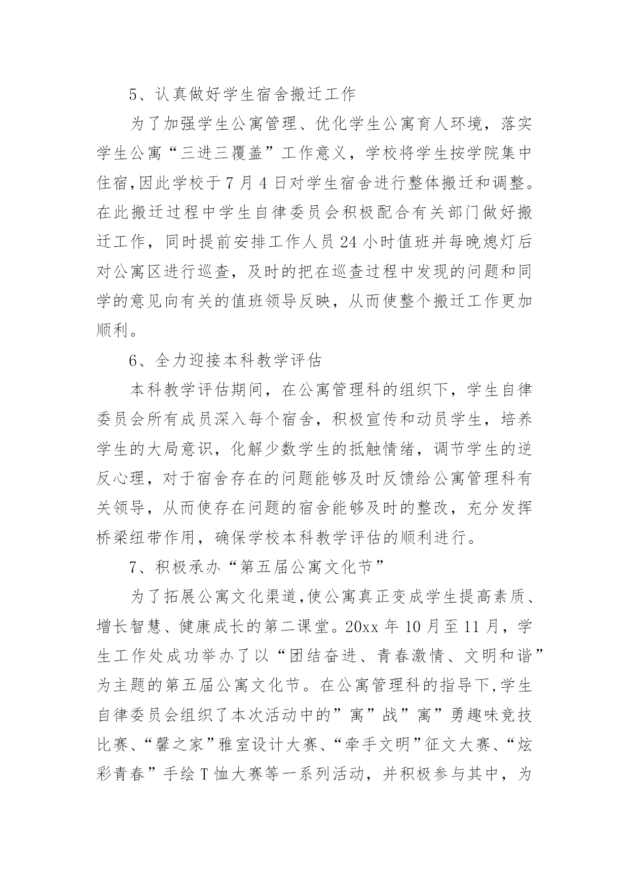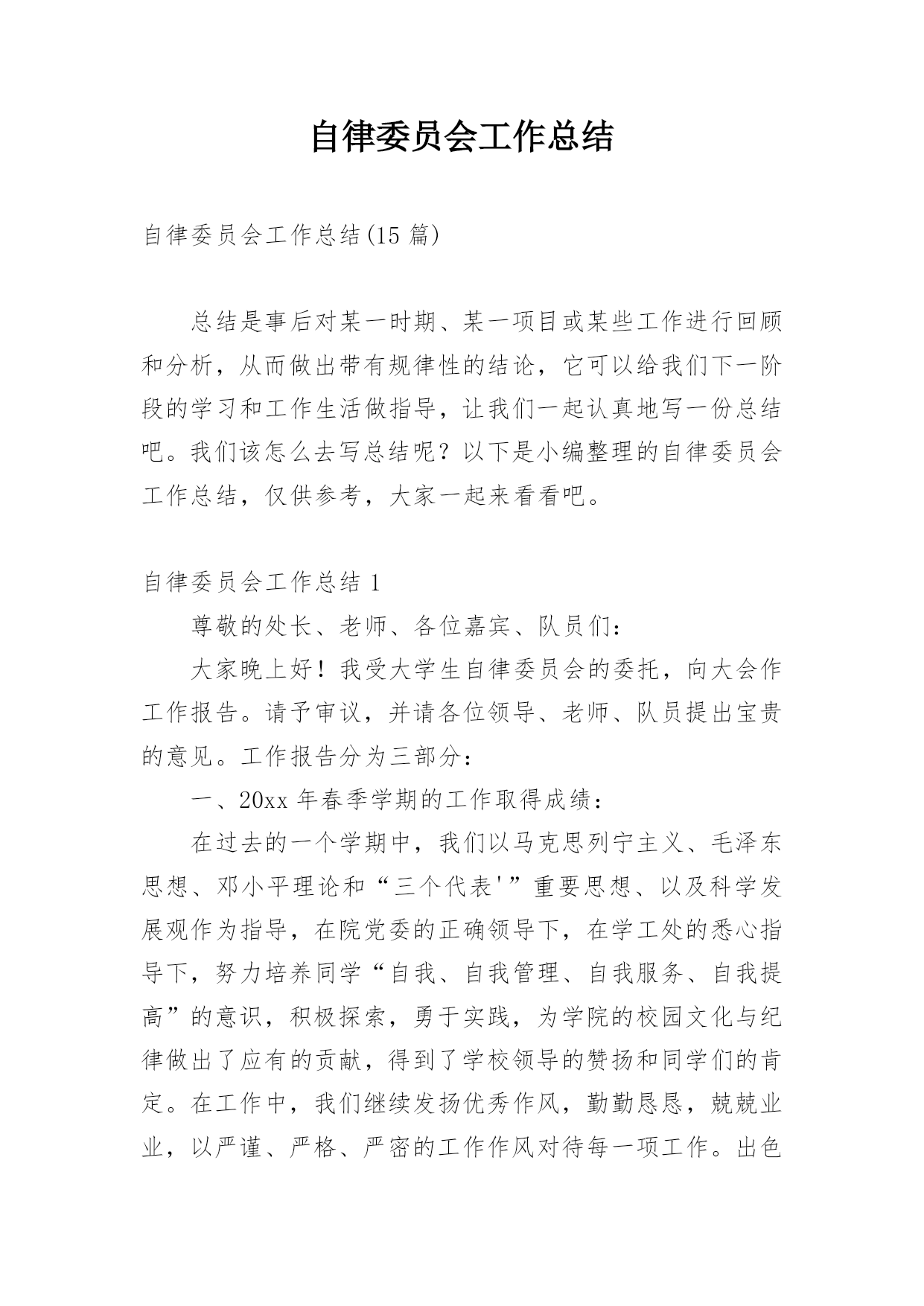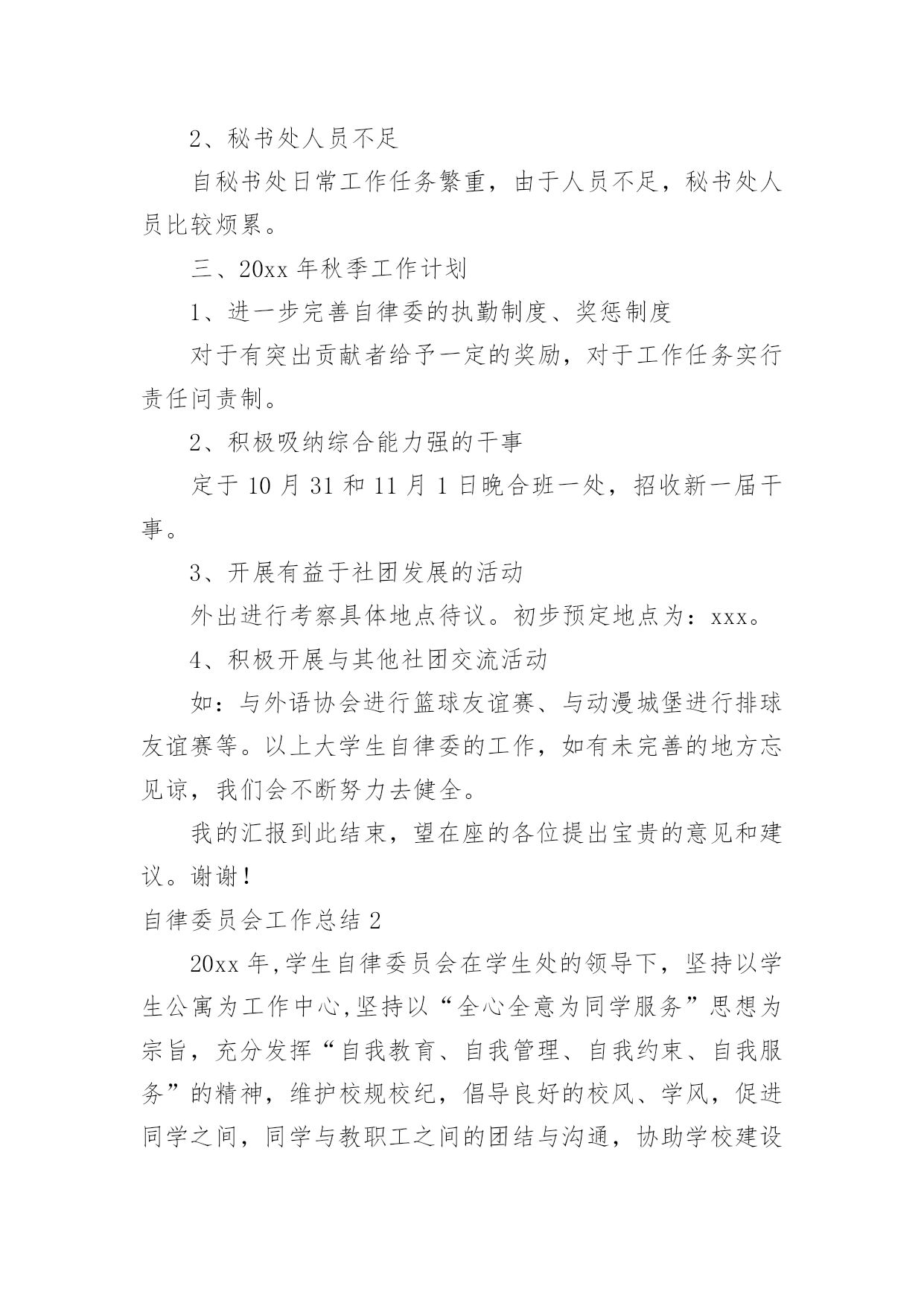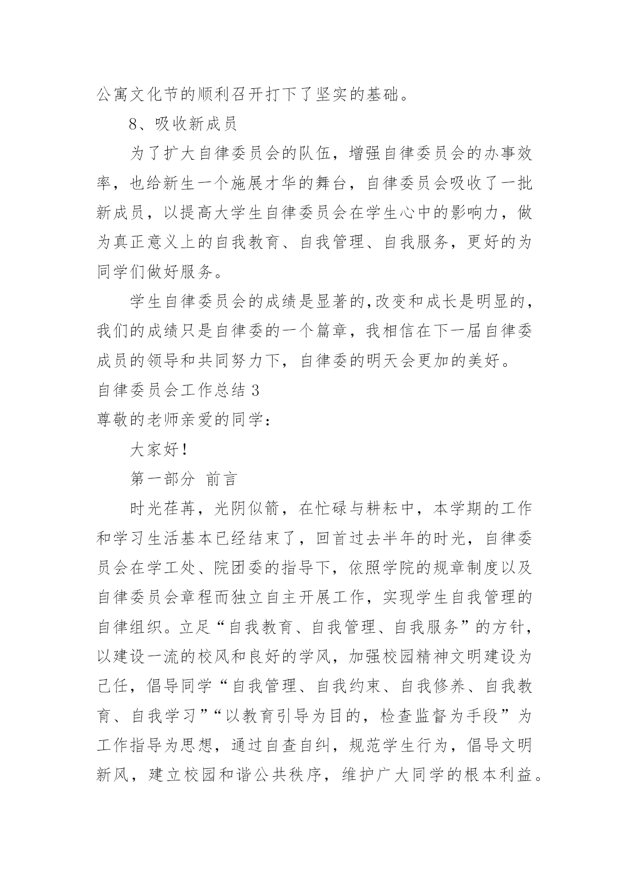 自律委员会工作总结自律委员会工作总结(15篇)总结是事后对某一时期、某一项目或某些工作进行回顾和分析,从而做出带有规律性的结论,它可以给我们下一阶段的学习和工作生活做指导,让我们一起认真地写一份总结吧。我们该怎么去写总结呢?以下是小编整理的自律委员会工作总结,仅供参考,大家一起来看看吧。自律委员会工作总结1尊敬的处长、老师、各位嘉宾、队员们:大家晚上好!我受大学生自律委员会的委托,向大会作工作报告。请予审议,并请各位领导、老师、队员提出宝贵的意见。工作报告分为三部分:一、20xx年春季学期的工作取得成绩:在过去的一个学期中,我们以马克思列宁主义、毛泽东思想、邓小平理论和“三个代表'”重要思想、以及科学发展观作为指导,在院党委的正确领导下,在学工处的悉心指导下,努力培养同学“自我、自我管理、自我服务、自我提高”的意识,积极探索,勇于实践,为学院的校园文化与纪律做出了应有的贡献,得到了学校领导的赞扬和同学们的肯定。在工作中,我们继续发扬优秀作风,勤勤恳恳,兢兢业业,以严谨、严格、严密的工作作风对待每一项工作。出色地完成了学院、学工处下达的各项任务。1、建立、健全各项规章制度为了适应新形势和自身发展的需要,自律委在原来基础上建立了比较完善的制度体系;如:明确各常委的日常工作方向;明细秘书处的责任分工;严格规范干部的职责;加强常委、干部、队员之间的沟通;进一步强化干部纪律和会议相关制度。2、开展了丰富多彩的社团活动为了加强大学生自律委员会队员的交流以及东西校区队伍的情谊,四月在本部外国语学院的篮球场举行了游园活动。五月初我们与外语协会进行了篮球友谊赛。我们以66比52的优异成绩完胜保持了社团第一球队的美誉。5月15日组织我们社团的队员们到x开展为期一天的参观考察,拓展了队员的视野,见证北部湾的蓬勃发展。3、配合学院有关部门完成了各项工作配合院办完成校徽佩戴的检查工作,配合学工处完成升旗、出操的各项检查工作,配合学校维持校园、宿舍的纪律。二、自律委工作存在不足在老师的指导和帮助,在各干部、队员们的努力下,自律委在各个方面都有了进步,建设上也有了创新,但在肯定取得成绩的同时,我们存在一些不足地方:1、部分干部责任心有待加强个别干部时间观念不强责任心不够强烈,有部分干部执勤签到时迟到,对于分配的工作应付了事。2、秘书处人员不足自秘书处日常工作任务繁重,由于人员不足,秘书处人员比较烦累。三、20xx年秋季工作计划1、进一步完善自律委的执勤制度、奖惩制度对于有突出贡献者给予一定的奖励,对于工作任务实行责任问责制。2、积极吸纳综合能力强的干事定于10月31和11月1日晚合班一处,招收新一届干事。3、开展有益于社团发展的活动外出进行考察具体地点待议。初步预定地点为:xxx。4、积极开展与其他社团交流活动如:与外语协会进行篮球友谊赛、与动漫城堡进行排球友谊赛等。以上大学生自律委的工作,如有未完善的地方忘见谅,我们会不断努力去健全。我的汇报到此结束,望在座的各位提出宝贵的意见和建议。谢谢!自律委员会工作总结220xx年,学生自律委员会在学生处的领导下,坚持以学生公寓为工作中心,坚持以“全心全意为同学服务”思想为宗旨,充分发挥“自我教育、自我管理、自我约束、自我服务”的精神,维护校规校纪,倡导良好的校风、学风,促进同学之间,同学与教职工之间的团结与沟通,协助学校建设良好的教学秩序和学习生活环境,全面落实学生公寓“三进三覆盖”工作,通过不懈努力,较好的完成了学生处领导交给的各项工作任务。现将今年的工作总结如下:一、制定和完善各种规章制度随着组织的运作和工作的执行,我们根据实际情况,不断的探索工作方法,完善自律委员会的制度以及结构调整,随后成立了组织部,经过研究讨论重新修订了学生公寓自律委会例会制度、检查制度、值班制度及各部门工作职责等,并规范了对自律委干部工作的考核。通过考核,各学生干部的工作能力、责任意识和服务意识普遍得到了提高,更激发了学生干部的工作热情,大大提高了工作效率,使之能更快更好的为全体师生服务。二、建立和完善工作模式一是每周二下午定期召开会议,安排部署工作,主动学习学校的各项规章制度和会议精神,使每位学生干部以身作则、严以律己、公正无私、模范执行学校各项规章制度,在各方面为同学做出表率。本年度召开思想教育专题会议、工作例会及学生干部培训会议39次。二是每周定期安排自律委干部对公寓进行卫生、安全和纪律检查、夜间巡查以及不定期对学生公寓进行随机抽查等。三是每天安排自律委干部分五个时段对宿舍进行值班巡查,每晚安排干部轮流值班,随时向学校反馈公寓区存在的问题,使学校对公寓区集体性、苗头性、趋向性的问题得到及时妥善的处理。三、加强公寓检查力度一年来,学生自律委员会在工作上已经取得了显著成效,针对宿舍内务、赌博、宿舍做饭、校外住宿等违纪现象,学生自