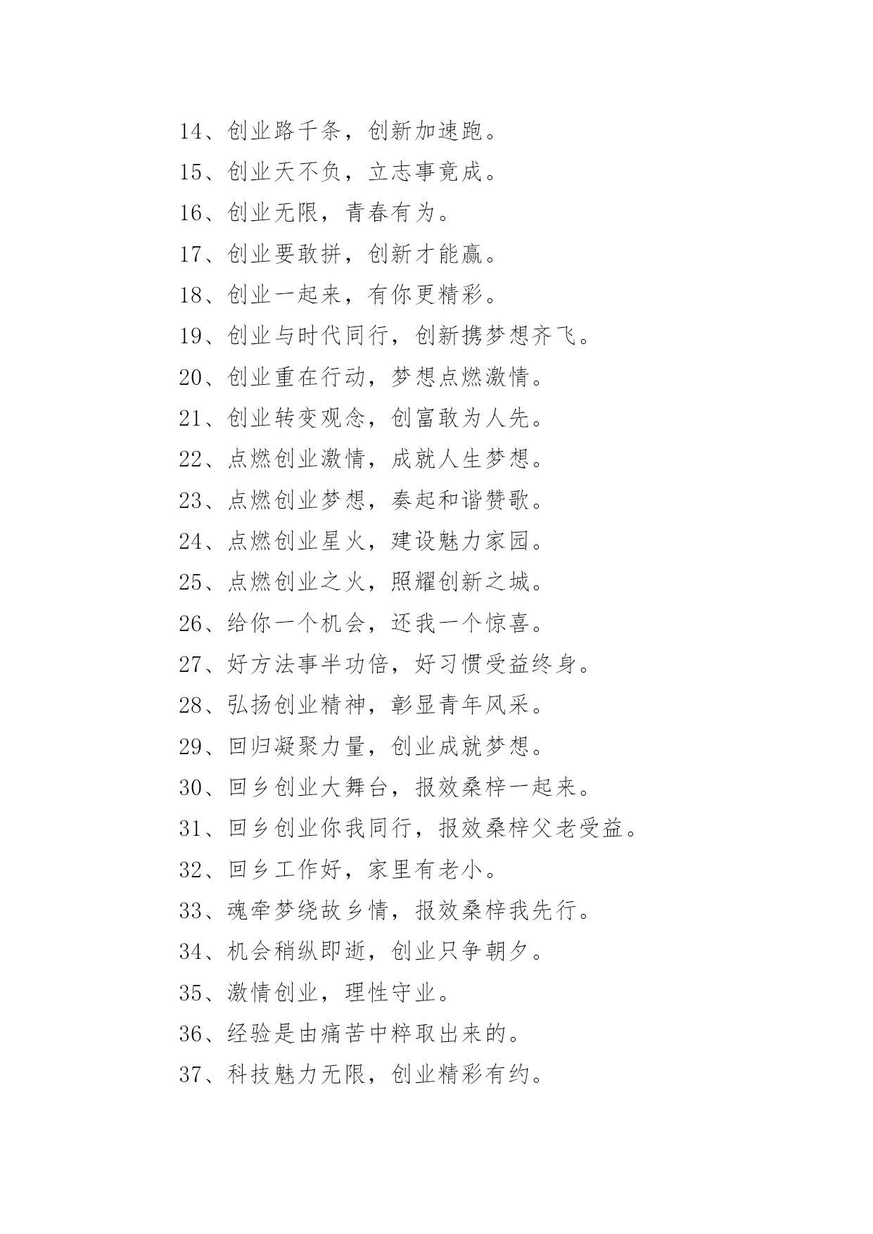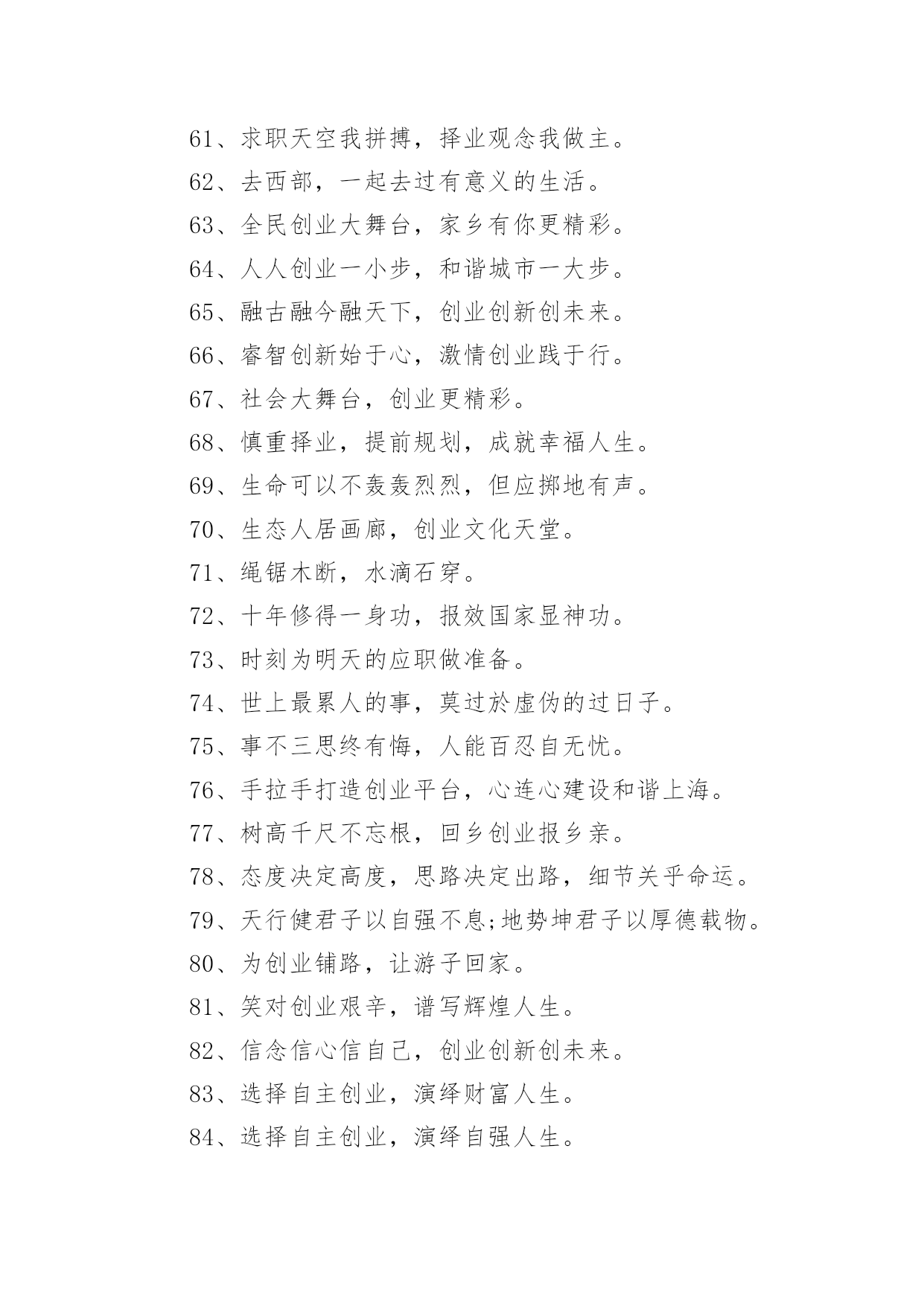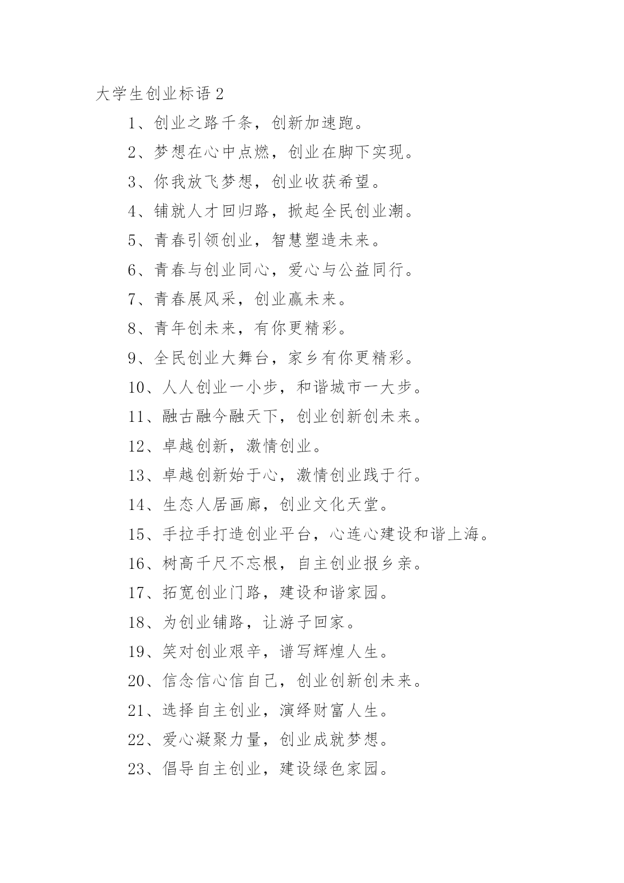 大学生创业标语大学生创业标语在学习、工作、生活中,大家一定都接触过一些使用较为普遍的标语吧,标语在一定程度上反映了社会经济制度的本质和社会的文明程度,它的意义十分重大。什么样的标语才经典呢?下面是小编为大家整理的大学生创业标语,仅供参考,希望能够帮助到大家。大学生创业标语11、倡导自主创业,建设绿色家园。2、崇尚自主创业,缔造美好生活。3、创新创造创辉煌事业,通江通海通广阔世界。4、创新改变生活,创业成就你我。5、创新魅力无限,创业激情有约。6、创新无处不在,创业只等你来。7、创新无止境,创业践于行。8、创阳光事业,展青春风采。9、创业,用理想撬动现实。10、创业不必去远方,家乡一样铸辉煌。11、创业大舞台,有你更精彩。12、创业改变命运,互助成就梦想。13、创业艰难百战多,彩虹总在风雨后。14、创业路千条,创新加速跑。15、创业天不负,立志事竟成。16、创业无限,青春有为。17、创业要敢拼,创新才能赢。18、创业一起来,有你更精彩。19、创业与时代同行,创新携梦想齐飞。20、创业重在行动,梦想点燃激情。21、创业转变观念,创富敢为人先。22、点燃创业激情,成就人生梦想。23、点燃创业梦想,奏起和谐赞歌。24、点燃创业星火,建设魅力家园。25、点燃创业之火,照耀创新之城。26、给你一个机会,还我一个惊喜。27、好方法事半功倍,好习惯受益终身。28、弘扬创业精神,彰显青年风采。29、回归凝聚力量,创业成就梦想。30、回乡创业大舞台,报效桑梓一起来。31、回乡创业你我同行,报效桑梓父老受益。32、回乡工作好,家里有老小。33、魂牵梦绕故乡情,报效桑梓我先行。34、机会稍纵即逝,创业只争朝夕。35、激情创业,理性守业。36、经验是由痛苦中粹取出来的。37、科技魅力无限,创业精彩有约。38、肯承认错误则错已改了一半。39、快乐不是因为拥有的'多而是计较的少。40、劳动创造财富,就业改善民生。41、乐观本身就是一种成功。乌云后面依然是灿烂的晴天。42、了解自我,规划人生,贡献社会。43、立志照亮人生,创业改变命运。44、每临大事,心必静心,静则神明,豁然冰释。45、梦想从求职放飞,希望自就业起航。46、梦想在青春,创业我添辉。47、梦想在心中点燃,创业在脚下实现。48、梦想在心中点燃,就业在手中实现。49、迷茫于十字路口,成就于四面八方。50、你我放飞梦想,创业收获希望。51、你我共同就业,共建和谐社会。52、攀比等靠不可取,脚踏实地最为真。53、培训提高能力,能力创造机会。54、铺就人才回归路,掀起全民创业潮。55、青春领航创业,智慧塑造未来。56、青春与创业同心,爱心与公益同行。57、青春展风采,创业赢未来。58、青年创未来,有你更精彩。59、求职不必去远方,就业创业留家乡。60、求职求发展,择业择机遇。61、求职天空我拼搏,择业观念我做主。62、去西部,一起去过有意义的生活。63、全民创业大舞台,家乡有你更精彩。64、人人创业一小步,和谐城市一大步。65、融古融今融天下,创业创新创未来。66、睿智创新始于心,激情创业践于行。67、社会大舞台,创业更精彩。68、慎重择业,提前规划,成就幸福人生。69、生命可以不轰轰烈烈,但应掷地有声。70、生态人居画廊,创业文化天堂。71、绳锯木断,水滴石穿。72、十年修得一身功,报效国家显神功。73、时刻为明天的应职做准备。74、世上最累人的事,莫过於虚伪的过日子。75、事不三思终有悔,人能百忍自无忧。76、手拉手打造创业平台,心连心建设和谐上海。77、树高千尺不忘根,回乡创业报乡亲。78、态度决定高度,思路决定出路,细节关乎命运。79、天行健君子以自强不息;地势坤君子以厚德载物。80、为创业铺路,让游子回家。81、笑对创业艰辛,谱写辉煌人生。82、信念信心信自己,创业创新创未来。83、选择自主创业,演绎财富人生。84、选择自主创业,演绎自强人生。85、用青春书写梦想,用激情燃烧希望。86、有时候,生活不免走向低谷,才能迎接你的下一个高点。87、有心创业岂畏难,立足起点莫等闲。88、在山大努力学习,在岗位认真工作。89、在外漂泊身心累,返乡创业更实惠。90、择己所长,更要择世所需。91、择业观念要更新,就业路上当自强。92、择业凭技能,就业靠竞争。93、扎根基层,在磨砺中成长。94、绽放自信激情,演绎成功人生。95、政府搭台促就业,校企合作结硕果。96、知识架起就业桥,真诚铺就人生路。97、知识与技能交汇,毕业与就业连接。98、职业化的过程,就是自我超越的过程。99、志存高远,奉献社会。100、志存高远,在挑战中辉煌。101、志当存高远,择业报国家。102、智者,一切求自己;愚者,一切求他人。103、诸葛躬耕地,回归创业园。104、转变就业观念,提高就业能力。105、自强志在心,创业践于行。1