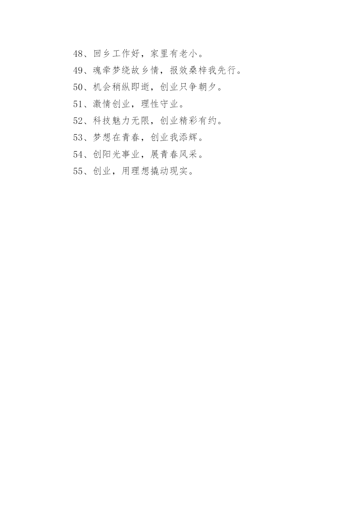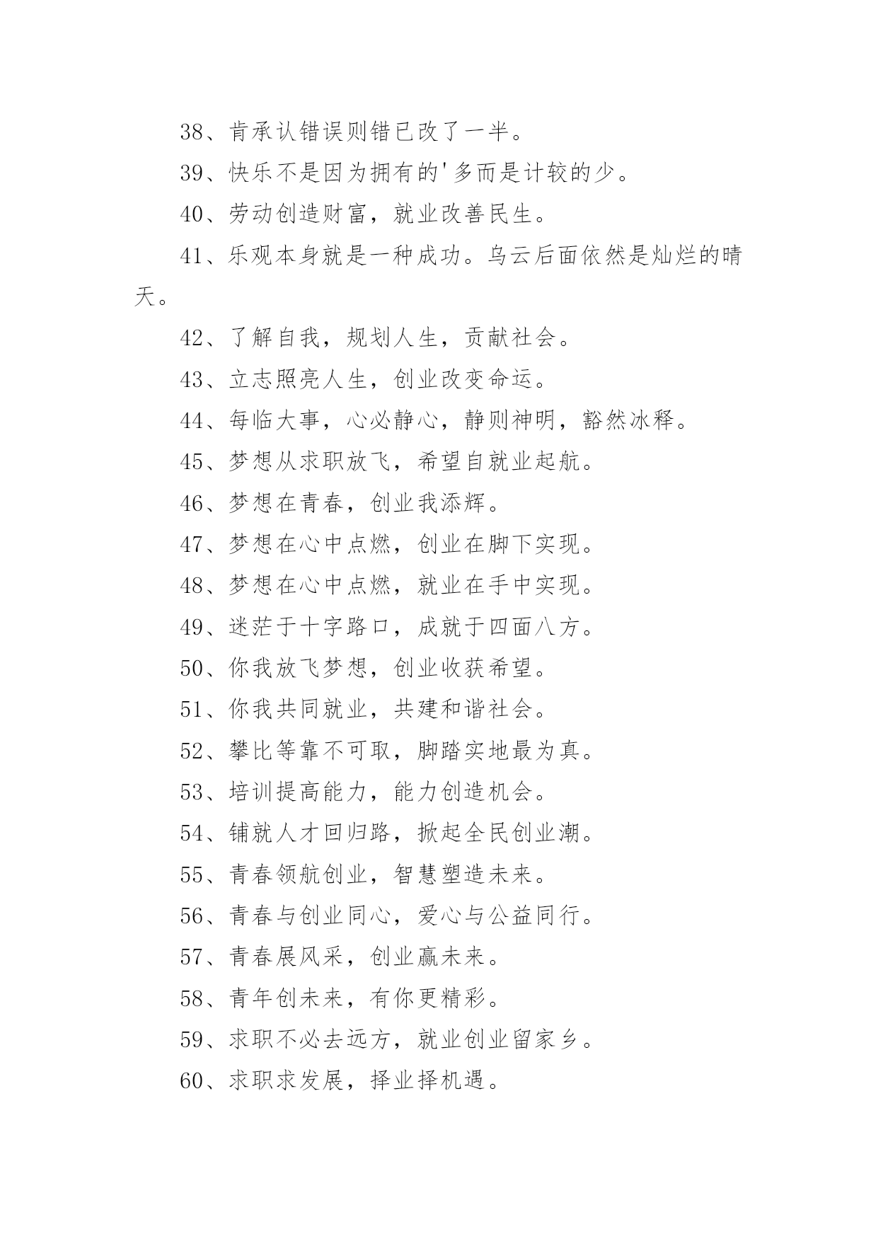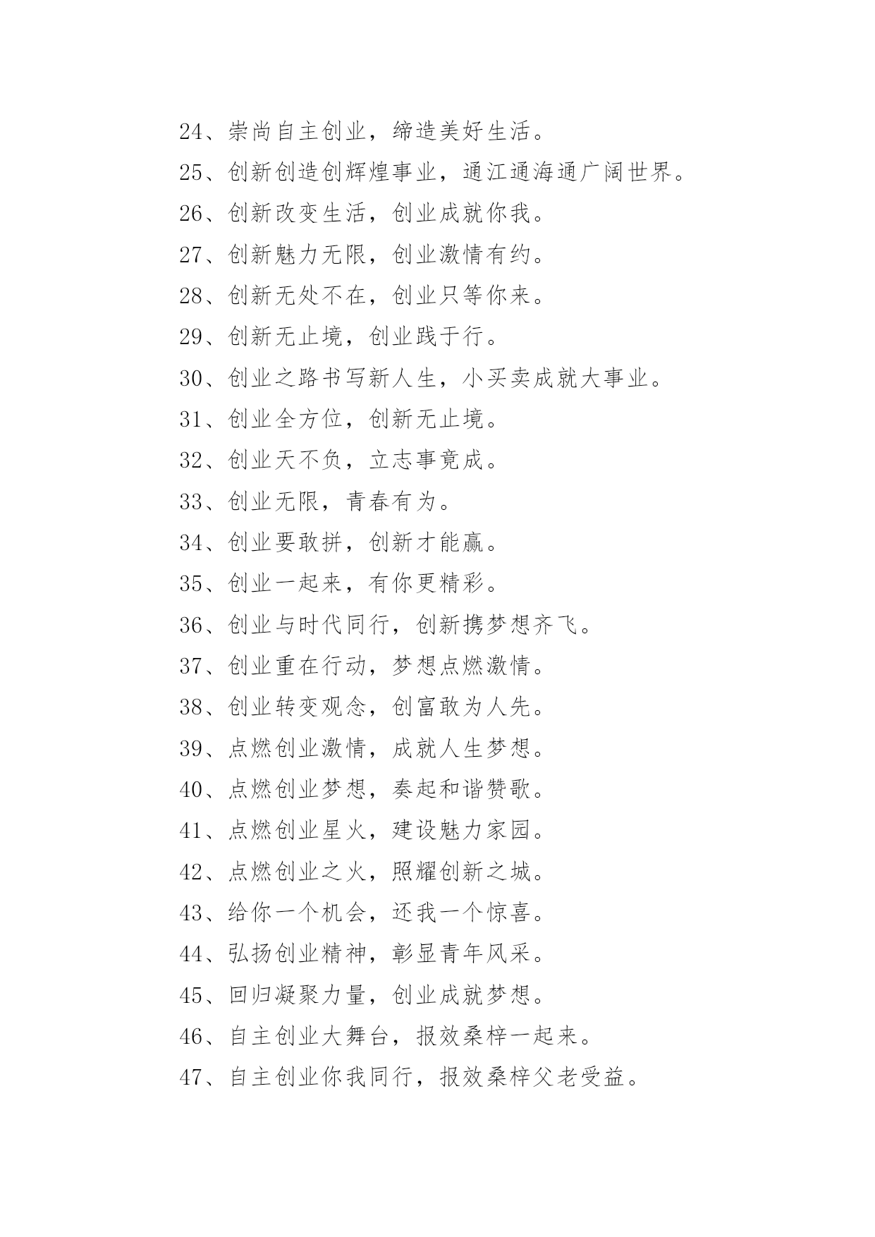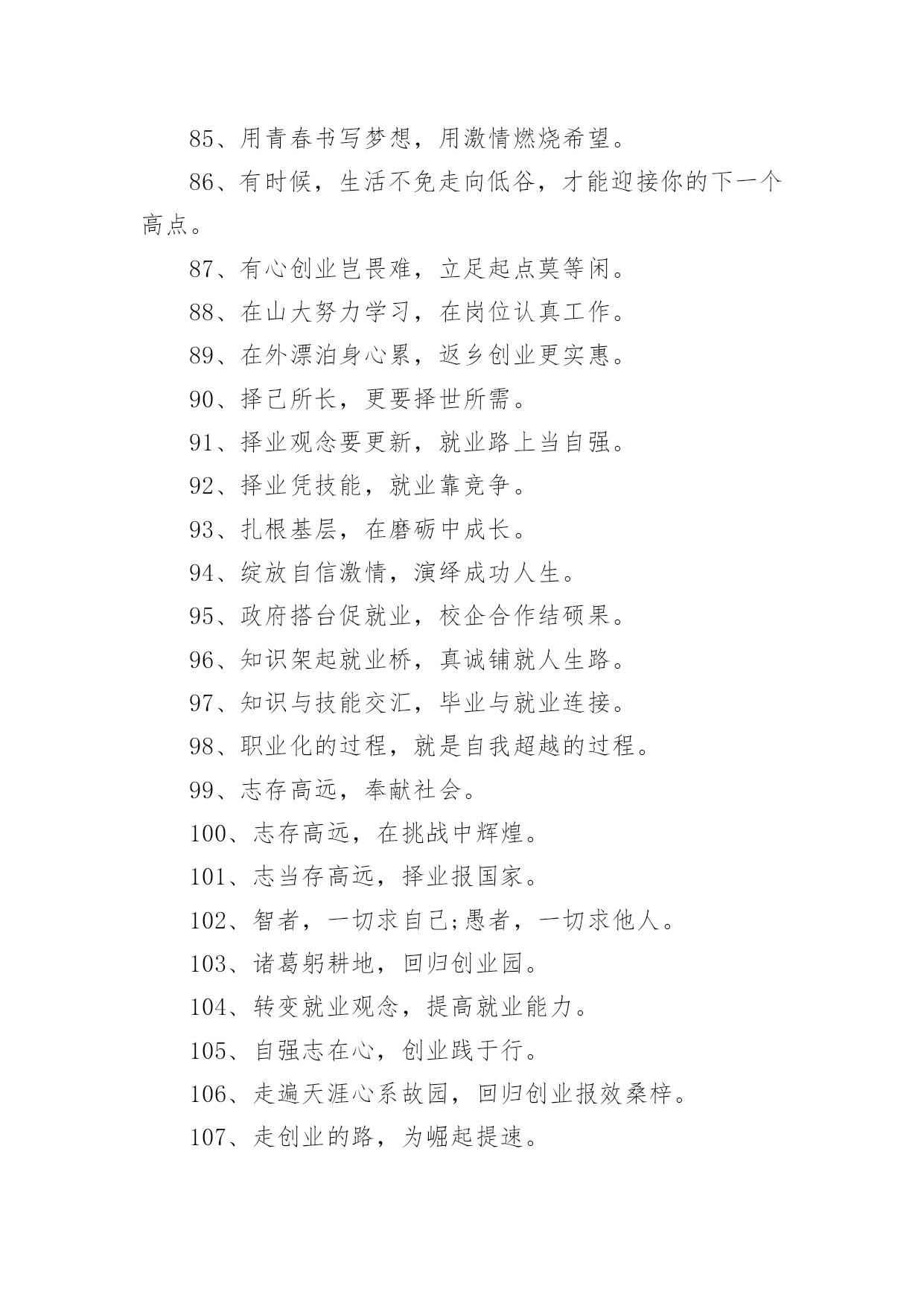 大学生创业标语大学生创业标语在学习、工作、生活中,大家一定都接触过一些使用较为普遍的标语吧,标语在一定程度上反映了社会经济制度的本质和社会的文明程度,它的意义十分重大。什么样的标语才经典呢?下面是小编为大家整理的大学生创业标语,仅供参考,希望能够帮助到大家。大学生创业标语11、倡导自主创业,建设绿色家园。2、崇尚自主创业,缔造美好生活。3、创新创造创辉煌事业,通江通海通广阔世界。4、创新改变生活,创业成就你我。5、创新魅力无限,创业激情有约。6、创新无处不在,创业只等你来。7、创新无止境,创业践于行。8、创阳光事业,展青春风采。9、创业,用理想撬动现实。10、创业不必去远方,家乡一样铸辉煌。11、创业大舞台,有你更精彩。12、创业改变命运,互助成就梦想。13、创业艰难百战多,彩虹总在风雨后。14、创业路千条,创新加速跑。15、创业天不负,立志事竟成。16、创业无限,青春有为。17、创业要敢拼,创新才能赢。18、创业一起来,有你更精彩。19、创业与时代同行,创新携梦想齐飞。20、创业重在行动,梦想点燃激情。21、创业转变观念,创富敢为人先。22、点燃创业激情,成就人生梦想。23、点燃创业梦想,奏起和谐赞歌。24、点燃创业星火,建设魅力家园。25、点燃创业之火,照耀创新之城。26、给你一个机会,还我一个惊喜。27、好方法事半功倍,好习惯受益终身。28、弘扬创业精神,彰显青年风采。29、回归凝聚力量,创业成就梦想。30、回乡创业大舞台,报效桑梓一起来。31、回乡创业你我同行,报效桑梓父老受益。32、回乡工作好,家里有老小。33、魂牵梦绕故乡情,报效桑梓我先行。34、机会稍纵即逝,创业只争朝夕。35、激情创业,理性守业。36、经验是由痛苦中粹取出来的。37、科技魅力无限,创业精彩有约。38、肯承认错误则错已改了一半。39、快乐不是因为拥有的'多而是计较的少。40、劳动创造财富,就业改善民生。41、乐观本身就是一种成功。乌云后面依然是灿烂的晴天。42、了解自我,规划人生,贡献社会。43、立志照亮人生,创业改变命运。44、每临大事,心必静心,静则神明,豁然冰释。45、梦想从求职放飞,希望自就业起航。46、梦想在青春,创业我添辉。47、梦想在心中点燃,创业在脚下实现。48、梦想在心中点燃,就业在手中实现。49、迷茫于十字路口,成就于四面八方。50、你我放飞梦想,创业收获希望。51、你我共同就业,共建和谐社会。52、攀比等靠不可取,脚踏实地最为真。53、培训提高能力,能力创造机会。54、铺就人才回归路,掀起全民创业潮。55、青春领航创业,智慧塑造未来。56、青春与创业同心,爱心与公益同行。57、青春展风采,创业赢未来。58、青年创未来,有你更精彩。59、求职不必去远方,就业创业留家乡。60、求职求发展,择业择机遇。61、求职天空我拼搏,择业观念我做主。62、去西部,一起去过有意义的生活。63、全民创业大舞台,家乡有你更精彩。64、人人创业一小步,和谐城市一大步。65、融古融今融天下,创业创新创未来。66、睿智创新始于心,激情创业践于行。67、社会大舞台,创业更精彩。68、慎重择业,提前规划,成就幸福人生。69、生命可以不轰轰烈烈,但应掷地有声。70、生态人居画廊,创业文化天堂。71、绳锯木断,水滴石穿。72、十年修得一身功,报效国家显神功。73、时刻为明天的应职做准备。74、世上最累人的事,莫过於虚伪的过日子。75、事不三思终有悔,人能百忍自无忧。76、手拉手打造创业平台,心连心建设和谐上海。77、树高千尺不忘根,回乡创业报乡亲。78、态度决定高度,思路决定出路,细节关乎命运。79、天行健君子以自强不息;地势坤君子以厚德载物。80、为创业铺路,让游子回家。81、笑对创业艰辛,谱写辉煌人生。82、信念信心信自己,创业创新创未来。83、选择自主创业,演绎财富人生。84、选择自主创业,演绎自强人生。85、用青春书写梦想,用激情燃烧希望。86、有时候,生活不免走向低谷,才能迎接你的下一个高点。87、有心创业岂畏难,立足起点莫等闲。88、在山大努力学习,在岗位认真工作。89、在外漂泊身心累,返乡创业更实惠。90、择己所长,更要择世所需。91、择业观念要更新,就业路上当自强。92、择业凭技能,就业靠竞争。93、扎根基层,在磨砺中成长。94、绽放自信激情,演绎成功人生。95、政府搭台促就业,校企合作结硕果。96、知识架起就业桥,真诚铺就人生路。97、知识与技能交汇,毕业与就业连接。98、职业化的过程,就是自我超越的过程。99、志存高远,奉献社会。100、志存高远,在挑战中辉煌。101、志当存高远,择业报国家。102、智者,一切求自己;愚者,一切求他人。103、诸葛躬耕地,回归创业园。104、转变就业观念,提高就业能力。105、自强志在心,创业践于行。1