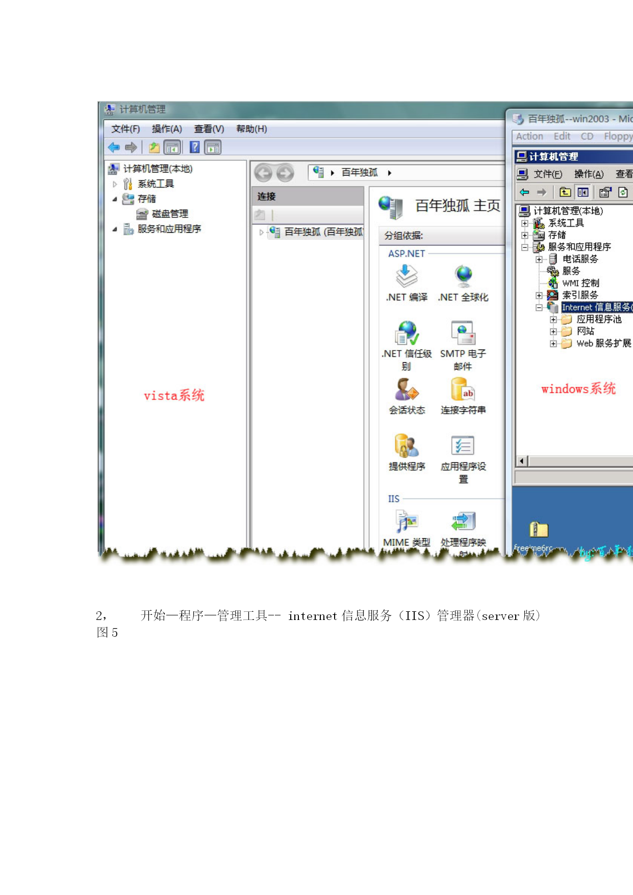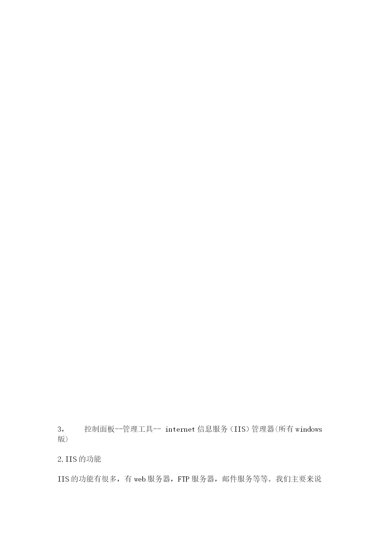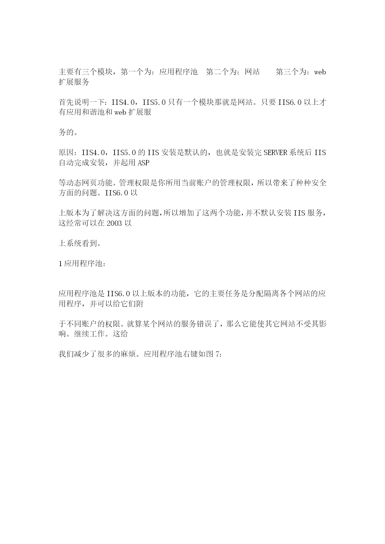 网络教程之IISweb服务1,IIS的安装2,IIS的功能Iis是windows自带的应用服务管理程序,它是作为一个网页制作者或网络管理员必需深入了解的软件。所以我们有必需研究。1,iis的安装。大家可不要小看IIS的安装,有时候真的还让你搞半天没搞懂。下面开始安装方法1:(适合于2000非server版,XP)放下系统光盘—打开控制面板—安装或删除程序—添加或删除windows组件:internet信息服务(IIS)打上钩—下一步:图1系统会自动在光盘里找到需要的文件进行安装,有时候会提示找不到****.***文件,这时你要点浏览,手动给它只定文件目录,一般在I386这个文件夹里,这一步很多人不知道要点一下“重试”以为安装进行不了了,其实你按一下“重试”确定系统就会继续安装了。图2安装方法2:(适合于server版windows)放下系统光盘—打开控制面板—安装或删除程序—添加或删除windows组件—应用程序服务器----internet信息服务(IIS)打上钩,下面步骤与上同安装方法3:(适合于server版windows)放下系统光盘—开始—程序—管理工具—管理您的服务器—添加或删除角色—下一步—应用程序服务器(iis,asp.net)--下一步,下一步--下面步骤与上同安装方法4:(适合于大部分windows)下载IIS安装程序,MSI或EXE文件进行安装,安装过程双击按提示做就可以。安装方法5:(适合于vista)放下系统光盘--控制面板--程序--程序和功能—打开或关闭windows功能—internet信息服务—确定。下面步骤与上同图3IIS安装完成后可以在以下地方找到:1,我的电脑—右键管理—服务和应用程序—internet信息服务(IIS)管理器(所有windows版)图42,开始—程序—管理工具--internet信息服务(IIS)管理器(server版)图53,控制面板--管理工具--internet信息服务(IIS)管理器(所有windows版)2,IIS的功能IIS的功能有很多,有web服务器,FTP服务器,邮件服务等等。我们主要来说主要功能建立网站服务器,FTP服务将在下个教程中和其它FTP服务放在一起说。建立网站服务器,安装了IIS之后,会在你的系统盘里出现一个叫inetpub的文件夹,里面还有带着几个文件夹。其中wwwroot就是默认的IIS网站主目录。首先介绍一下IIS的面板吧,由于考虑到一些新手对IIS不是很熟悉。先来看看IIS的界面,如图:6主要有三个模块,第一个为:应用程序池第二个为:网站第三个为:web扩展服务首先说明一下:IIS4.0,IIS5.0只有一个模块那就是网站。只要IIS6.0以上才有应用和谐池和web扩展服务的。原因:IIS4.0,IIS5.0的IIS安装是默认的,也就是安装完SERVER系统后IIS自动完成安装,并起用ASP等动态网页功能。管理权限是你所用当前账户的管理权限,所以带来了种种安全方面的问题。IIS6.0以上版本为了解决这方面的问题,所以增加了这两个功能,并不默认安装IIS服务,这经常可以在2003以上系统看到。1应用程序池:应用程序池是IIS6.0以上版本的功能,它的主要任务是分配隔离各个网站的应用程序,并可以给它们附于不同账户的权限。就算某个网站的服务错误了,那么它能使其它网站不受其影响。继续工作。这给我们减少了很多的麻烦。应用程序池右键如图7:应用程序池默认的池是DefaultAppPool,我们如果只创建一个站点的时候可以直接用这个叫应用程序池。如果有多个站点,那么我们可以给站点建立相应的程序池。建立的方法是点新建--应用程序池,当然,如果你以前的备份过程序池的话可以用新建—应用程序池(来自文件)。建立应用程序池后,右键属性,我们可以看到应用程序池的属性。其中回收是最重要的一项,如果填写不好会出现IIS假死现象,也会又IIS的质量带来问题。如图8:回收工作进程分钟:这个是指应用程序池多久自己回收一次,就像定时器一样,这个默认的是1740分钟,也就是差不多1个月回收一次(29天)。如果机器配置比较差可以设少一点。不过不要太少,建议在1000左右比较好。因为我们知道,重启一次服务是需要大量的CPU和内存资源的。回收工作进程(请求数目)这个一般不用设置,因为它存在的主要目的是解决服务不稳定时的状态,如你发觉你的IIS有断时续,那么你可以启用回收工作进程,回收过程中不会造成IIS服务器不能访问,它的回收是有程序的,它会继续运行要终止的工作进程,直到启动新的工作进程后为止。当WWW服务回收某个工作进程时,它并不断开现有的TCP/IP连接。HTTP协议堆栈(HTTP.sys)建立并维护TCP/IP连接注意:HTTP.sys也是只有IIS6.0