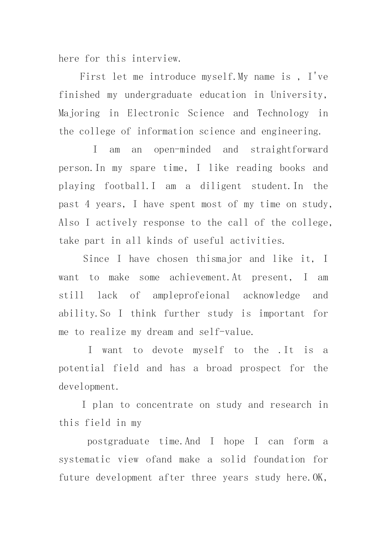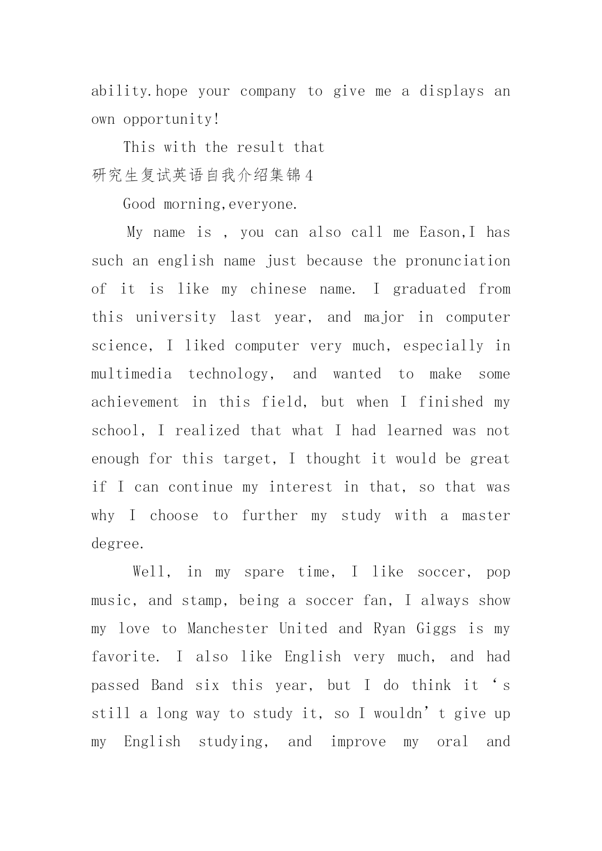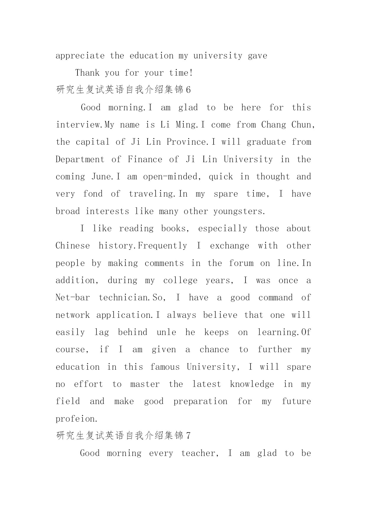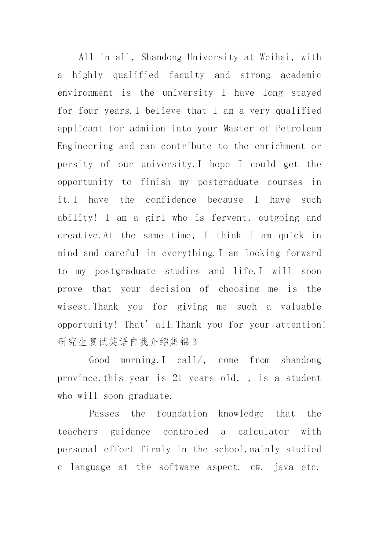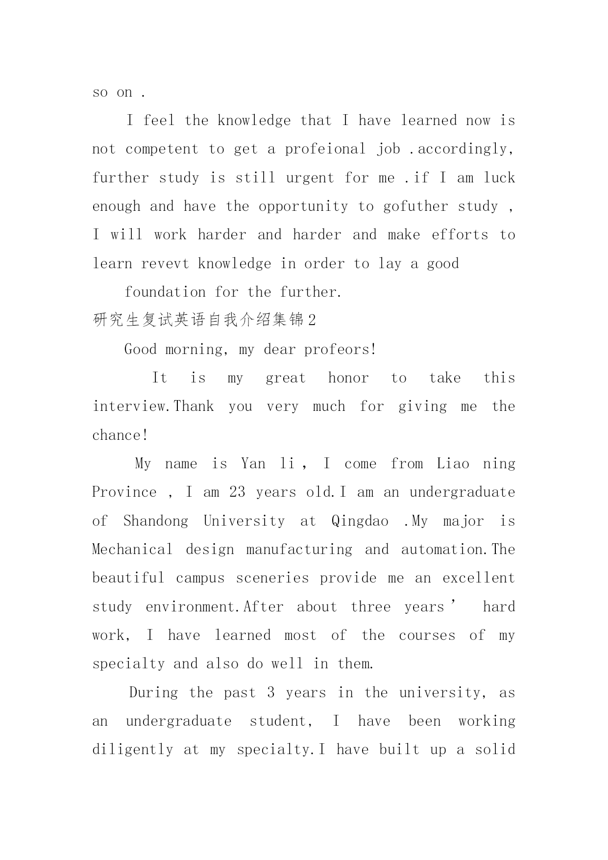 研究生复试英语自我介绍研究生复试英语自我介绍集锦处在一个陌生场合时,我们就有可能用到自我介绍,自我介绍可以满足我们渴望得到尊重的心理。那么什么样的自我介绍才合适呢?下面是小编收集整理的研究生复试英语自我介绍集锦,希望对大家有所帮助。研究生复试英语自我介绍集锦1Goodafternoondearprofeers,Iamgladtobehereforthisinterview,mynameis,fromhebeiuniversityoftechnology,Iammajorin,Iwasborninasmalltownin,Ibelieve“nopains,nogains”.soduringthepastyears,Iwasalwaysworkinghard.Luckily,everythingcomestohimwhowaits,Iobtainexcellentresultsinmystudy,IhavebeenawardedthreegoodstudentandIhavegotschoolscholarshipthreetimes,besides,Igotnationalencouragementscholarship5000yuan,whichIamveryproud.IthinkIamadigiligent,optimisticandactivestudent,Iamwillingtohelpothers,Ihavebrodenhobbies,likesingingdanging,badmintonandsoon.IfeeltheknowledgethatIhavelearnednowisnotcompetenttogetaprofeionaljob.accordingly,furtherstudyisstillurgentforme.ifIamluckenoughandhavetheopportunitytogofutherstudy,Iwillworkharderandharderandmakeeffortstolearnrevevtknowledgeinordertolayagoodfoundationforthefurther.研究生复试英语自我介绍集锦2Goodmorning,mydearprofeors!Itismygreathonortotakethisinterview.Thankyouverymuchforgivingmethechance!MynameisYanli,IcomefromLiaoningProvince,Iam23yearsold.IamanundergraduateofShandongUniversityatQingdao.MymajorisMechanicaldesignmanufacturingandautomation.Thebeautifulcampussceneriesprovidemeanexcellentstudyenvironment.Afteraboutthreeyears’hardwork,Ihavelearnedmostofthecoursesofmyspecialtyandalsodowellinthem.Duringthepast3yearsintheuniversity,asanundergraduatestudent,Ihavebeenworkingdiligentlyatmyspecialty.Ihavebuiltupasolidfoundationforprofeionalknowledgeandcomprehensivelyimprovedmyquality.Igotalotofscholarships,onceIfeelIfallbehindothers,Iwillfindthereasonassoonaspoibleandtrymyutmosttocatchupwiththem.Andjustowningtothis,Icouldconcentrateonmystudyandsucceededintheend.Iamconfidentthatmysolideducationbackgroundwilllaymeafoundationtofulfillmybachelordegreecourses!Inmysparetime,Iliketoreadbooks,listentoPopmusic,watchmoviesanddoingsports.Inallsports,volleyballismyfavorite.Theykeepmeingoodhealth,fullofenergyandbreedoptimismtowardslife.Besid