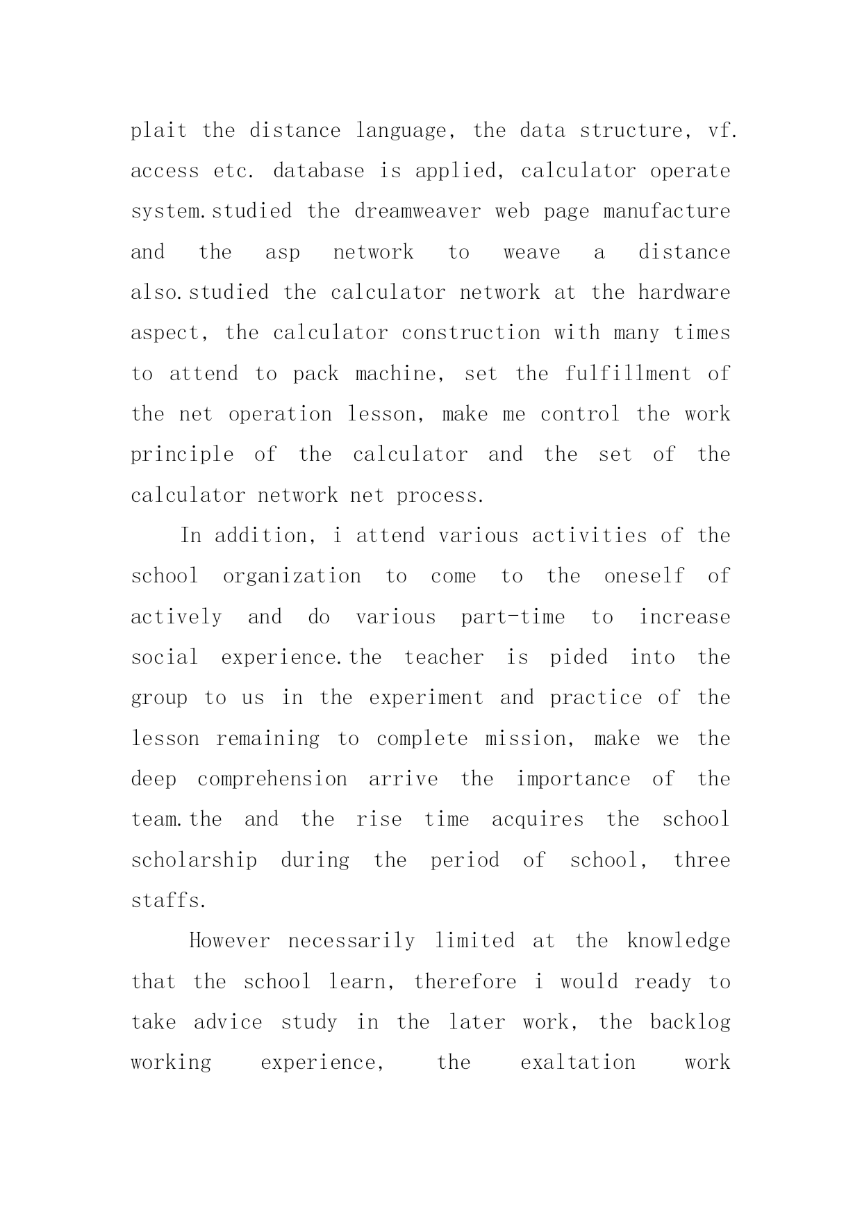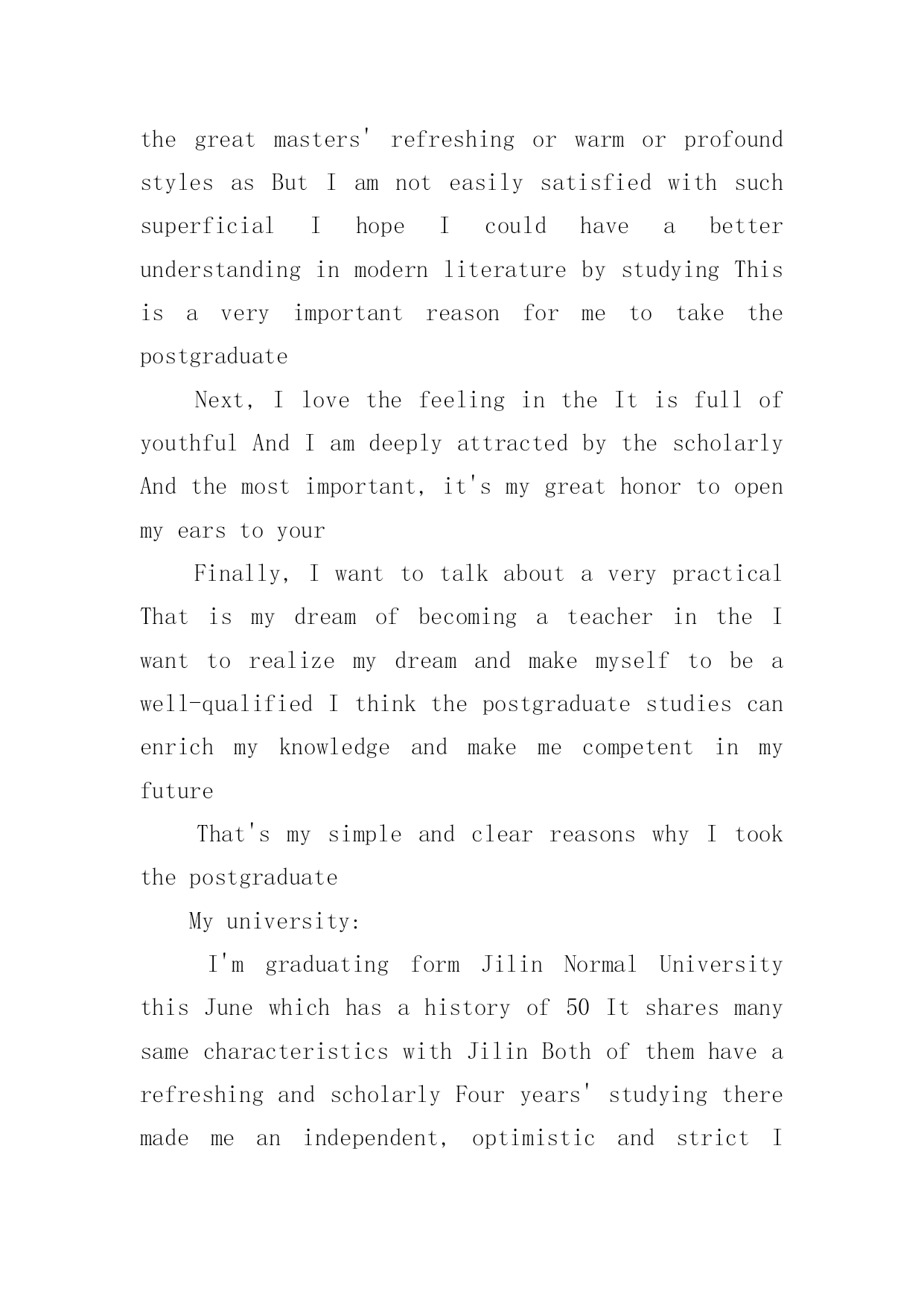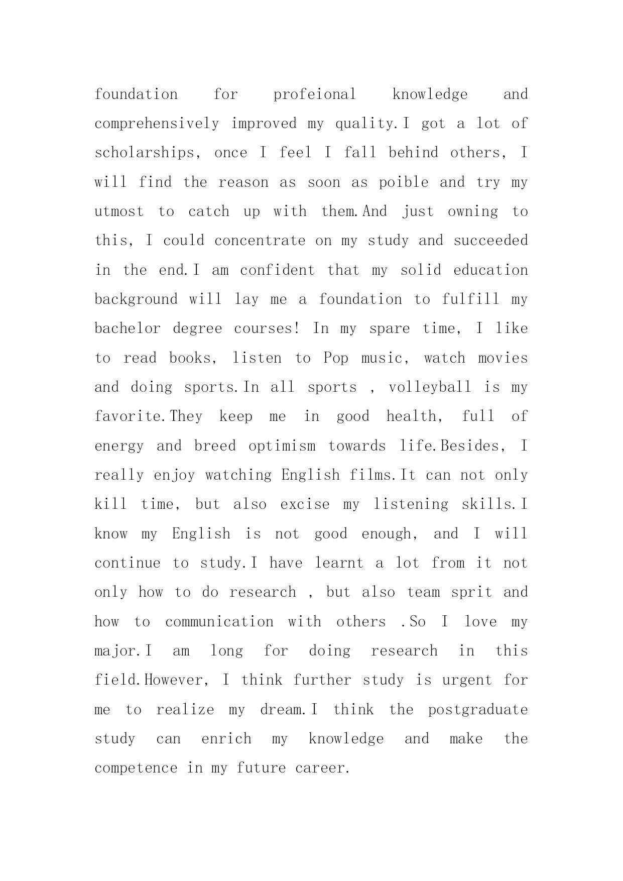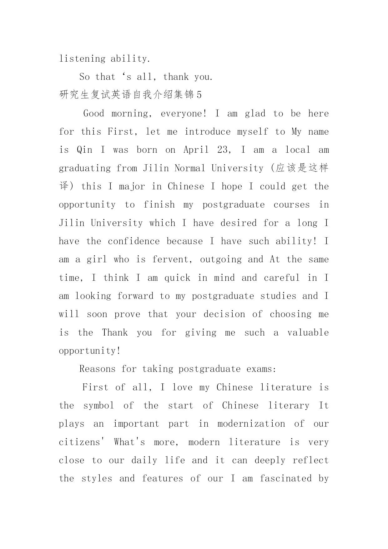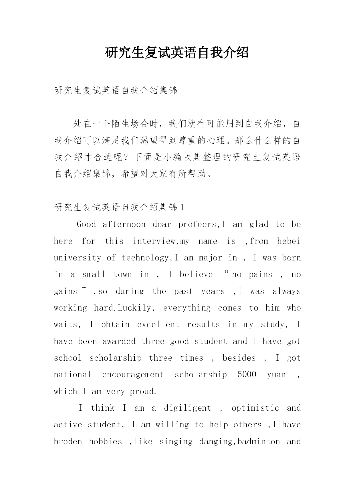 研究生复试英语自我介绍研究生复试英语自我介绍集锦处在一个陌生场合时,我们就有可能用到自我介绍,自我介绍可以满足我们渴望得到尊重的心理。那么什么样的自我介绍才合适呢?下面是小编收集整理的研究生复试英语自我介绍集锦,希望对大家有所帮助。研究生复试英语自我介绍集锦1Goodafternoondearprofeers,Iamgladtobehereforthisinterview,mynameis,fromhebeiuniversityoftechnology,Iammajorin,Iwasborninasmalltownin,Ibelieve“nopains,nogains”.soduringthepastyears,Iwasalwaysworkinghard.Luckily,everythingcomestohimwhowaits,Iobtainexcellentresultsinmystudy,IhavebeenawardedthreegoodstudentandIhavegotschoolscholarshipthreetimes,besides,Igotnationalencouragementscholarship5000yuan,whichIamveryproud.IthinkIamadigiligent,optimisticandactivestudent,Iamwillingtohelpothers,Ihavebrodenhobbies,likesingingdanging,badmintonandsoon.IfeeltheknowledgethatIhavelearnednowisnotcompetenttogetaprofeionaljob.accordingly,furtherstudyisstillurgentforme.ifIamluckenoughandhavetheopportunitytogofutherstudy,Iwillworkharderandharderandmakeeffortstolearnrevevtknowledgeinordertolayagoodfoundationforthefurther.研究生复试英语自我介绍集锦2Goodmorning,mydearprofeors!Itismygreathonortotakethisinterview.Thankyouverymuchforgivingmethechance!MynameisYanli,IcomefromLiaoningProvince,Iam23yearsold.IamanundergraduateofShandongUniversityatQingdao.MymajorisMechanicaldesignmanufacturingandautomation.Thebeautifulcampussceneriesprovidemeanexcellentstudyenvironment.Afteraboutthreeyears’hardwork,Ihavelearnedmostofthecoursesofmyspecialtyandalsodowellinthem.Duringthepast3yearsintheuniversity,asanundergraduatestudent,Ihavebeenworkingdiligentlyatmyspecialty.Ihavebuiltupasolidfoundationforprofeionalknowledgeandcomprehensivelyimprovedmyquality.Igotalotofscholarships,onceIfeelIfallbehindothers,Iwillfindthereasonassoonaspoibleandtrymyutmosttocatchupwiththem.Andjustowningtothis,Icouldconcentrateonmystudyandsucceededintheend.Iamconfidentthatmysolideducationbackgroundwilllaymeafoundationtofulfillmybachelordegreecourses!Inmysparetime,Iliketoreadbooks,listentoPopmusic,watchmoviesanddoingsports.Inallsports,volleyballismyfavorite.Theykeepmeingoodhealth,fullofenergyandbreedoptimismtowardslife.Besid