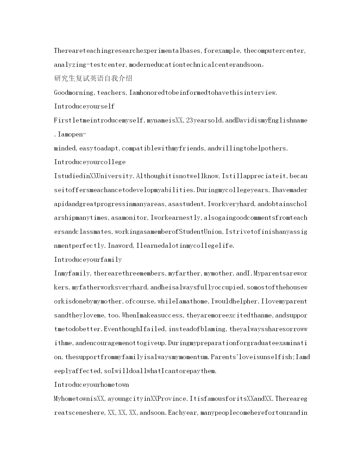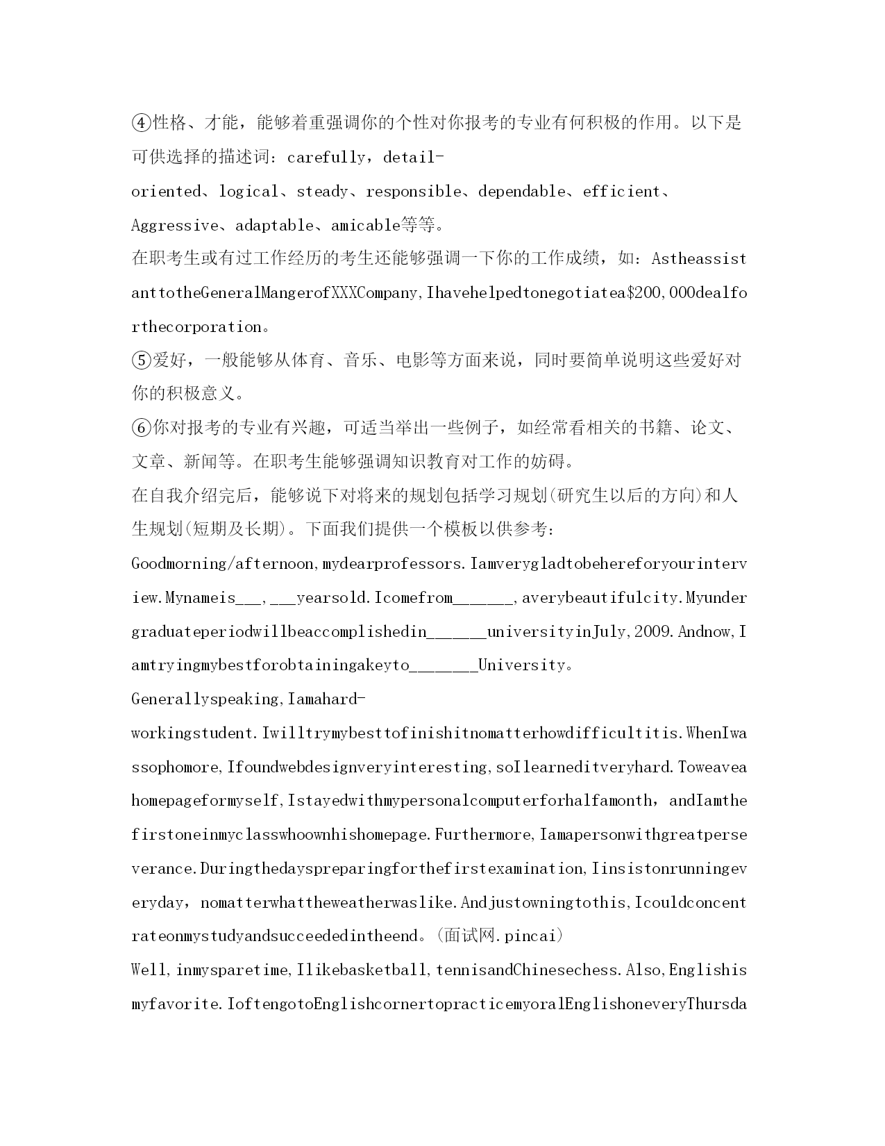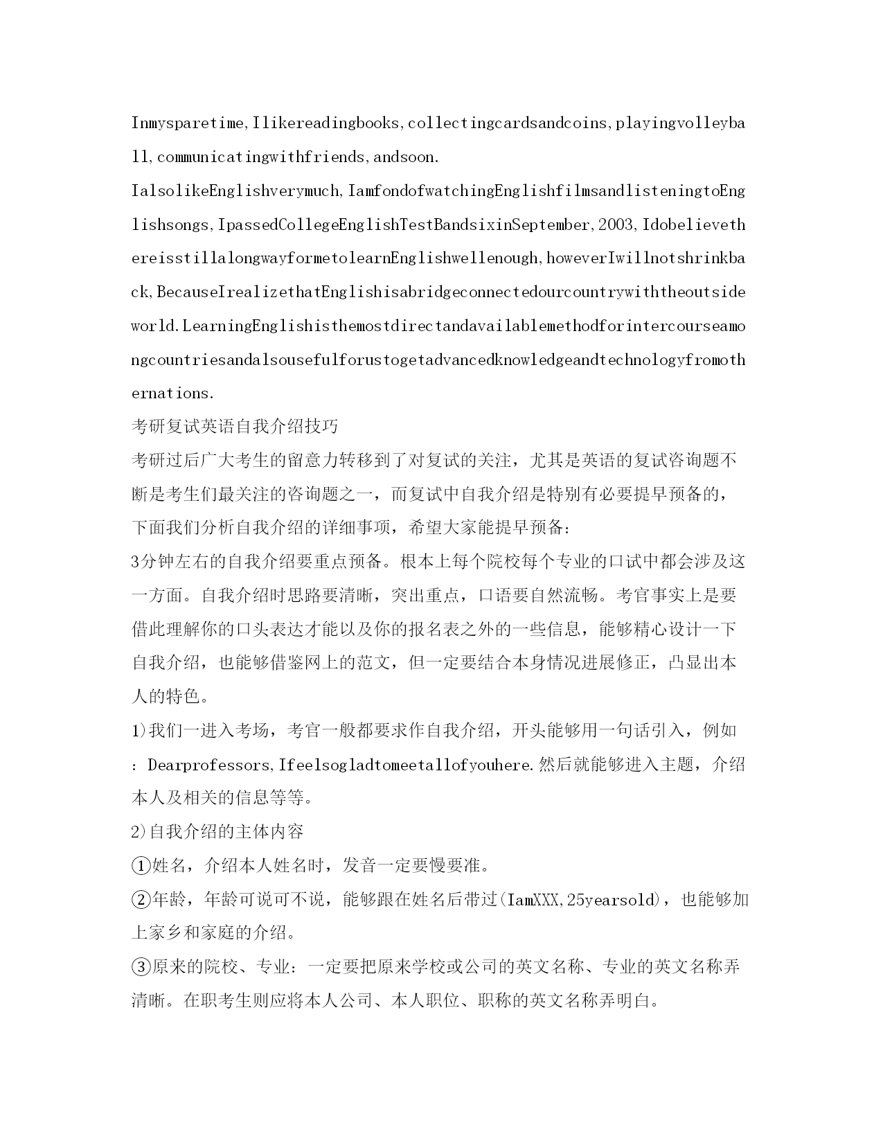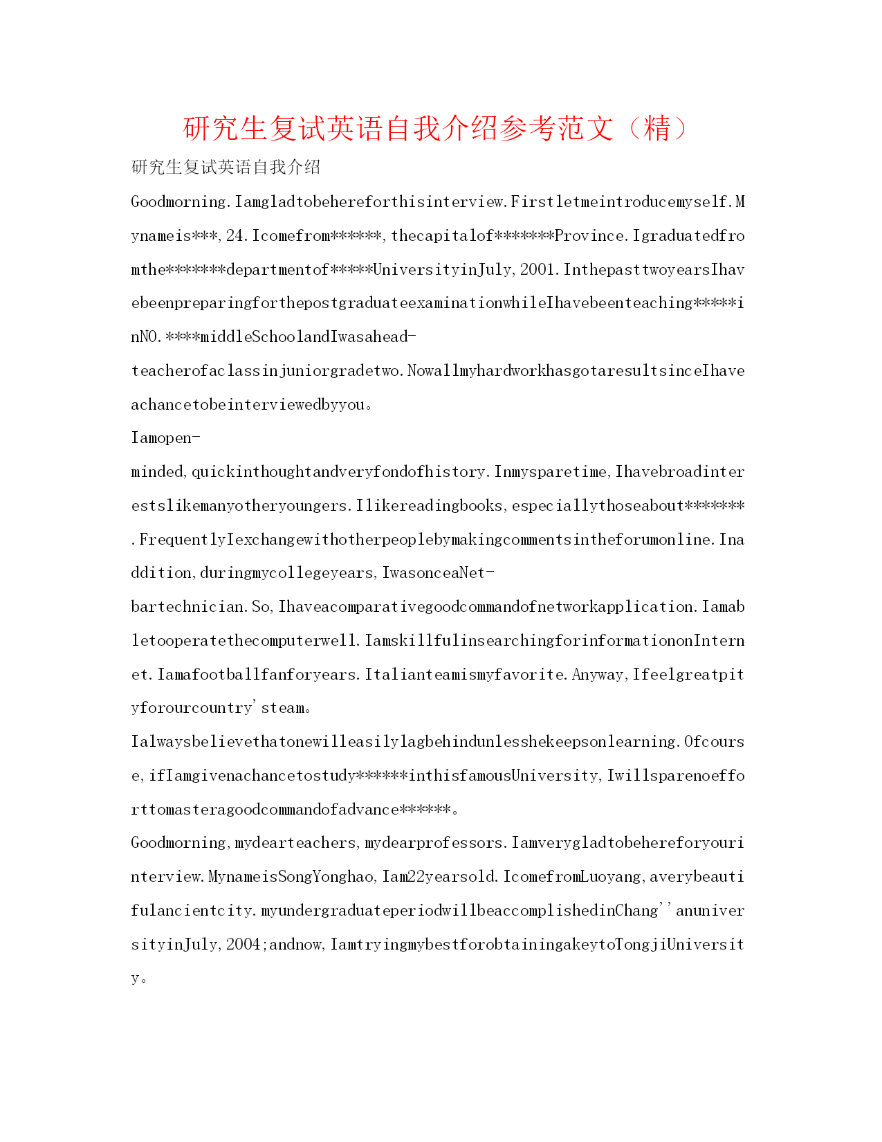 研究生复试英语自我介绍参考范文(精)研究生复试英语自我介绍Goodmorning.Iamgladtobehereforthisinterview.Firstletmeintroducemyself.Mynameis***,24.Icomefrom******,thecapitalof*******Province.Igraduatedfromthe*******departmentof*****UniversityinJuly,2001.InthepasttwoyearsIhavebeenpreparingforthepostgraduateexaminationwhileIhavebeenteaching*****inNO.****middleSchoolandIwasahead-teacherofaclassinjuniorgradetwo.NowallmyhardworkhasgotaresultsinceIhaveachancetobeinterviewedbyyou。Iamopen-minded,quickinthoughtandveryfondofhistory.Inmysparetime,Ihavebroadinterestslikemanyotheryoungers.Ilikereadingbooks,especiallythoseabout*******.FrequentlyIexchangewithotherpeoplebymakingcommentsintheforumonline.Inaddition,duringmycollegeyears,IwasonceaNet-bartechnician.So,Ihaveacomparativegoodcommandofnetworkapplication.Iamabletooperatethecomputerwell.IamskillfulinsearchingforinformationonInternet.Iamafootballfanforyears.Italianteamismyfavorite.Anyway,Ifeelgreatpityforourcountry'steam。Ialwaysbelievethatonewilleasilylagbehindunlesshekeepsonlearning.Ofcourse,ifIamgivenachancetostudy******inthisfamousUniversity,Iwillsparenoefforttomasteragoodcommandofadvance******。Goodmorning,mydearteachers,mydearprofessors.Iamverygladtobehereforyourinterview.MynameisSongYonghao,Iam22yearsold.IcomefromLuoyang,averybeautifulancientcity.myundergraduateperiodwillbeaccomplishedinChang''anuniversityinJuly,2004;andnow,IamtryingmybestforobtainingakeytoTongjiUniversity。Generallyspeaking,IamahardworkingstudentespeciallydothethingIaminterestedin.Iwilltrymybesttofinishitnomatterhowdifficultitis.WhenIwassophomore,Ifoundwebdesignveryinteresting,soIlearneditveryhard.Toweaverahomepageformyself,Istayedwithmypersonalcomputerforhalfamonth,andIamthefirstoneinmyclasswhoownhishomepage.Furthermore,Iamapersonwithgreatperseverance.Duringthedayspreparingforthefirstexamination,Iinsistonrunningeveryday,nomatterwhattheweatherwaslike.Andjustowningtothis,Icouldconcentrateonmystudyandsucceededintheend。Well,inmysparetime,Ilikebasketball,tennisandChinesechess.AlsoEngl