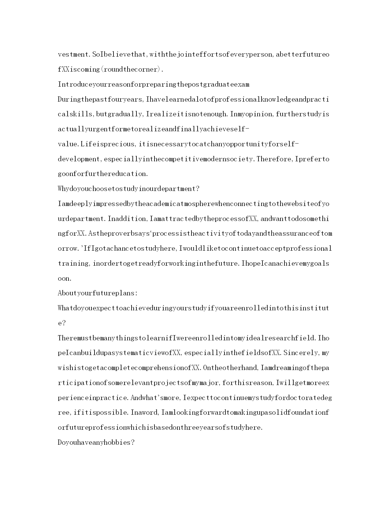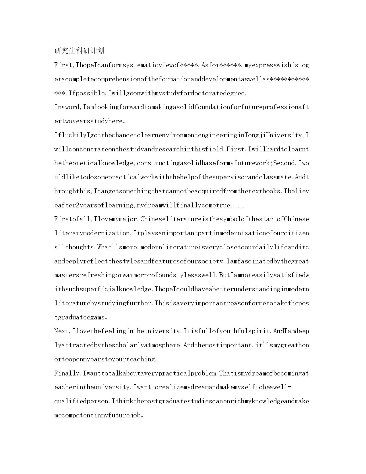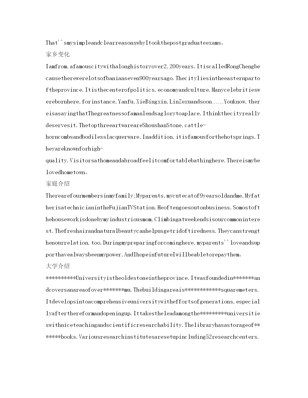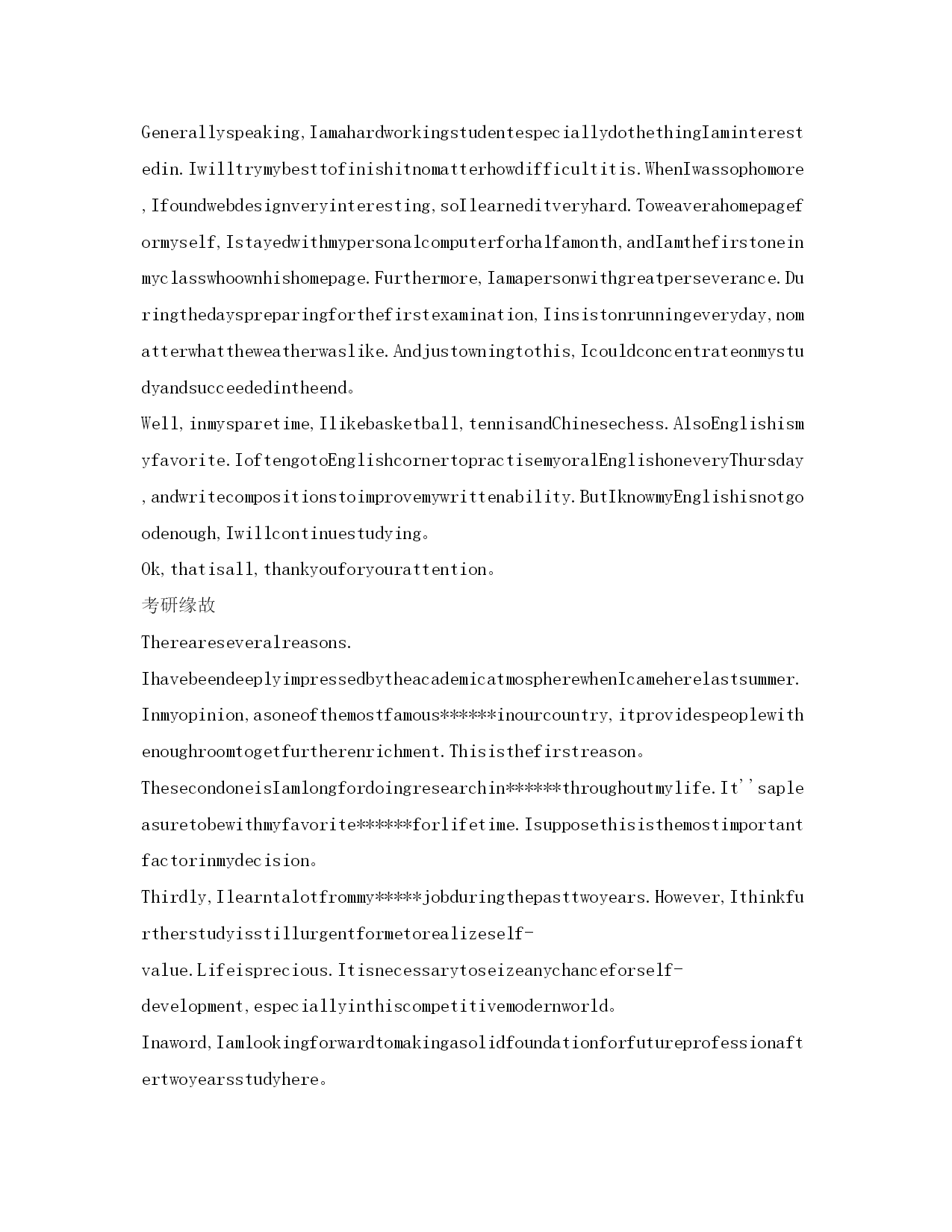 研究生复试英语自我介绍参考范文(精)研究生复试英语自我介绍Goodmorning.Iamgladtobehereforthisinterview.Firstletmeintroducemyself.Mynameis***,24.Icomefrom******,thecapitalof*******Province.Igraduatedfromthe*******departmentof*****UniversityinJuly,2001.InthepasttwoyearsIhavebeenpreparingforthepostgraduateexaminationwhileIhavebeenteaching*****inNO.****middleSchoolandIwasahead-teacherofaclassinjuniorgradetwo.NowallmyhardworkhasgotaresultsinceIhaveachancetobeinterviewedbyyou。Iamopen-minded,quickinthoughtandveryfondofhistory.Inmysparetime,Ihavebroadinterestslikemanyotheryoungers.Ilikereadingbooks,especiallythoseabout*******.FrequentlyIexchangewithotherpeoplebymakingcommentsintheforumonline.Inaddition,duringmycollegeyears,IwasonceaNet-bartechnician.So,Ihaveacomparativegoodcommandofnetworkapplication.Iamabletooperatethecomputerwell.IamskillfulinsearchingforinformationonInternet.Iamafootballfanforyears.Italianteamismyfavorite.Anyway,Ifeelgreatpityforourcountry'steam。Ialwaysbelievethatonewilleasilylagbehindunlesshekeepsonlearning.Ofcourse,ifIamgivenachancetostudy******inthisfamousUniversity,Iwillsparenoefforttomasteragoodcommandofadvance******。Goodmorning,mydearteachers,mydearprofessors.Iamverygladtobehereforyourinterview.MynameisSongYonghao,Iam22yearsold.IcomefromLuoyang,averybeautifulancientcity.myundergraduateperiodwillbeaccomplishedinChang''anuniversityinJuly,2004;andnow,IamtryingmybestforobtainingakeytoTongjiUniversity。Generallyspeaking,IamahardworkingstudentespeciallydothethingIaminterestedin.Iwilltrymybesttofinishitnomatterhowdifficultitis.WhenIwassophomore,Ifoundwebdesignveryinteresting,soIlearneditveryhard.Toweaverahomepageformyself,Istayedwithmypersonalcomputerforhalfamonth,andIamthefirstoneinmyclasswhoownhishomepage.Furthermore,Iamapersonwithgreatperseverance.Duringthedayspreparingforthefirstexamination,Iinsistonrunningeveryday,nomatterwhattheweatherwaslike.Andjustowningtothis,Icouldconcentrateonmystudyandsucceededintheend。Well,inmysparetime,Ilikebasketball,tennisandChinesechess.AlsoEngl